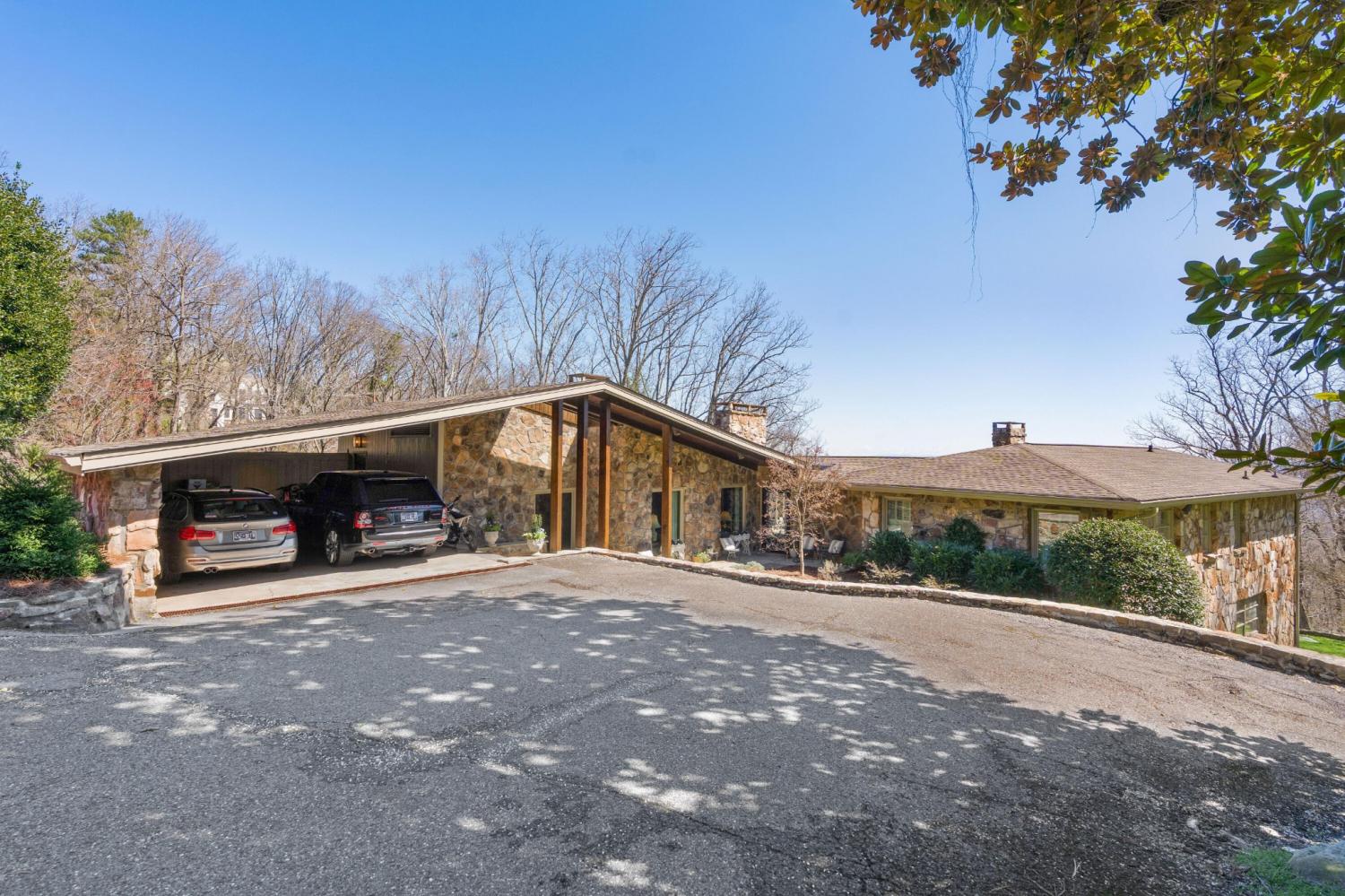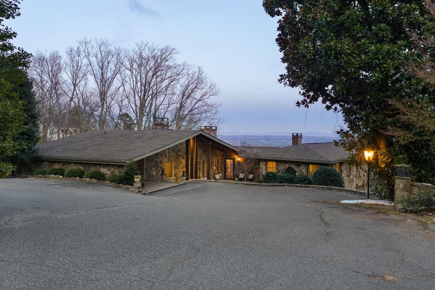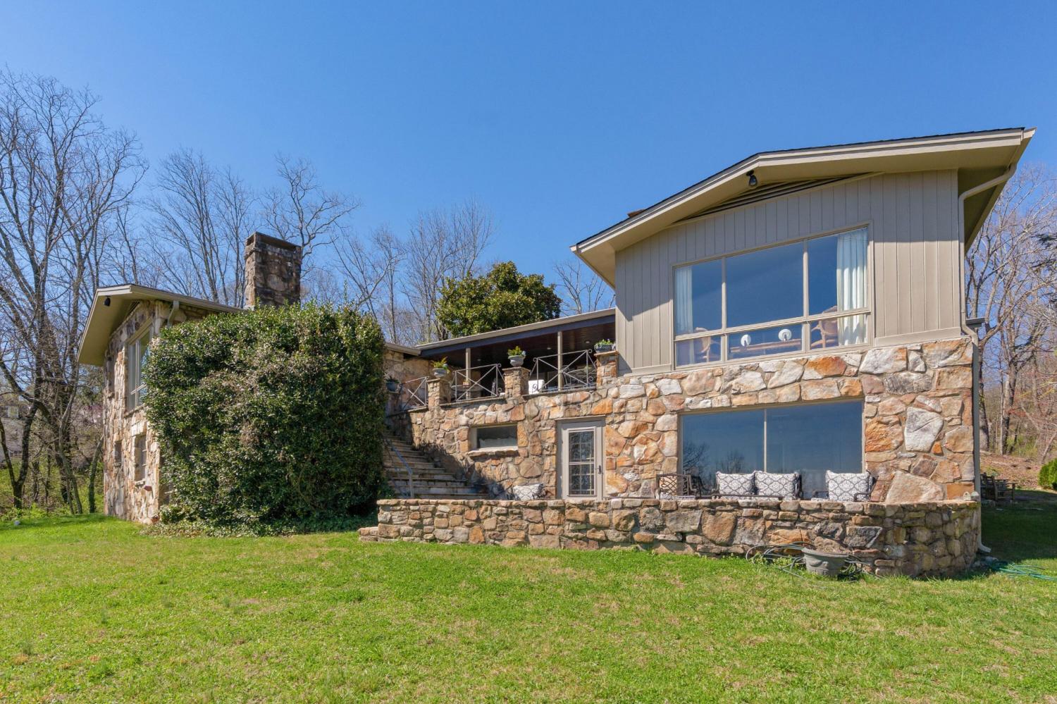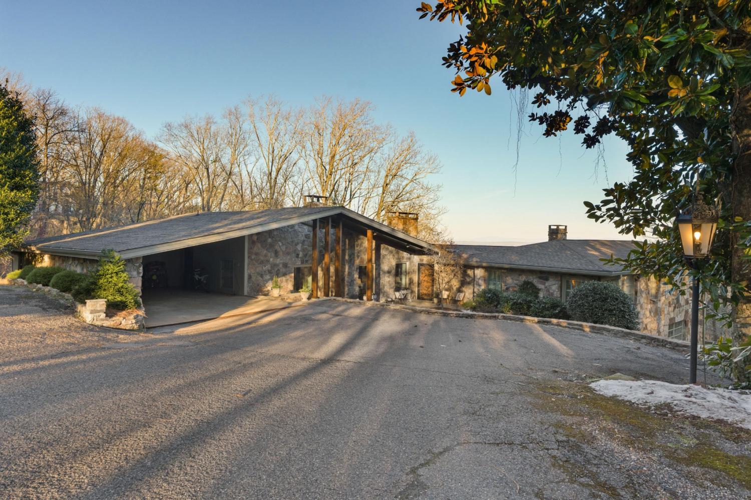 Family owned since 1977, this mid-century Lookout Mountain brow home offers a unique opportunity for the buyer seeking a premier brow estate with 3 parcels totaling over 5.19 +/- acres offering views, privacy, a wet weather creek, natural rock formations and endless potential. The sellers have completed many recent improvements, such as adding additional stone to the exterior and sanding and staining the beautiful carport to enhance curb appeal, replacing the HVAC units and more, but this 4 bedroom, 4 bath, one-level over a daylight basement also boasts many of the original desirable mid-century features, such as gorgeous hardwoods, stone, brick and marble tile flooring, solid wood paneling, crown moldings, multiple built-in features, 5 fireplaces, and wonderful windows everywhere you look that take full advantage of the views and provide warm natural lighting on both levels. The home has a great flow for entertaining, and your tour begins with entry to a large foyer that has a wall of windows to the main patio area with an outdoor fireplace, a pass-through wet bar to the den and access to the large formal living room. The living room has a fireplace and amazing views and adjoins the formal dining room. The handsome den also has a fireplace, the wet bar with ice maker, beautiful wood paneling, built-ins and double doors to the breakfast room and kitchen. The laundry room is off of the breakfast area as is the access to the double carport for easy loading and unloading and everyday ingress and egress. The kitchen adjoins the sunroom which will quickly become a favorite spot in the house. The primary suite is located on the back and enjoys the brow view, has a gas fireplace and the primary bath with a dressing area that has multiple built-ins. It has its own tub/shower, but there is also a separate shower that is shared with the guest bedroom. The guest bedroom also has access to the hall powder room.