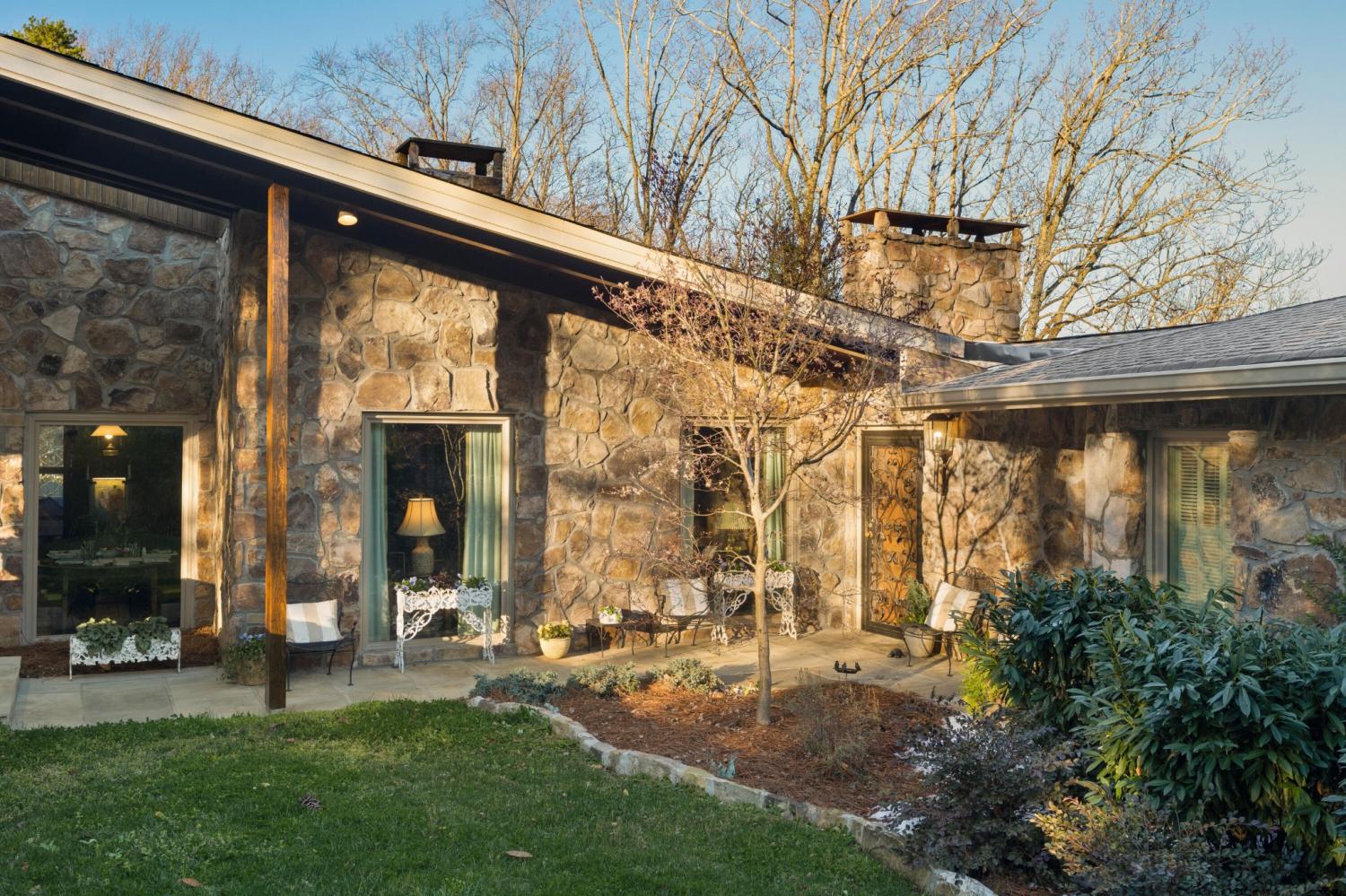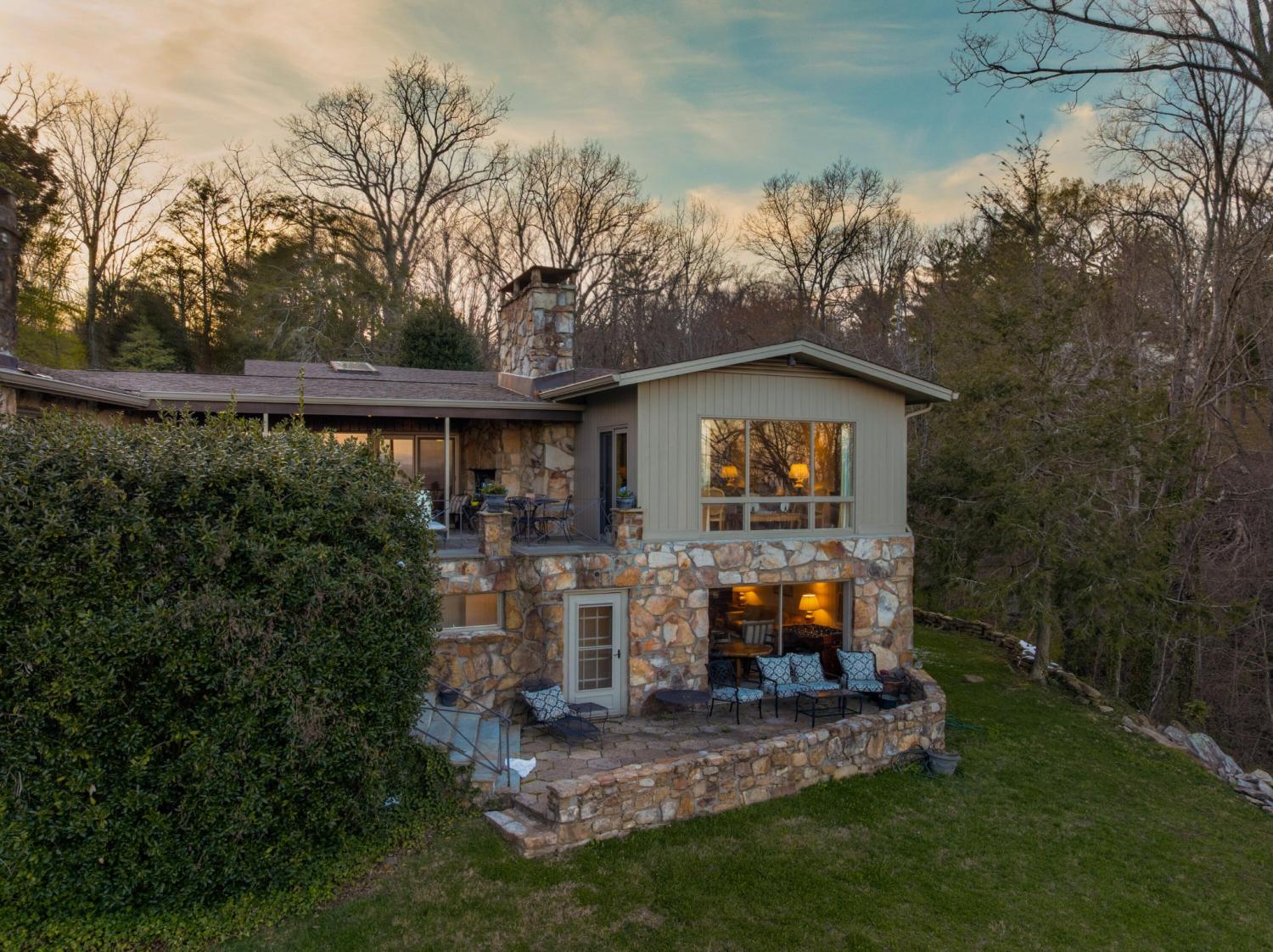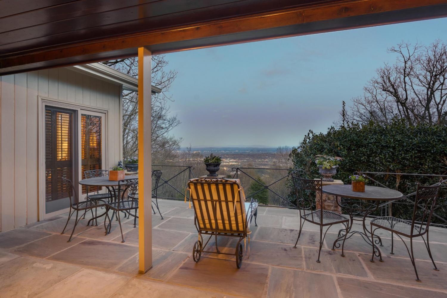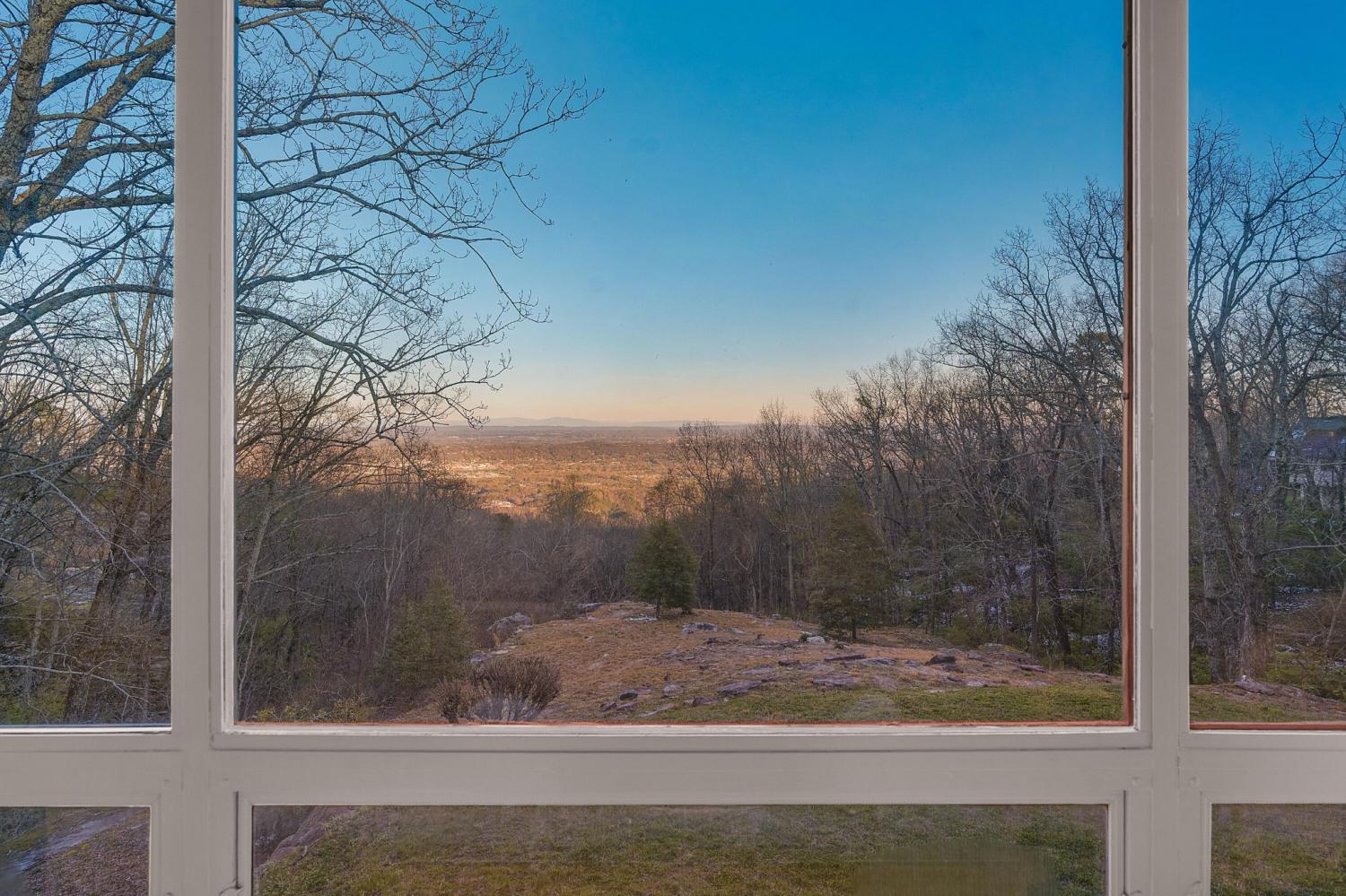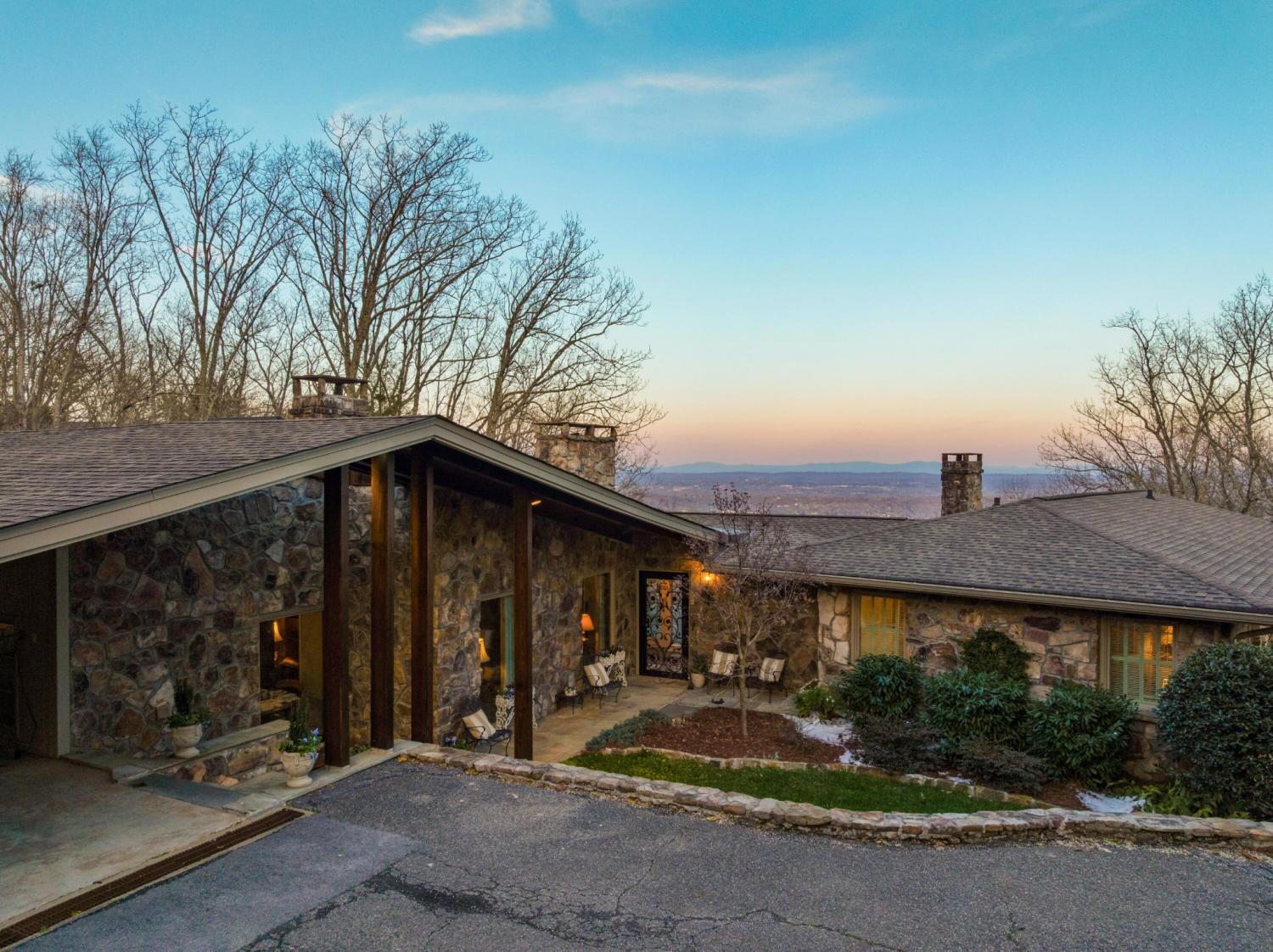 Family owned since 1977, this mid-century Lookout Mountain brow home offers a unique opportunity for the buyer seeking a premier brow estate with 3 parcels totaling over 5.19 +/- acres offering views, privacy, a wet weather creek, natural rock formations and endless potential. The sellers have completed many recent improvements, such as adding additional stone to the exterior and sanding and staining the beautiful carport to enhance curb appeal, replacing the HVAC units and more, but this 4 bedroom, 4 bath, one-level over a daylight basement also boasts many of the original desirable mid-century features, such as gorgeous hardwoods, stone, brick and marble tile flooring, solid wood paneling, crown moldings, multiple built-in features, 5 fireplaces, and wonderful windows everywhere you look that take full advantage of the views and provide warm natural lighting on both levels. The home has a great flow for entertaining, and your tour begins with entry to a large foyer that has a wall of windows to the main patio area with an outdoor fireplace, a pass-through wet bar to the den and access to the large formal living room. The living room has a fireplace and amazing views and adjoins the formal dining room. The handsome den also has a fireplace, the wet bar with ice maker, beautiful wood paneling, built-ins and double doors to the breakfast room and kitchen. The laundry room is off of the breakfast area as is the access to the double carport for easy loading and unloading and everyday ingress and egress. The kitchen adjoins the sunroom which will quickly become a favorite spot in the house. The primary suite is located on the back and enjoys the brow view, has a gas fireplace and the primary bath with a dressing area that has multiple built-ins. It has its own tub/shower, but there is also a separate shower that is shared with the guest bedroom. The guest bedroom also has access to the hall powder room.