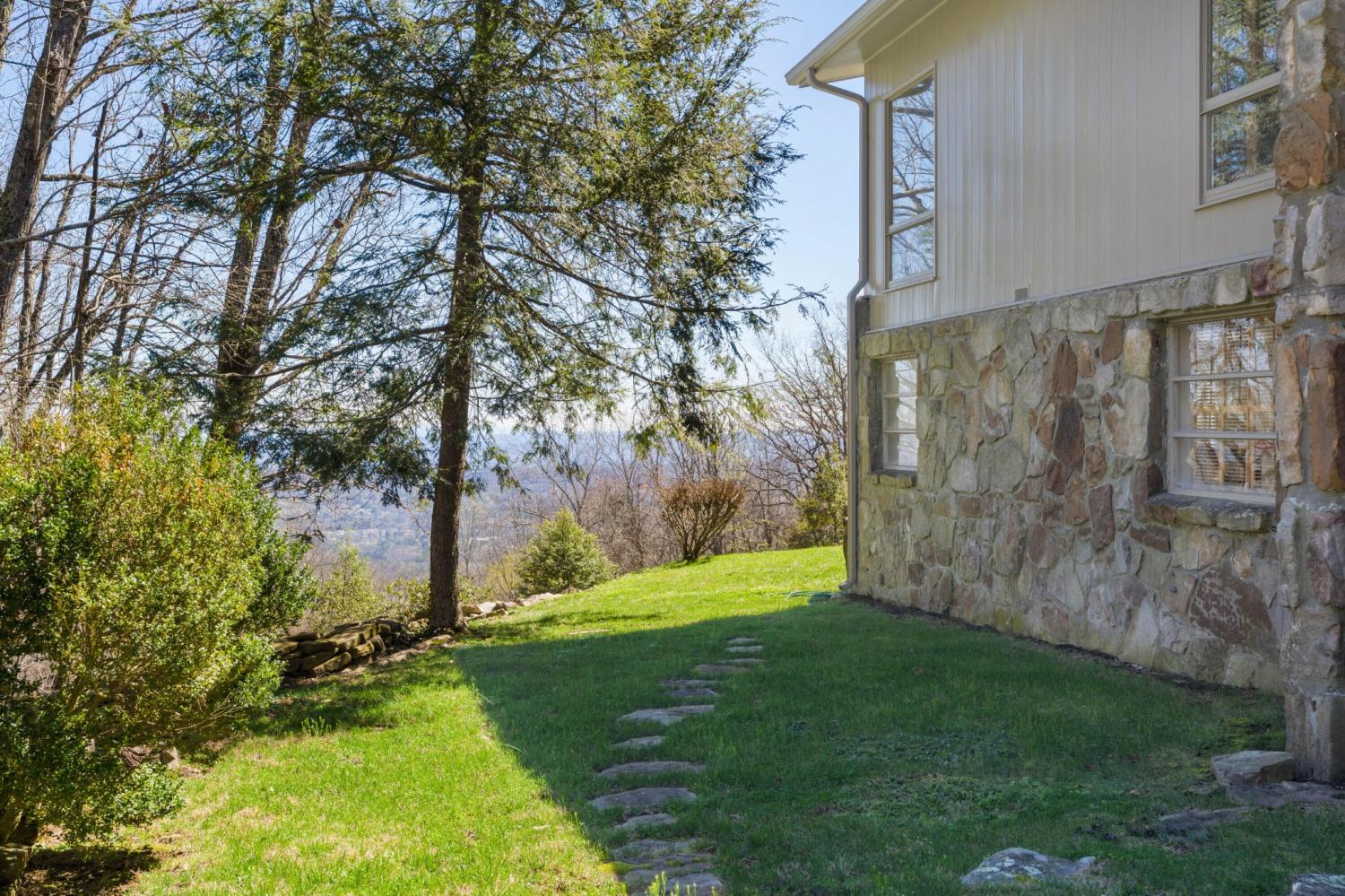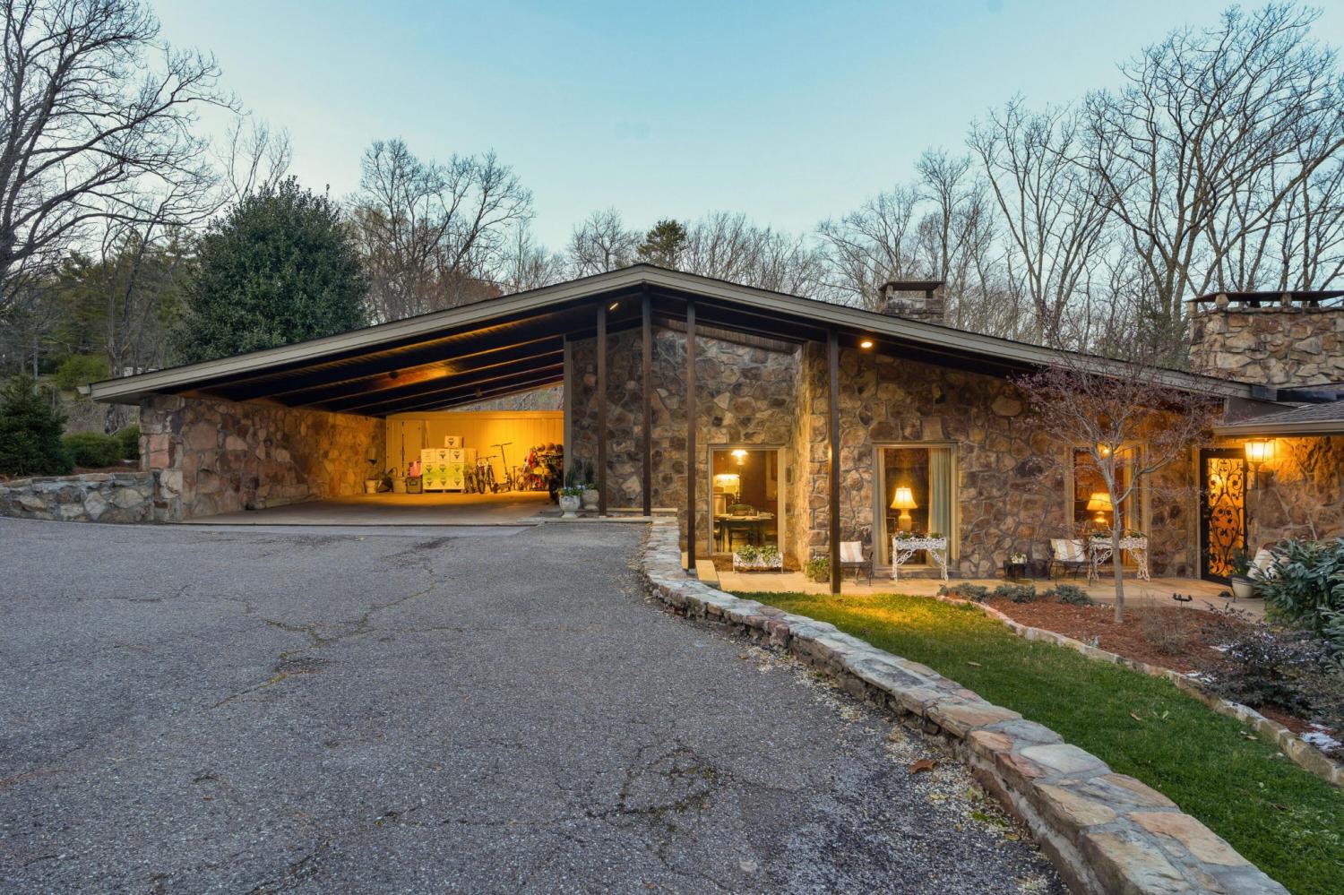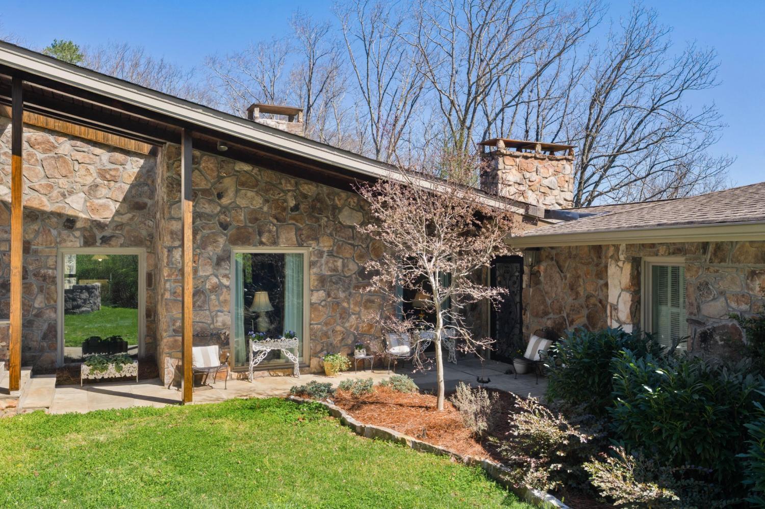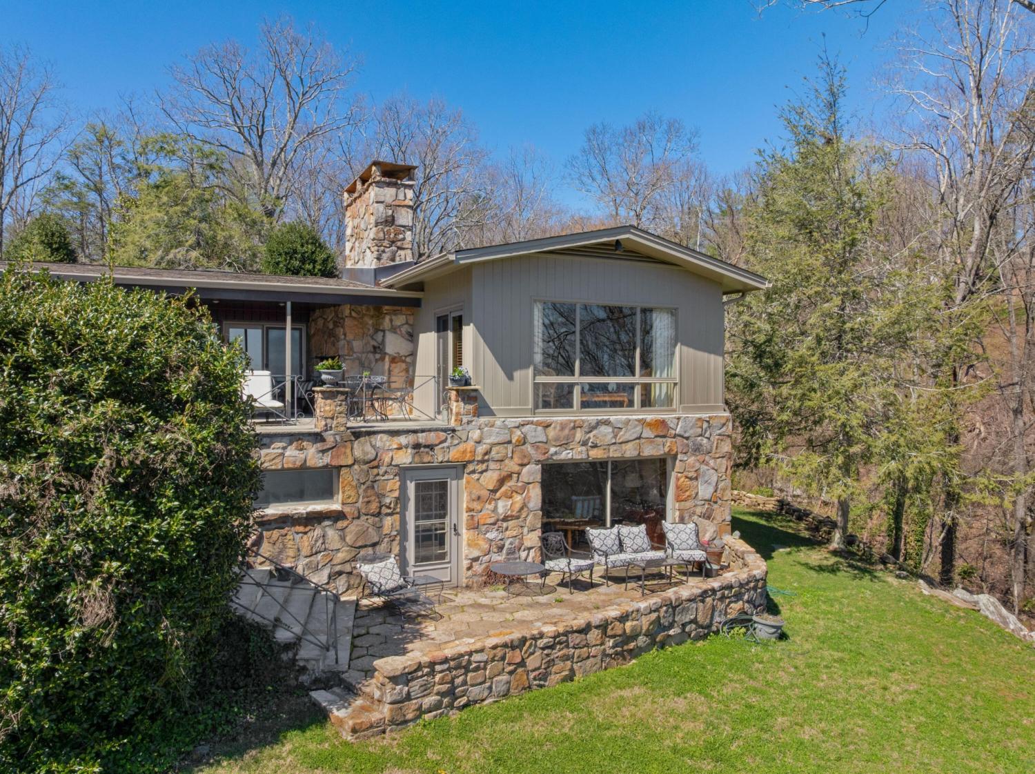 Family owned since 1977, this mid-century Lookout Mountain brow home offers a unique opportunity for the buyer seeking a premier brow estate with 3 parcels totaling over 5.19 +/- acres offering views, privacy, a wet weather creek, natural rock formations and endless potential. The sellers have completed many recent improvements, such as adding additional stone to the exterior and sanding and staining the beautiful carport to enhance curb appeal, replacing the HVAC units and more, but this 4 bedroom, 4 bath, one-level over a daylight basement also boasts many of the original desirable mid-century features, such as gorgeous hardwoods, stone, brick and marble tile flooring, solid wood paneling, crown moldings, multiple built-in features, 5 fireplaces, and wonderful windows everywhere you look that take full advantage of the views and provide warm natural lighting on both levels. The home has a great flow for entertaining, and your tour begins with entry to a large foyer that has a wall of windows to the main patio area with an outdoor fireplace, a pass-through wet bar to the den and access to the large formal living room. The living room has a fireplace and amazing views and adjoins the formal dining room. The handsome den also has a fireplace, the wet bar with ice maker, beautiful wood paneling, built-ins and double doors to the breakfast room and kitchen. The laundry room is off of the breakfast area as is the access to the double carport for easy loading and unloading and everyday ingress and egress. The kitchen adjoins the sunroom which will quickly become a favorite spot in the house. The primary suite is located on the back and enjoys the brow view, has a gas fireplace and the primary bath with a dressing area that has multiple built-ins. It has its own tub/shower, but there is also a separate shower that is shared with the guest bedroom. The guest bedroom also has access to the hall powder room.