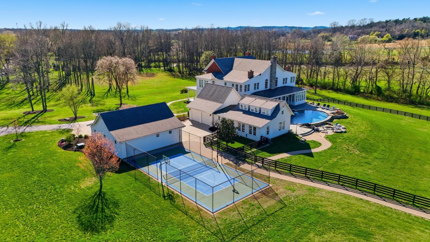 Set behind a private gate on 35 rolling acres in Williamson County, graceful pastures and four-board fencing frame a timeless 2010 built Georgian residence of nearly 11,000 square feet, designed with generous, yet thoughtful, scale. Every room serves a purpose. Every space invites gathering. Sunlight pours into a soaring great room with 35-foot ceilings and anchored by one of five fireplaces. The chef’s kitchen, centered around an oversized island, connects seamlessly to an open breakfast area, formal dining room, and morning room — ideal for sipping coffee while watching the sun rise over the pool and pond. A refined den/whiskey room offers a perfect retreat to unwind at the end of the day, or take in a movie in the nearly 600sf media/recreation room, also ideal for game-day hosting. The main level primary suite is a serene retreat with it own fireplace, sitting room with sweeping views, and spa-like bath. Upstairs are four additional ensuite bedrooms, a den, an office, and true to Southern style, two climate controlled sleeping porches. An elevator quietly connects all levels, including a lower level with a full gym, and nearly 1000 sf of unfinished storage space. The land itself is the true luxury, designed for both recreation and stewardship. A pool and spa are flanked by covered patios and sun decks. A lighted pickleball court adds year-round activity. In addition to an attached two-car garage plus a three-car garage with workshop, is a car barn with wraparound porch and capacity for nine vehicles — equally suited for a collection or reimagined as an event barn or a dream horse barn. Fully fenced and ready for horses or cattle, the acreage provides privacy without isolation. With three additional recorded homesites, opportunity abounds for guest houses, future generations, or a thoughtfully designed family compound. A private luxury retreat, a working farm, or the foundation for a legacy estate - this is an offering of rare scale and lasting significance.