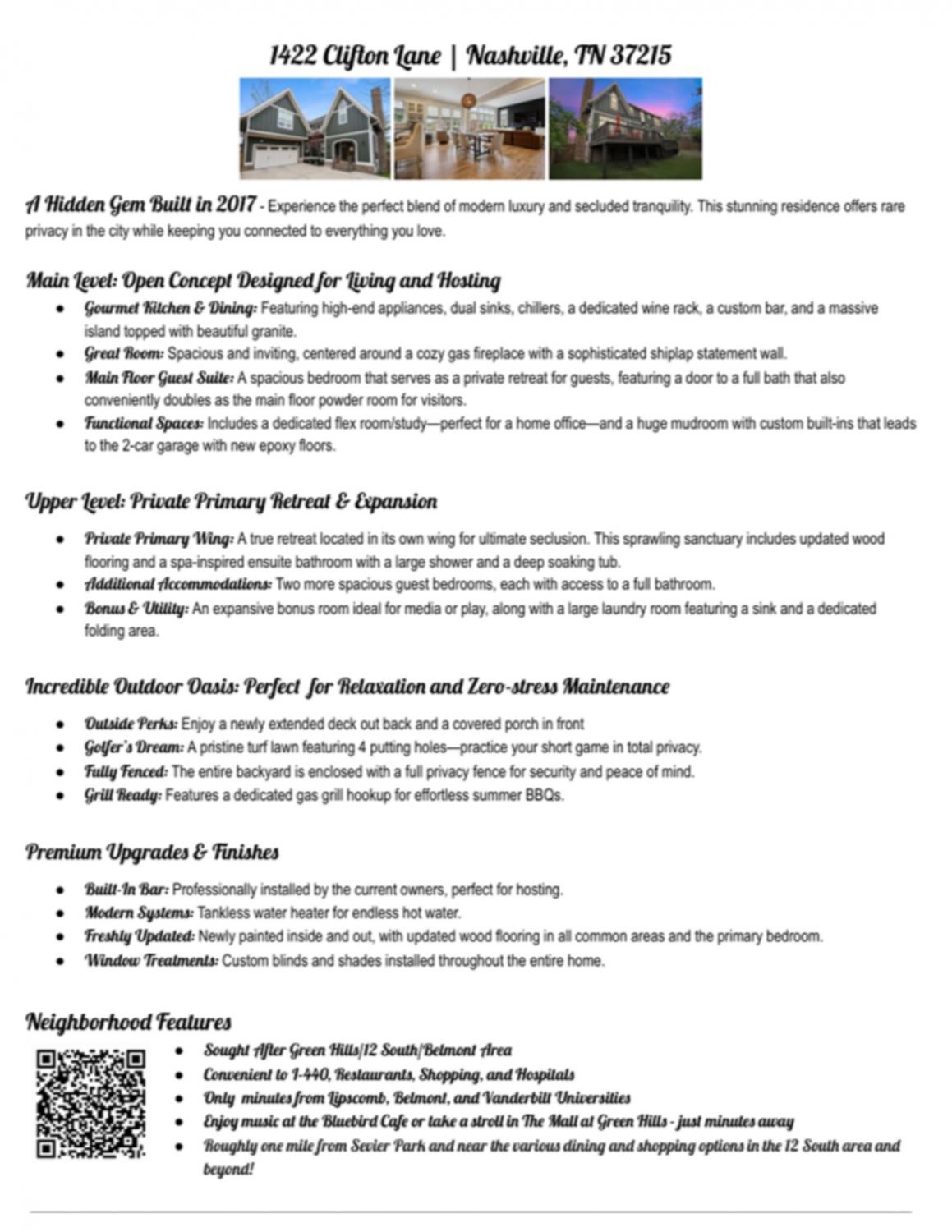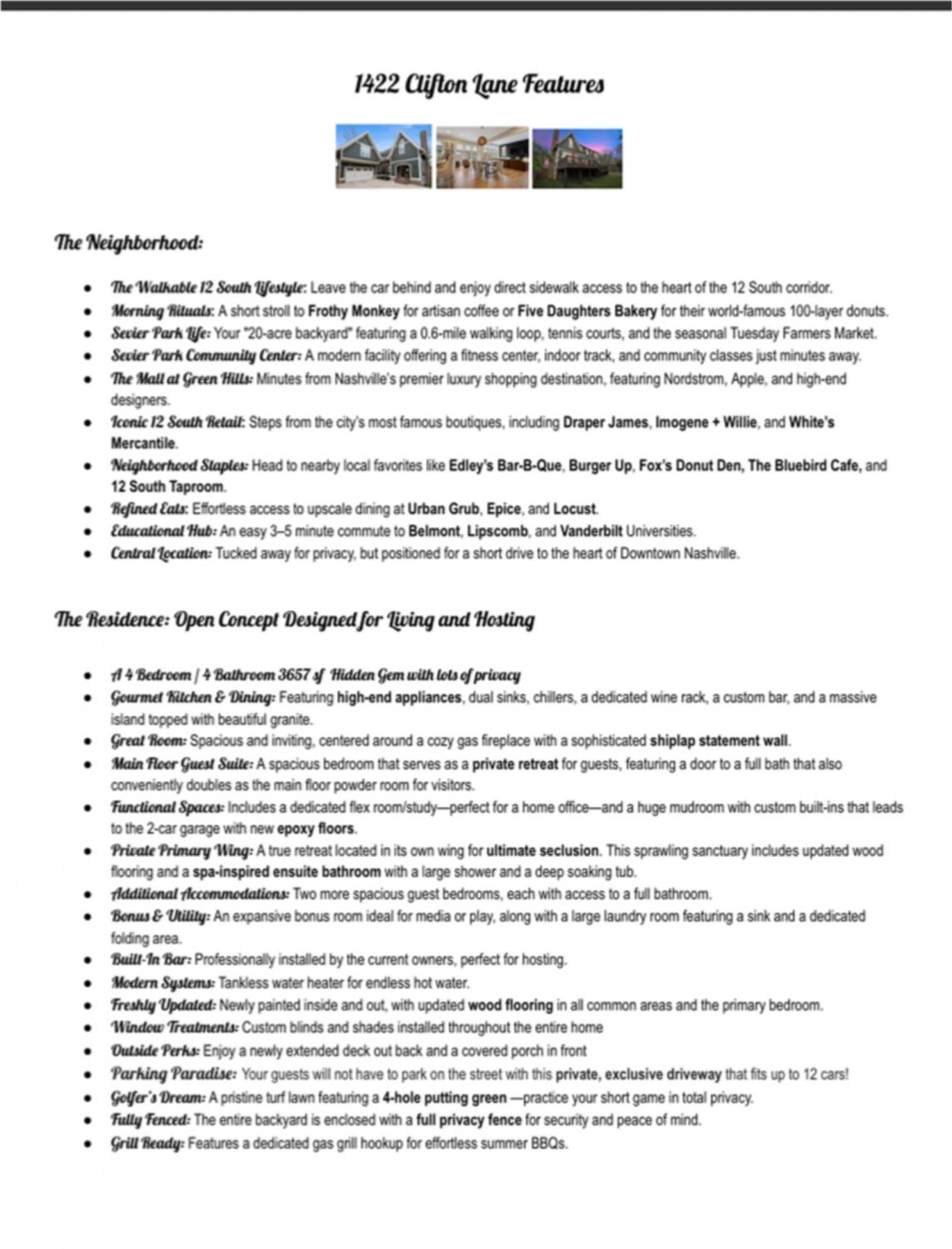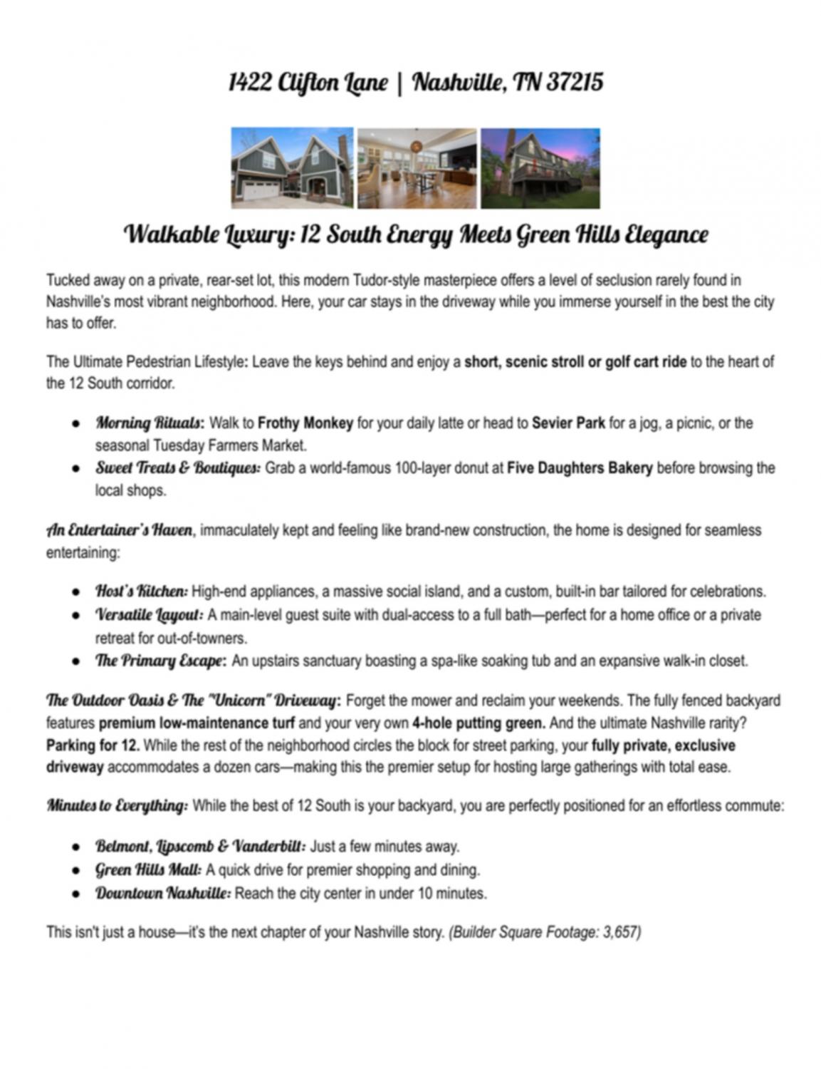 Open House Sun 4/26! Tucked away on a private, rear-set lot, this modern Tudor-style masterpiece offers a level of seclusion rarely found in Nashville’s most vibrant neighborhood. Here, your car stays in the driveway while you immerse yourself in the best the city has to offer. The Ultimate Pedestrian Lifestyle: Leave the keys behind and enjoy a short, scenic stroll or golf cart ride to the heart of the 12 South corridor. Walk to Frothy Monkey for your daily latte or head to Sevier Park for a jog, a picnic, or the seasonal Tuesday Farmers Market. Grab a world-famous 100-layer donut at Five Daughters Bakery before browsing the local shops. *An Entertainer’s Haven, immaculately kept and feeling like brand-new construction, the home is designed for seamless entertaining: Host’s Kitchen: High-end appliances, a massive social island, and a custom, built-in bar tailored for celebrations. Versatile Layout: A main-level guest suite with dual-access to a full bath—perfect for a home office or a private retreat for out-of-towners. The Primary Escape: An upstairs sanctuary boasting a spa-like soaking tub and an expansive walk-in closet.The Outdoor Oasis & The "Unicorn" Driveway: Forget the mower and reclaim your weekends. The fully fenced backyard features premium low-maintenance turf and your very own 4-hole putting green. And the ultimate Nashville rarity—Your fully private, exclusive driveway accommodates up to 12 cars—making this the premier setup for hosting large gatherings with total ease. Minutes to Everything: While the best of 12 South is your backyard, you are perfectly positioned for an effortless commute:*Belmont, Lipscomb & Vanderbilt: Just a few minutes away. *Green Hills Mall: A quick drive for premier shopping and dining. *Downtown Nashville: Reach the city center in under 10 minutes. This isn't just a house—it’s the next chapter of your Nashville story.