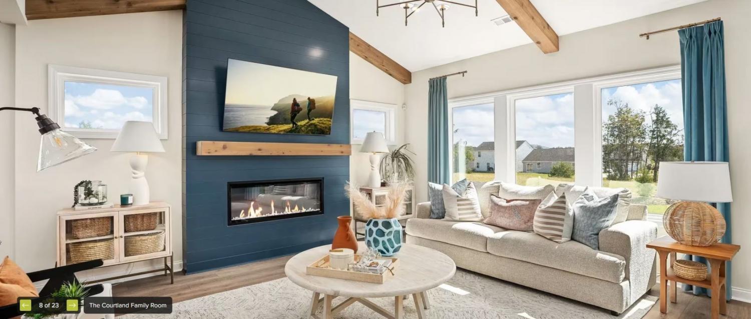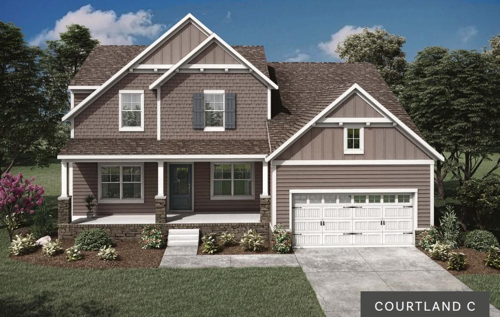 The highly desired Courtland plan on a corner lot features open concept living with vaulted ceilings and cedar beams in the living room and primary suite plus convenient built-in's too! The primary bedroom, a guest room as well as laundry all located on main level of home. Inviting kitchen offers quartz countertops with tile backsplash, farm sink, under cabinet lighting, soft close doors and drawers and wood shelving in the pantry. Primary suite offers a fantastic SUPER SHOWER and wood closet shelving for an elevated touch. Mohawk Revwood flooring through out first floor of home, hardwood stairs with iron spindles lead you to the spacious game room, tile in all baths and laundry, study features coffered ceilings and French doors for privacy. The back has an oversized covered back patio for all your entertaining needs. This home is under construction - visit our decorated models in the community to learn more!