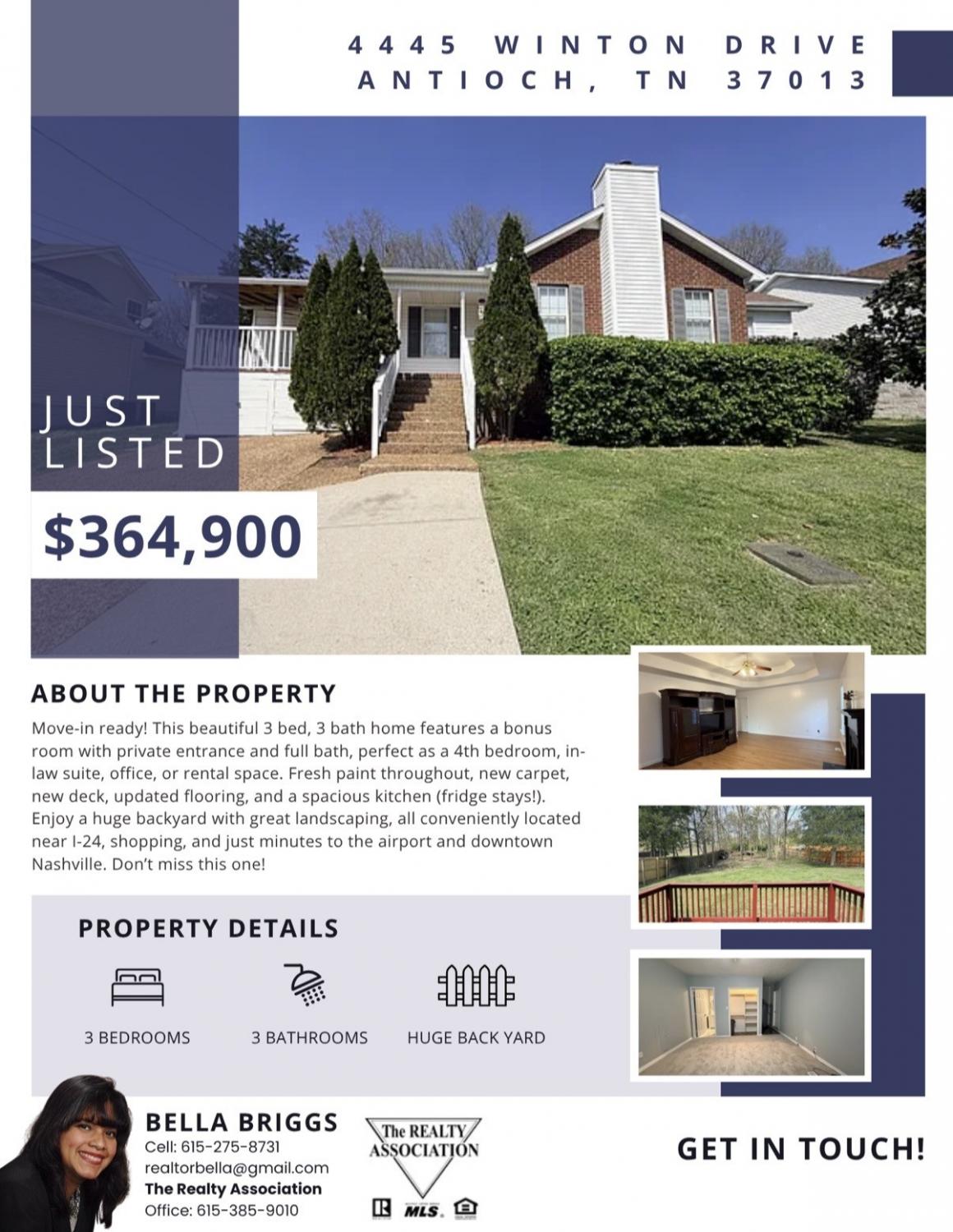 Move in Ready!!! This Beautiful 4 Bedrooms, 3 Full Bathrooms Home has a 4th Bedroom with its Own Private Entrance, New Deck, New Carpet, and Full Bathroom for More Privacy and Confort. It is great for In-Law Suite, Home Office, Guest Suite, Studio, Rental Potential Space. The Living Room and Each Bedroom are Fresh Painted. New Blinds Thorough the House. New Vinyl Plank Floor in the Living Room, Spacious Kitchen with Space for 2 Refrigerators. Refrigerator will Remain. Huge Back Yard with Deck. Beautiful Landscaping. This House is Convenient Located Close to I-24, Tánger Mall, Shoppings, Walgreens Pharmacy, Minutes to Nashville International Airport and Downtown Nashville. Don’t Miss this One!!!, It Won’t Last Long at this Price!!!