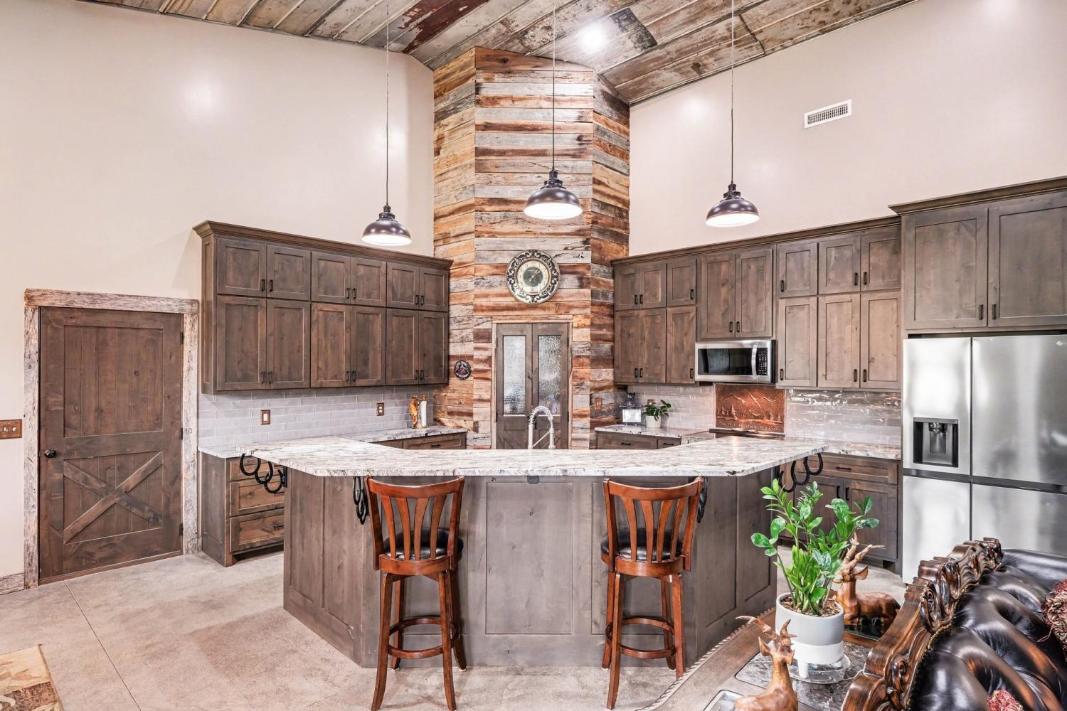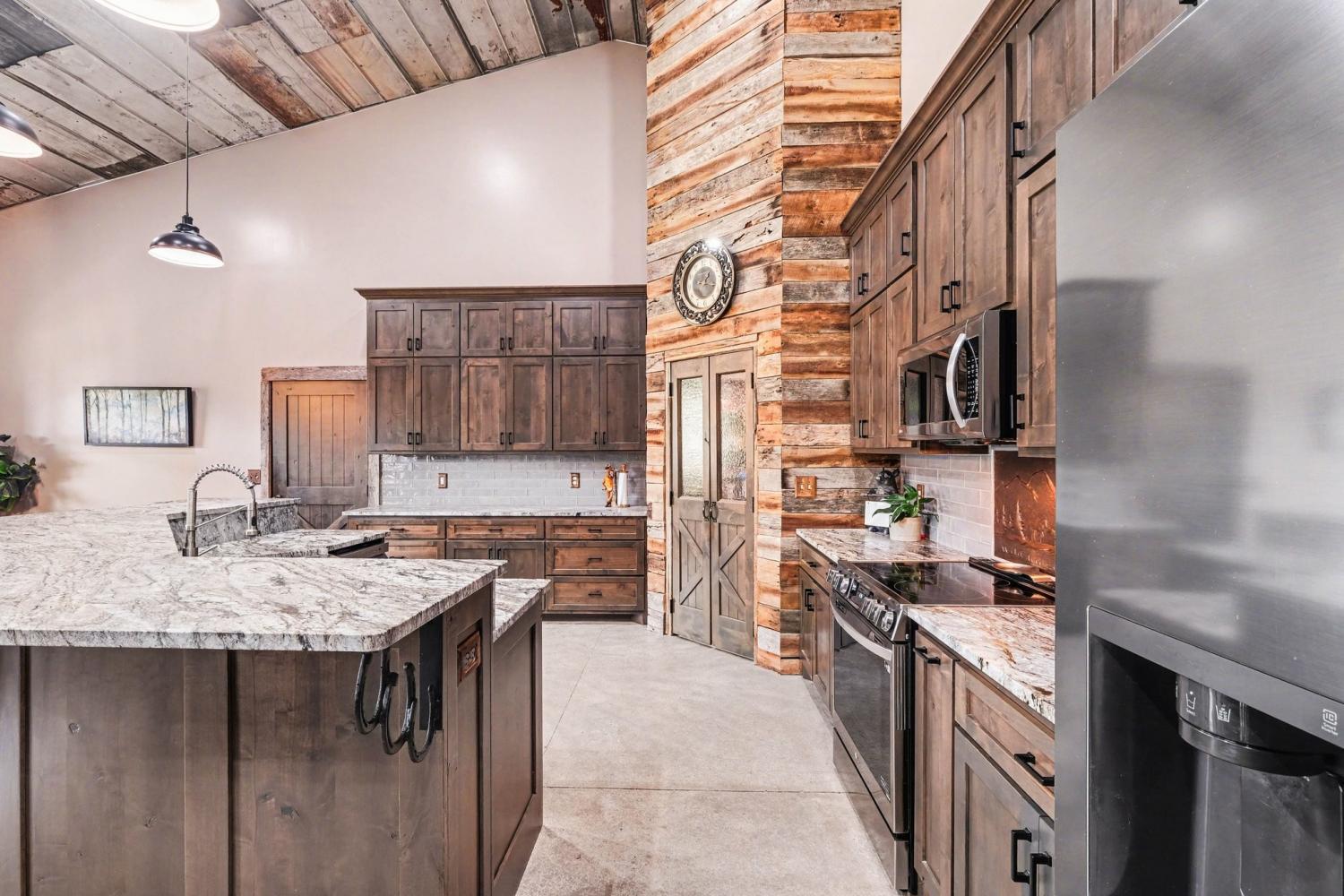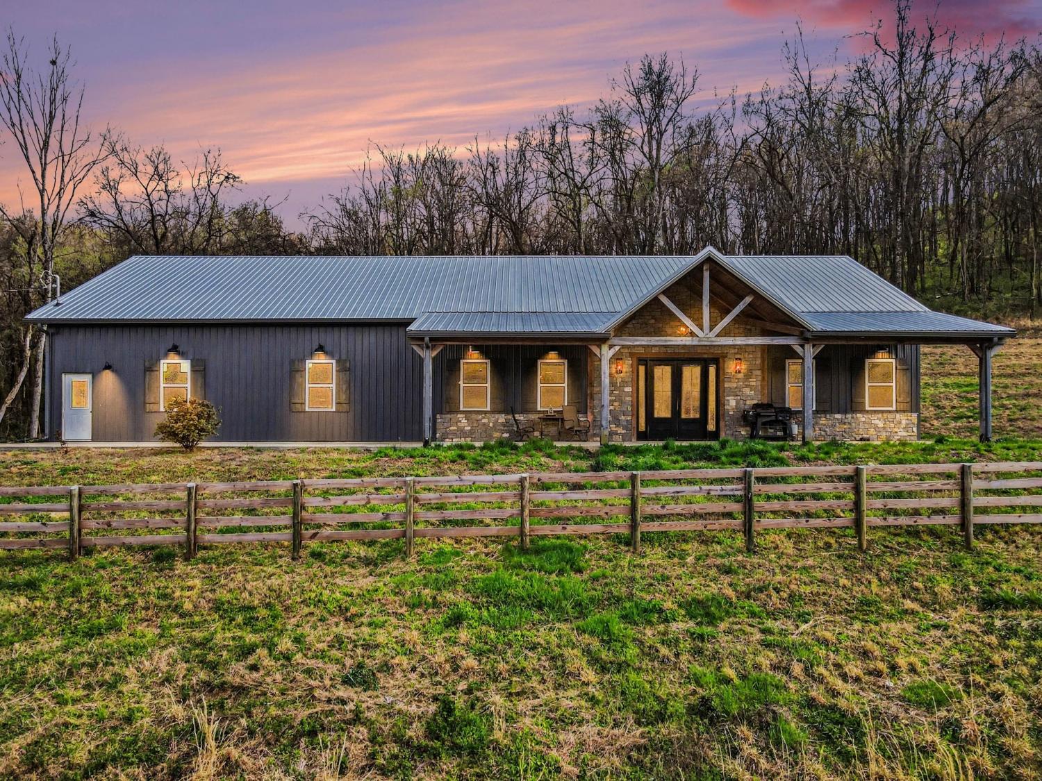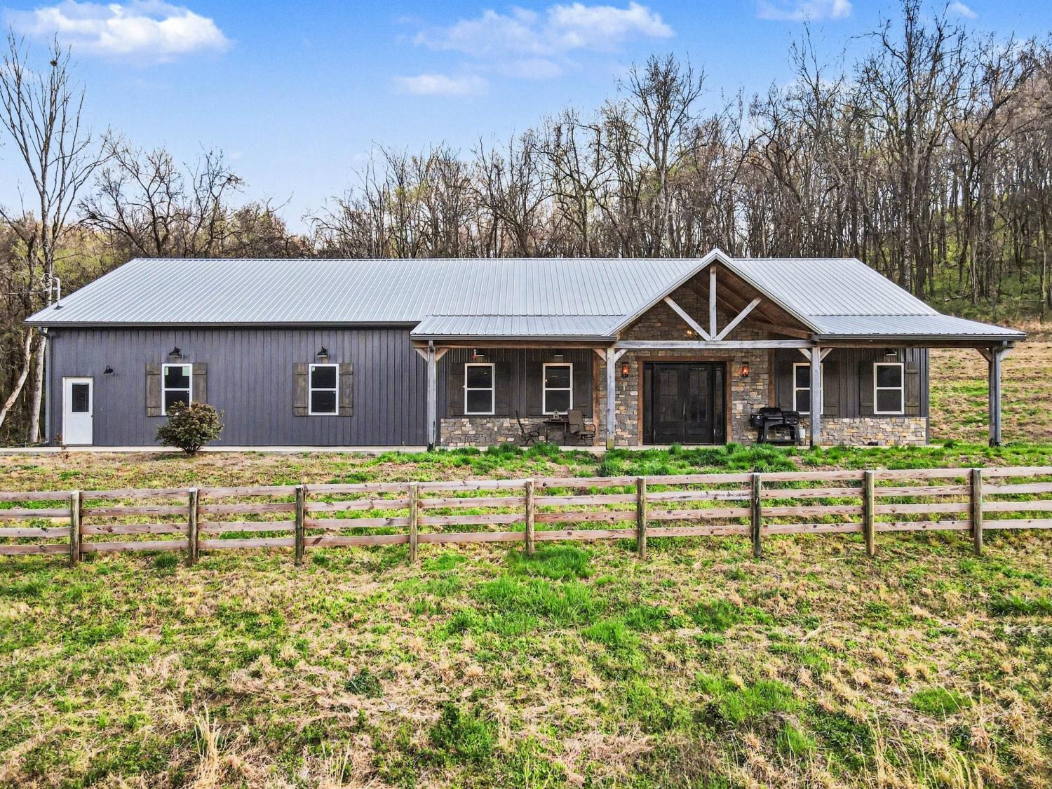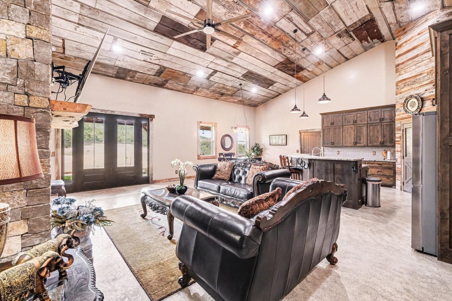 Tucked at the end of a private driveway on approximately 80 stunning acres, this one-of-a-kind barndominium offers sweeping views, abundant wildlife, and a level of peace and privacy that's difficult to find. Enjoy the unforgettable view from the oversized 12'×50' covered porch overlooking a charming pond. Soaring 12-foot ceilings run throughout the home, rising to an impressive 16 feet in both the kitchen and family room. Rich barnwood walls, gleaming tin ceilings, and concrete floors give the space its signature character, while a dramatic floor-to-ceiling rock fireplace anchors the living area with warmth and timeless style. The kitchen is a showstopper: custom soft-close cabinets, a generous island, granite countertops, tile backsplash, stainless steel appliances, and a classic farmhouse sink. The primary suite features a fully tiled tub and shower, double sinks, large walk-in closets, and a sleek pocket door. Bathrooms are upgraded with built in light, fan and music control. Custom wood cabinets, window and door frames throughout. A 10'×40' unfinished room upstairs can be finished as living space, a bunkroom, or a private office. The heated and cooled 40'×40' shop and garage can also be converted to additional living quarters. Established hunting grounds, an abundance of wildlife, gorgeous long-range views, and valuable standing timber round out a property that truly delivers on every front. Check out the video tour!