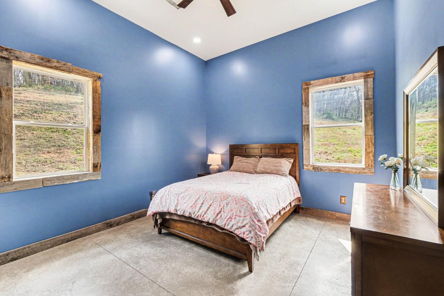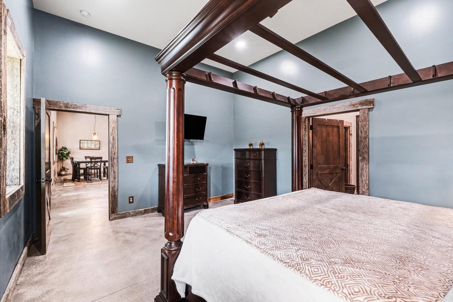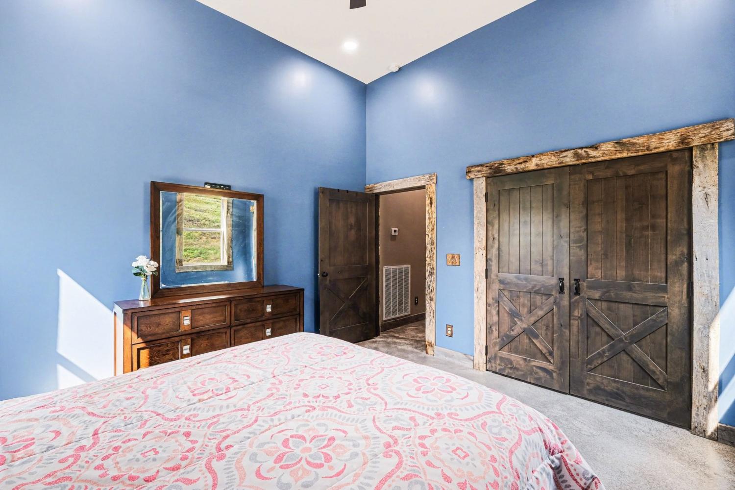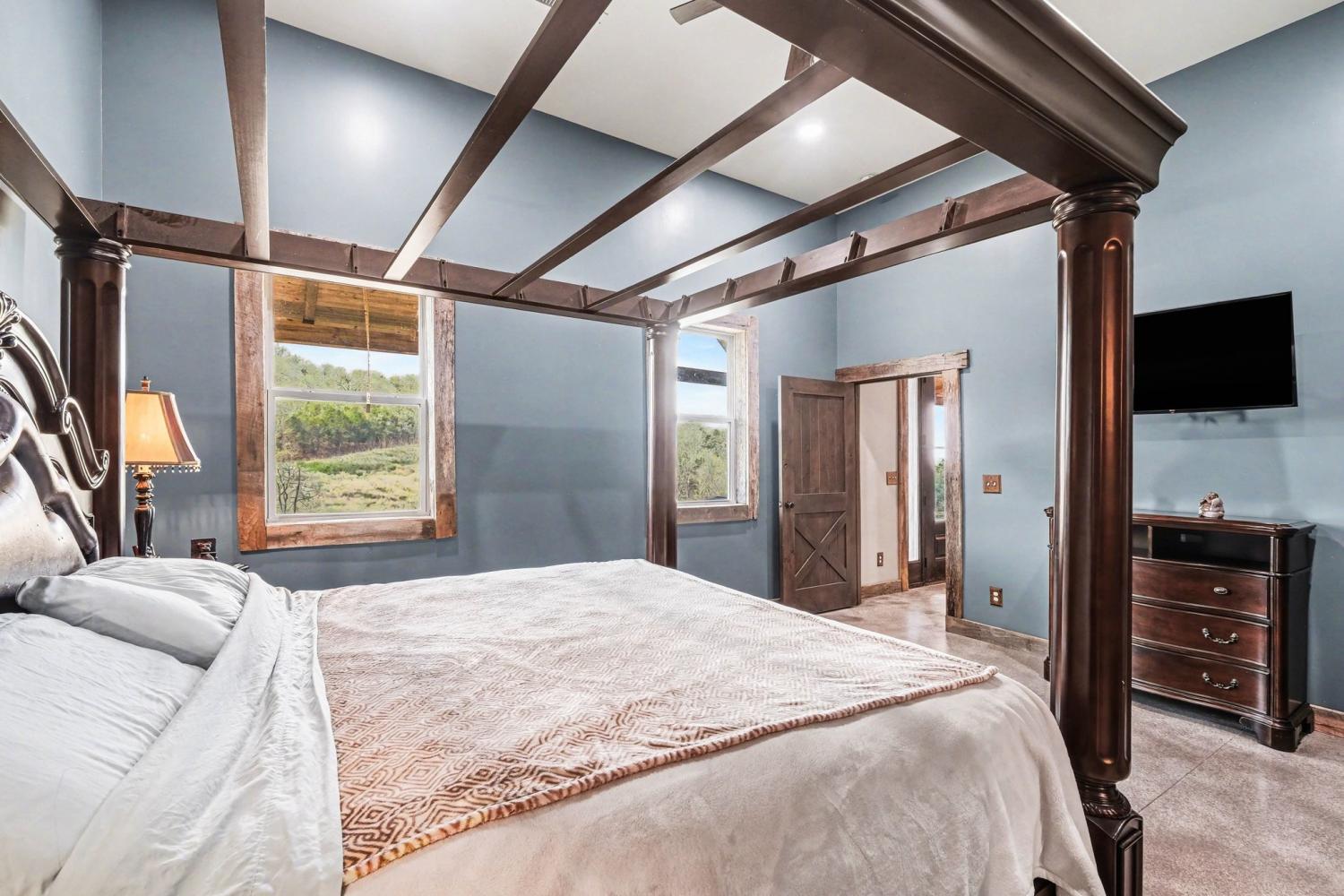 Tucked at the end of a private driveway on approximately 80 stunning acres, this one-of-a-kind barndominium offers sweeping views, abundant wildlife, and a level of peace and privacy that's difficult to find. Enjoy the unforgettable view from the oversized 12'×50' covered porch overlooking a charming pond. Soaring 12-foot ceilings run throughout the home, rising to an impressive 16 feet in both the kitchen and family room. Rich barnwood walls, gleaming tin ceilings, and concrete floors give the space its signature character, while a dramatic floor-to-ceiling rock fireplace anchors the living area with warmth and timeless style. The kitchen is a showstopper: custom soft-close cabinets, a generous island, granite countertops, tile backsplash, stainless steel appliances, and a classic farmhouse sink. The primary suite features a fully tiled tub and shower, double sinks, large walk-in closets, and a sleek pocket door. Bathrooms are upgraded with built in light, fan and music control. Custom wood cabinets, window and door frames throughout. A 10'×40' unfinished room upstairs can be finished as living space, a bunkroom, or a private office. The heated and cooled 40'×40' shop and garage can also be converted to additional living quarters. Established hunting grounds, an abundance of wildlife, gorgeous long-range views, and valuable standing timber round out a property that truly delivers on every front. Check out the video tour!
