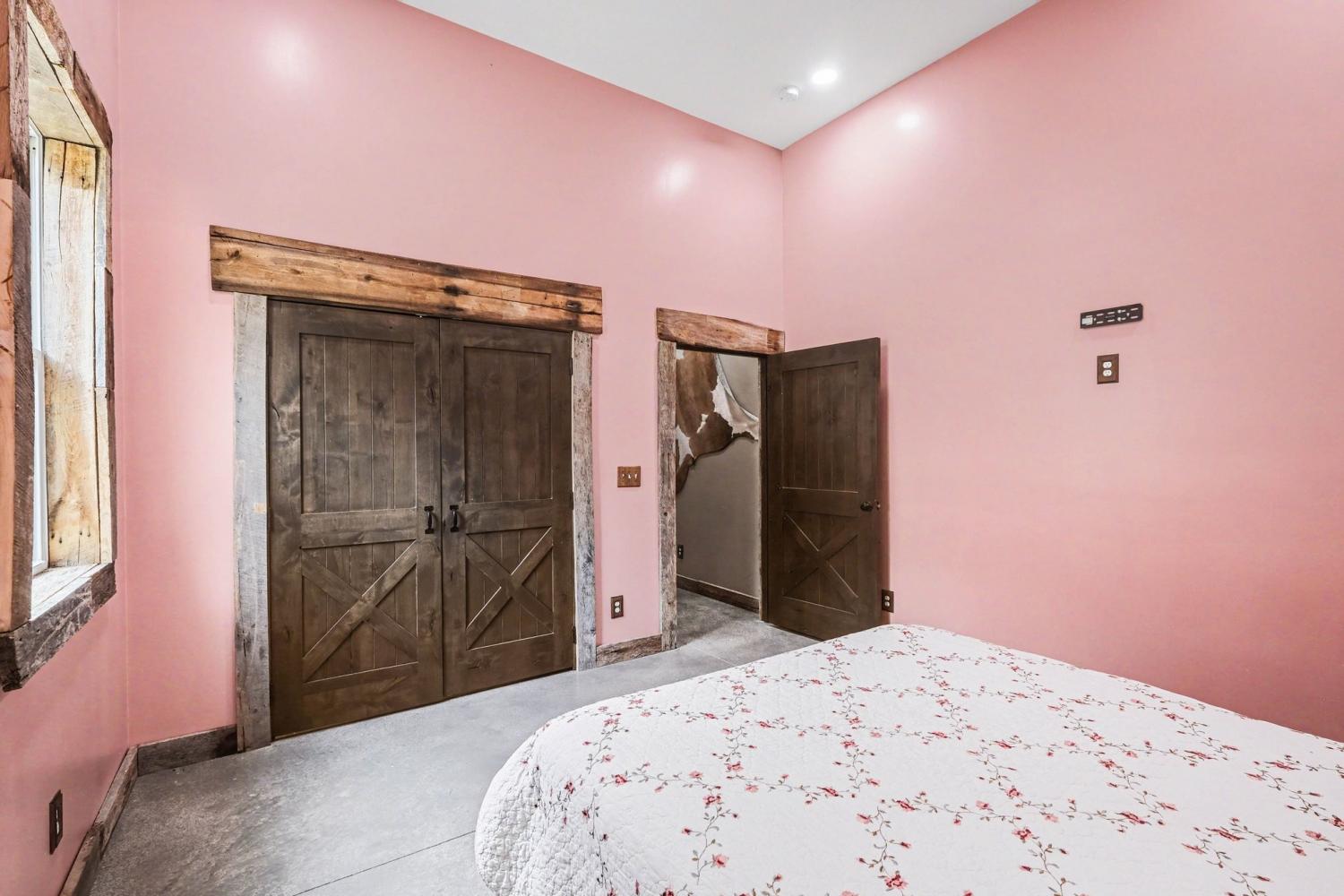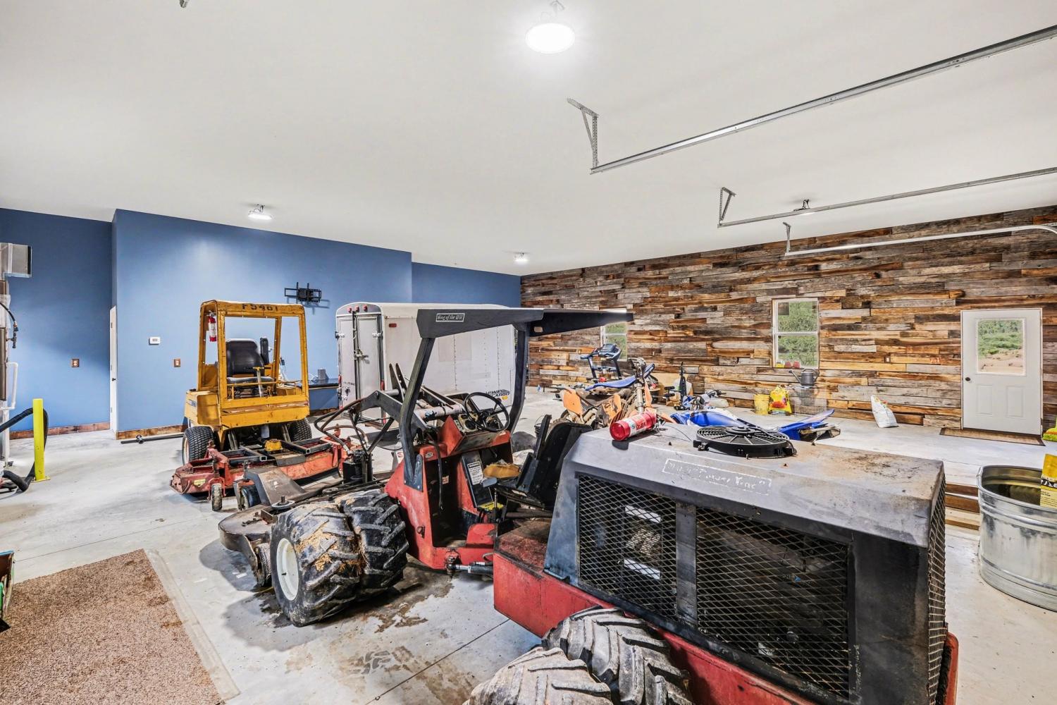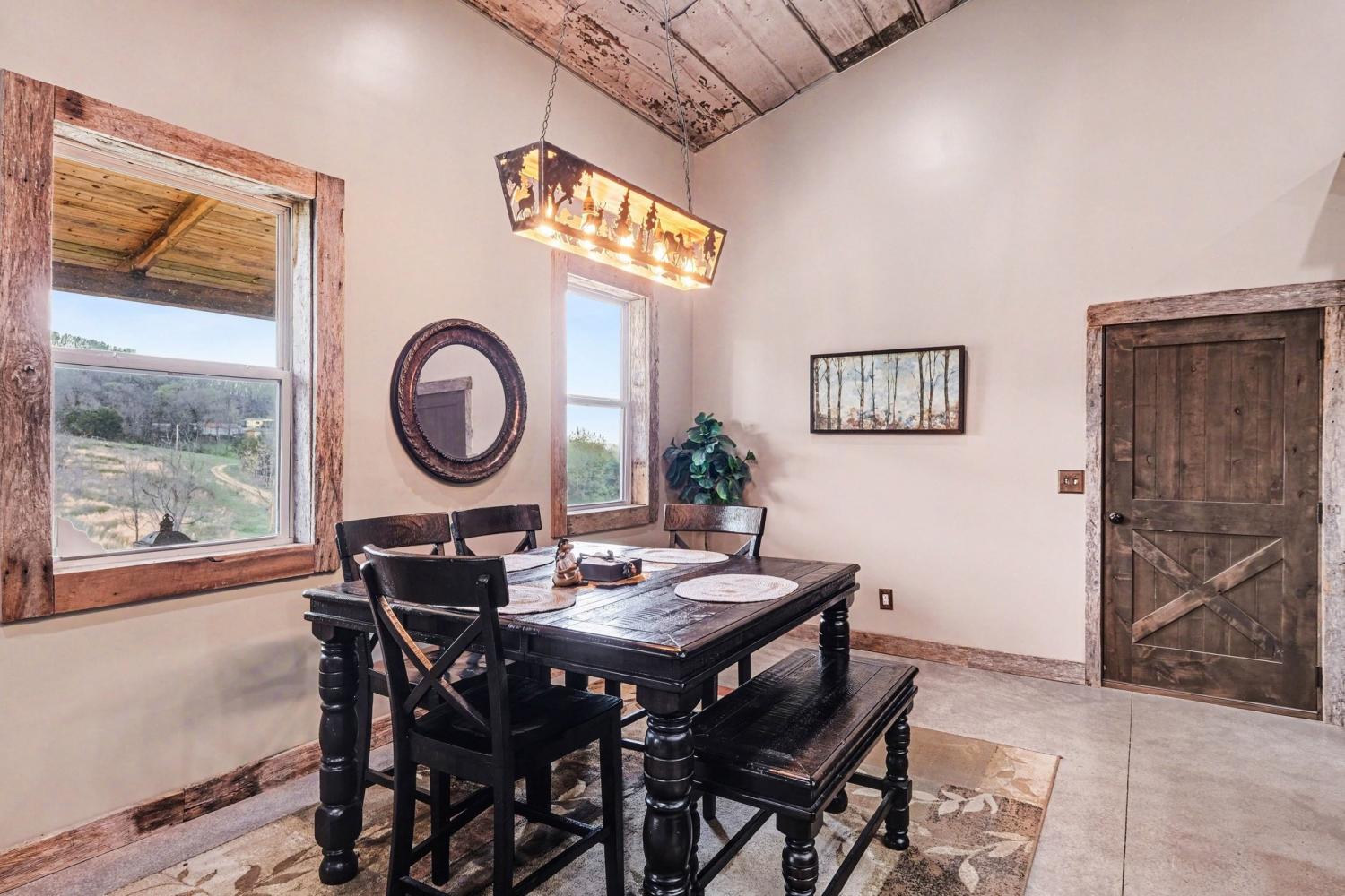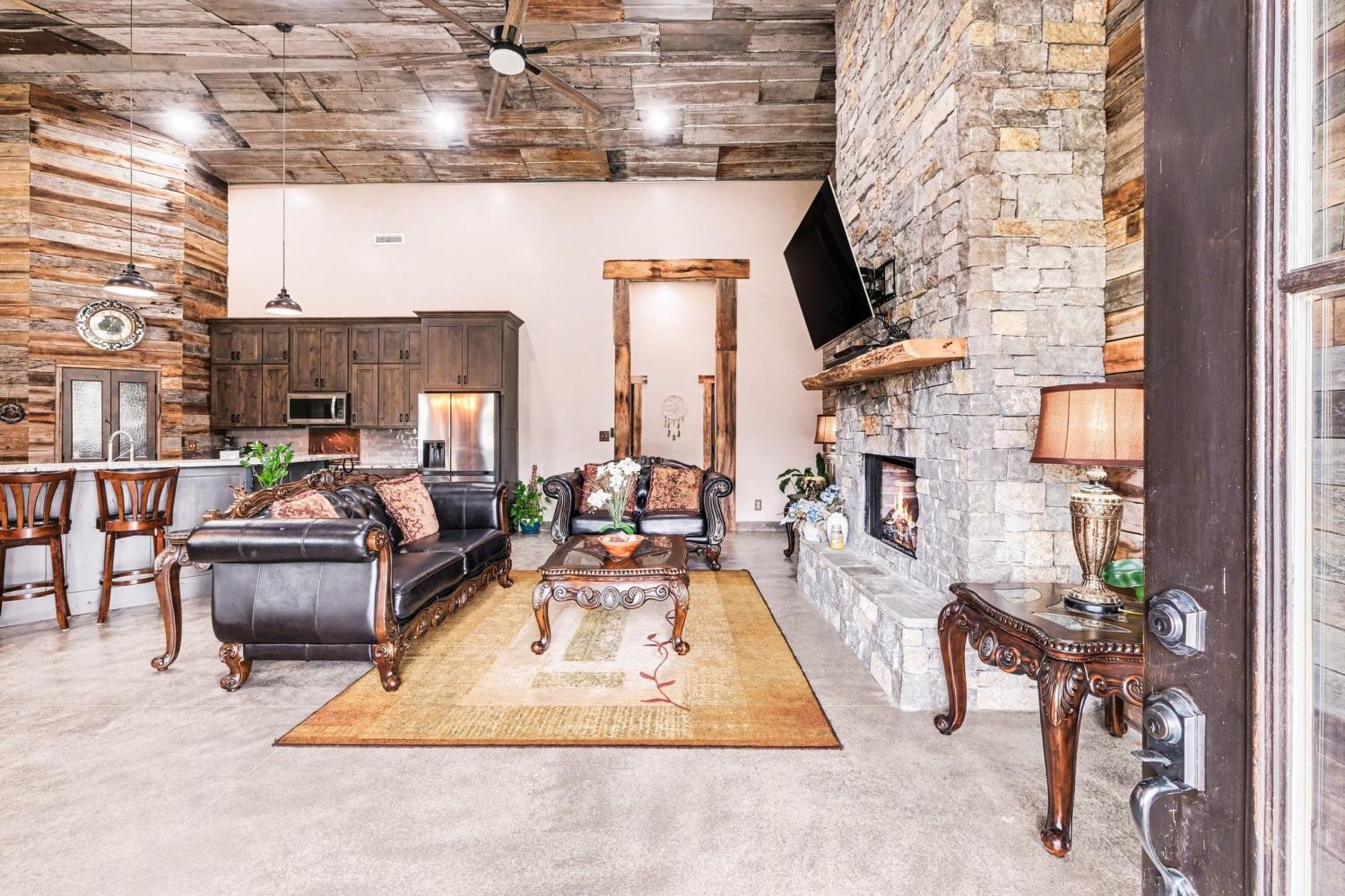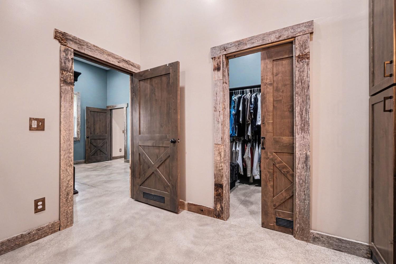 Tucked at the end of a private driveway on approximately 80 stunning acres, this one-of-a-kind barndominium offers sweeping views, abundant wildlife, and a level of peace and privacy that's difficult to find. Enjoy the unforgettable view from the oversized 12'×50' covered porch overlooking a charming pond. Soaring 12-foot ceilings run throughout the home, rising to an impressive 16 feet in both the kitchen and family room. Rich barnwood walls, gleaming tin ceilings, and concrete floors give the space its signature character, while a dramatic floor-to-ceiling rock fireplace anchors the living area with warmth and timeless style. The kitchen is a showstopper: custom soft-close cabinets, a generous island, granite countertops, tile backsplash, stainless steel appliances, and a classic farmhouse sink. The primary suite features a fully tiled tub and shower, double sinks, large walk-in closets, and a sleek pocket door. Bathrooms are upgraded with built in light, fan and music control. Custom wood cabinets, window and door frames throughout. A 10'×40' unfinished room upstairs can be finished as living space, a bunkroom, or a private office. The heated and cooled 40'×40' shop and garage can also be converted to additional living quarters. Established hunting grounds, an abundance of wildlife, gorgeous long-range views, and valuable standing timber round out a property that truly delivers on every front. Check out the video tour!