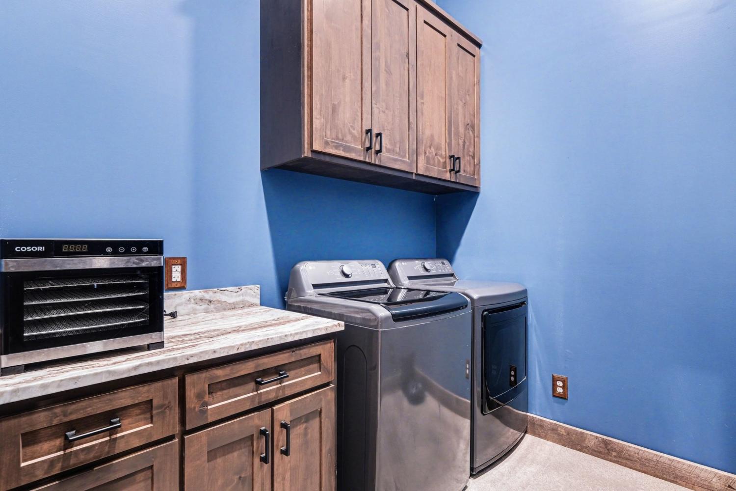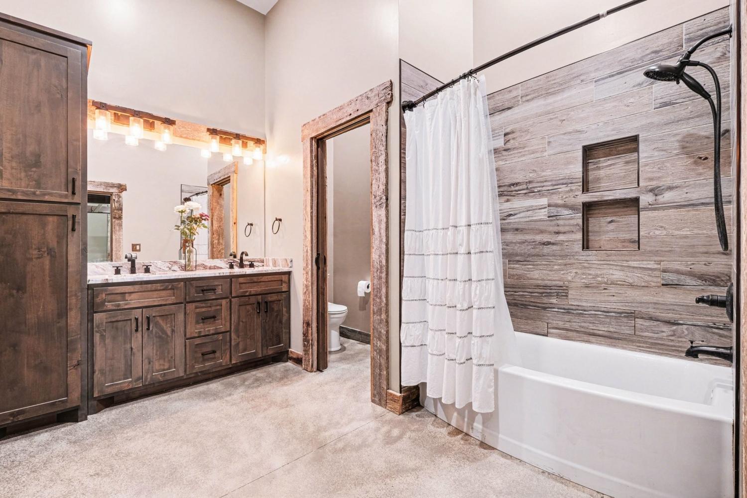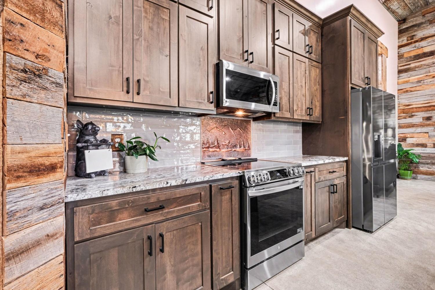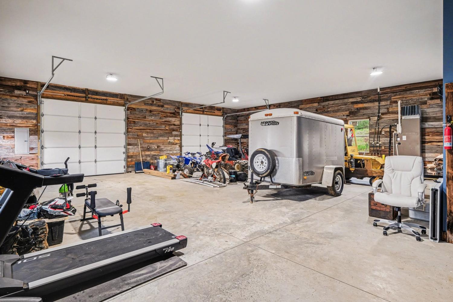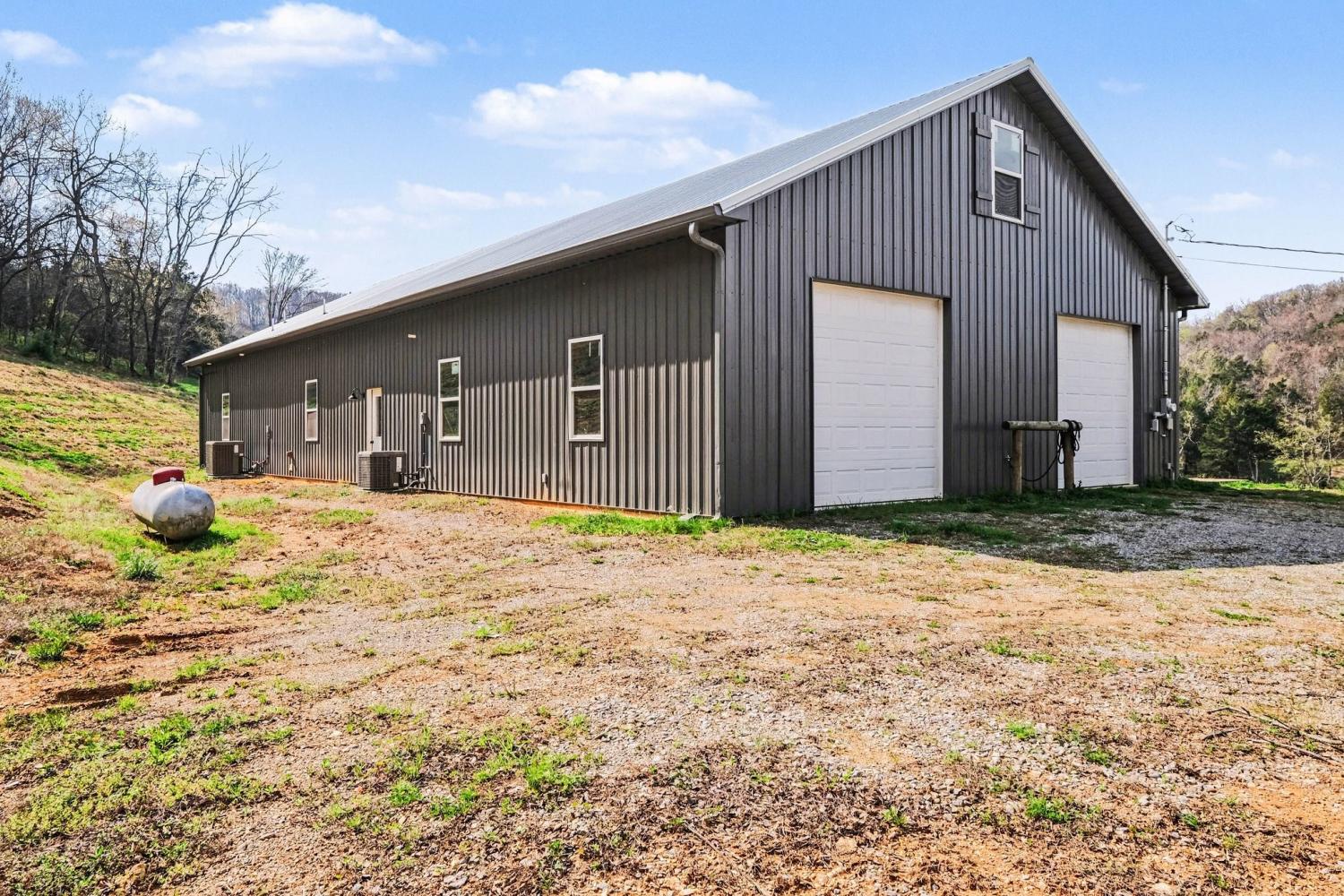 Tucked at the end of a private driveway on approximately 80 stunning acres, this one-of-a-kind barndominium offers sweeping views, abundant wildlife, and a level of peace and privacy that's difficult to find. Enjoy the unforgettable view from the oversized 12'×50' covered porch overlooking a charming pond. Soaring 12-foot ceilings run throughout the home, rising to an impressive 16 feet in both the kitchen and family room. Rich barnwood walls, gleaming tin ceilings, and concrete floors give the space its signature character, while a dramatic floor-to-ceiling rock fireplace anchors the living area with warmth and timeless style. The kitchen is a showstopper: custom soft-close cabinets, a generous island, granite countertops, tile backsplash, stainless steel appliances, and a classic farmhouse sink. The primary suite features a fully tiled tub and shower, double sinks, large walk-in closets, and a sleek pocket door. Bathrooms are upgraded with built in light, fan and music control. Custom wood cabinets, window and door frames throughout. A 10'×40' unfinished room upstairs can be finished as living space, a bunkroom, or a private office. The heated and cooled 40'×40' shop and garage can also be converted to additional living quarters. Established hunting grounds, an abundance of wildlife, gorgeous long-range views, and valuable standing timber round out a property that truly delivers on every front. Check out the video tour!