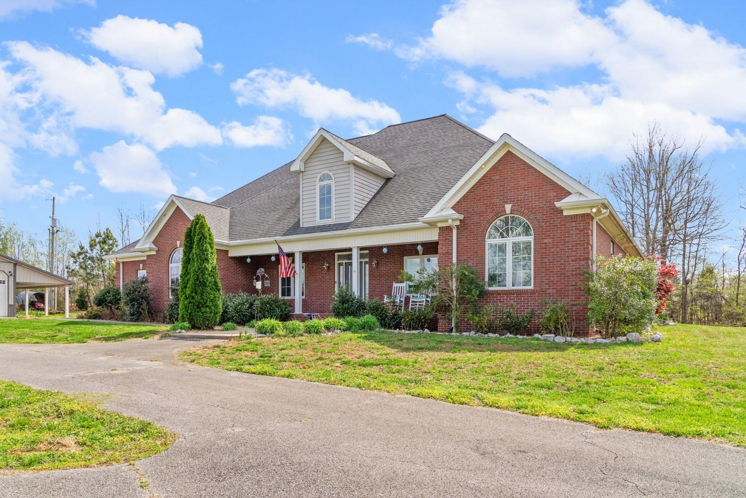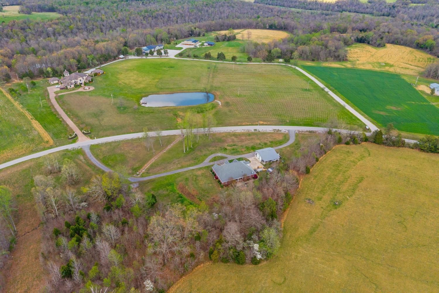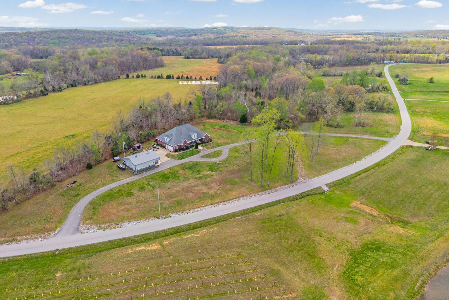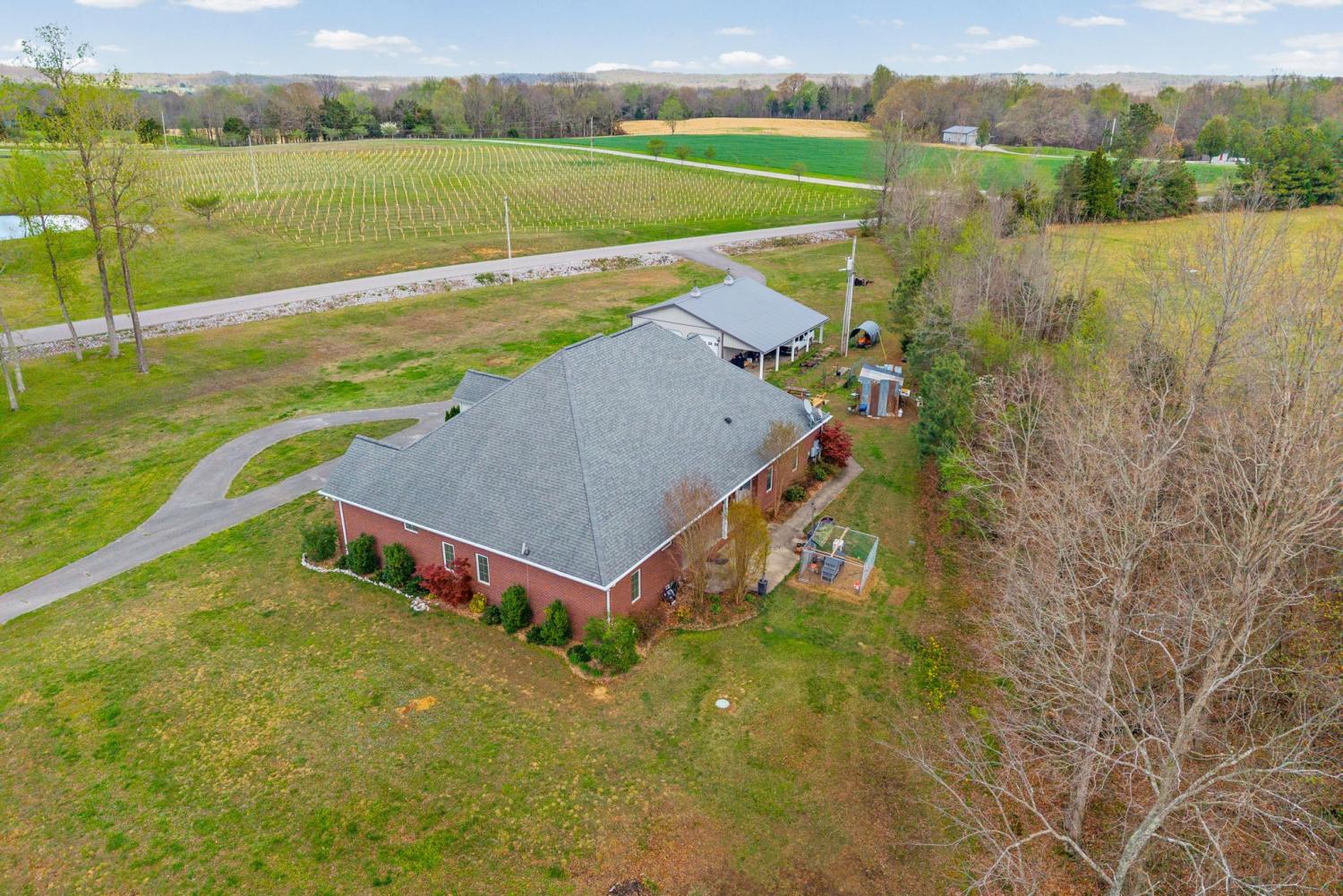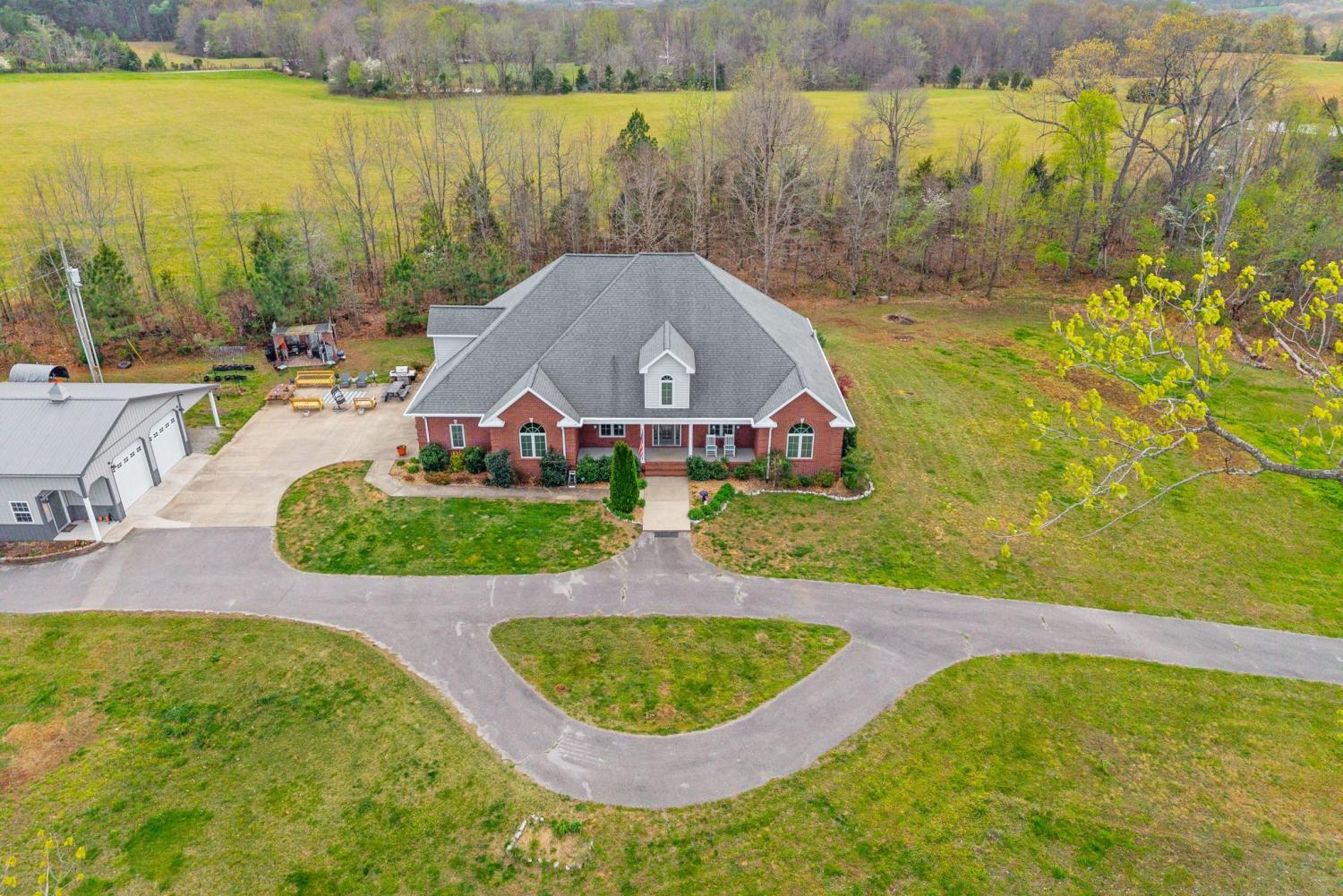 Stunning executive brick home set on nearly 3 private acres, offering space, efficiency, and thoughtful design throughout. This 5 bedroom, 5 full bathroom home features a functional layout with room to live, work, and entertain. The main level showcases heated ceramic tile floors powered by an energy-efficient electric tankless water heater, creating both comfort and long-term efficiency. The open concept living area is anchored by a beautiful stone fireplace, flowing seamlessly into a fully equipped kitchen with granite countertops, gas range with hood, built-in oven, ice maker, wine cooler, and ample cabinetry. Formal and casual dining spaces provide flexibility for everyday living and hosting. The primary suite offers a spacious retreat with a spa-like feel. Additional bedrooms are well-sized, and a bonus room provides added flexibility for a home office, media space, or guest accommodations. Hardwood flooring carries throughout the second level. Outside, enjoy privacy along with a 30x40 shop. The property also includes a 1,000-gallon owned propane tank. Fireplace and stove are connected to propane. Scenic views are enhanced by a Vineyard located just across the street. This property offers a rare blend of space, functionality, and efficiency in a peaceful setting.