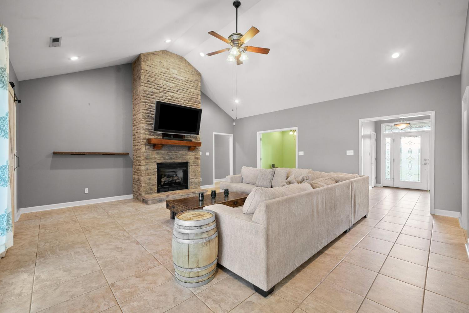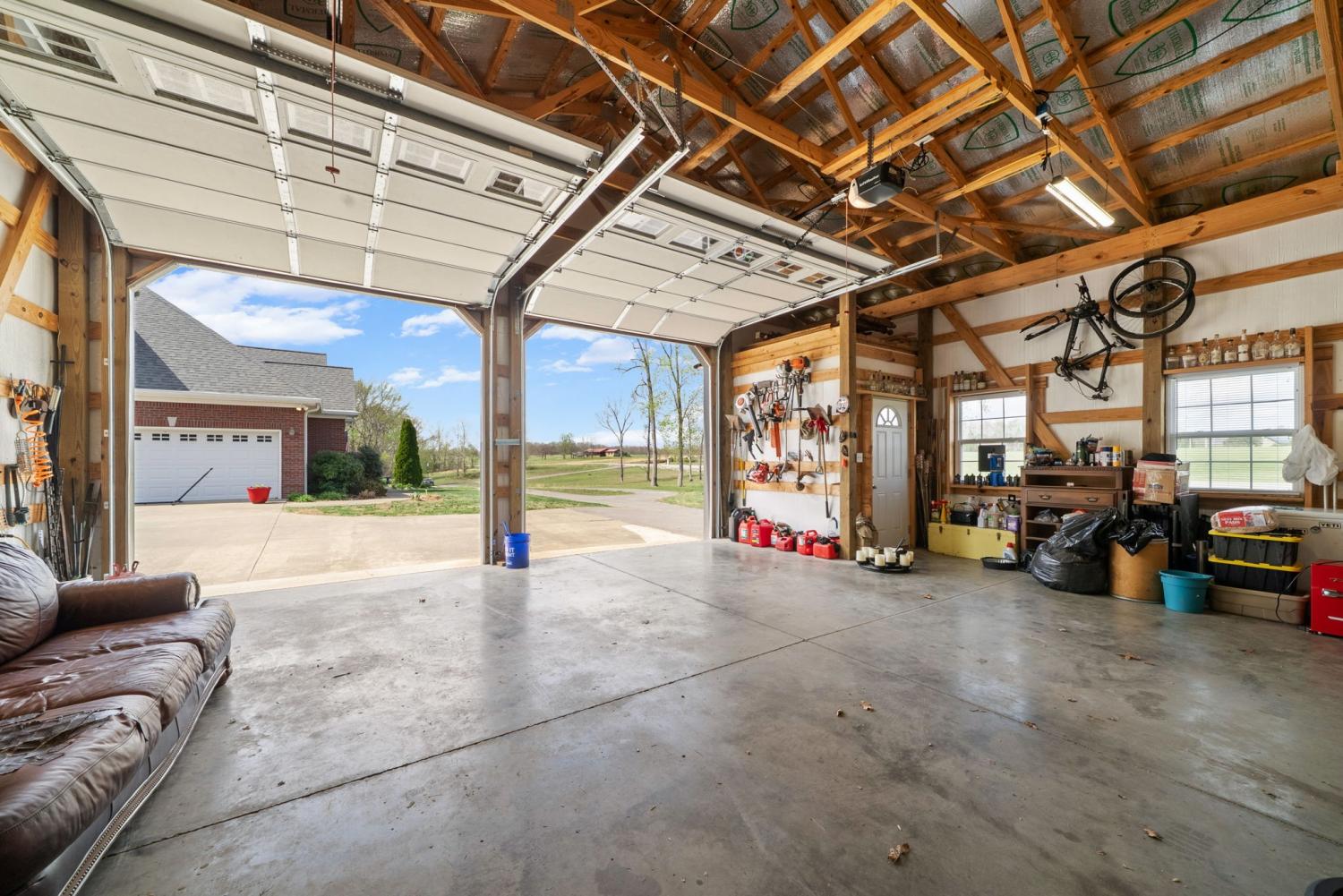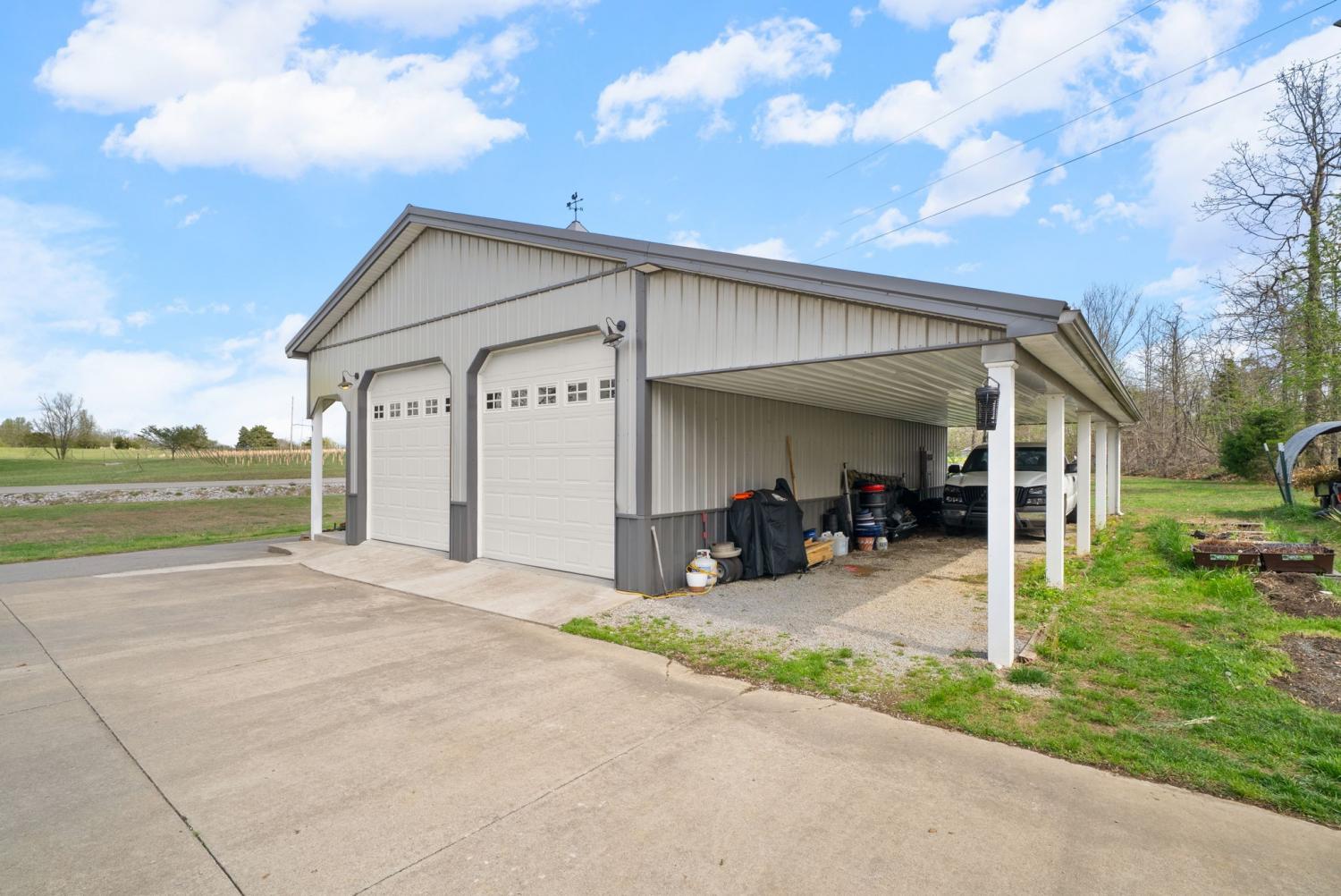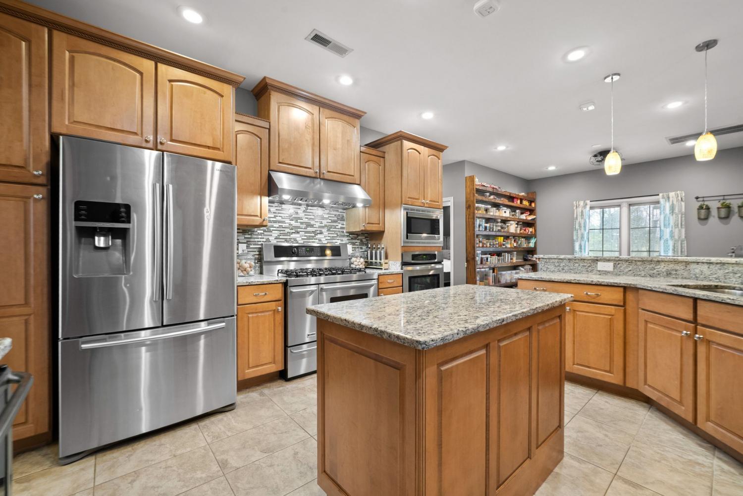 Stunning executive brick home set on nearly 3 private acres, offering space, efficiency, and thoughtful design throughout. This 5 bedroom, 5 full bathroom home features a functional layout with room to live, work, and entertain. The main level showcases heated ceramic tile floors powered by an energy-efficient electric tankless water heater, creating both comfort and long-term efficiency. The open concept living area is anchored by a beautiful stone fireplace, flowing seamlessly into a fully equipped kitchen with granite countertops, gas range with hood, built-in oven, ice maker, wine cooler, and ample cabinetry. Formal and casual dining spaces provide flexibility for everyday living and hosting. The primary suite offers a spacious retreat with a spa-like feel. Additional bedrooms are well-sized, and a bonus room provides added flexibility for a home office, media space, or guest accommodations. Hardwood flooring carries throughout the second level. Outside, enjoy privacy along with a 30x40 shop. The property also includes a 1,000-gallon owned propane tank. Fireplace and stove are connected to propane. Scenic views are enhanced by a Vineyard located just across the street. This property offers a rare blend of space, functionality, and efficiency in a peaceful setting.