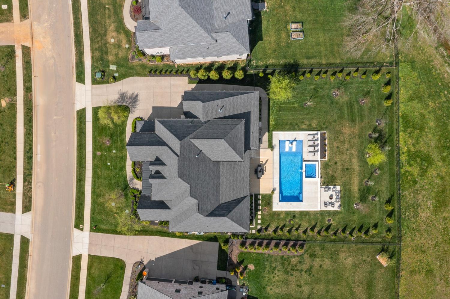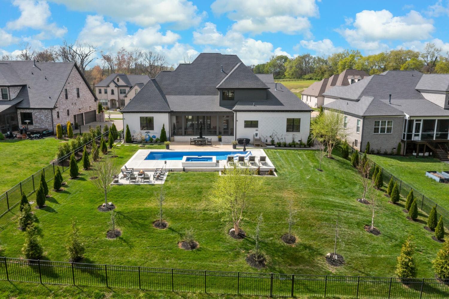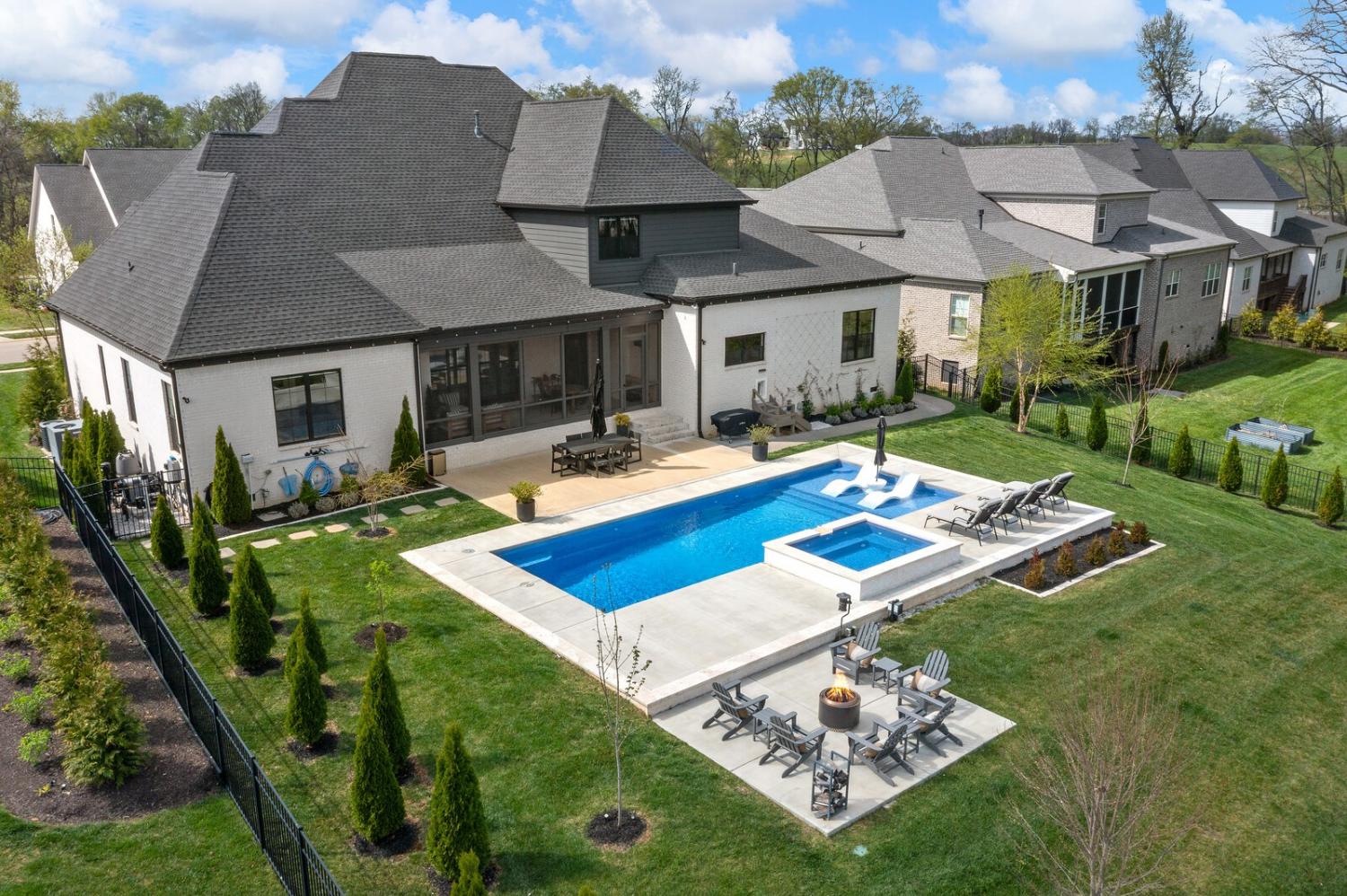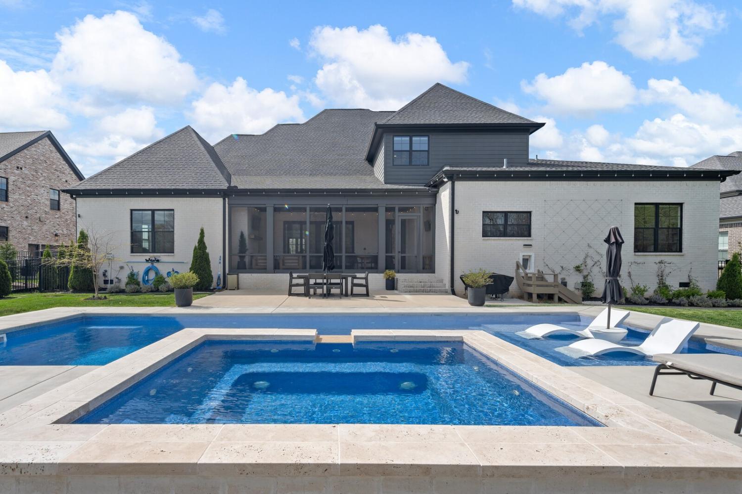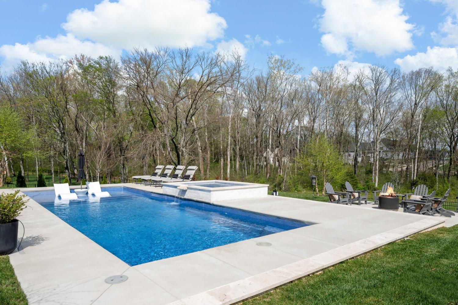 Welcome to this exceptional semi-custom estate in the prestigious Hardeman Springs community, perfectly situated on a private half-acre homesite. Offering 4,804 square feet, this beautifully designed home features 5 bedrooms, a bonus room, 4.5 baths, and a 3-car garage—blending timeless elegance with modern comfort throughout. The outdoor living space is truly remarkable. Backing to a serene, tree-lined buffer, the fully fenced yard provides privacy and tranquility. Over $300,000 has been invested to create a resort-style retreat, complete with a stunning in-ground pool and spa, professional landscape lighting, irrigation, and mature privacy plantings. Expansive sliding doors lead to a screened-in porch with a fireplace, ceiling fan, and heater—perfect for year-round entertaining. Inside, over $200,000 in upgrades elevate the home’s interior. The open-concept design centers around a chef’s kitchen featuring waterfall quartz countertops, double ovens, custom shelving, black stainless appliances, and under-cabinet lighting. The living room impresses with vaulted ceilings, cedar beams, and a gas fireplace with floor-to-ceiling shiplap and custom built-ins. The main-level primary suite offers a spa-like bath with dual vanities, soaking tub, walk-in shower, and an over-sized custom-designed boutique-styled closet. A private guest suite on the main level includes its own full bath and walk-in closet. Additional highlights include a spacious laundry room, built-in workspace, wet bar with wine fridge, pet retreat, and a flexible dining or sitting room. Upstairs features a large bonus room and three additional bedrooms. Thoughtful details throughout include engineered hardwood floors, epoxy garage floors, and a whole-home audio system extending outdoors. This turnkey home offers a rare opportunity to experience luxury living in one of the area’s most desirable communities.