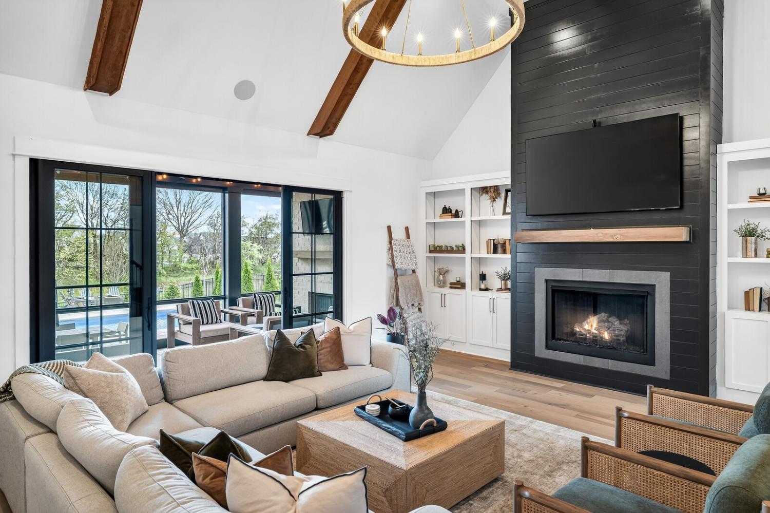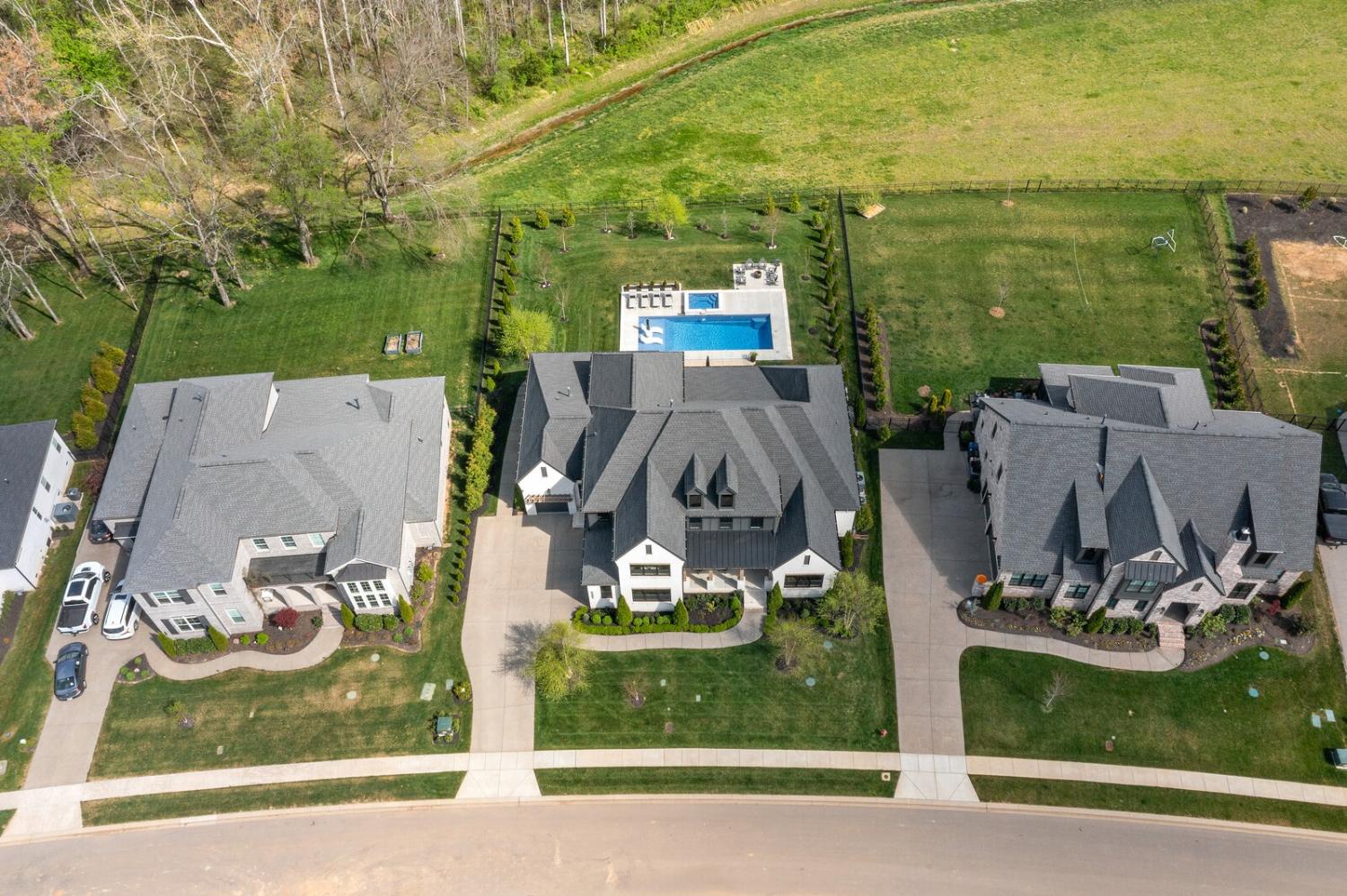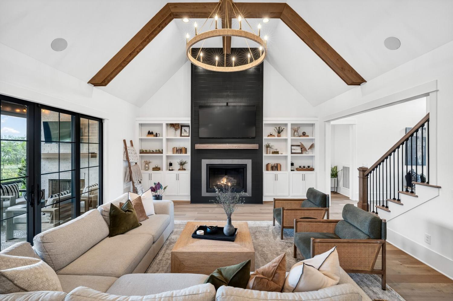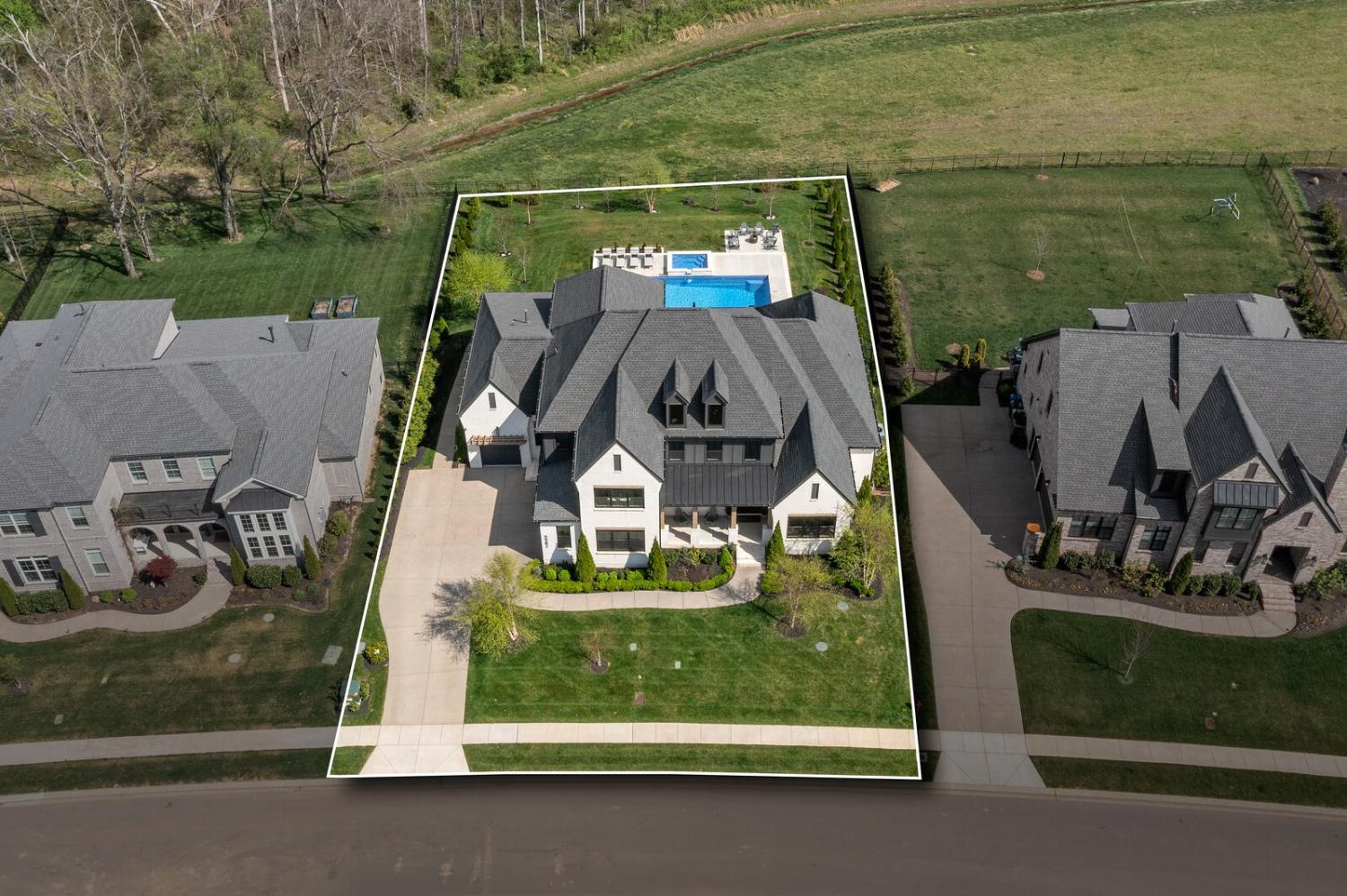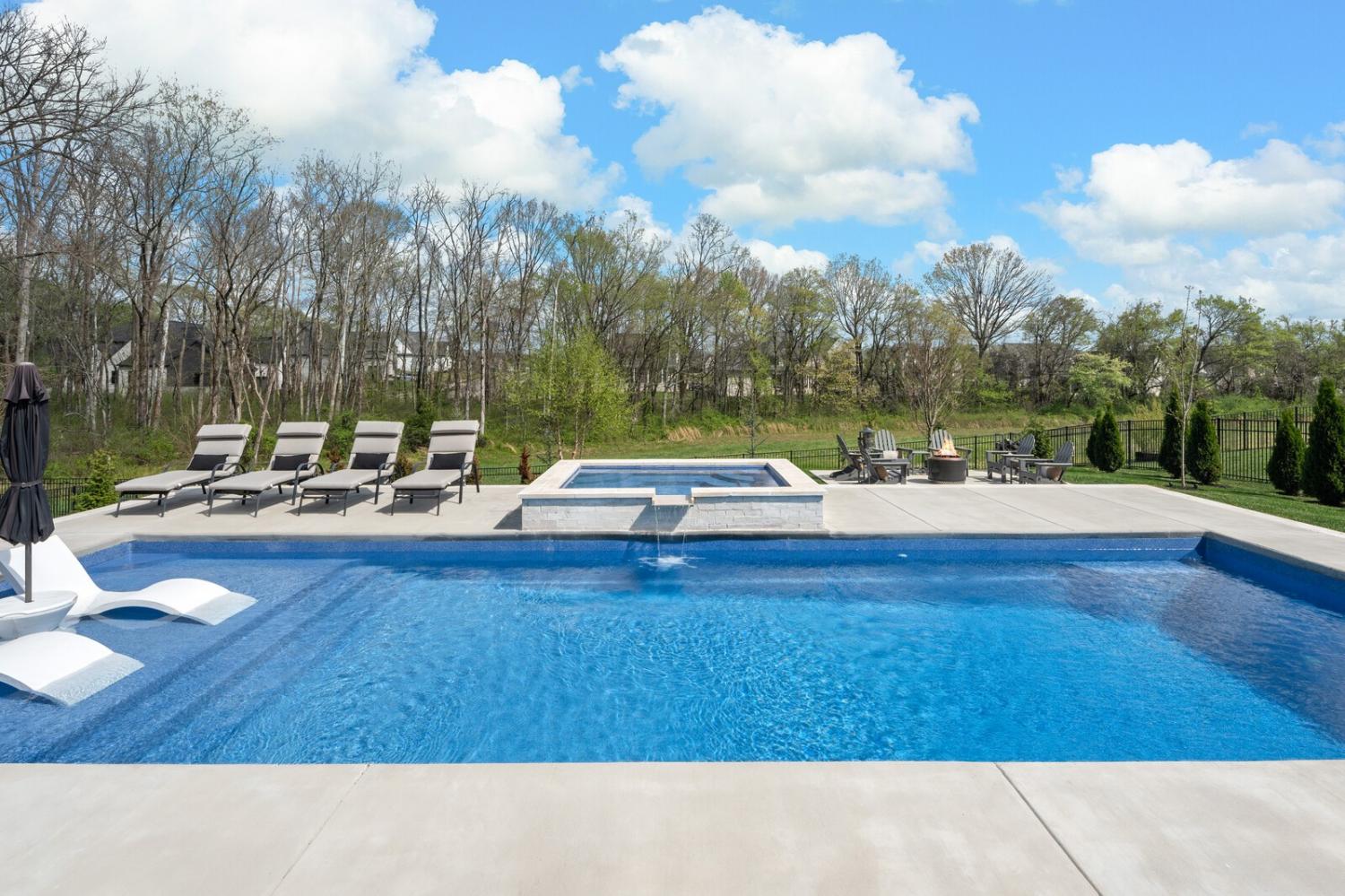 Welcome to this exceptional semi-custom estate in the prestigious Hardeman Springs community, perfectly situated on a private half-acre homesite. Offering 4,804 square feet, this beautifully designed home features 5 bedrooms, a bonus room, 4.5 baths, and a 3-car garage—blending timeless elegance with modern comfort throughout. The outdoor living space is truly remarkable. Backing to a serene, tree-lined buffer, the fully fenced yard provides privacy and tranquility. Over $300,000 has been invested to create a resort-style retreat, complete with a stunning in-ground pool and spa, professional landscape lighting, irrigation, and mature privacy plantings. Expansive sliding doors lead to a screened-in porch with a fireplace, ceiling fan, and heater—perfect for year-round entertaining. Inside, over $200,000 in upgrades elevate the home’s interior. The open-concept design centers around a chef’s kitchen featuring waterfall quartz countertops, double ovens, custom shelving, black stainless appliances, and under-cabinet lighting. The living room impresses with vaulted ceilings, cedar beams, and a gas fireplace with floor-to-ceiling shiplap and custom built-ins. The main-level primary suite offers a spa-like bath with dual vanities, soaking tub, walk-in shower, and an over-sized custom-designed boutique-styled closet. A private guest suite on the main level includes its own full bath and walk-in closet. Additional highlights include a spacious laundry room, built-in workspace, wet bar with wine fridge, pet retreat, and a flexible dining or sitting room. Upstairs features a large bonus room and three additional bedrooms. Thoughtful details throughout include engineered hardwood floors, epoxy garage floors, and a whole-home audio system extending outdoors. This turnkey home offers a rare opportunity to experience luxury living in one of the area’s most desirable communities.