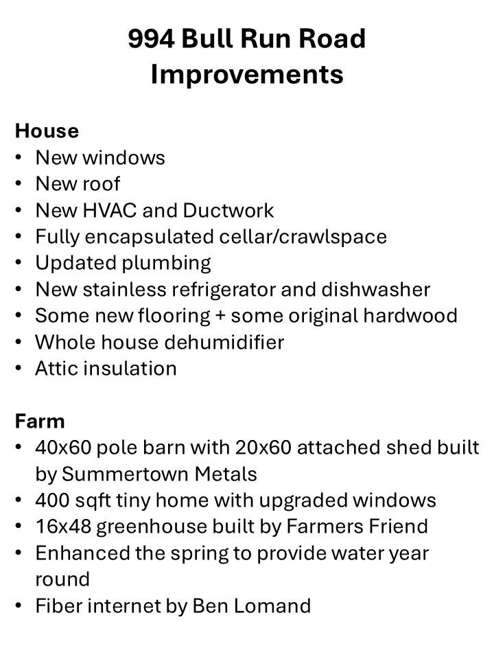 Dreaming of living the country life in one of the most beautiful small towns? Let me introduce you to 994 Bull Run Rd, located in world famous Lynchburg, TN. This fully functional farm and home are ready and waiting for you and your animals. At the center, you'll find a 1957 farmhouse that has been completely updated with stainless appliances, a fully encapsulated walk-in cellar, and new roof, windows, HVAC, water heater, plumbing, attic insulation and some new flooring as well as some of the original pretty hardwood. There is also fiber internet from Ben Lomand to keep you connected! As you step outside, you'll find everything you need for the perfect farm or homestead life. The entire farm is fenced and cross-fenced. There's a new 40x60 pole barn, loft barn, tobacco barn that's been reinforced, and a farm shop. Some of the buildings have electricity. In the front, there's a new 400 sqft tiny home that's perfect for a guest house, an office, or an AirBnB. It has upgraded windows from Window World, a mini-split unit to regulate the temperature as well as a full bathroom and is on it's own electric meter. As you walk the land, you'll see it has multiple pastures, a holding pen, a year round spring, and a pond making it ready for whatever farm animals you bring. And when you're ready to leave the farm, you'll find it convenient to everything you need. If you enjoy the lake life, you'll appreciate that it's a short 5 minute drive (2.5 miles) to the Lost Creek boat launch on Tim's Ford Lake. You're 10 minutes to the historical Lynchburg town square & Jack Daniel Distillery. Tullahoma is a 20 minute drive for all of your larger shopping & hospital needs. As far as a major city, Huntsville is an easy one hour commute.