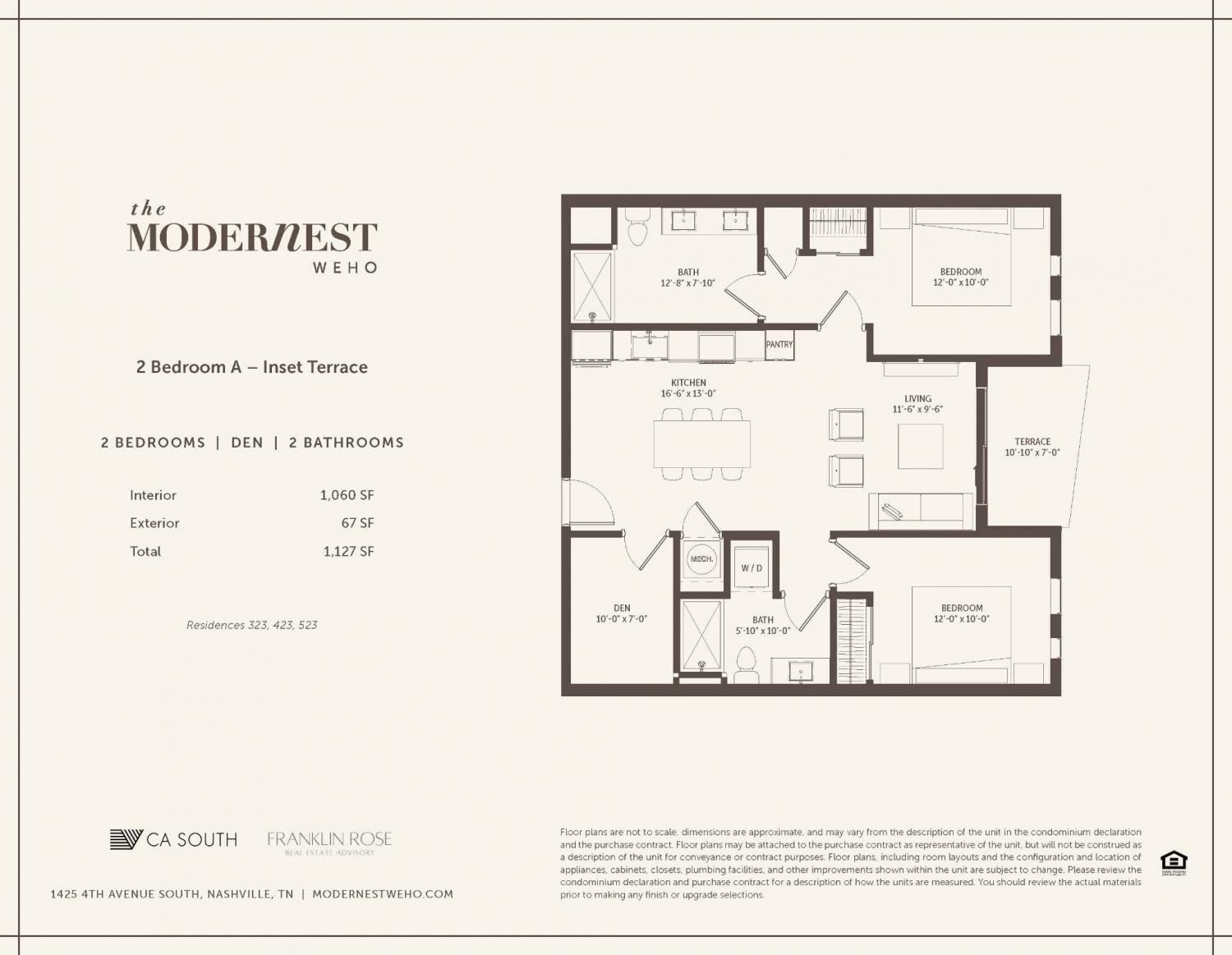 Thoughtfully designed 2 Bedroom + Separate Den offering flexible space for a home office, guest area, or additional living use. See floor plan for layout. Introducing The Modernest WeHo - where elevated design meets exceptional flexibility in Nashville’s Wedgewood-Houston neighborhood. Offering studio to three-bedroom condominium residences, each home features contemporary interiors, premium finishes, open layouts, and private outdoor spaces. Residences may be offered furnished or unfurnished. The Modernest is designed around flexible ownership, allowing you to live in your home or lease it for short- or long-term stays. Optional third-party hospitality management provides a seamless, turnkey experience. Amenities include a resort-style pool and terrace, state-of-the-art fitness and yoga studio, infrared sauna and cold plunge, co-working spaces, and curated social areas with coffee bar and a rooftop terrace with incredible Nasvhille views. Located just steps from Wedgewood-Houston’s vibrant cultural scene -including Michelin-recognized dining, Soho House, Hermès, and Geodis Park, home of the 2028 Olympic soccer games. Construction is underway with deliveries commencing in early 2027. For private showings and additional details, contact the listing agents directly.