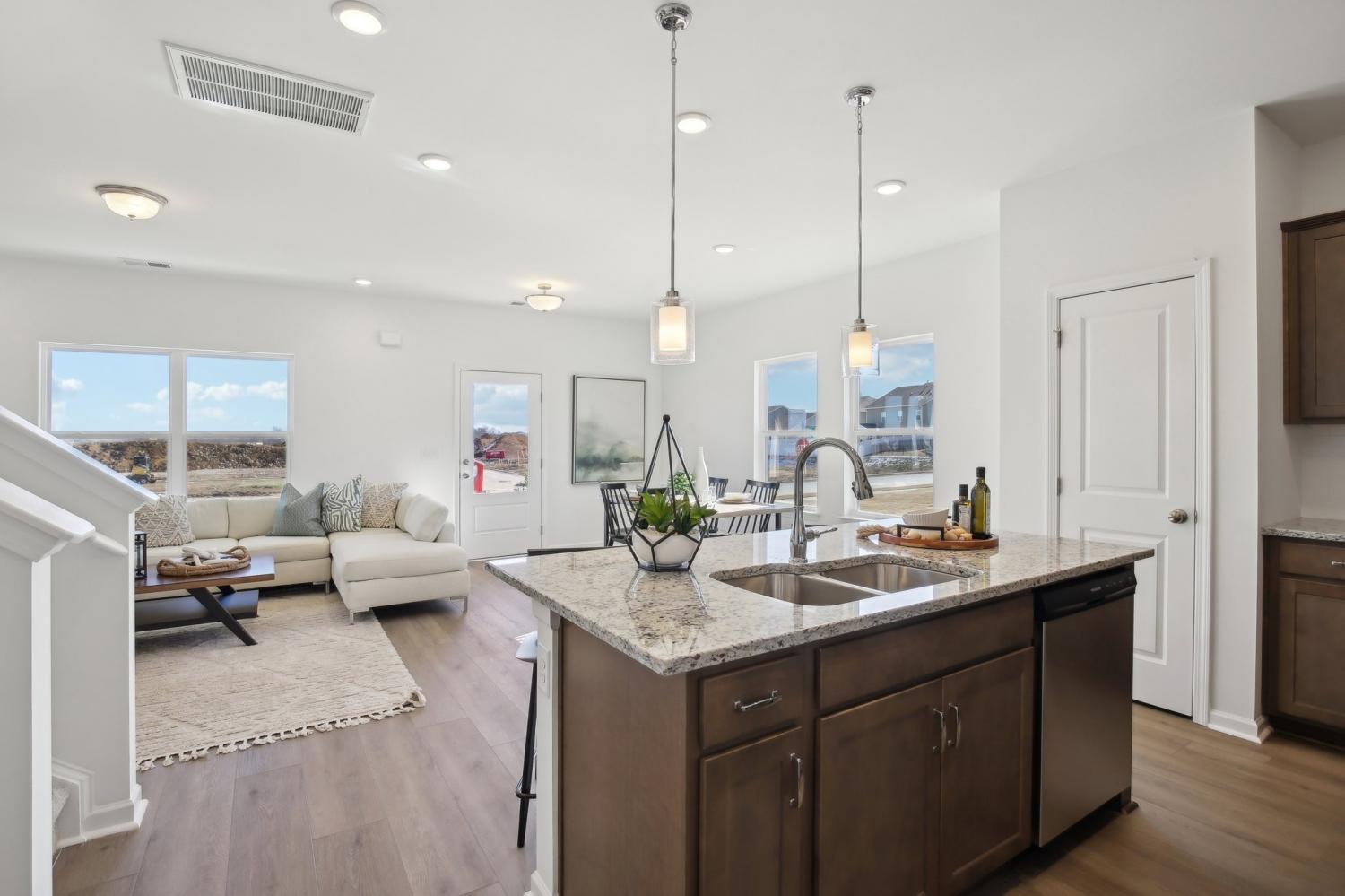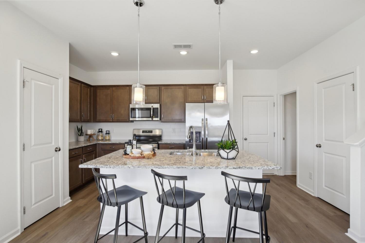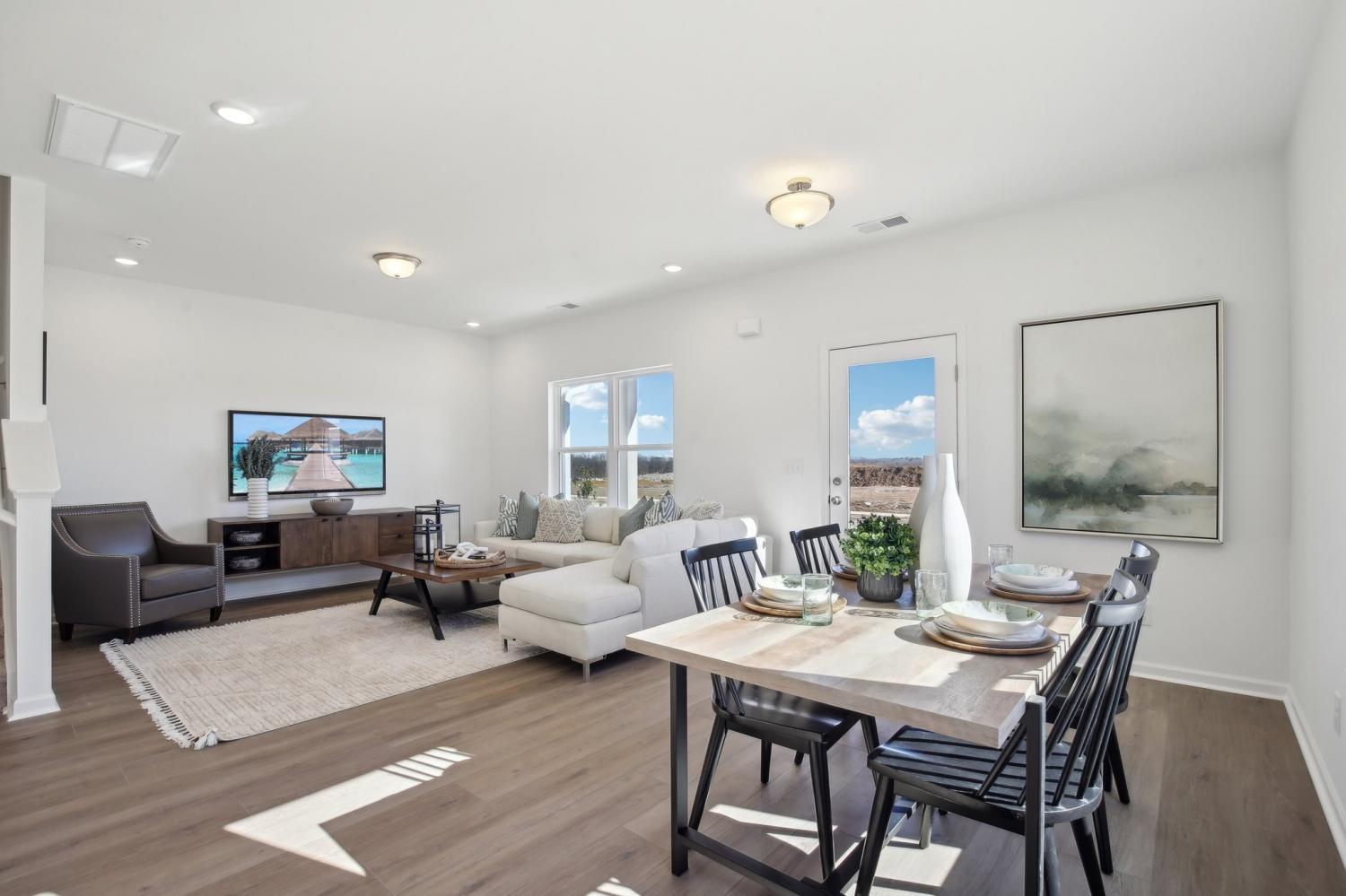 The Sussex at Wilson Meadows by Smith Douglas Homes. Experience convenient, modern living in the spacious Sussex townhome. The two-car rear garage leads to a kitchen with a large center island. The cozy dining area is open to the kitchen and family room, with a convenient exit to the expansive front porch. Upstairs, the owner's suite features a spacious walk-in closet and a separate water closet. Two bedrooms, a full hall bath, and a second-floor laundry room provide convenience for household chores. *4.99% FHA / VA fixed rate or $15,000 Felx cash. Special offer details apply. Contact the onsite agent for details.