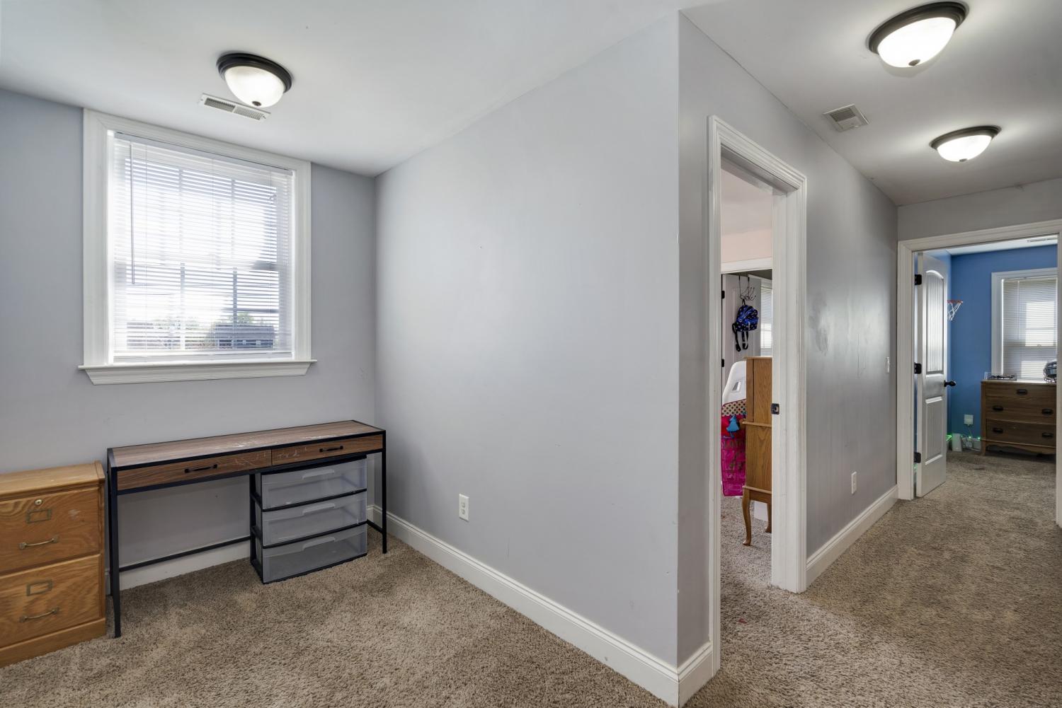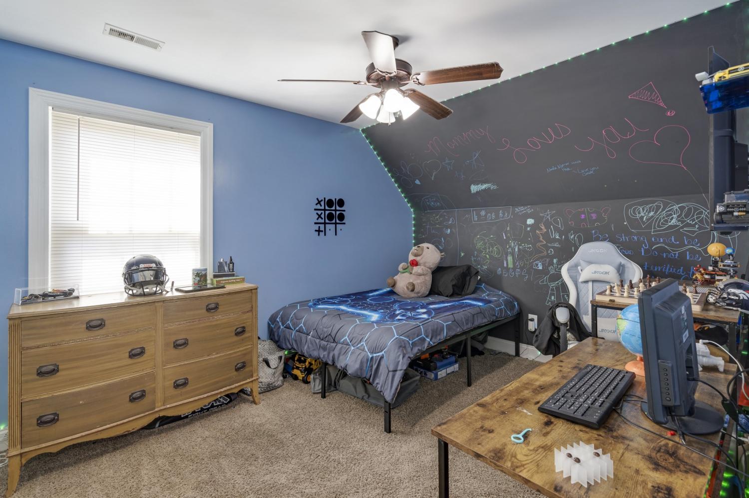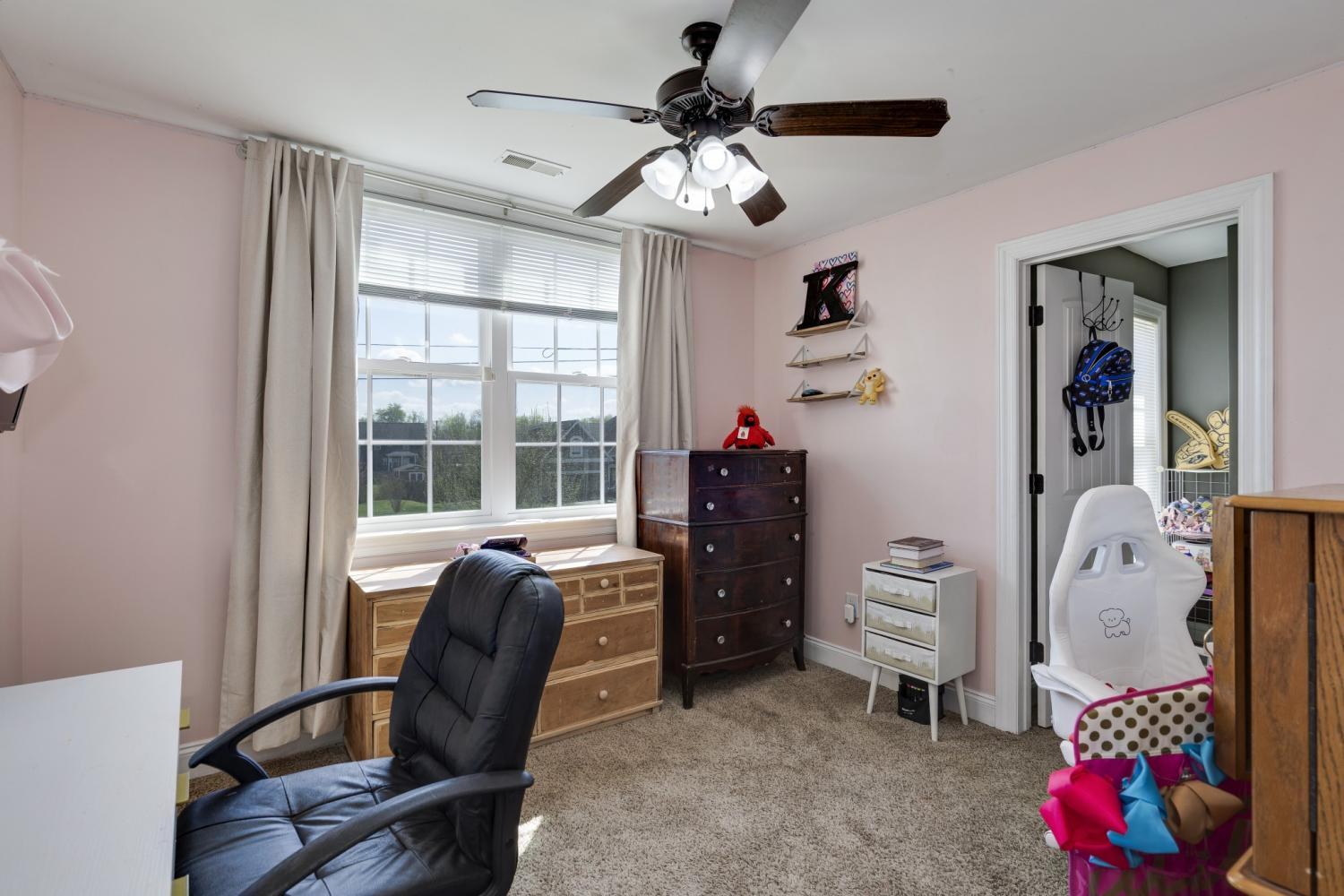 Great home in a great location! The primary bedroom is on the main floor with 2 bedrooms and a bonus room (being used as a bedroom) upstairs. Other features: 2-car garage, fun, active neighborhood; fenced-in back yard; storage shed; backs up to beautiful farm land.