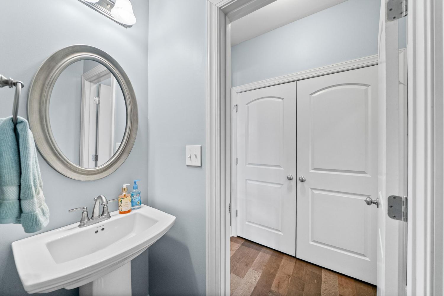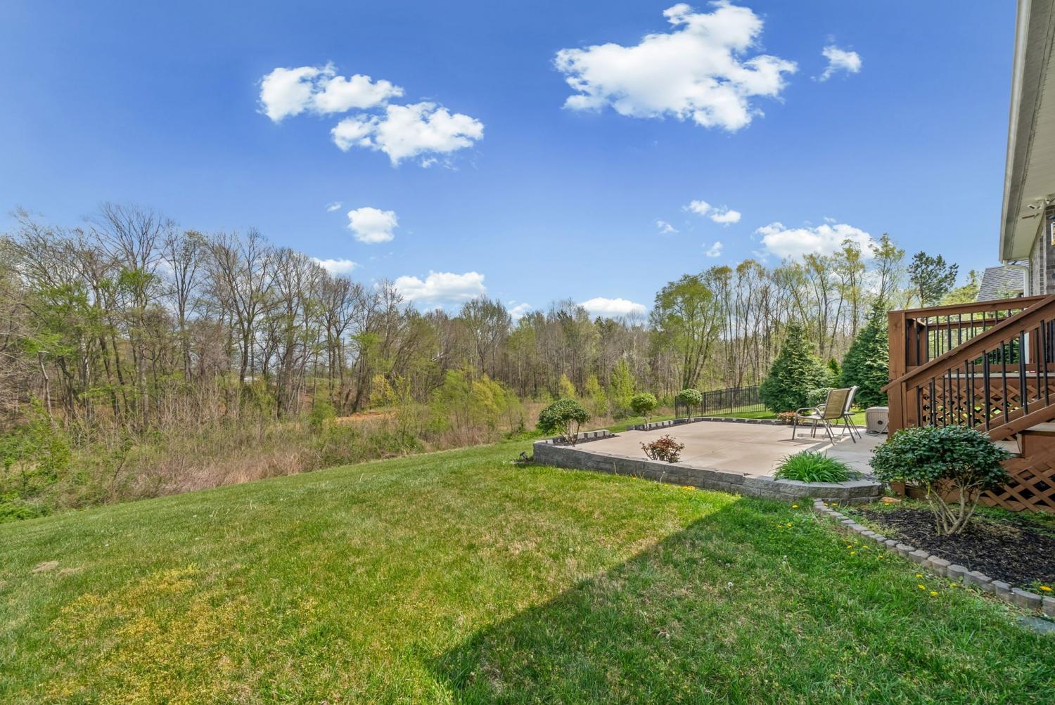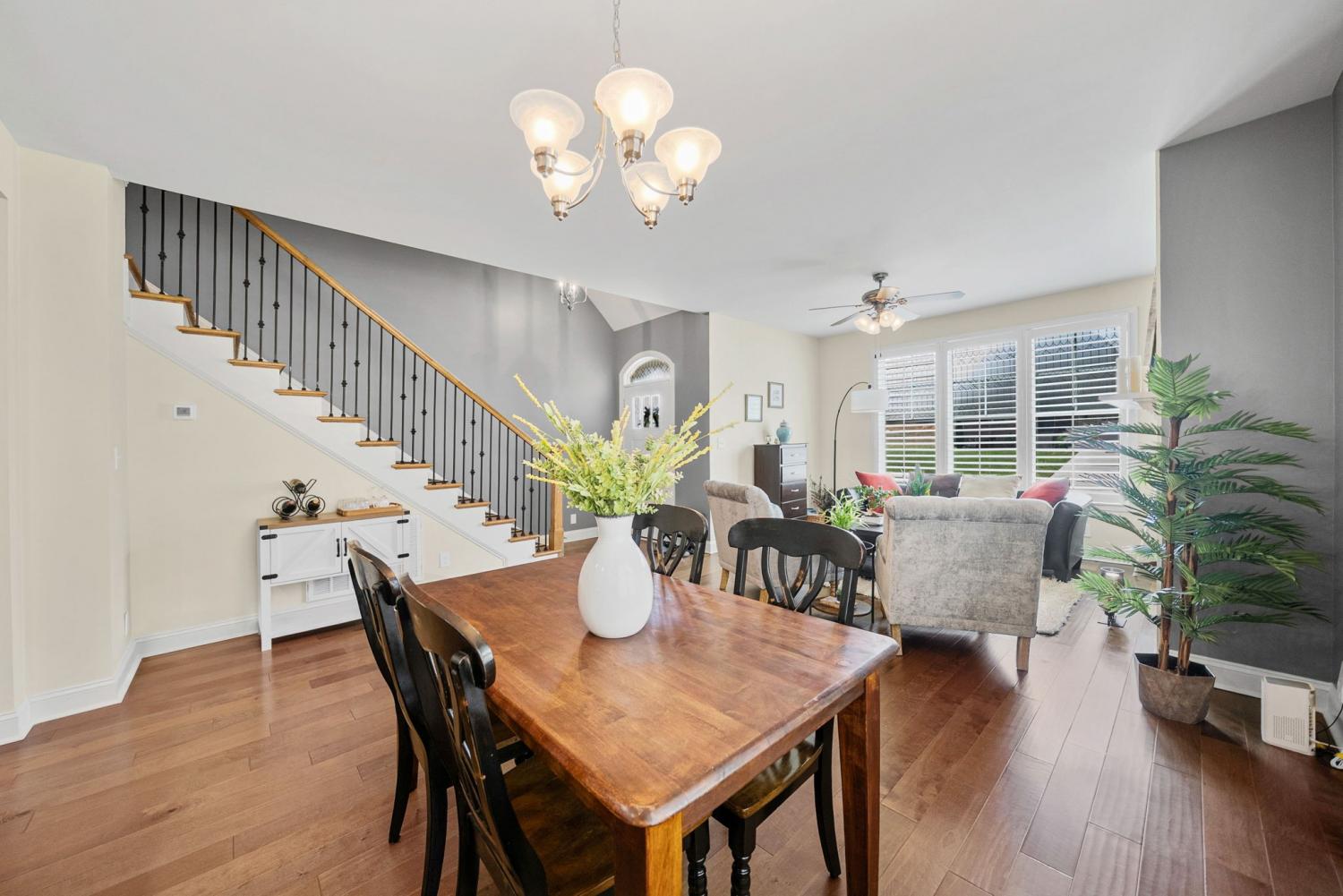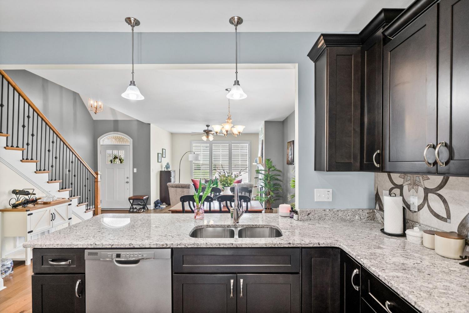 Magnificent and well-maintained Contemporary home on a crescent street situated on a nearly half acre partially wooded lot with a semi-private backyard. Inside you will find an open and inviting living room with abundant natural light, fireplace with propane logs (propane not connected) and wide louver plantation shutters. The spacious kitchen with recessed lighting features stainless steel appliances, granite counter tops, tile backsplash, pendant lights over the bar area, a recently added coffee bar/microwave shelf with a drawer base cabinet and extra wall cabinets, two pantries (second pantry in hall), and a Fotile 1000 CFM range hood vented to the exterior of the home. The private primary suite is nestled in the back corner of the home, complete with two walk-in closets, a double vanity, and a walk-in tile shower. A half bath and separate laundry room are also located on the main level. Engineered wood flooring is present in the main level common areas, with luxury vinyl tile in the baths and laundry area. Stroll up the beautiful wooden staircase to the second level where you will find two additional spacious bedrooms, full bath, and a recent interior expansion with a skylight with a push button operated blind. This great flex space can be used as a bonus room, office, or a 4th bedroom as it does have a large closet and door. The back door has built in blinds, a transom window above the doors, and a storm/screen door that leads to the covered back porch that leads to both the partially covered deck and the raised patio and into the backyard to relax and unwind while enjoying the wooded back drop. The spacious garage has plenty of room for cars and storage and has a utility sink for convenience. HOA fee covers lawn care and trash pick-up.
