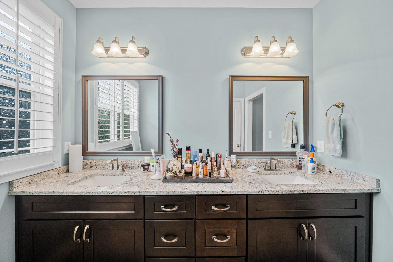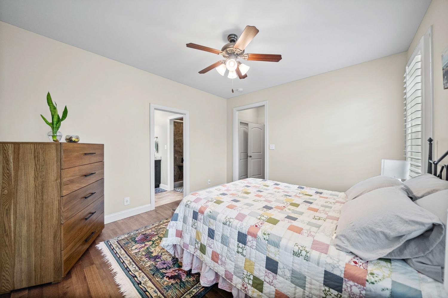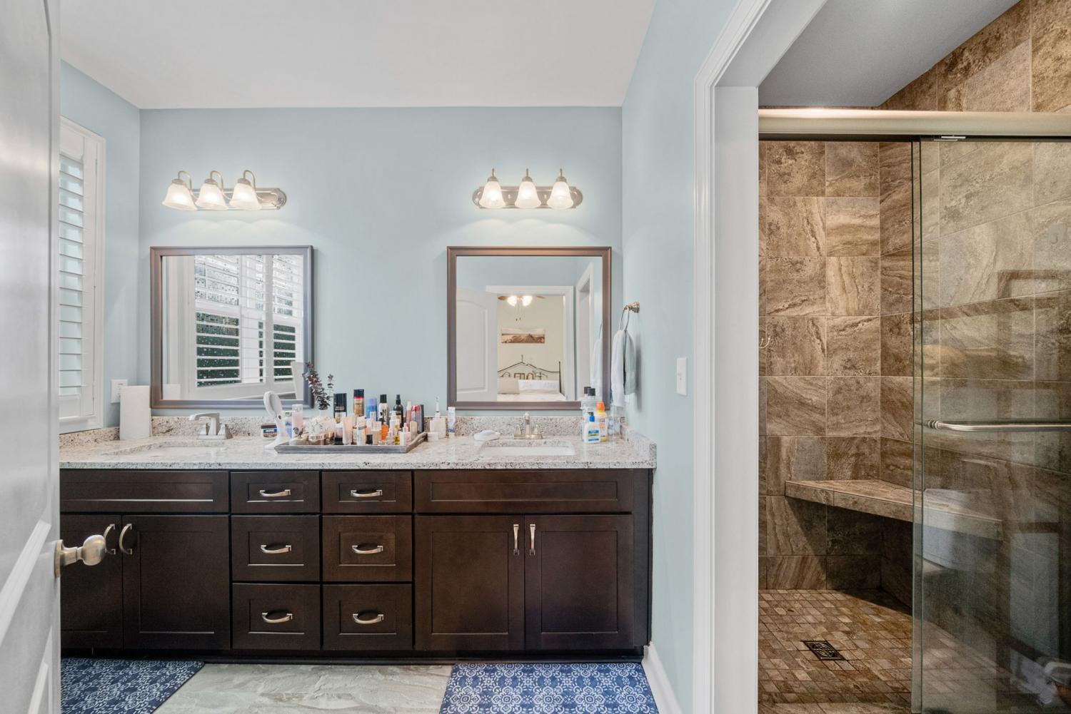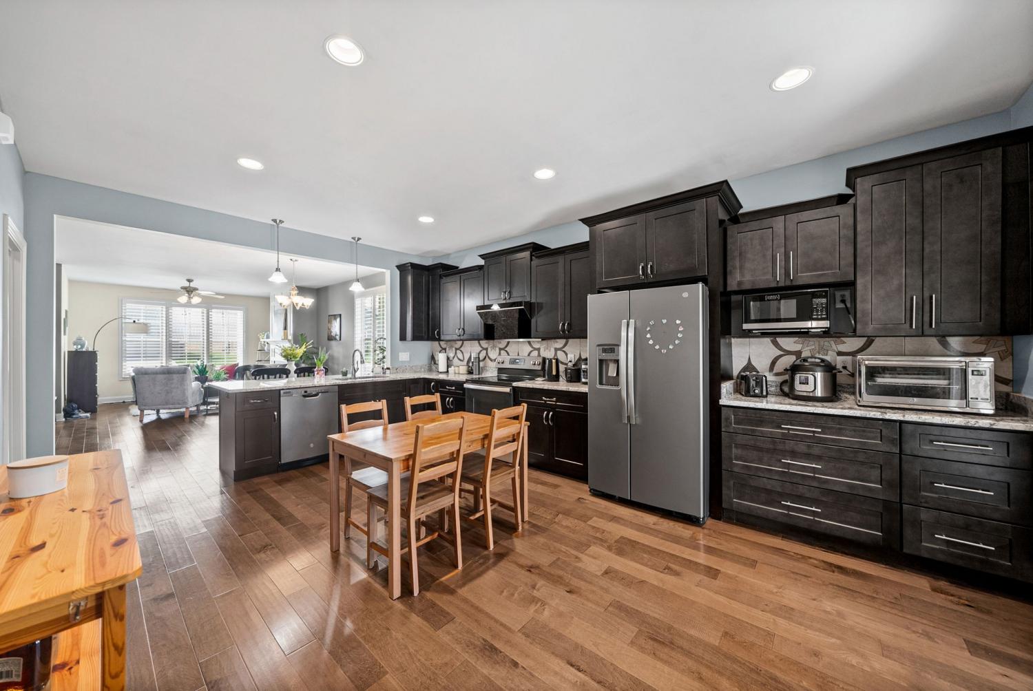 Magnificent and well-maintained Contemporary home on a crescent street situated on a nearly half acre partially wooded lot with a semi-private backyard. Inside you will find an open and inviting living room with abundant natural light, fireplace with propane logs (propane not connected) and wide louver plantation shutters. The spacious kitchen with recessed lighting features stainless steel appliances, granite counter tops, tile backsplash, pendant lights over the bar area, a recently added coffee bar/microwave shelf with a drawer base cabinet and extra wall cabinets, two pantries (second pantry in hall), and a Fotile 1000 CFM range hood vented to the exterior of the home. The private primary suite is nestled in the back corner of the home, complete with two walk-in closets, a double vanity, and a walk-in tile shower. A half bath and separate laundry room are also located on the main level. Engineered wood flooring is present in the main level common areas, with luxury vinyl tile in the baths and laundry area. Stroll up the beautiful wooden staircase to the second level where you will find two additional spacious bedrooms, full bath, and a recent interior expansion with a skylight with a push button operated blind. This great flex space can be used as a bonus room, office, or a 4th bedroom as it does have a large closet and door. The back door has built in blinds, a transom window above the doors, and a storm/screen door that leads to the covered back porch that leads to both the partially covered deck and the raised patio and into the backyard to relax and unwind while enjoying the wooded back drop. The spacious garage has plenty of room for cars and storage and has a utility sink for convenience. HOA fee covers lawn care and trash pick-up.