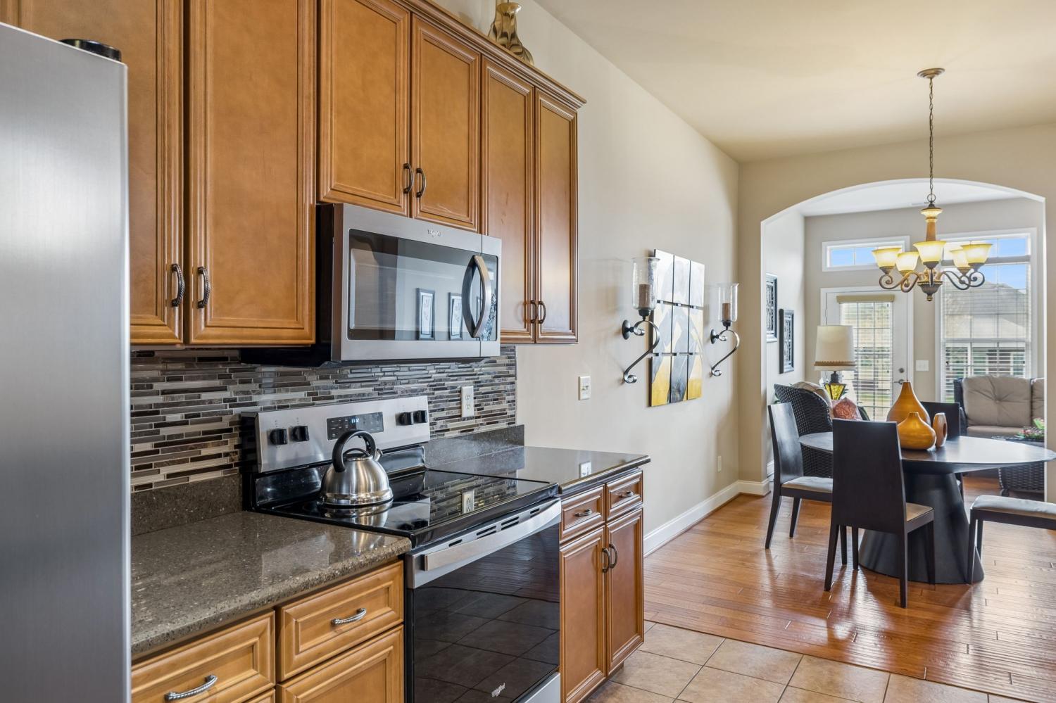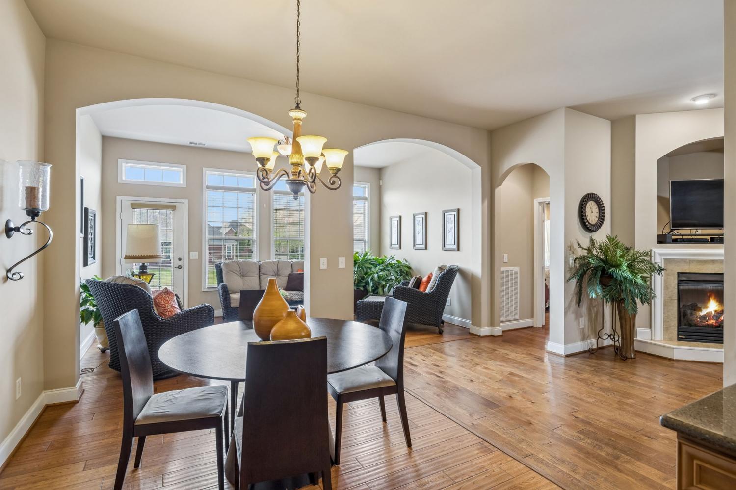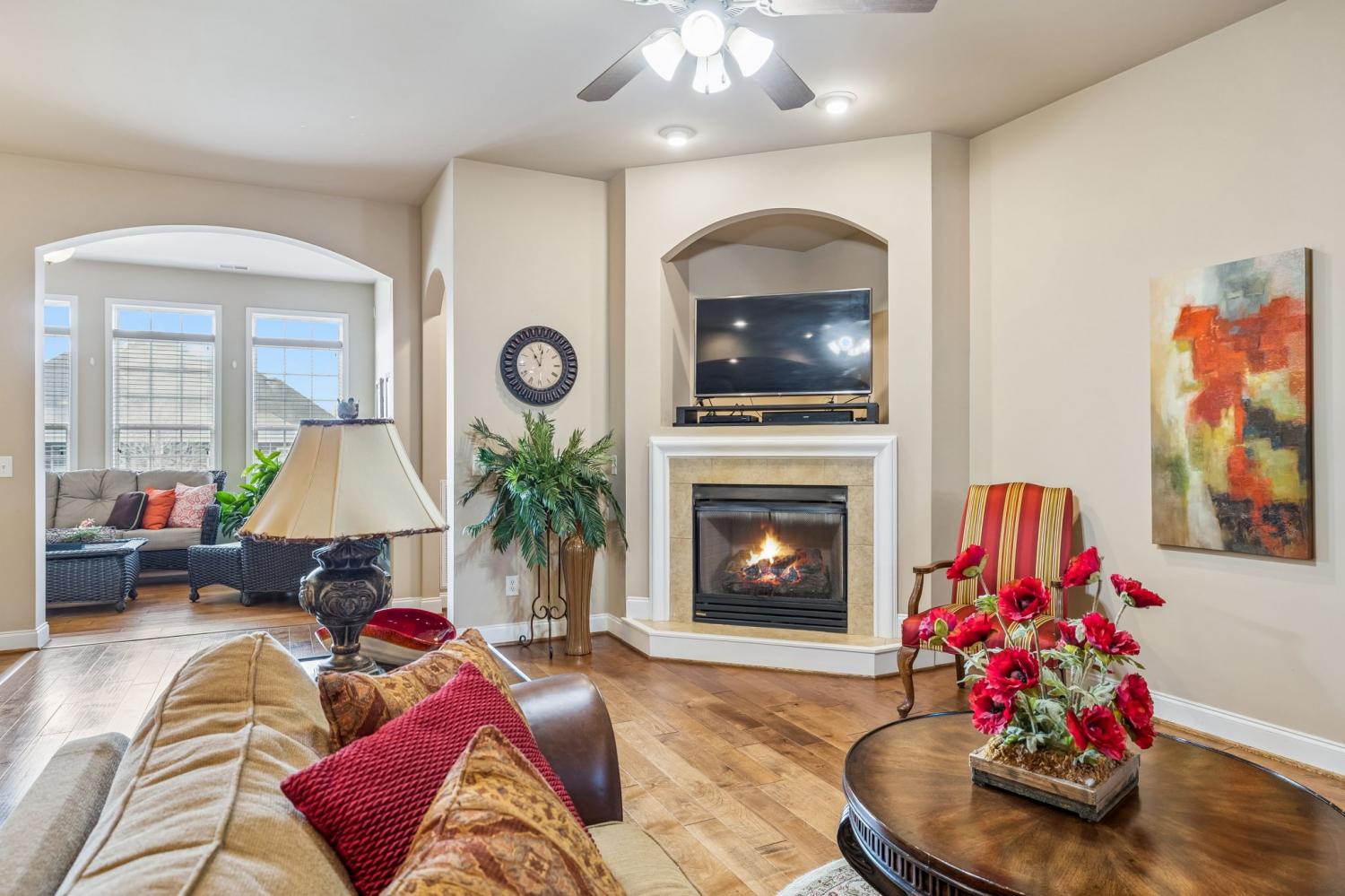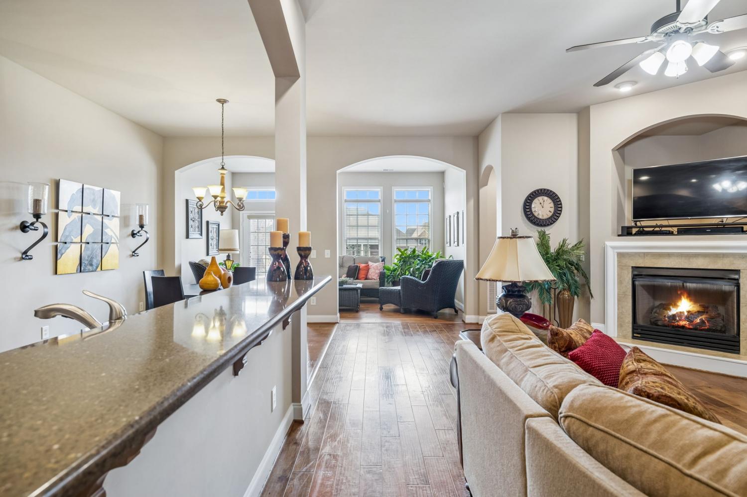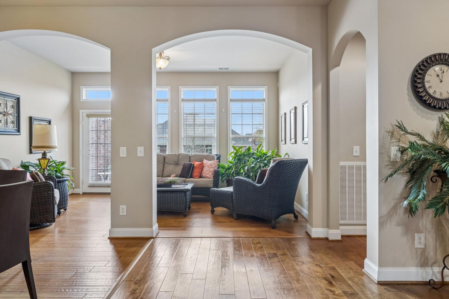 Built by Frank Batson Homes, this all brick residence offers quality craftsmanship and true main level living with just one step entry and a primary suite on the main floor. The open layout features 10 foot ceilings, hand scraped hardwoods, and abundant natural light. The kitchen includes stainless appliances, a large pantry, and flows seamlessly into the living and dining areas. Enjoy a gas fireplace, sunroom style sitting area, and multiple spaces for everyday living and entertaining. The main level primary suite offers tray ceilings, a walk in closet, dual vanities, and a jetted tub. A second bedroom or office with full bath is also on the main level. Upstairs includes a spacious bonus room, private bedroom with full bath, and walk in storage. Outside features include an aggregate driveway, irrigation system, gas lantern, and a private back porch overlooking common space. Located in Bridgewater with walking trails, pool, and playground, just minutes to Summit Hospital, Percy Priest Lake, Providence, and downtown Nashville. HOA covers lawn care, exterior maintenance including roof, and insurance.