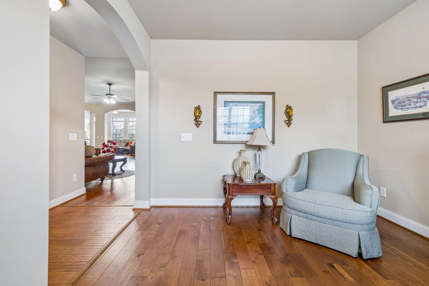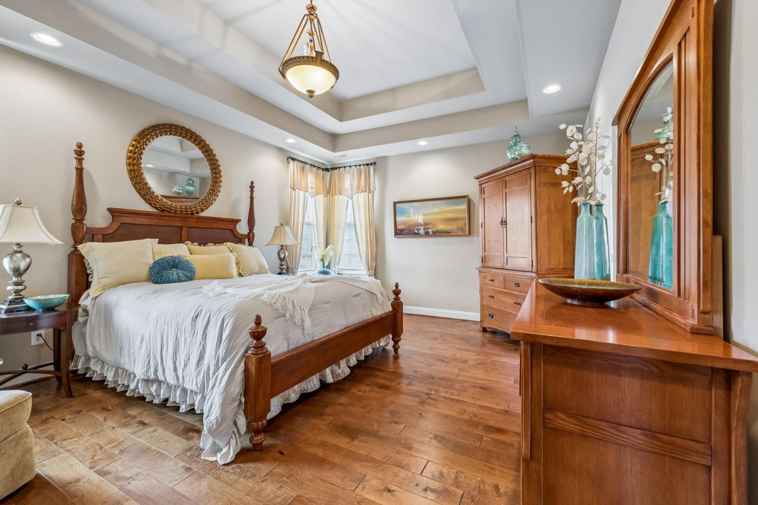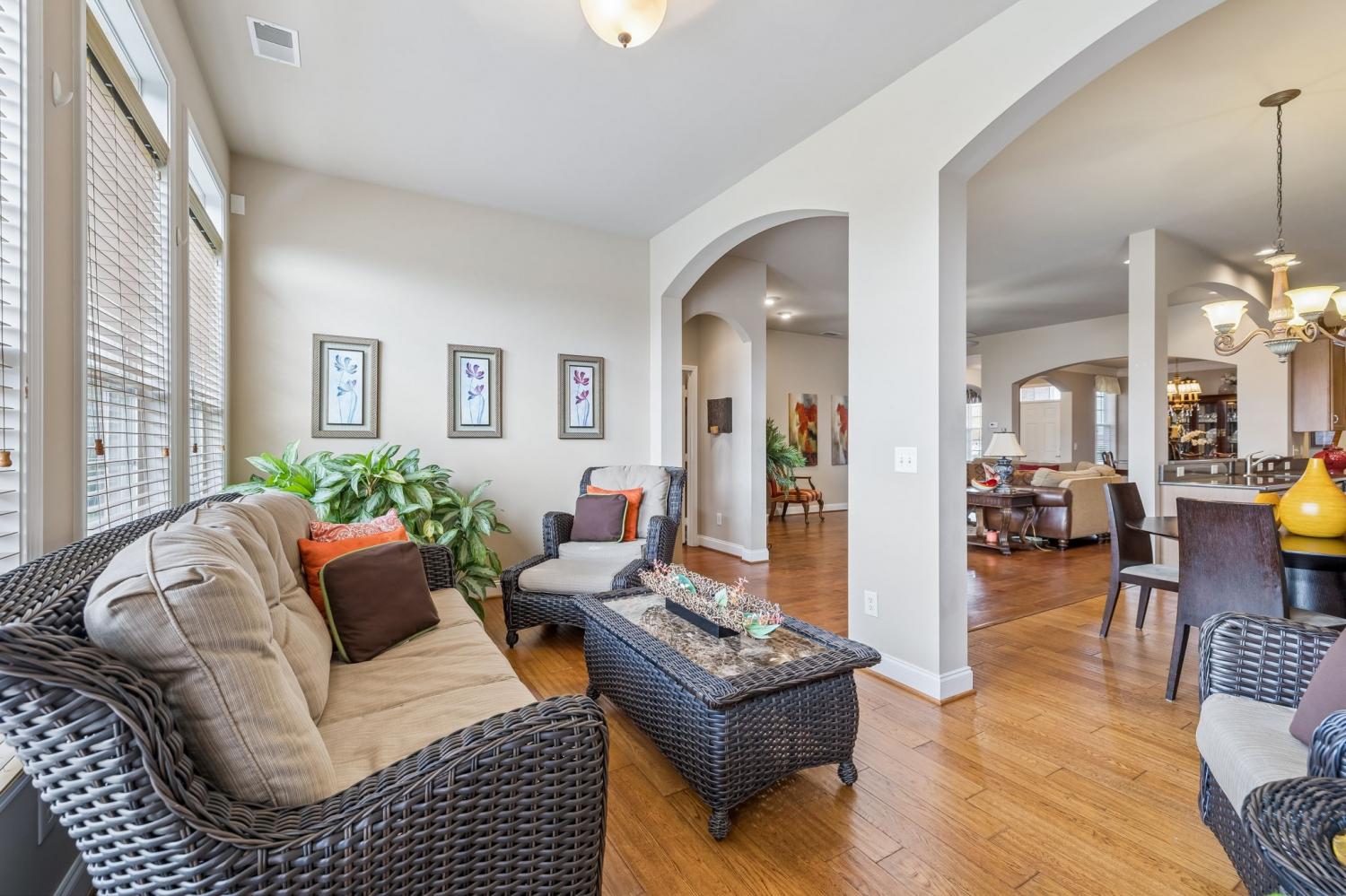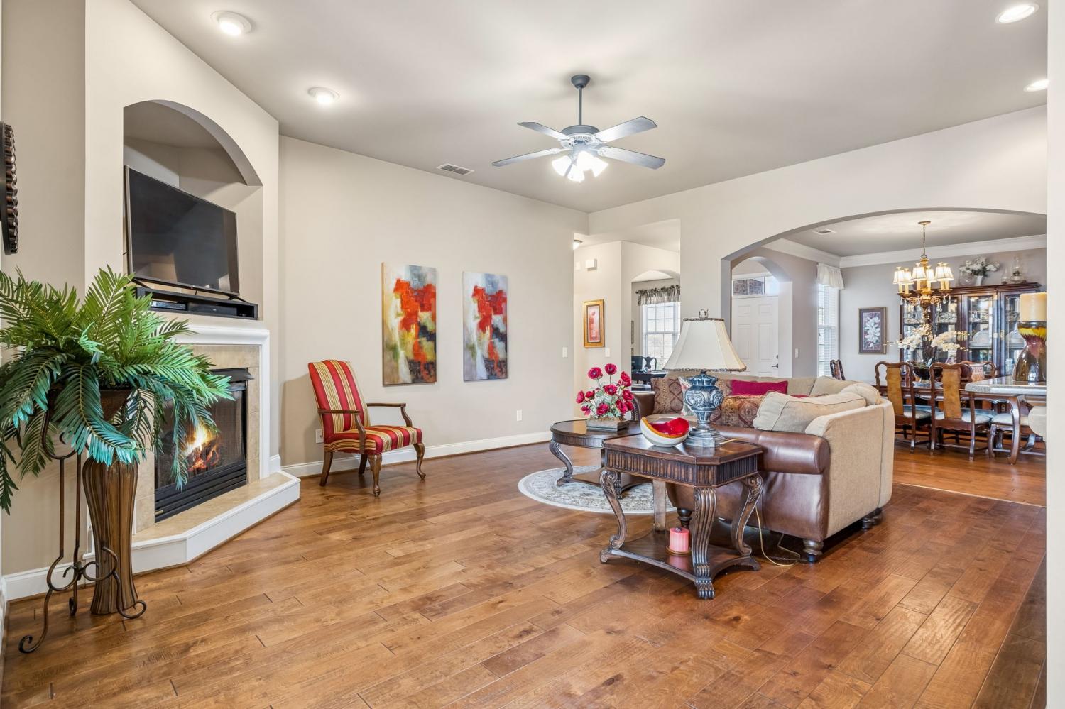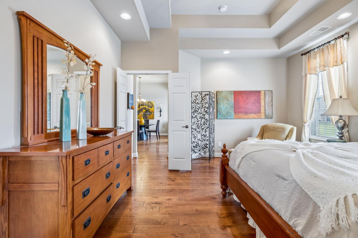 Built by Frank Batson Homes, this all brick residence offers quality craftsmanship and true main level living with just one step entry and a primary suite on the main floor. The open layout features 10 foot ceilings, hand scraped hardwoods, and abundant natural light. The kitchen includes stainless appliances, a large pantry, and flows seamlessly into the living and dining areas. Enjoy a gas fireplace, sunroom style sitting area, and multiple spaces for everyday living and entertaining. The main level primary suite offers tray ceilings, a walk in closet, dual vanities, and a jetted tub. A second bedroom or office with full bath is also on the main level. Upstairs includes a spacious bonus room, private bedroom with full bath, and walk in storage. Outside features include an aggregate driveway, irrigation system, gas lantern, and a private back porch overlooking common space. Located in Bridgewater with walking trails, pool, and playground, just minutes to Summit Hospital, Percy Priest Lake, Providence, and downtown Nashville. HOA covers lawn care, exterior maintenance including roof, and insurance.