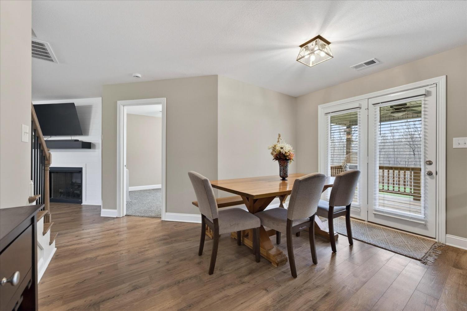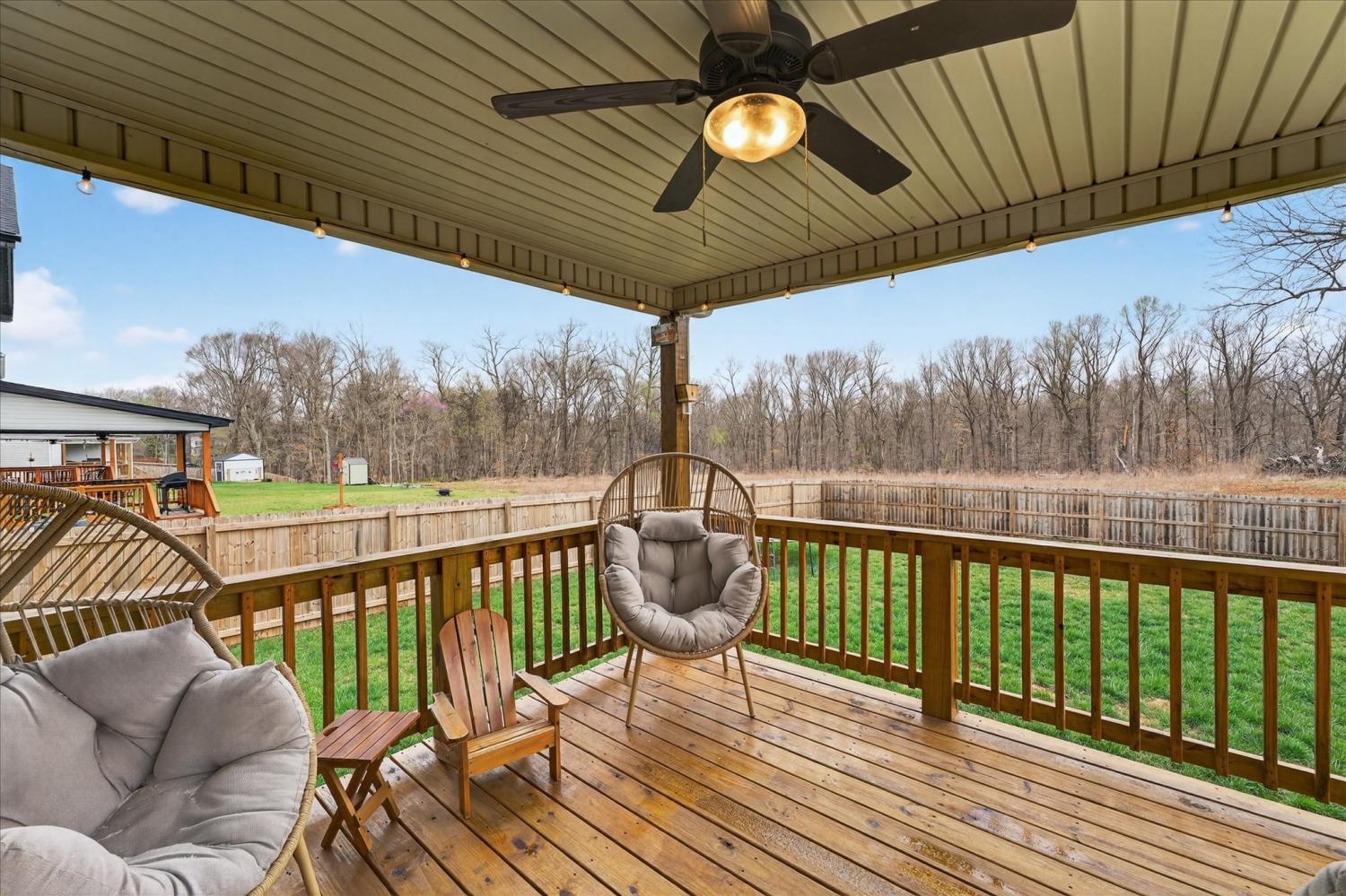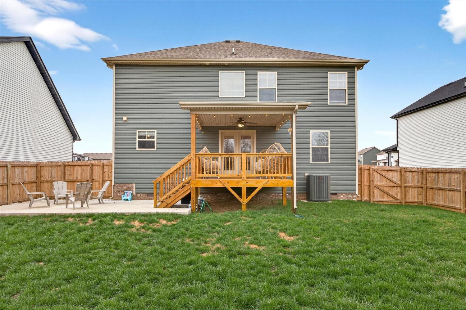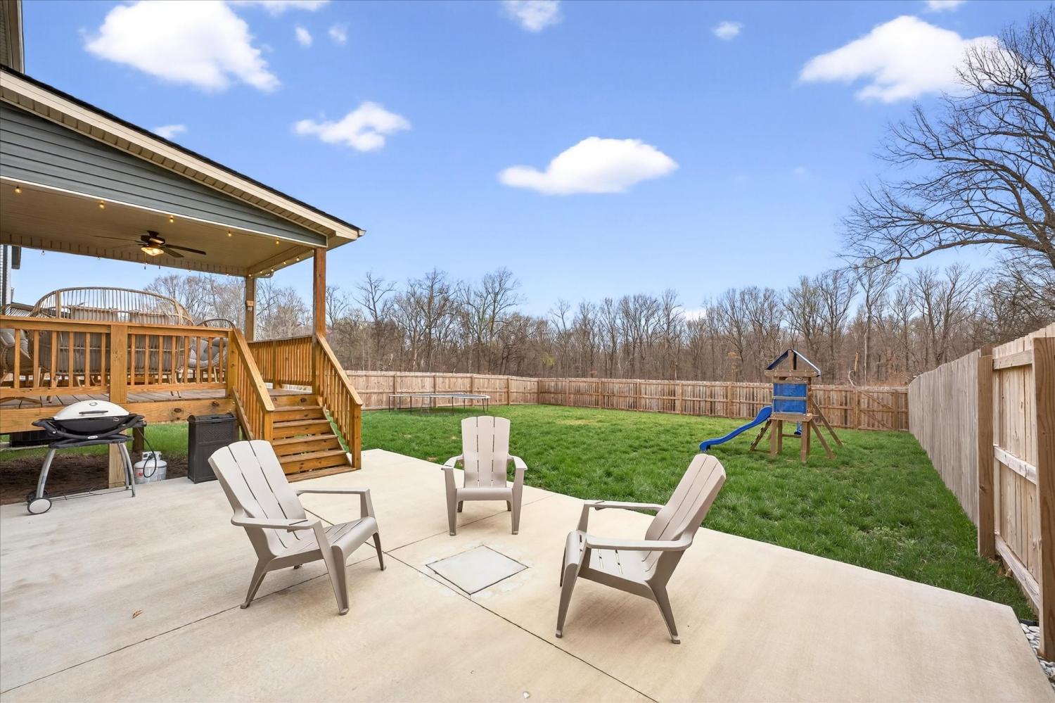 This spacious home offers a functional layout with great everyday living and entertaining space. The living room features a corner fireplace and opens to the kitchen, which provides ample workspace along with two pantries downstairs, including one walk-in pantry for exceptional storage. A main-level half bath adds convenience. Upstairs, the primary suite includes a large walk-in closet and an en-suite bath with dual vanities and an oversized shower. Additional bedrooms offer flexibility for guests, office space, or hobbies, along with a full hall bath and a dedicated laundry room. Enjoy outdoor living on the extended patio just off the deck, overlooking a wooded backyard with no rear neighbors for added privacy. No HOA.