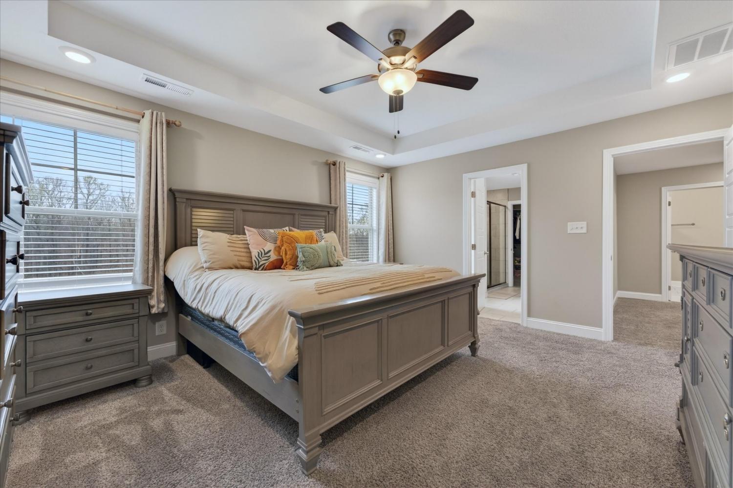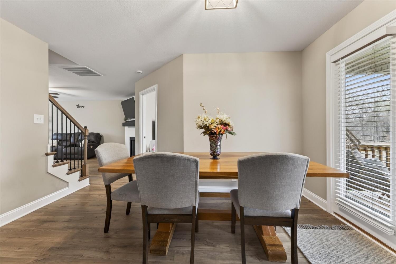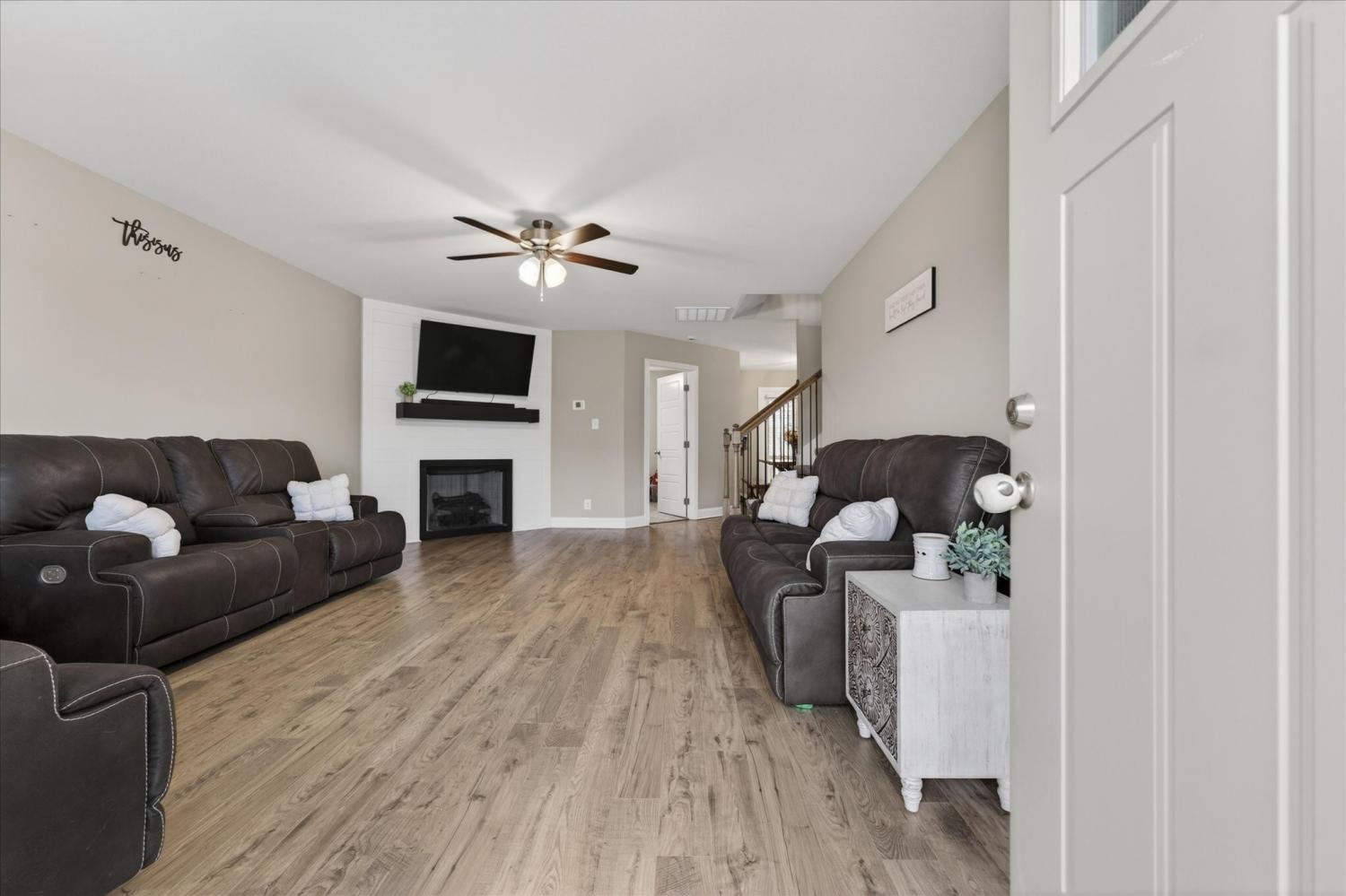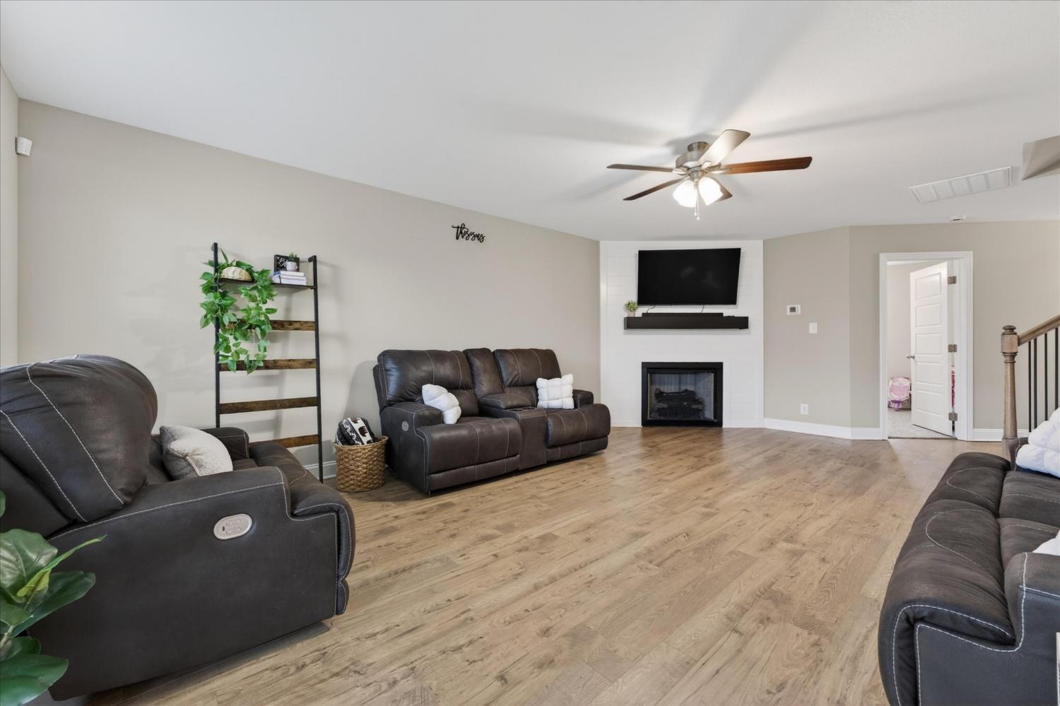 This spacious home offers a functional layout with great everyday living and entertaining space. The living room features a corner fireplace and opens to the kitchen, which provides ample workspace along with two pantries downstairs, including one walk-in pantry for exceptional storage. A main-level half bath adds convenience. Upstairs, the primary suite includes a large walk-in closet and an en-suite bath with dual vanities and an oversized shower. Additional bedrooms offer flexibility for guests, office space, or hobbies, along with a full hall bath and a dedicated laundry room. Enjoy outdoor living on the extended patio just off the deck, overlooking a wooded backyard with no rear neighbors for added privacy. No HOA.