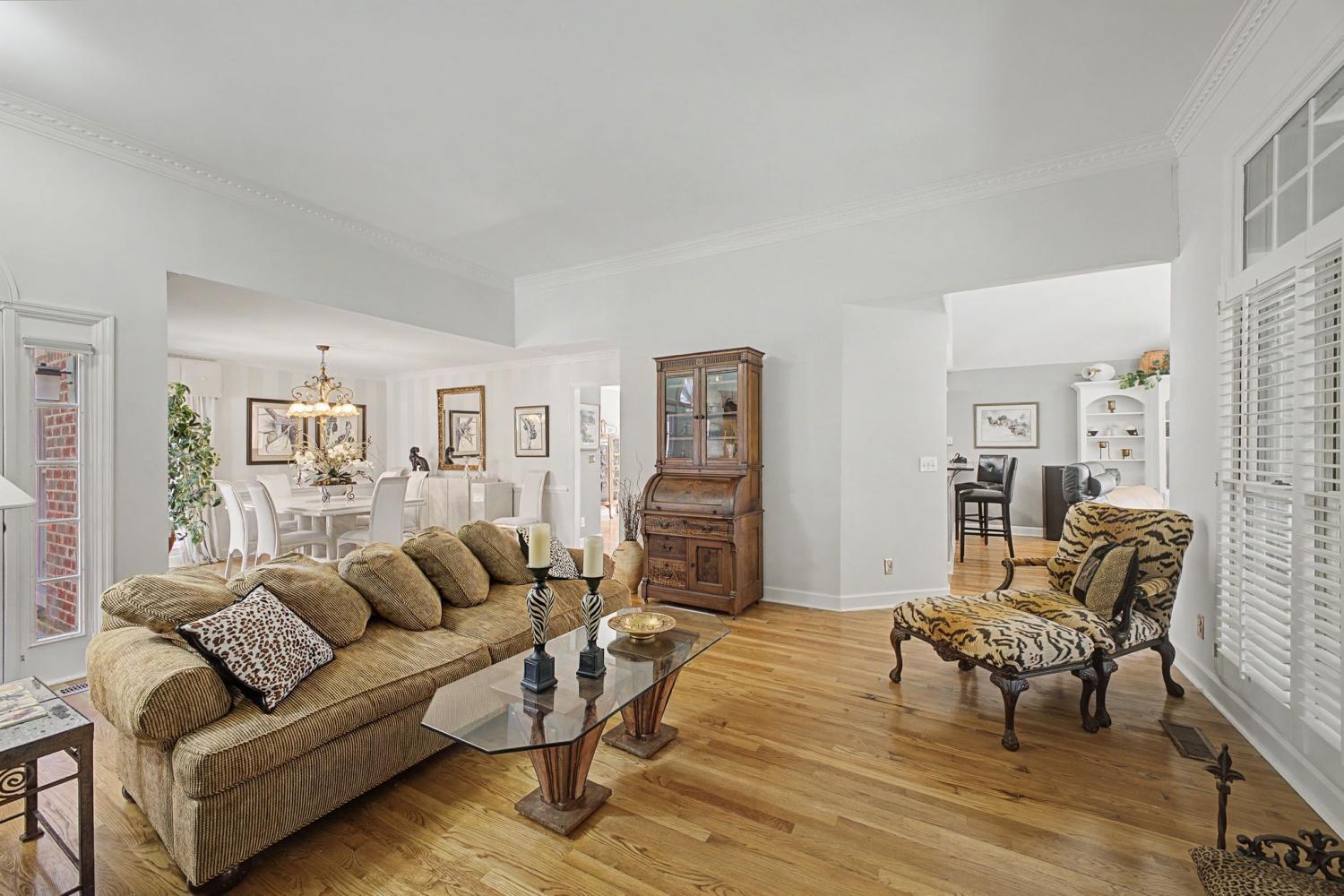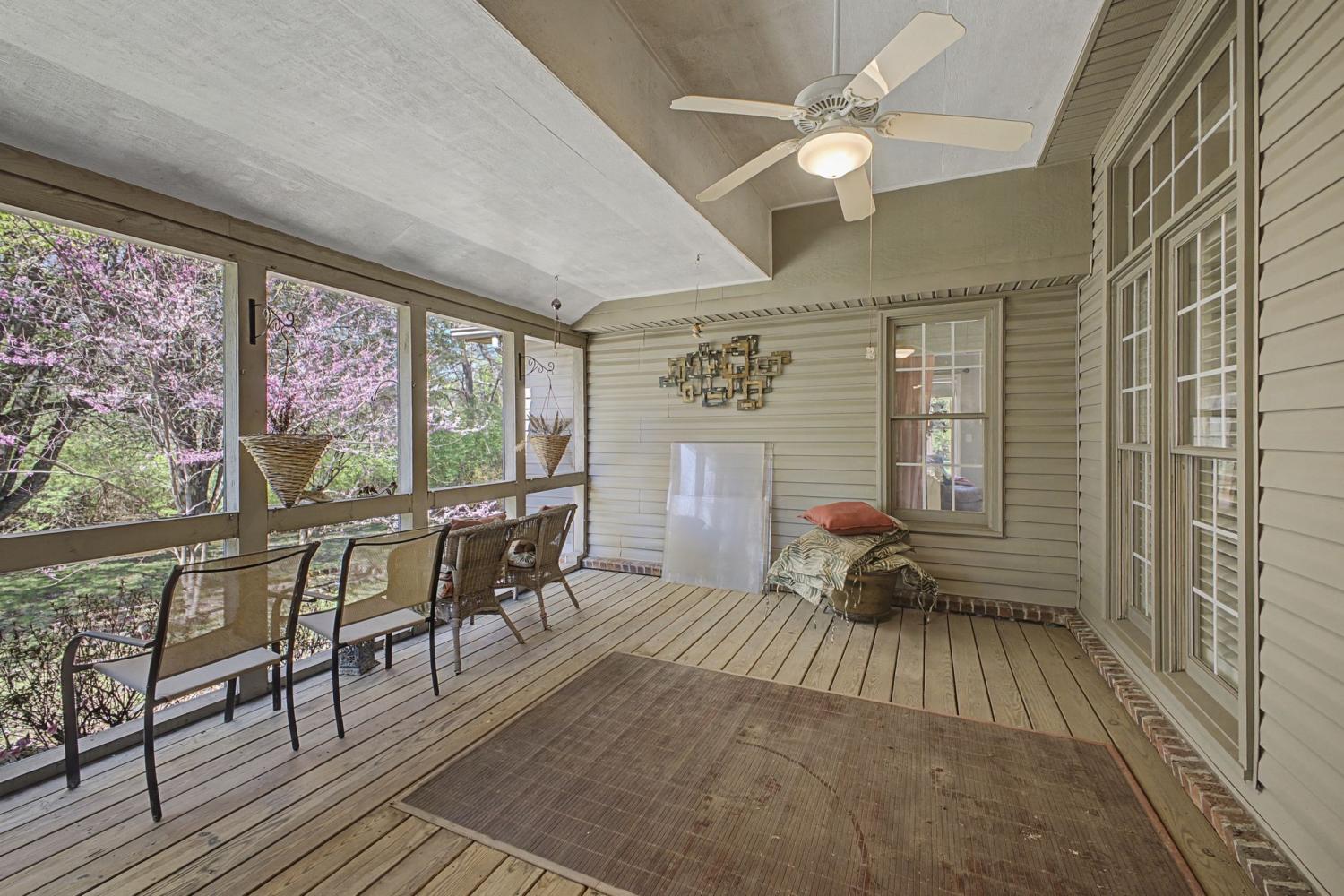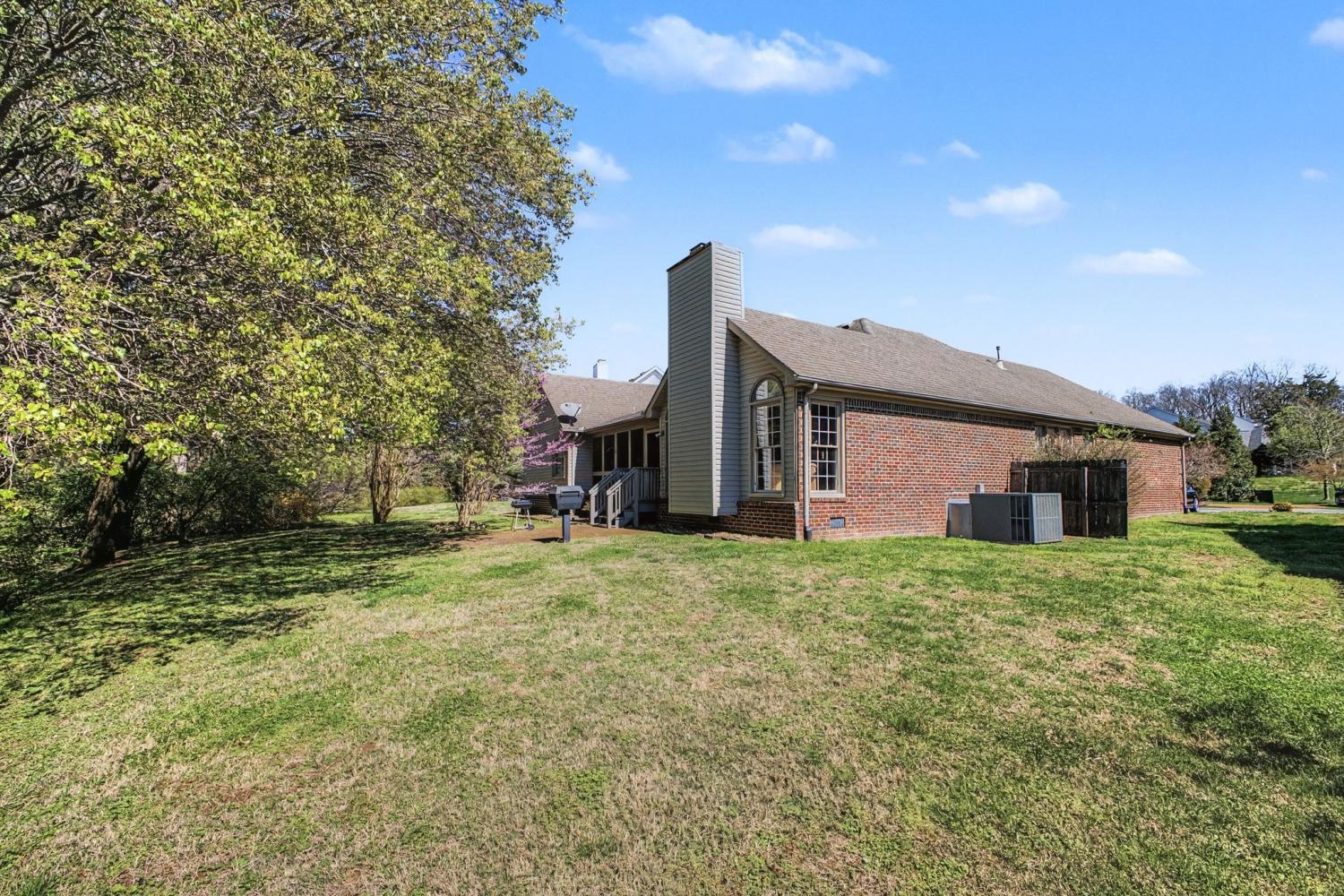 Welcome to your new home. Featuring all three bedrooms on the main level, this thoughtfully designed brick home offers comfort and convenience for families at any stage. The spacious kitchen opens to a vaulted main living area, creating an inviting space for everyday living and entertaining. Additional highlights include a large garage and a separate dining room. Inside, you’ll find vaulted ceilings, hardwood floors, abundant natural light, and charm throughout. The primary suite features a spacious bathroom with a jacuzzi tub, glass shower, and walk-in closet. Step outside to enjoy the large screened-in back porch with ceiling fans, perfect for year-round relaxation. The peaceful backyard is shaded by a canopy of mature trees and includes a patio ideal for grilling. A gentle creek runs along the property line, providing a tranquil setting to enjoy your morning coffee or unwind at sunset.