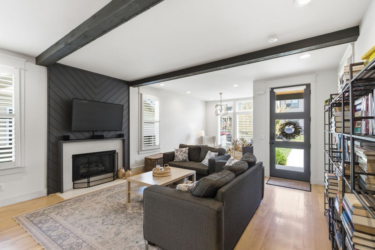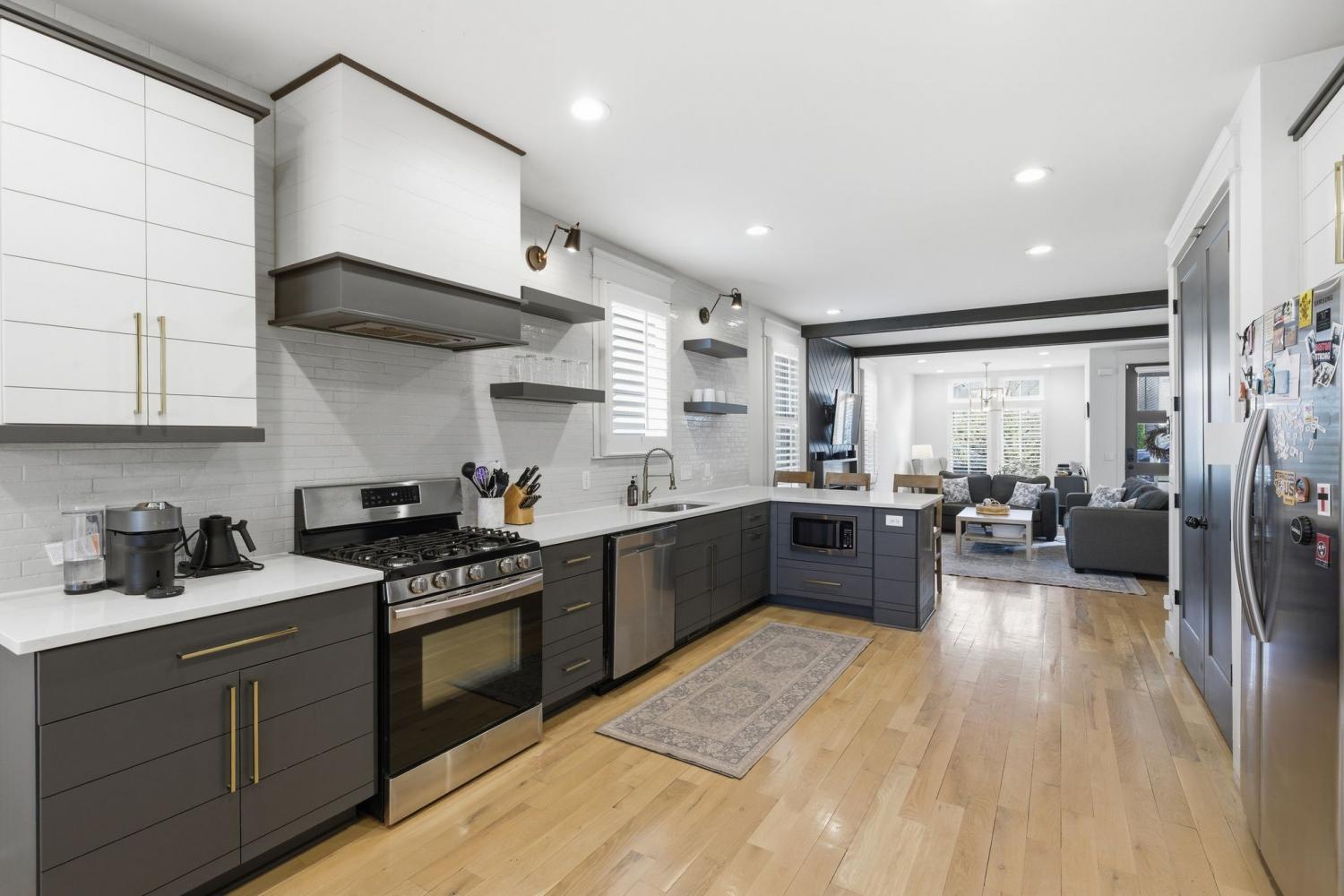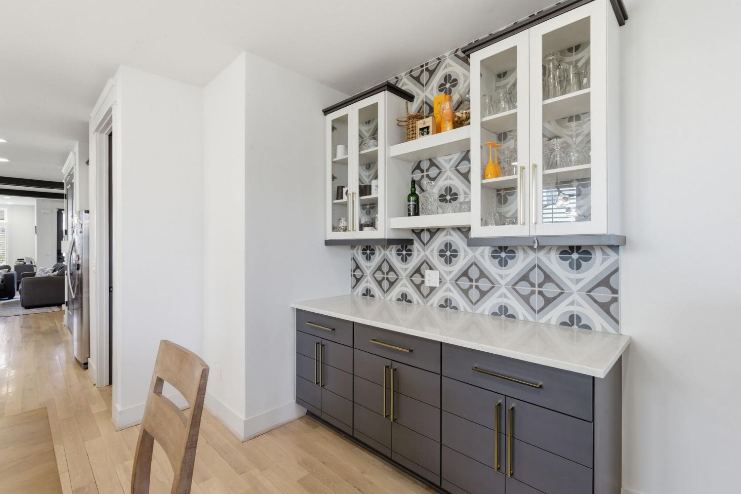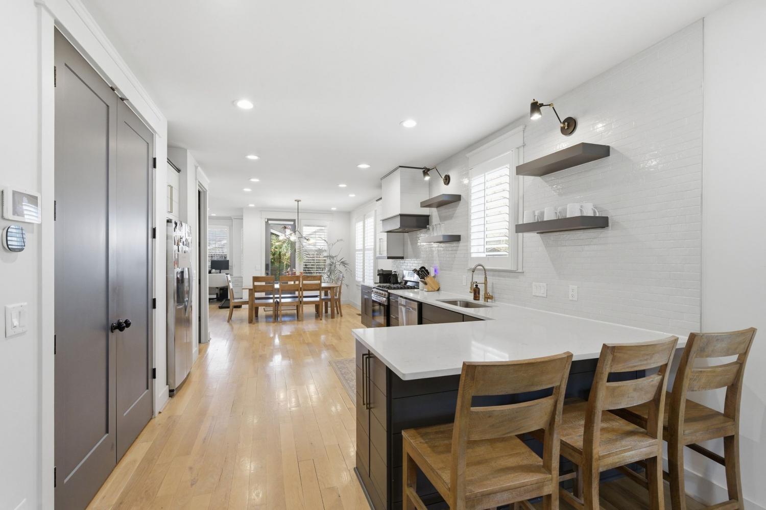 Step into a home where clean design meets everyday comfort in the heart of The Nations. Wide-plank hardwood floors, custom builder trim, and plantation shutters set the tone, while natural light fills every space. The Living Room features a cozy reading nook space, and a designer wall surrounding the gas fireplace. The kitchen features quartz countertops, custom cabinetry, designer hardware, and a stylish eat-at counter that flows seamlessly into the dining and living areas—perfect for entertaining or relaxed daily living. The huge pantry offers extra storage under the stairs. The dining room has a custom wet-bar/coffee bar area and a built-in desk for a home office. Upstairs, the vaulted primary suite offers a true retreat with a skylight and full sliding doors that open to a spacious balcony. The ensuite bath includes dual vanities, a beautifully tiled walk-in shower, and a spacious walk-in closet with custom built-ins. The other two upstairs bedrooms share a jack-and-jill bath and custom closets. The 3rd BR has vaulted ceilings and makes a great extra office space or guest bedroom. The laundry room is also conveniently located on the 2nd level - washer & dryer are included. Enjoy a fully fenced yard, plus the convenience of a garage/carport setup. Located just minutes from all that The Nations has to offer—local favorites like Frothy Monkey, 51st Deli, and easy access to parks, shopping, and downtown Nashville.