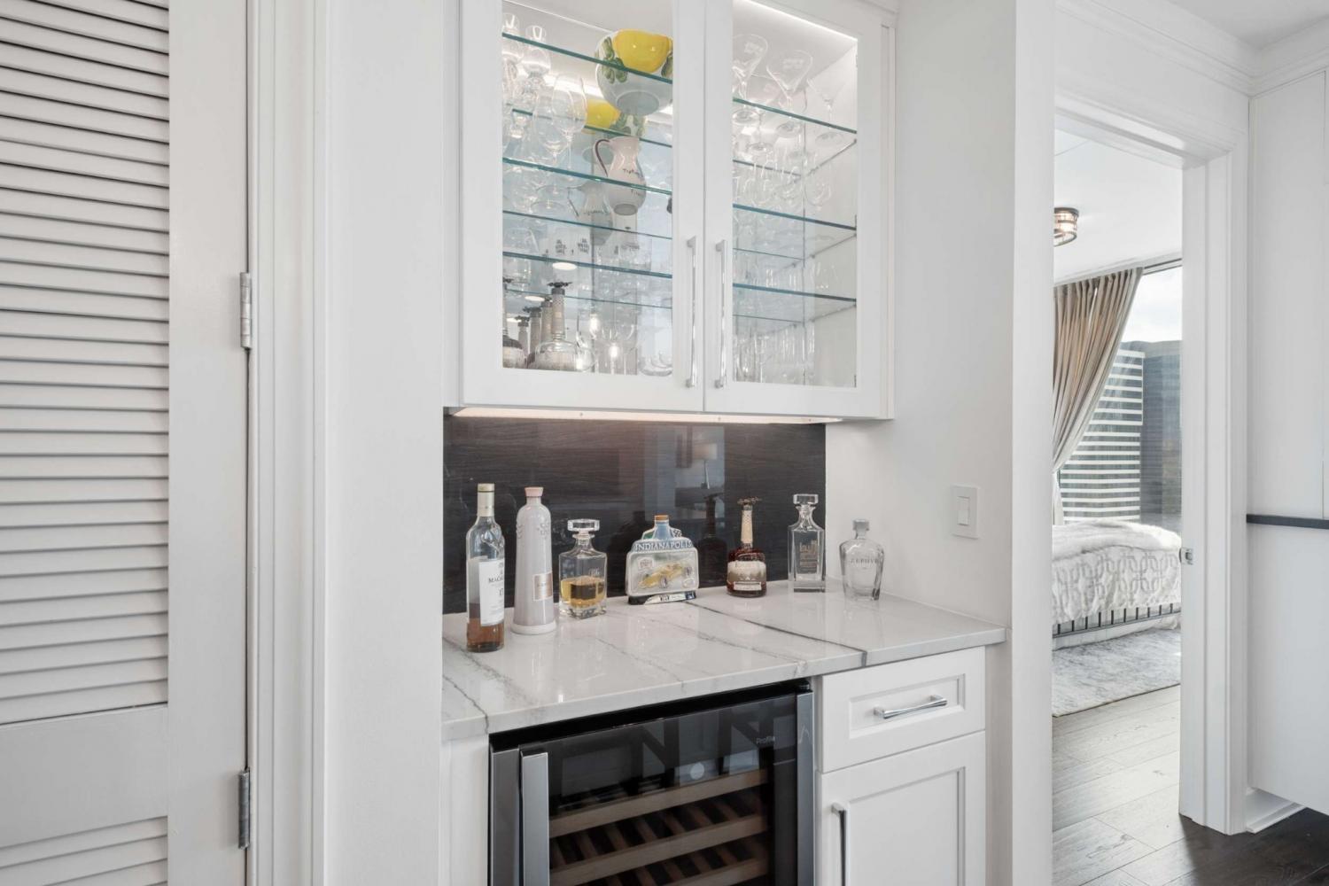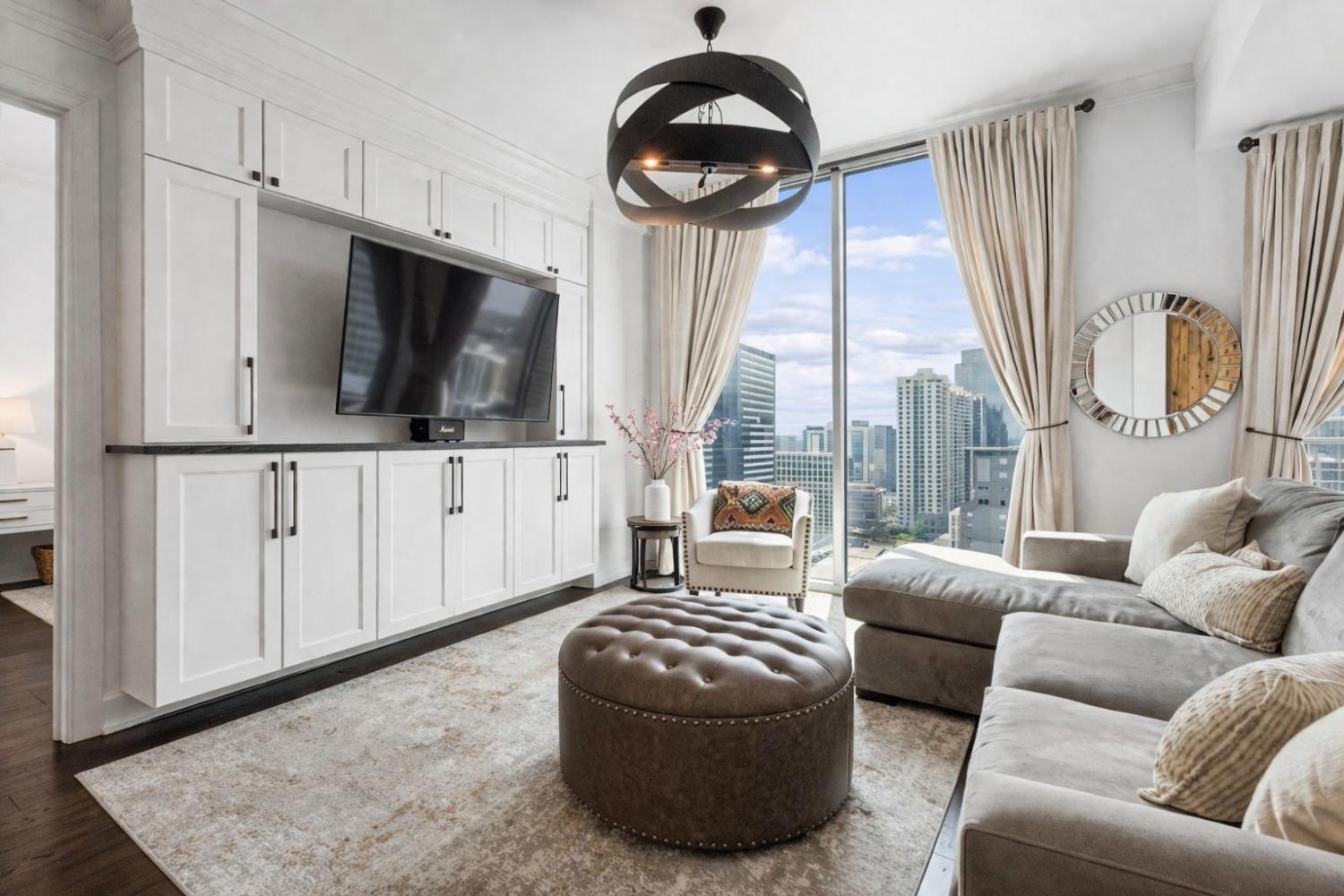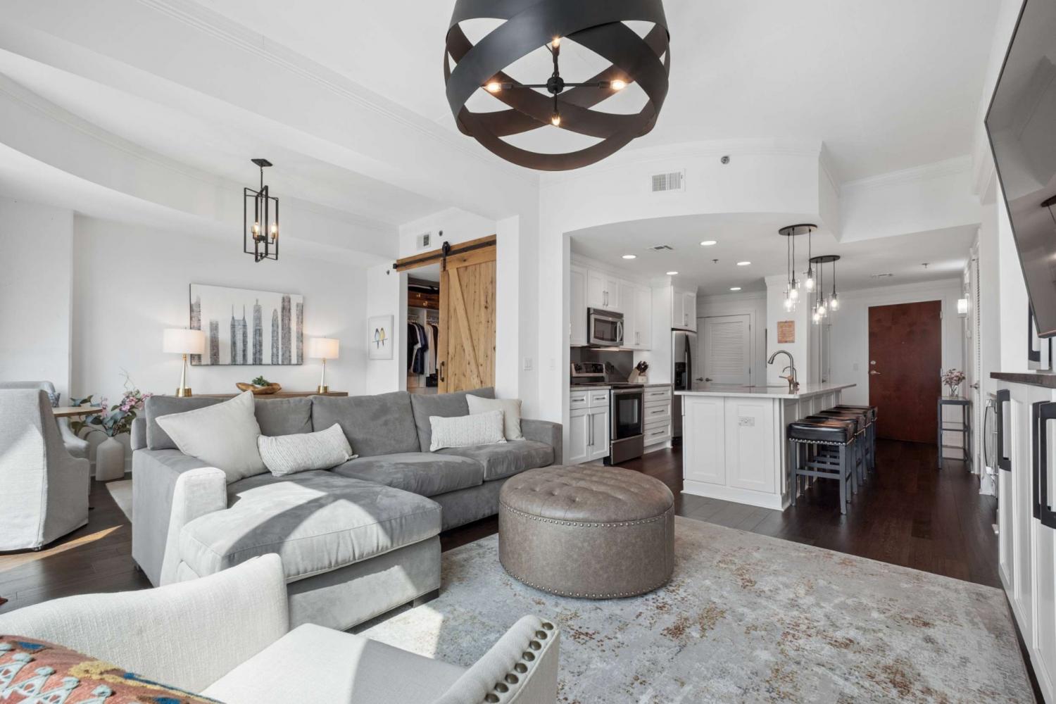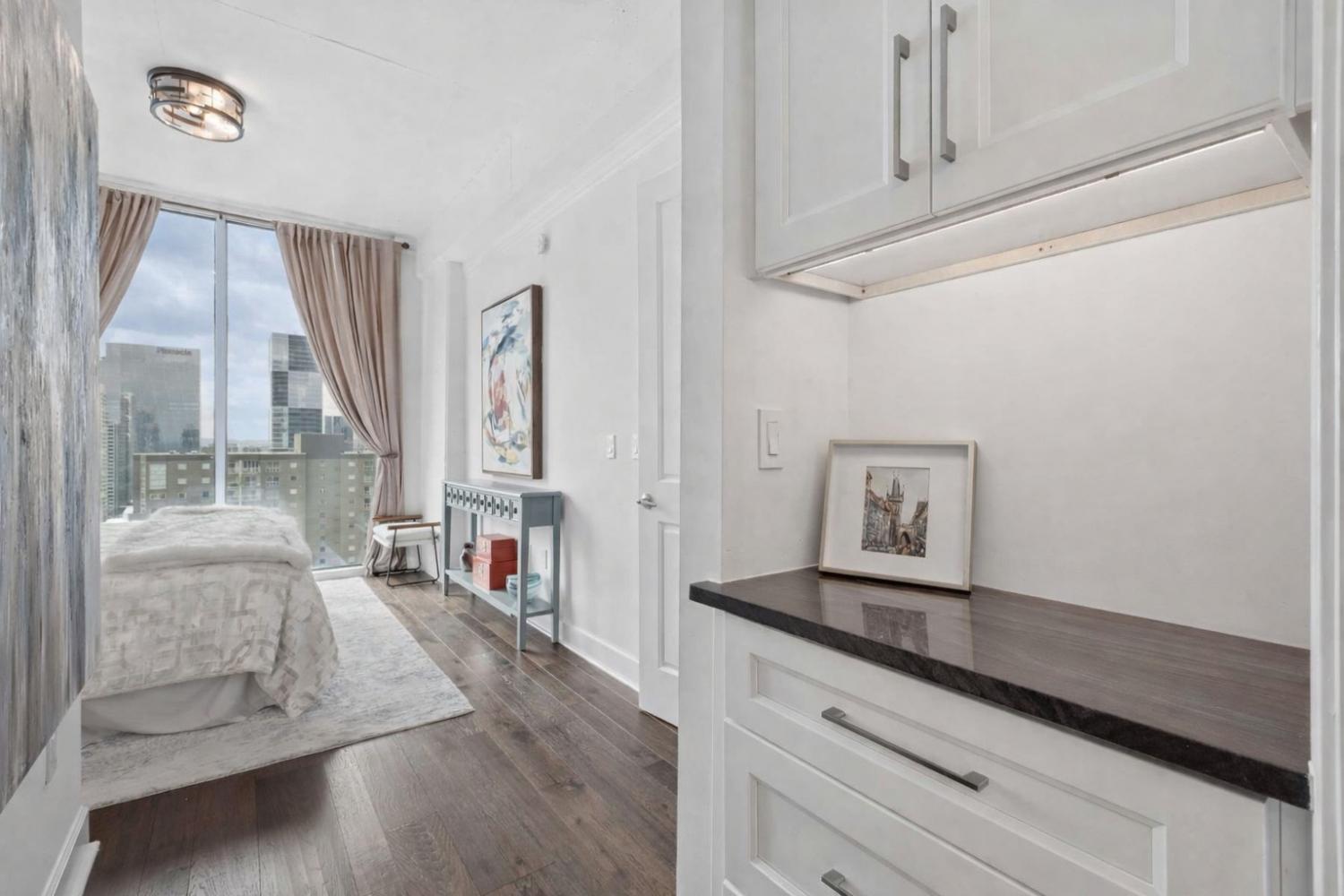 This beautifully renovated and fully furnished residence at the Viridian offers a rare and thoughtfully reimagined floor plan. Originally a two-bedroom, the second bedroom has been opened to create an expansive main living space—dramatically enhancing the scale and flow of the home, while still allowing flexibility for guest accommodations and the option to easily convert back to a true two-bedroom if desired. Floor-to-ceiling windows fill the space with natural light, highlighting the extensive updates throughout and opening to a private balcony with city views. Every surface has been carefully considered, with hardwood flooring, granite countertops throughout, and custom built-ins. The kitchen has been fully renovated with new cabinetry, countertops, backsplash, and includes a bar area with wine refrigeration—ideal for entertaining. The primary suite features a fully updated bath with floor-to-ceiling stone, a dedicated vanity, and custom closet systems. The guest bathroom has also been completely renovated with a beautiful glassed-in shower/tub and added built-in storage. Additional features include a large custom guest closet with a sliding barn door, a spacious laundry area with built-ins, and a thoughtfully designed coat closet for maximum storage. Fully furnished, this is a turnkey opportunity in one of downtown Nashville’s premier high-rise buildings, offering 24-hour concierge, pool, fitness center, and walkable access to dining, entertainment, and business districts.