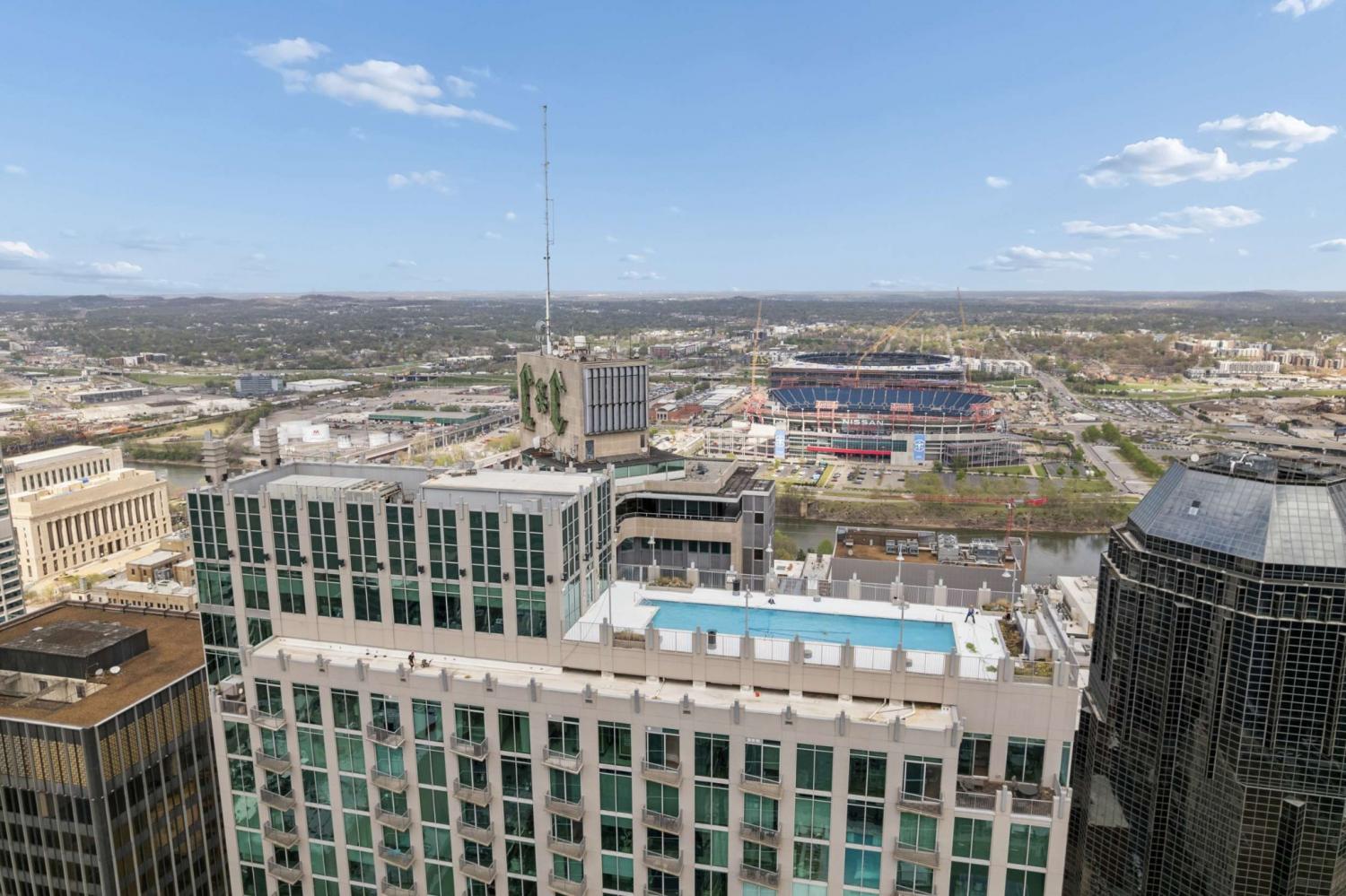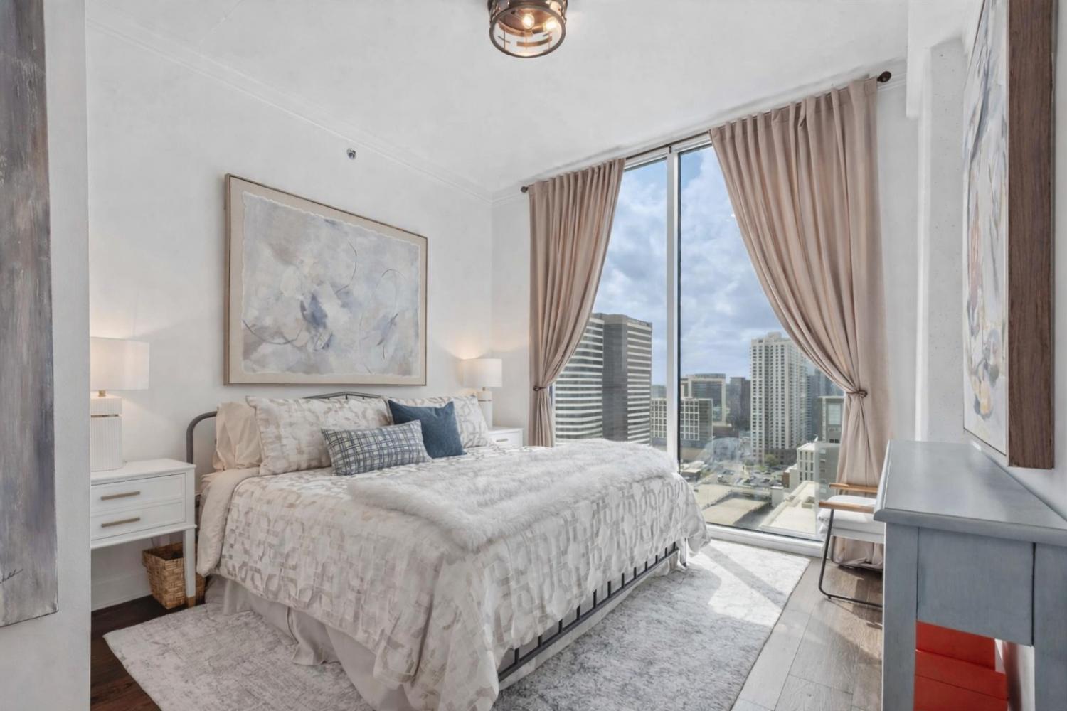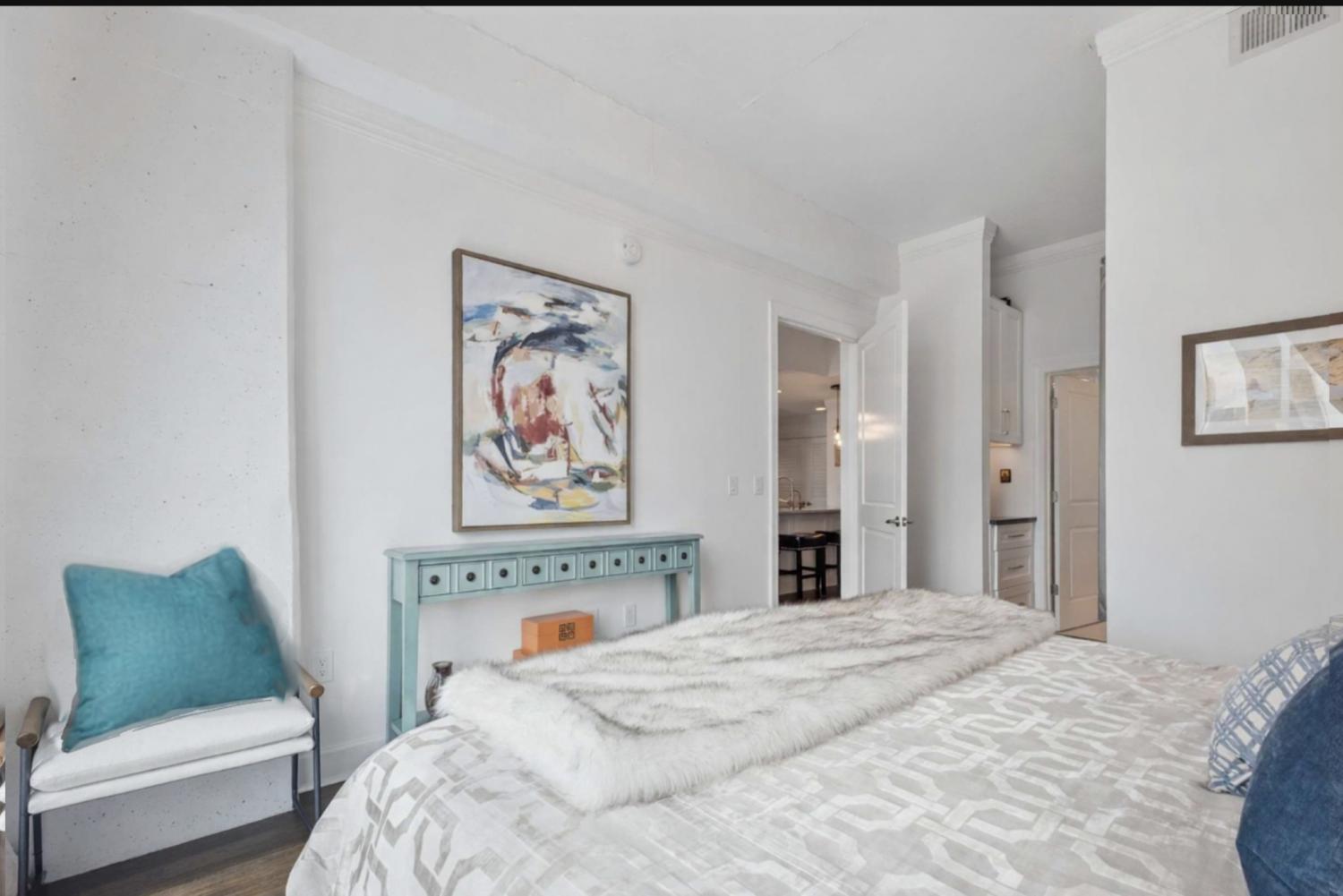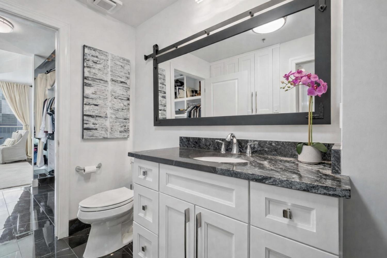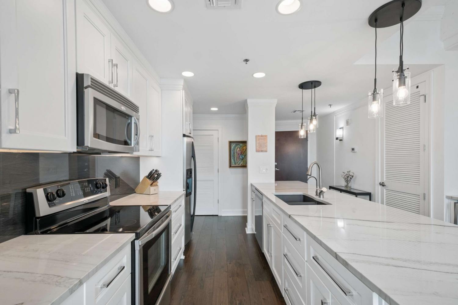 This beautifully renovated and fully furnished residence at the Viridian offers a rare and thoughtfully reimagined floor plan. Originally a two-bedroom, the second bedroom has been opened to create an expansive main living space—dramatically enhancing the scale and flow of the home, while still allowing flexibility for guest accommodations and the option to easily convert back to a true two-bedroom if desired. Floor-to-ceiling windows fill the space with natural light, highlighting the extensive updates throughout and opening to a private balcony with city views. Every surface has been carefully considered, with hardwood flooring, granite countertops throughout, and custom built-ins. The kitchen has been fully renovated with new cabinetry, countertops, backsplash, and includes a bar area with wine refrigeration—ideal for entertaining. The primary suite features a fully updated bath with floor-to-ceiling stone, a dedicated vanity, and custom closet systems. The guest bathroom has also been completely renovated with a beautiful glassed-in shower/tub and added built-in storage. Additional features include a large custom guest closet with a sliding barn door, a spacious laundry area with built-ins, and a thoughtfully designed coat closet for maximum storage. Fully furnished, this is a turnkey opportunity in one of downtown Nashville’s premier high-rise buildings, offering 24-hour concierge, pool, fitness center, and walkable access to dining, entertainment, and business districts.