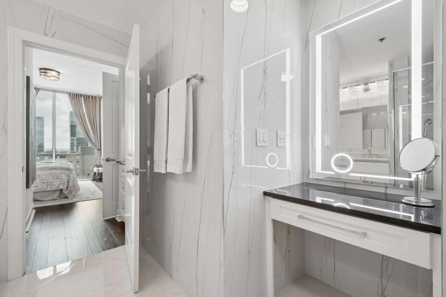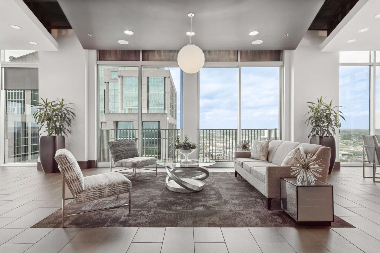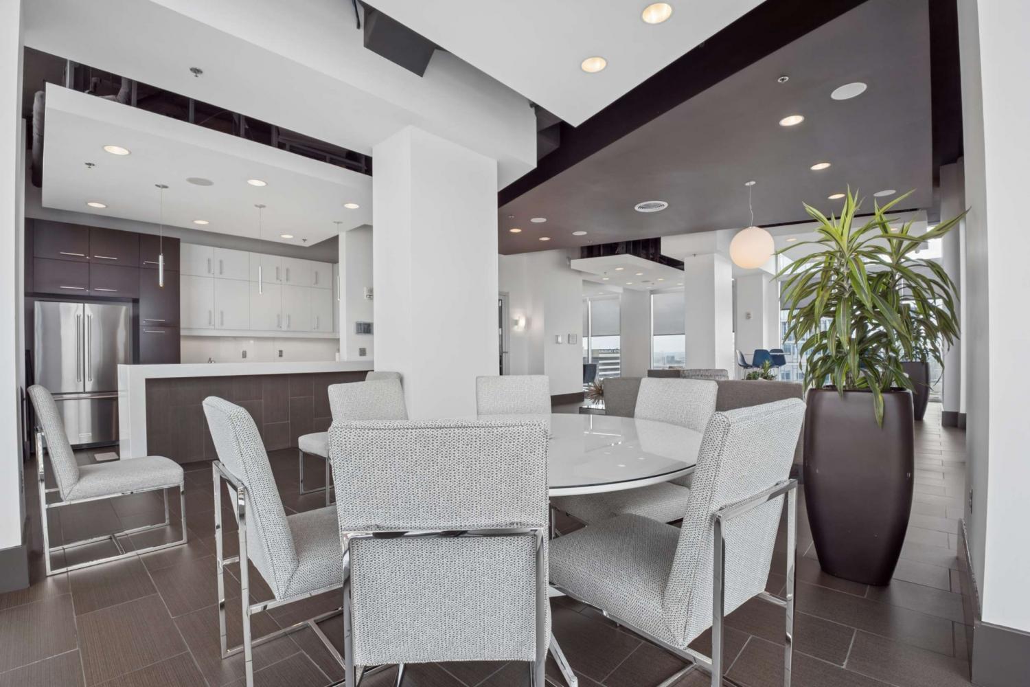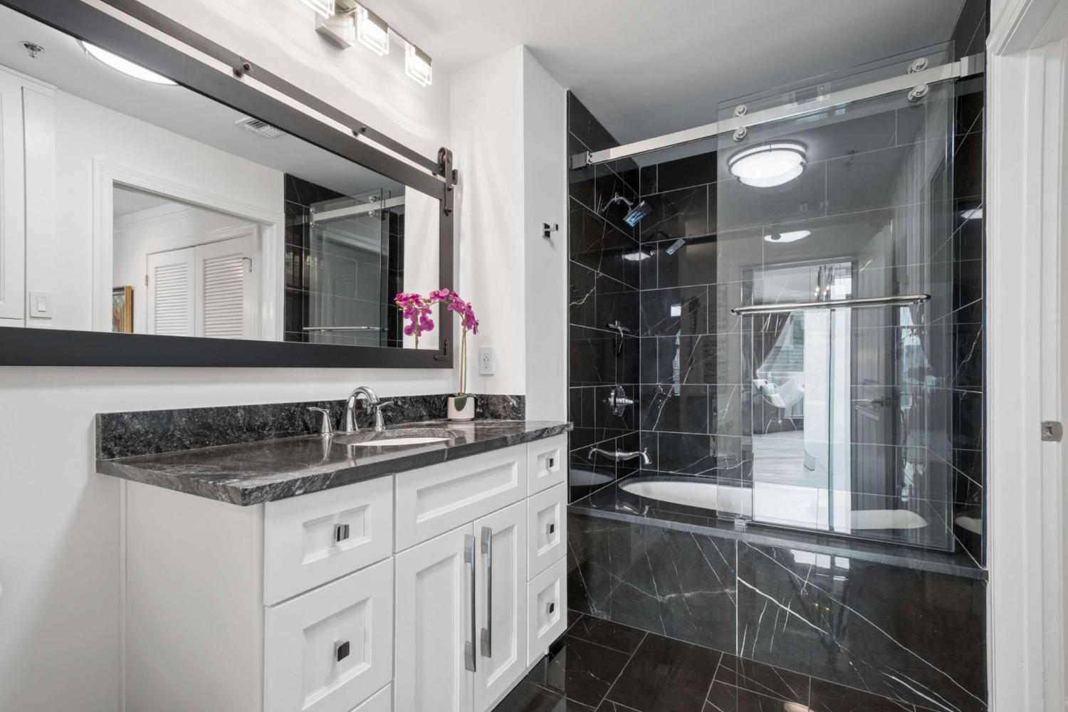 This beautifully renovated and fully furnished residence at the Viridian offers a rare and thoughtfully reimagined floor plan. Originally a two-bedroom, the second bedroom has been opened to create an expansive main living space—dramatically enhancing the scale and flow of the home, while still allowing flexibility for guest accommodations and the option to easily convert back to a true two-bedroom if desired. Floor-to-ceiling windows fill the space with natural light, highlighting the extensive updates throughout and opening to a private balcony with city views. Every surface has been carefully considered, with hardwood flooring, granite countertops throughout, and custom built-ins. The kitchen has been fully renovated with new cabinetry, countertops, backsplash, and includes a bar area with wine refrigeration—ideal for entertaining. The primary suite features a fully updated bath with floor-to-ceiling stone, a dedicated vanity, and custom closet systems. The guest bathroom has also been completely renovated with a beautiful glassed-in shower/tub and added built-in storage. Additional features include a large custom guest closet with a sliding barn door, a spacious laundry area with built-ins, and a thoughtfully designed coat closet for maximum storage. Fully furnished, this is a turnkey opportunity in one of downtown Nashville’s premier high-rise buildings, offering 24-hour concierge, pool, fitness center, and walkable access to dining, entertainment, and business districts.