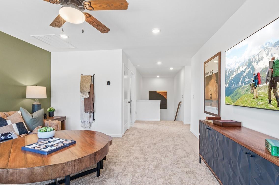 Find the perfect blend of comfort and style in this Atlas plan at Canebrake at Hickory Hills in Old Hickory, TN. Designed for flexible living, the main floor begins with a guest bedroom and full bath, offering an ideal setup for visitors, multigenerational living, or a private workspace. From there, the home opens into a spacious, light-filled great room centered around an electric fireplace, creating a welcoming place to relax or entertain. The adjoining dining area flows into a well-designed kitchen featuring white cabinets, generous counter space, a walk-in pantry, and extra storage to keep everything organized. Sliding doors lead to a covered patio, making indoor-outdoor living easy—perfect for grilling, morning coffee, or unwinding with a quiet wooded view. Upstairs, wood treads and iron spindles add a polished design touch as you head into a large loft that works beautifully as a second living area, playroom, or movie space. Two secondary bedrooms sit nearby, while the owner’s suite is thoughtfully positioned on its own side of the home for added privacy. With plenty of room to spread out, it becomes a peaceful retreat at the end of the day.