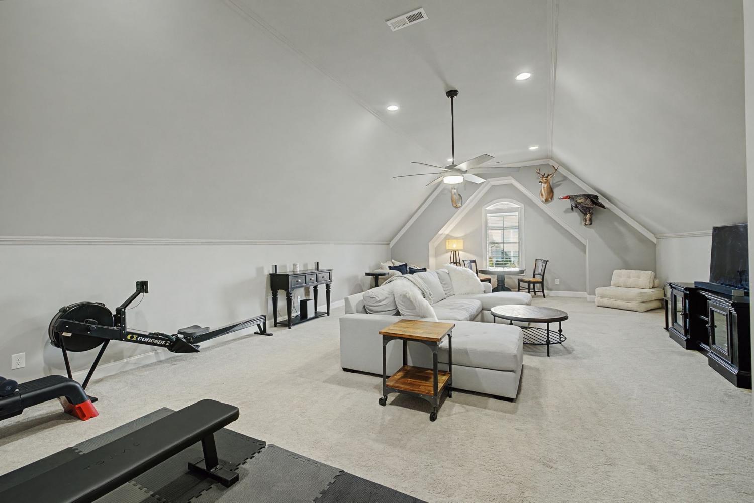 Elevated living awaits in this beautifully appointed home designed for both refined entertaining and comfortable everyday life. Thoughtfully crafted with intentional details throughout, every space feels inviting, functional, and effortlessly sophisticated. Plantation shutters add timeless charm, while the open concept layout with soaring ceilings creates a bright, airy feel and seamless flow ideal for gathering. The chef’s kitchen features double ovens, ample prep space, and generous cabinetry — perfect for everything from weeknight meals to holiday hosting. The main level offers a spacious primary suite with a private sitting area, along with an additional bedroom and full bath ideal for guests. This space is currently being used as a home office, providing flexibility to fit your needs. Upstairs, you’ll find three additional bedrooms, including one with a private ensuite bath and oversized closet and one attaching to the other bathroom, plus a large bonus room perfect for a media space, playroom, or second living area. The entire home has been freshly painted, with updated flooring in the common areas and bedrooms, making it truly move-in ready. Enjoy outdoor living on the covered patio and extended deck with storage underneath overlooking the large backyard — an ideal setting for entertaining or relaxing evenings at home. Located in the desirable Cherry Grove community with clubhouse and pool amenities and convenient access to I-65, this home offers exceptional space, style, and everyday convenience.