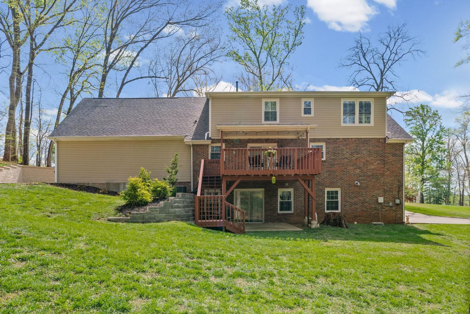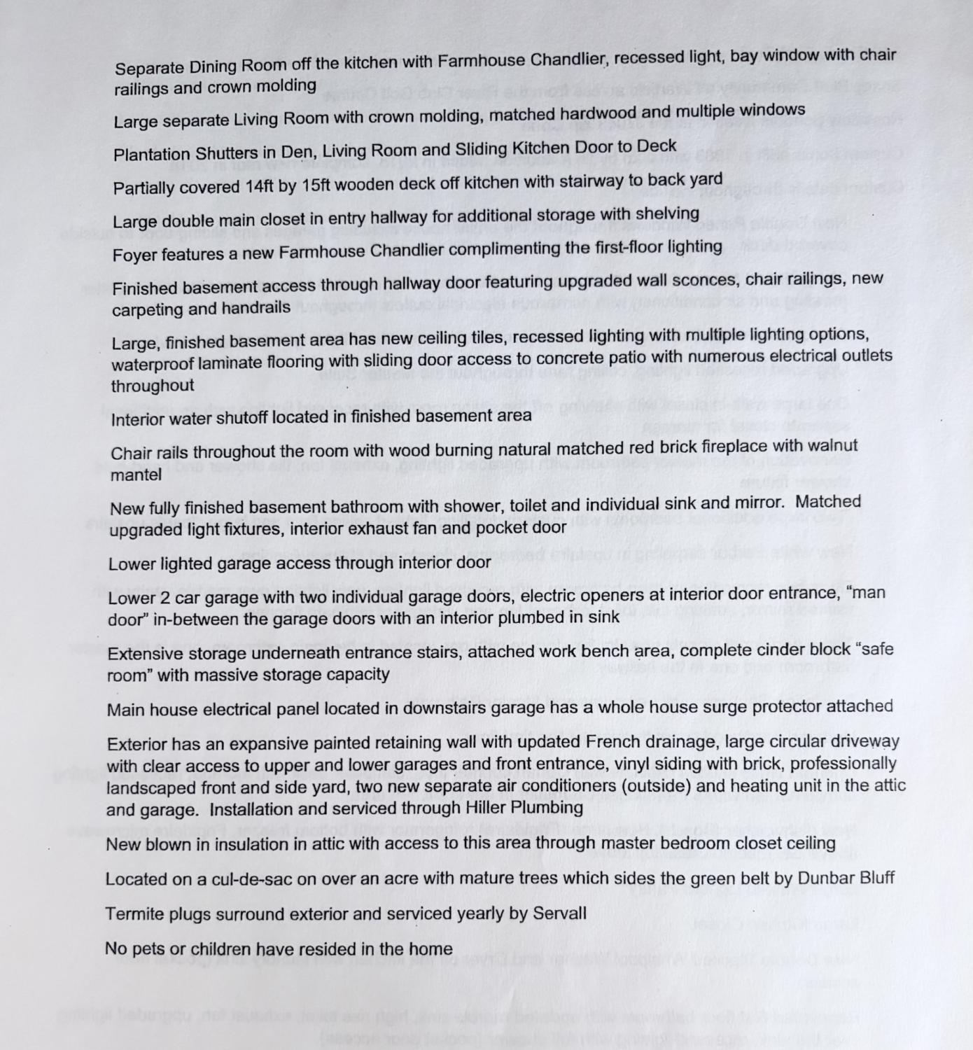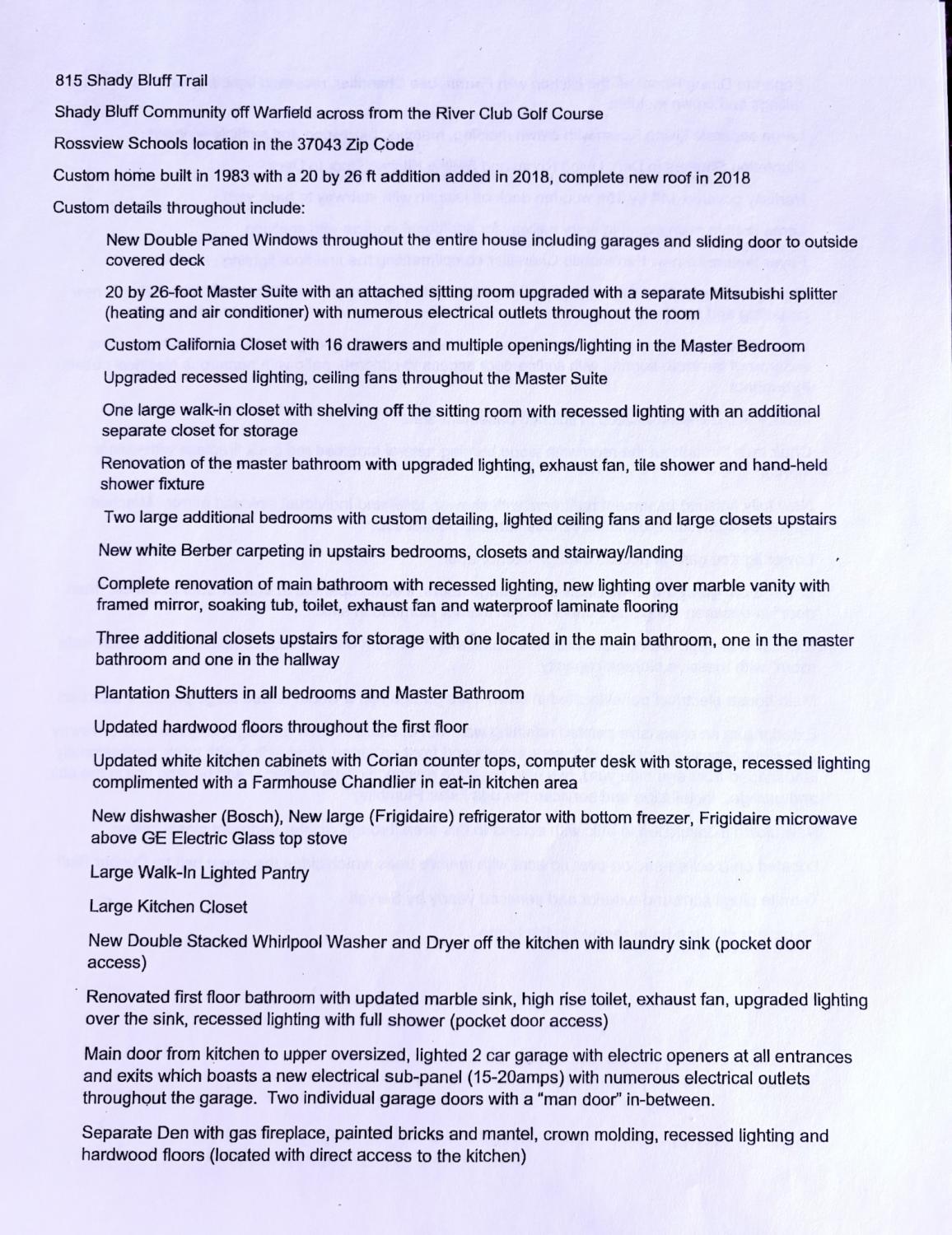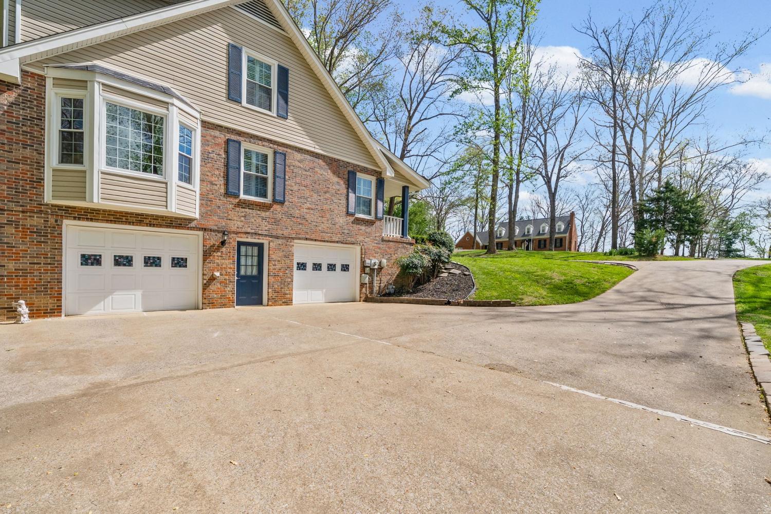 Two oversized garages with workshop space. Three Stories! New Double Paned Windows with Plantation Shutters throughout. King-sized basement with tornado safe shelter! 4 Indoor parking spaces. 2 Separate Garages! NO HOA! Soaring Ceilings! This custom-built home has been renovated and is in perfect condition! Home has been inspected! Marvelous family/executive home (in the Upscale Shady Bluff Community). Across Warfield Drive from the River Club Golf Course. Two additional golf courses are within 1 mile. The wooded neighborhood is nestled over the Red River where trees and wildlife abound within the heart of Clarksville. This is a forever (walkable) home/neighborhood with No HOA. Shopping and top-rated schools are near. *A grand foyer with cascading staircase sets the tone for this elegant home. The main floor features a separate living room, family room with gas fireplace, dining room with oversized bay window, large eat-in kitchen with pantry, covered deck, laundry room and bath. Separate interior entrance to the main floor is through the double oversized vehicle garage (with man door). Extra workspace is in garage. This spacious garage is ideal for storage and office use. *Upstairs boasts 4 bedrooms and 2 full baths with dressing areas. Plantation Shutters on each window. The closets are greater than oversized with an indescribable amount of storage. * Large, finished basement with full bath, massive living area, wood burning fireplace, covered porch, with separate entrance and an additional oversized 2 car garage with work area. A tornado storm shelter is underground off the basement garage which contains huge interior storage. An expansive, manicured lawn with mature hard wood trees surrounds this remarkable home.