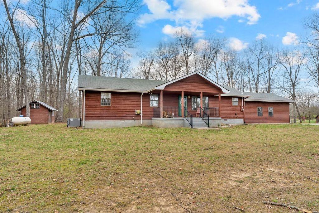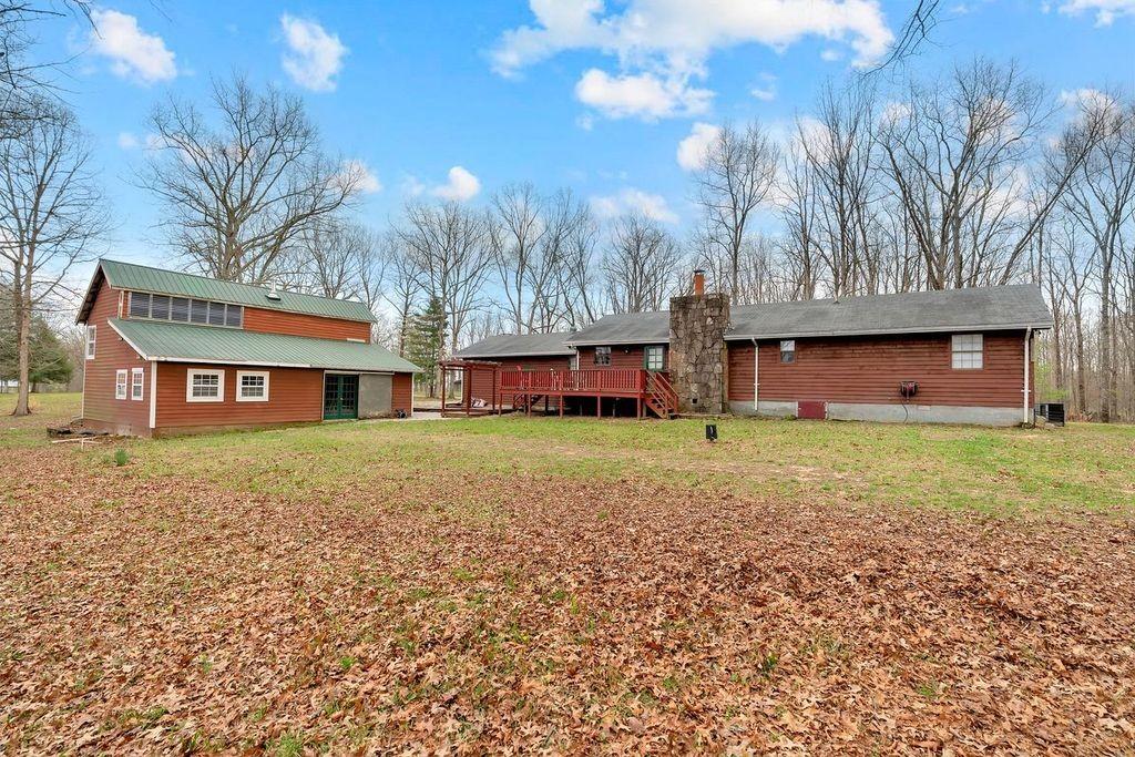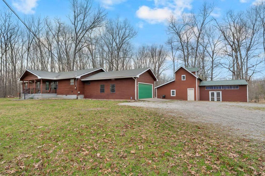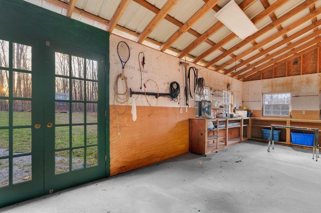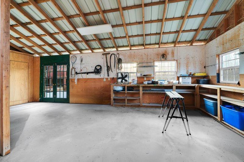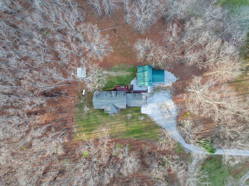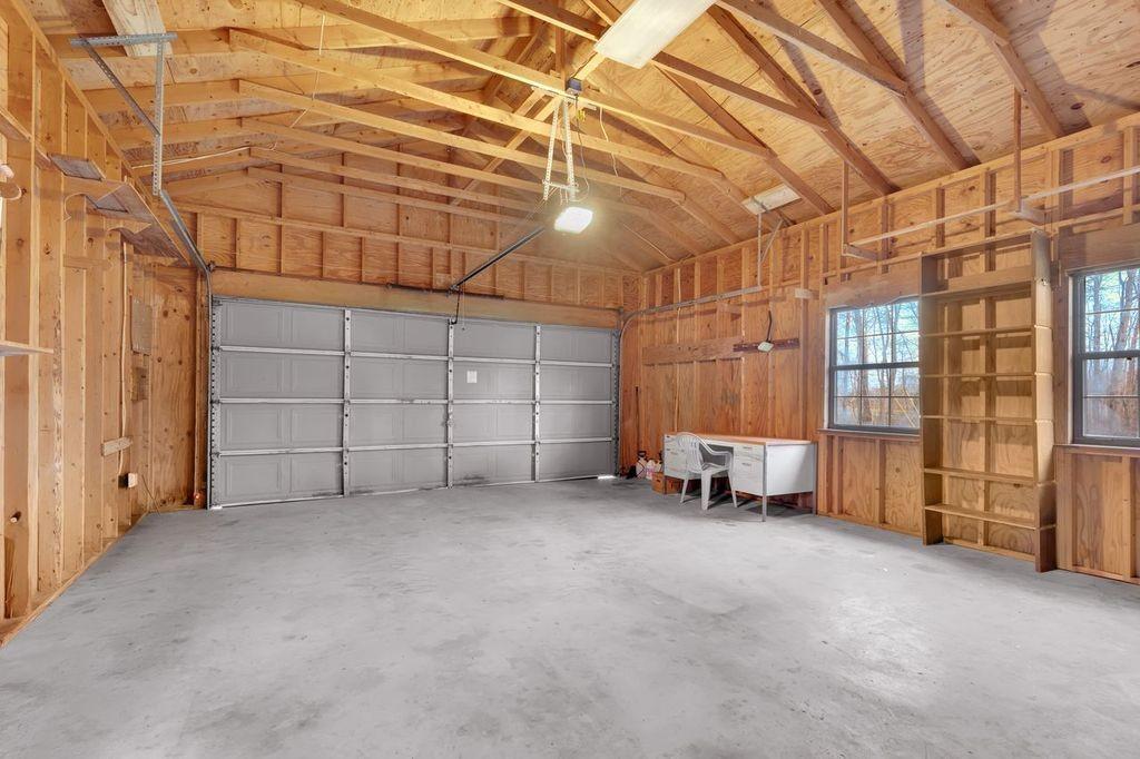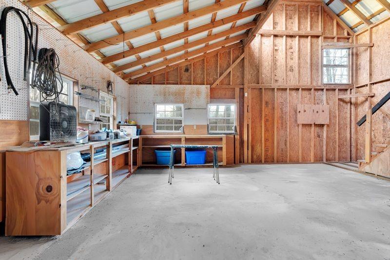 The home is set back from the road and this property has so many options for you! Plenty of sunny space for a garden and a huge workshop for all your projects! Home has an open floor place and a beautiful stone fireplace in the living room and tons of built in storage plus bookcases surround it. Large walk in pantry is just off the kitchen with a build in hutch and shelving, oversize laundry room and a mud room just off the double garage. Main bedroom has a big walk in closet and bath attached. There are 3 bedrooms and two baths plus front porch and a big rear deck. Home faces the side so you can enjoy your porch and deck looking into the woods. The workshop/barn has water and electricity plus separate storage areas for gardening and workshop things plus there is a large loft area as well. It also has another double garage attached to it, you have space for 4 plus cars and trucks to be covered and enclosed. There is also a small storage building on the property in the rear of the home.
