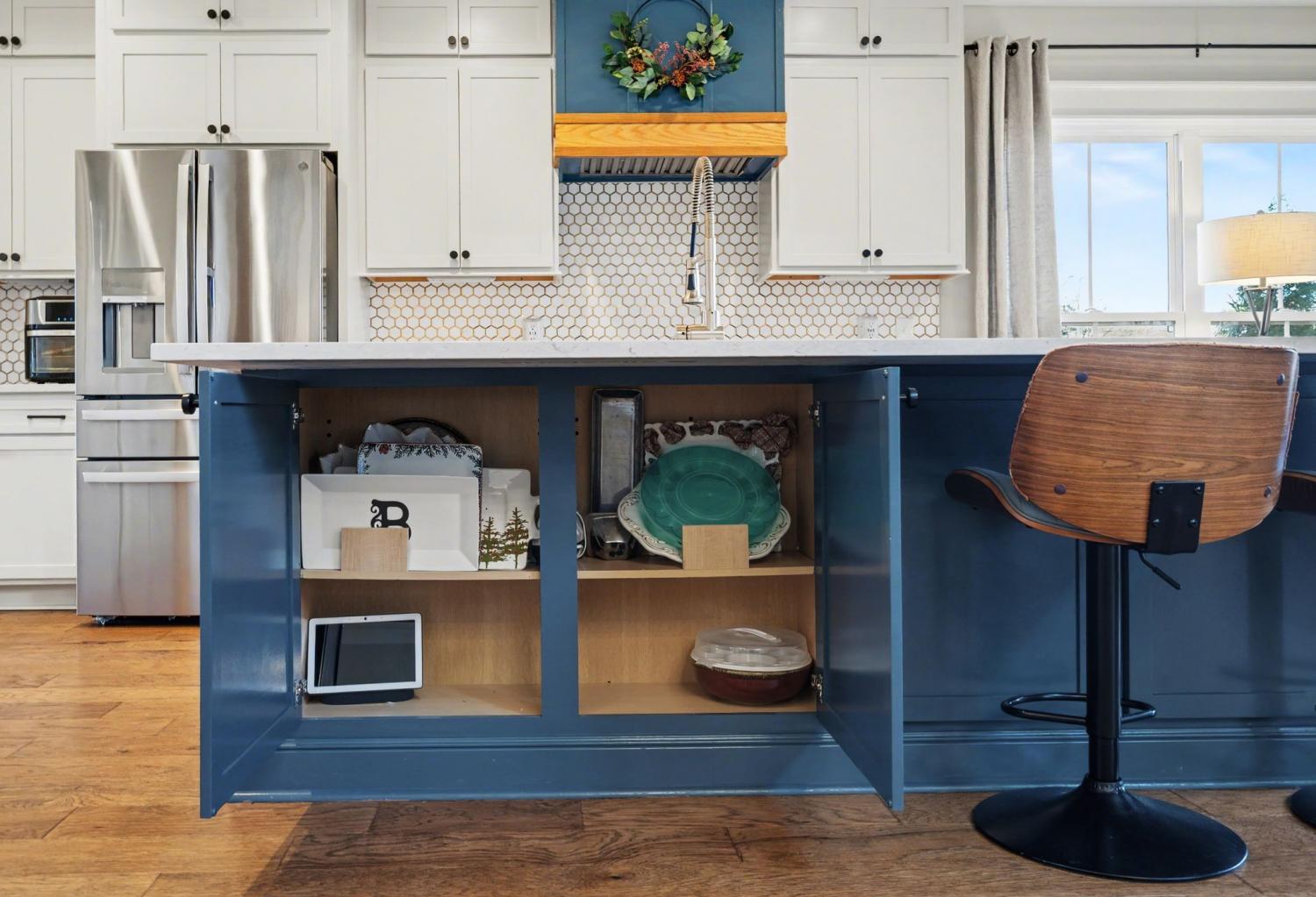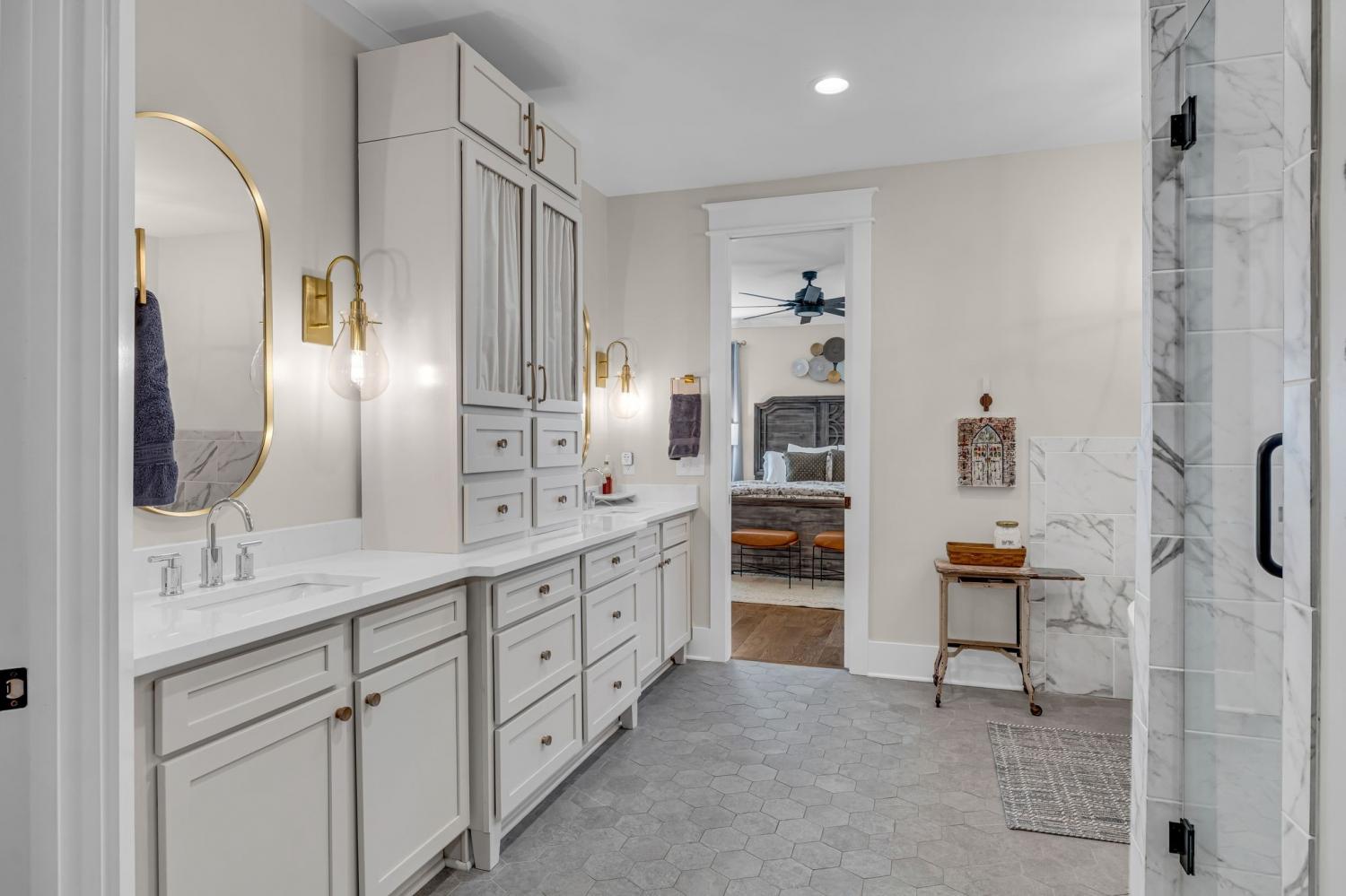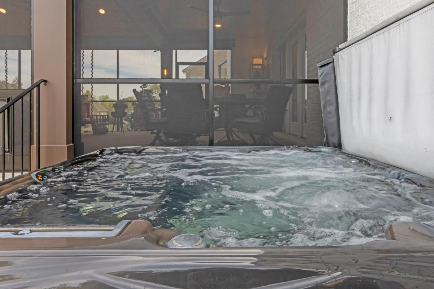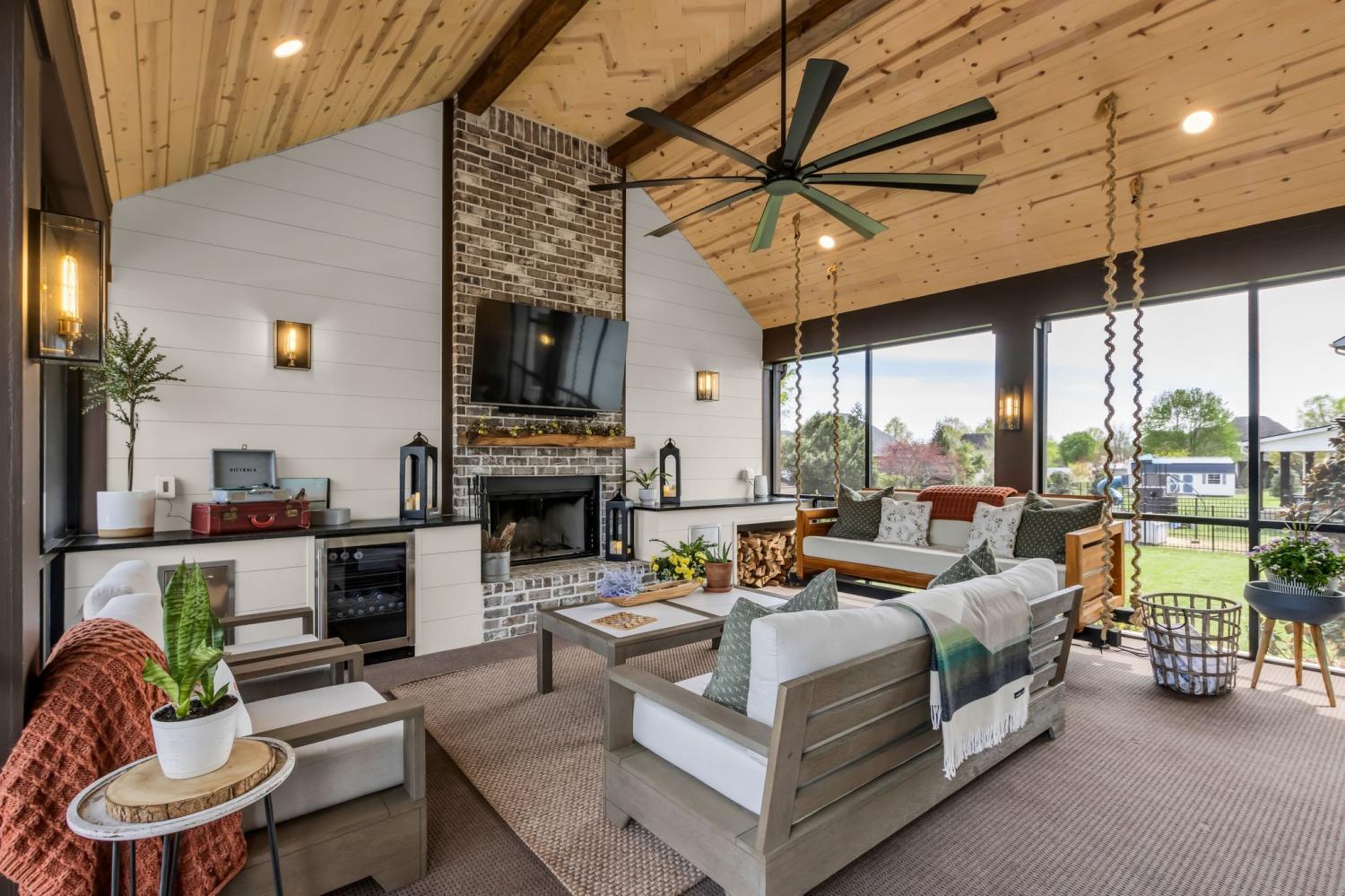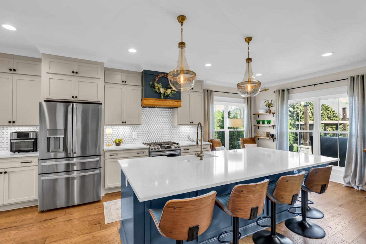 Welcome to your happy place—where every detail has been thoughtfully designed for comfort and convenience. This beautiful home features exceptional finishes and a layout ideal for both everyday living and entertaining. The open kitchen boasts quartz countertops, farmhouse sink, a large island with cabinet storage access on both sides. Additional highlights include a coffee station with beverage cooler, coffee nook, under-counter microwave, double ovens, and a gas cooktop. A stunning cased opening frames the living room, creating an open yet defined space perfect for entertaining or cozy evenings by the fireplace. The primary suite is a private retreat with an adjoining flex space ideal for a home office, nursery, reading nook, or exercise room. Your bathroom will feel like a trip to the spa and the spacious walk in closet is outfitted for maximum storage and organization. Hardwood floors run throughout the main level, as well as the stair treads, catwalk, and hallways. Upstairs offers three additional bedrooms, two full baths, a secondary laundry space, and an expansive bonus room currently used as a bedroom. All bathrooms feature tiled showers and floors with quartz counters, enhanced by upgraded lighting and plumbing fixtures. The large rear ensuite bedroom could easily serve as a second primary suite and includes abundant floored walk-out attic storage. Outside the 20x30 living space is exceptional, featuring a wood-burning FP with gas starter & overhead heaters for year-round enjoyment. A covered patio leads to a fully equipped outdoor kitchen with beverage cooler. The large,level lot features, low voltage landscape lighting & irrigation system. Single garage bay is currently outfitted as a golf simulator complete with portable heating and cooling equipment. Equipment does not convey but is negotiable, or the sellers will convert the space back to a traditional third-car garage. Water softening system, garage fridge&freezer do not convey.Tankless water heater