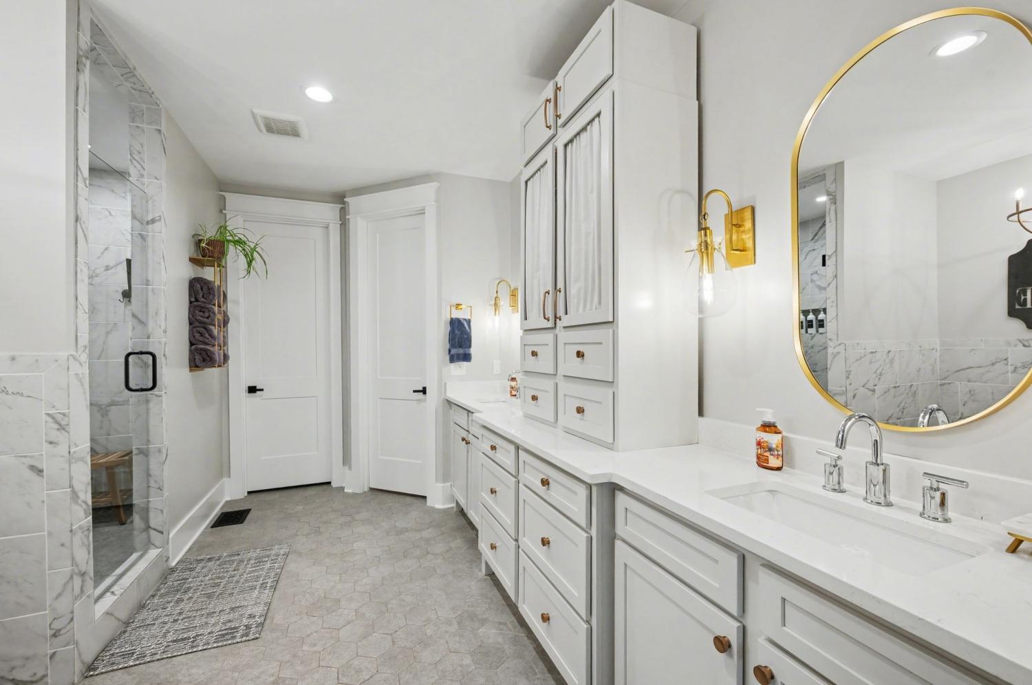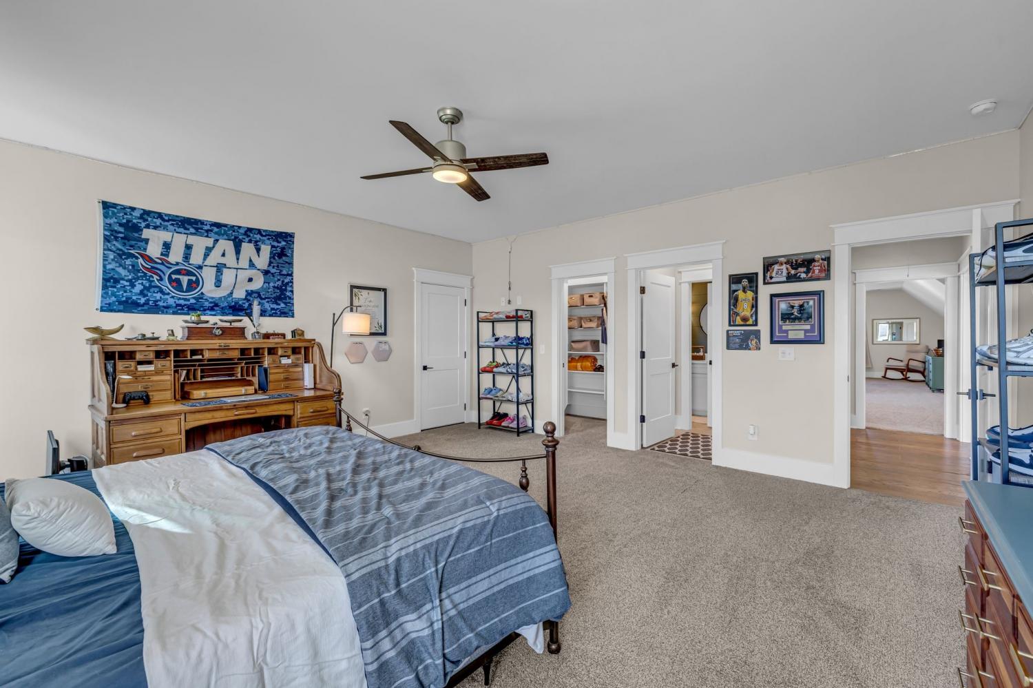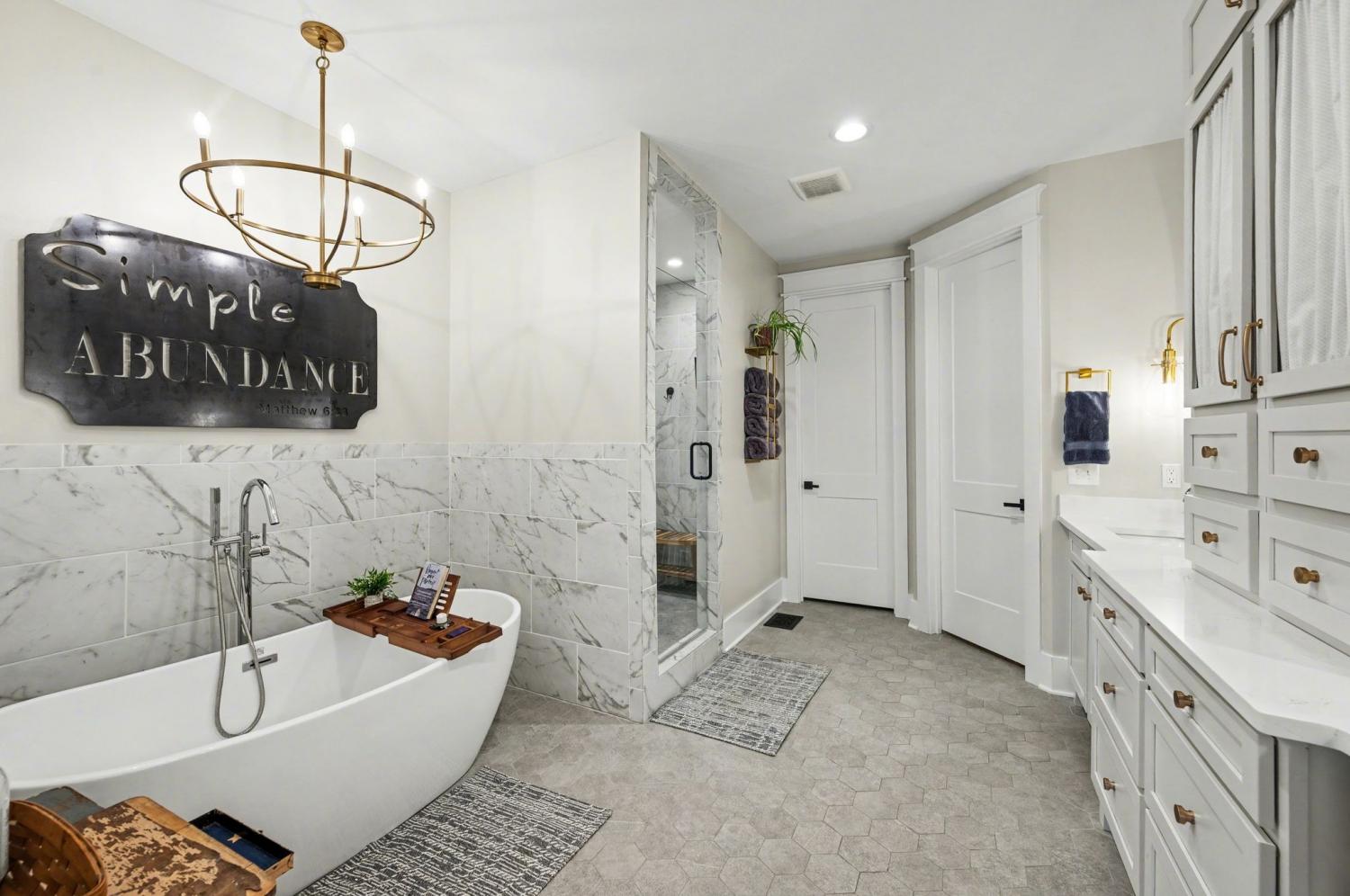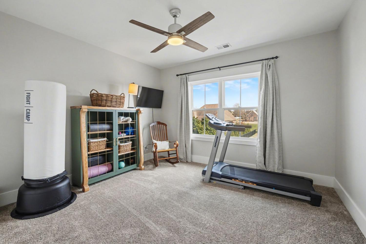 Welcome to your happy place—where every detail has been thoughtfully designed for comfort and convenience. This beautiful home features exceptional finishes and a layout ideal for both everyday living and entertaining. The open kitchen boasts quartz countertops, farmhouse sink, a large island with cabinet storage access on both sides. Additional highlights include a coffee station with beverage cooler, coffee nook, under-counter microwave, double ovens, and a gas cooktop. A stunning cased opening frames the living room, creating an open yet defined space perfect for entertaining or cozy evenings by the fireplace. The primary suite is a private retreat with an adjoining flex space ideal for a home office, nursery, reading nook, or exercise room. Your bathroom will feel like a trip to the spa and the spacious walk in closet is outfitted for maximum storage and organization. Hardwood floors run throughout the main level, as well as the stair treads, catwalk, and hallways. Upstairs offers three additional bedrooms, two full baths, a secondary laundry space, and an expansive bonus room currently used as a bedroom. All bathrooms feature tiled showers and floors with quartz counters, enhanced by upgraded lighting and plumbing fixtures. The large rear ensuite bedroom could easily serve as a second primary suite and includes abundant floored walk-out attic storage. Outside the 20x30 living space is exceptional, featuring a wood-burning FP with gas starter & overhead heaters for year-round enjoyment. A covered patio leads to a fully equipped outdoor kitchen with beverage cooler. The large,level lot features, low voltage landscape lighting & irrigation system. Single garage bay is currently outfitted as a golf simulator complete with portable heating and cooling equipment. Equipment does not convey but is negotiable, or the sellers will convert the space back to a traditional third-car garage. Water softening system, garage fridge&freezer do not convey.Tankless water heater