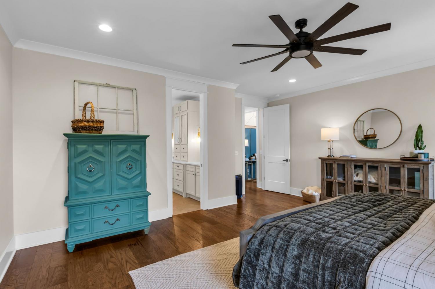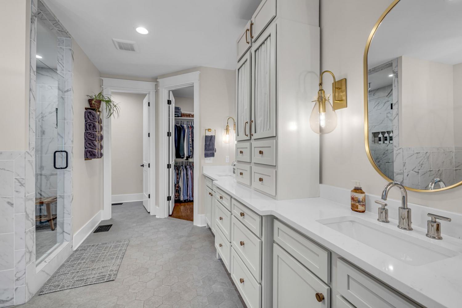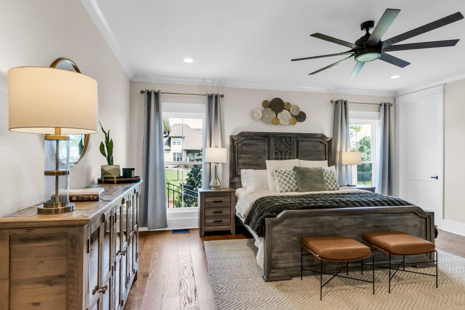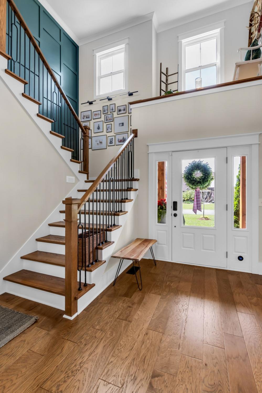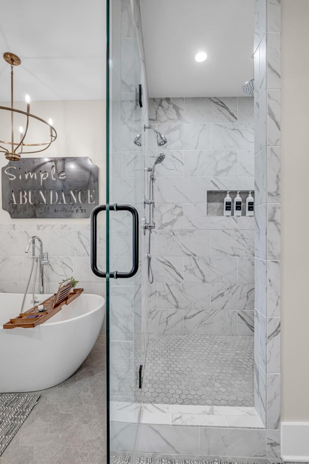 Welcome to your happy place—where every detail has been thoughtfully designed for comfort and convenience. This beautiful home features exceptional finishes and a layout ideal for both everyday living and entertaining. The open kitchen boasts quartz countertops, farmhouse sink, a large island with cabinet storage access on both sides. Additional highlights include a coffee station with beverage cooler, coffee nook, under-counter microwave, double ovens, and a gas cooktop. A stunning cased opening frames the living room, creating an open yet defined space perfect for entertaining or cozy evenings by the fireplace. The primary suite is a private retreat with an adjoining flex space ideal for a home office, nursery, reading nook, or exercise room. Your bathroom will feel like a trip to the spa and the spacious walk in closet is outfitted for maximum storage and organization. Hardwood floors run throughout the main level, as well as the stair treads, catwalk, and hallways. Upstairs offers three additional bedrooms, two full baths, a secondary laundry space, and an expansive bonus room currently used as a bedroom. All bathrooms feature tiled showers and floors with quartz counters, enhanced by upgraded lighting and plumbing fixtures. The large rear ensuite bedroom could easily serve as a second primary suite and includes abundant floored walk-out attic storage. Outside the 20x30 living space is exceptional, featuring a wood-burning FP with gas starter & overhead heaters for year-round enjoyment. A covered patio leads to a fully equipped outdoor kitchen with beverage cooler. The large,level lot features, low voltage landscape lighting & irrigation system. Single garage bay is currently outfitted as a golf simulator complete with portable heating and cooling equipment. Equipment does not convey but is negotiable, or the sellers will convert the space back to a traditional third-car garage. Water softening system, garage fridge&freezer do not convey.Tankless water heater
