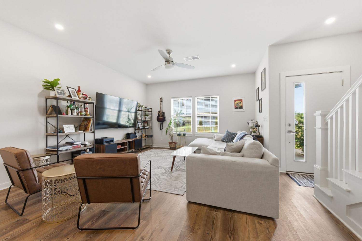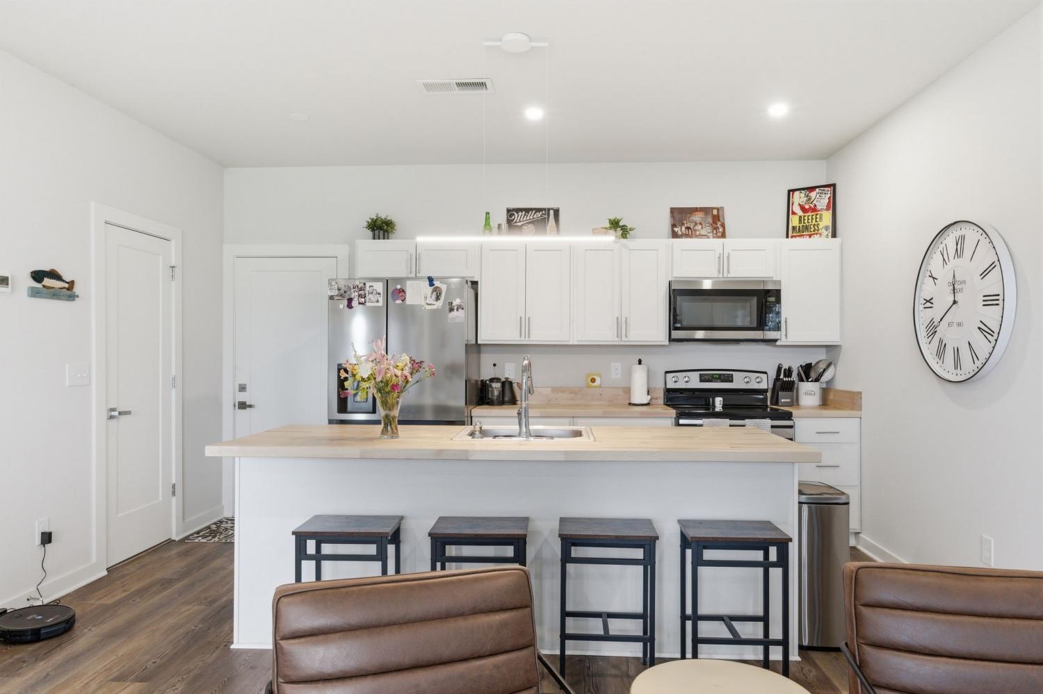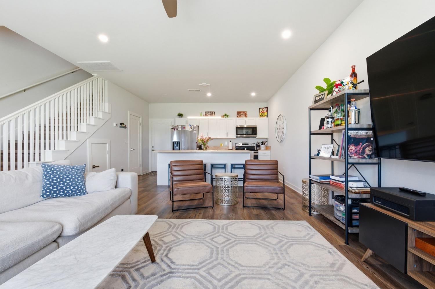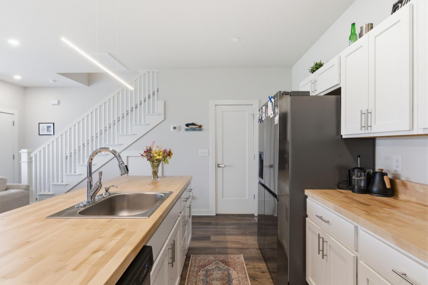Spacious open floor plan perfect for entertaining. Kitchen includes all stainless appliances and large butcher block island. Upstairs there are two large bedrooms each with their own beautiful and roomy bathroom. Master has two closets. Washer and dryer are also upstairs and remain with the house. 2 car garage with added water connection inside. Lots of shared green space and located minutes to downtown.