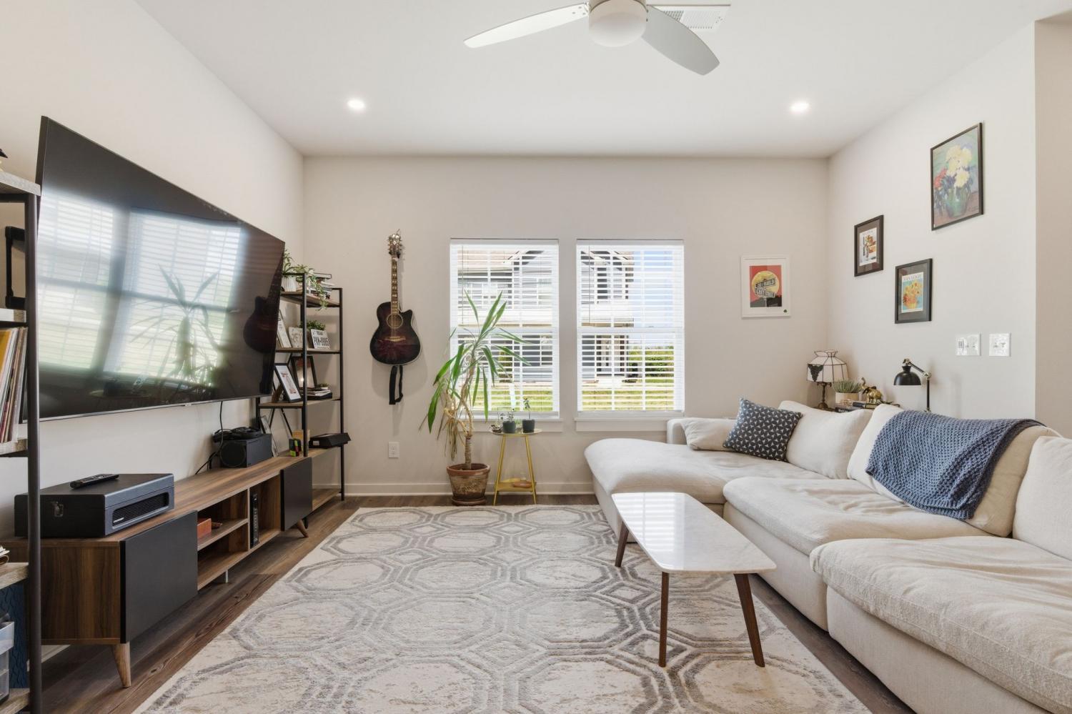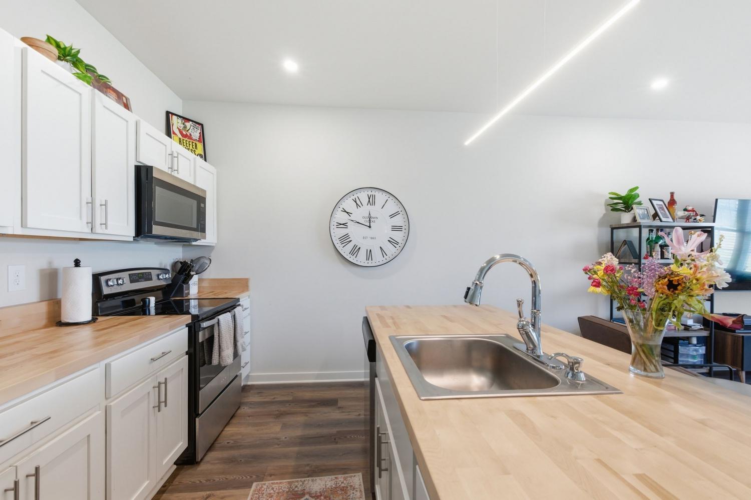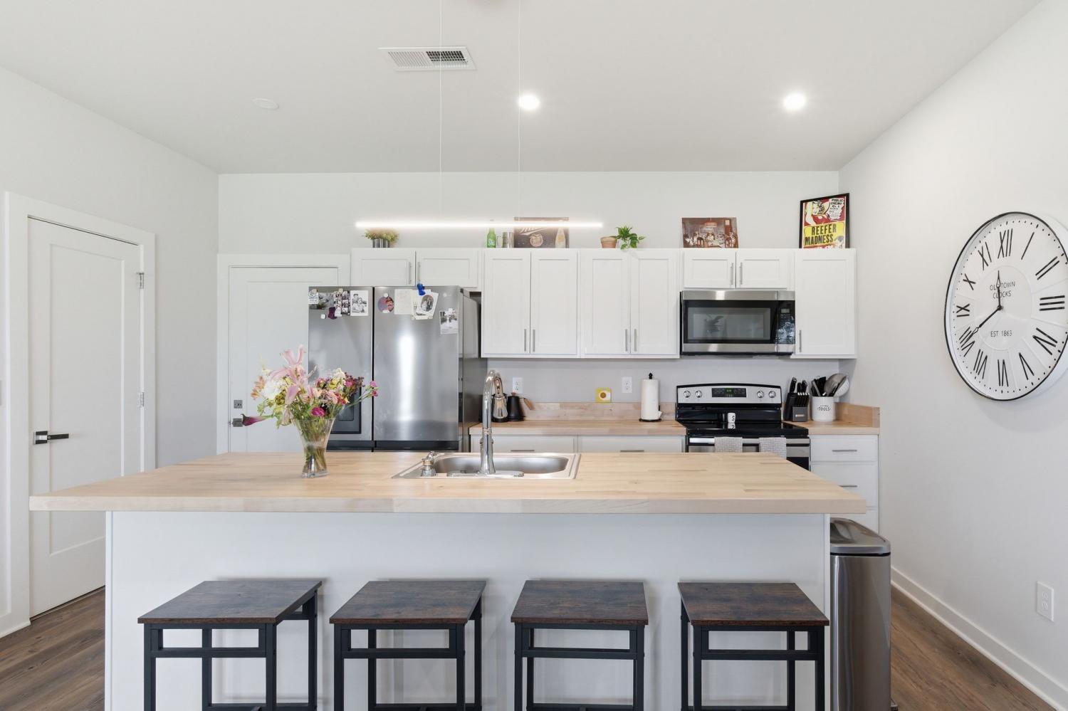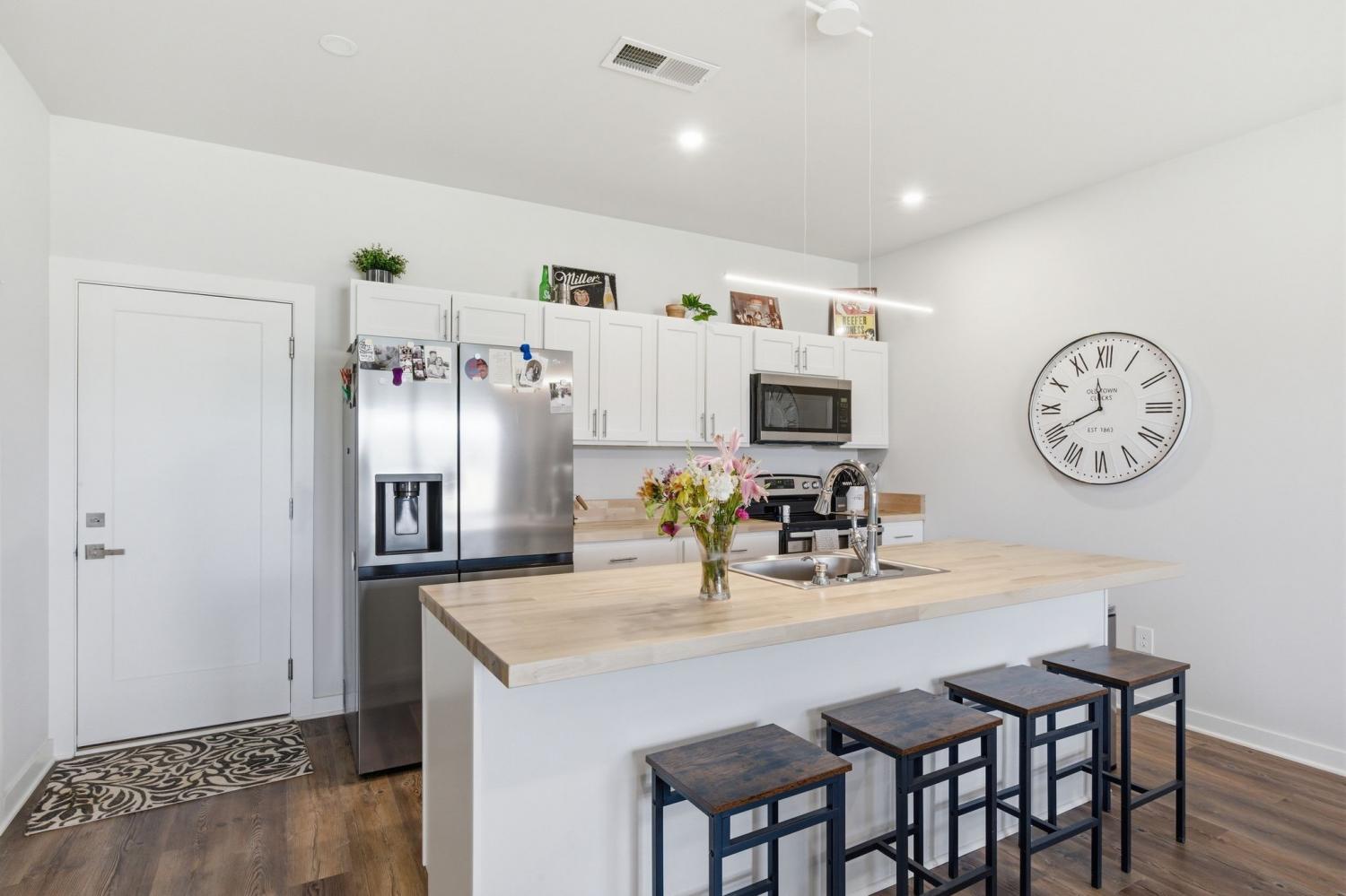 Spacious open floor plan perfect for entertaining. Kitchen includes all stainless appliances and large butcher block island. Upstairs there are two large bedrooms each with their own beautiful and roomy bathroom. Master has two closets. Washer and dryer are also upstairs and remain with the house. 2 car garage with added water connection inside. Lots of shared green space and located minutes to downtown.