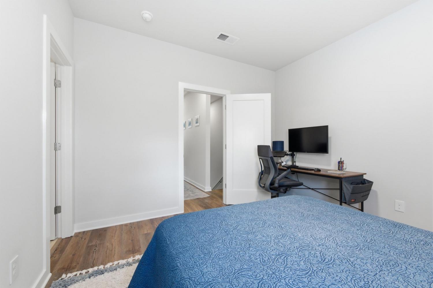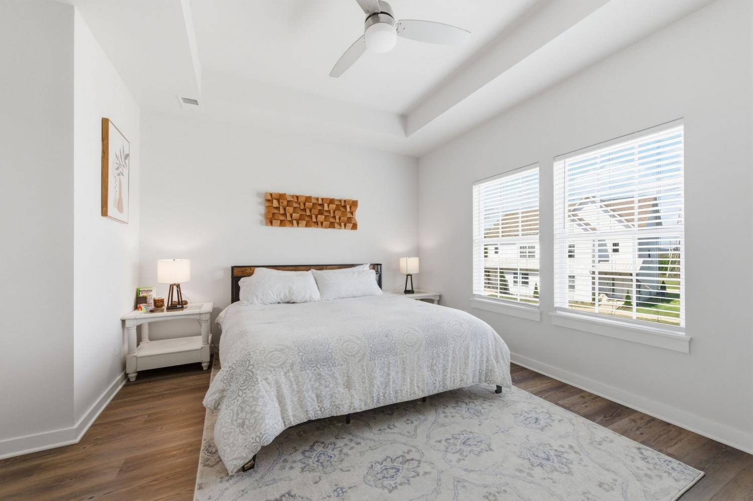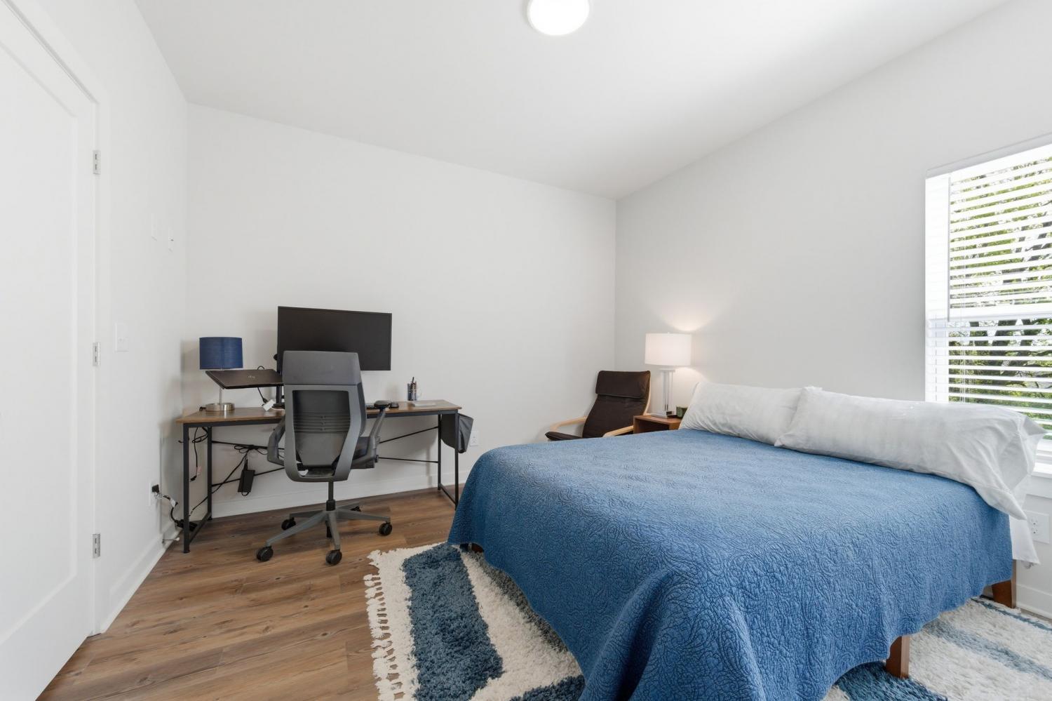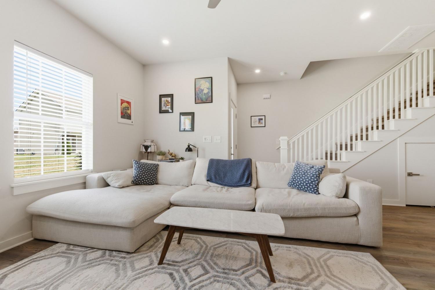 Spacious open floor plan perfect for entertaining. Kitchen includes all stainless appliances and large butcher block island. Upstairs there are two large bedrooms each with their own beautiful and roomy bathroom. Master has two closets. Washer and dryer are also upstairs and remain with the house. 2 car garage with added water connection inside. Lots of shared green space and located minutes to downtown.
