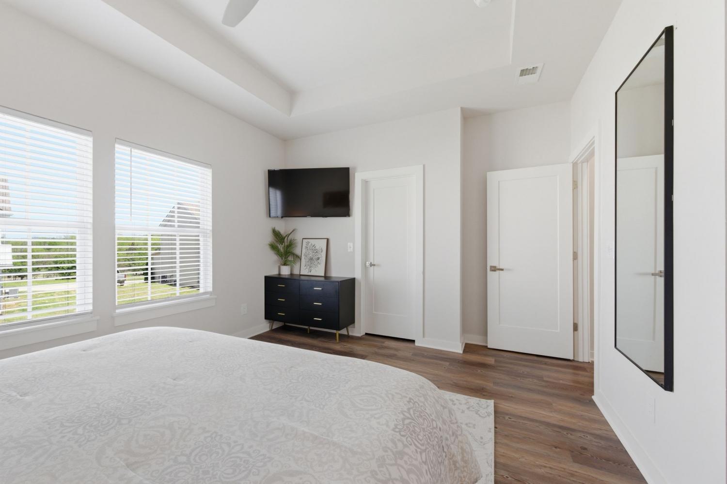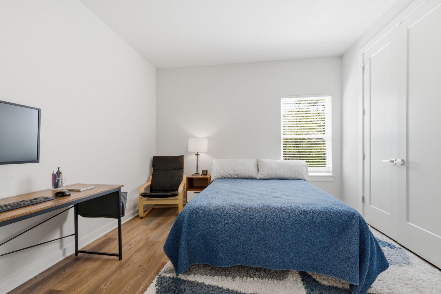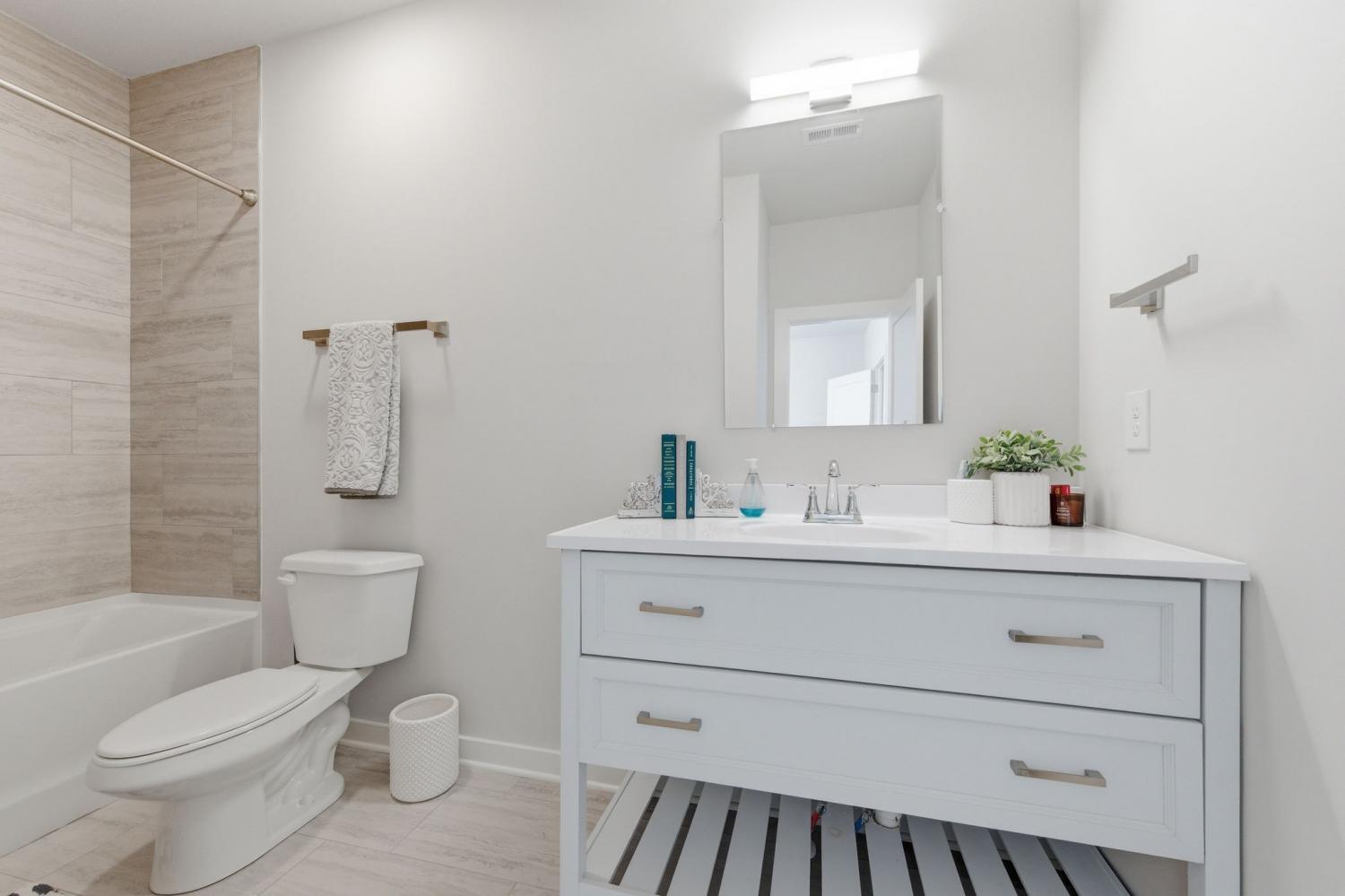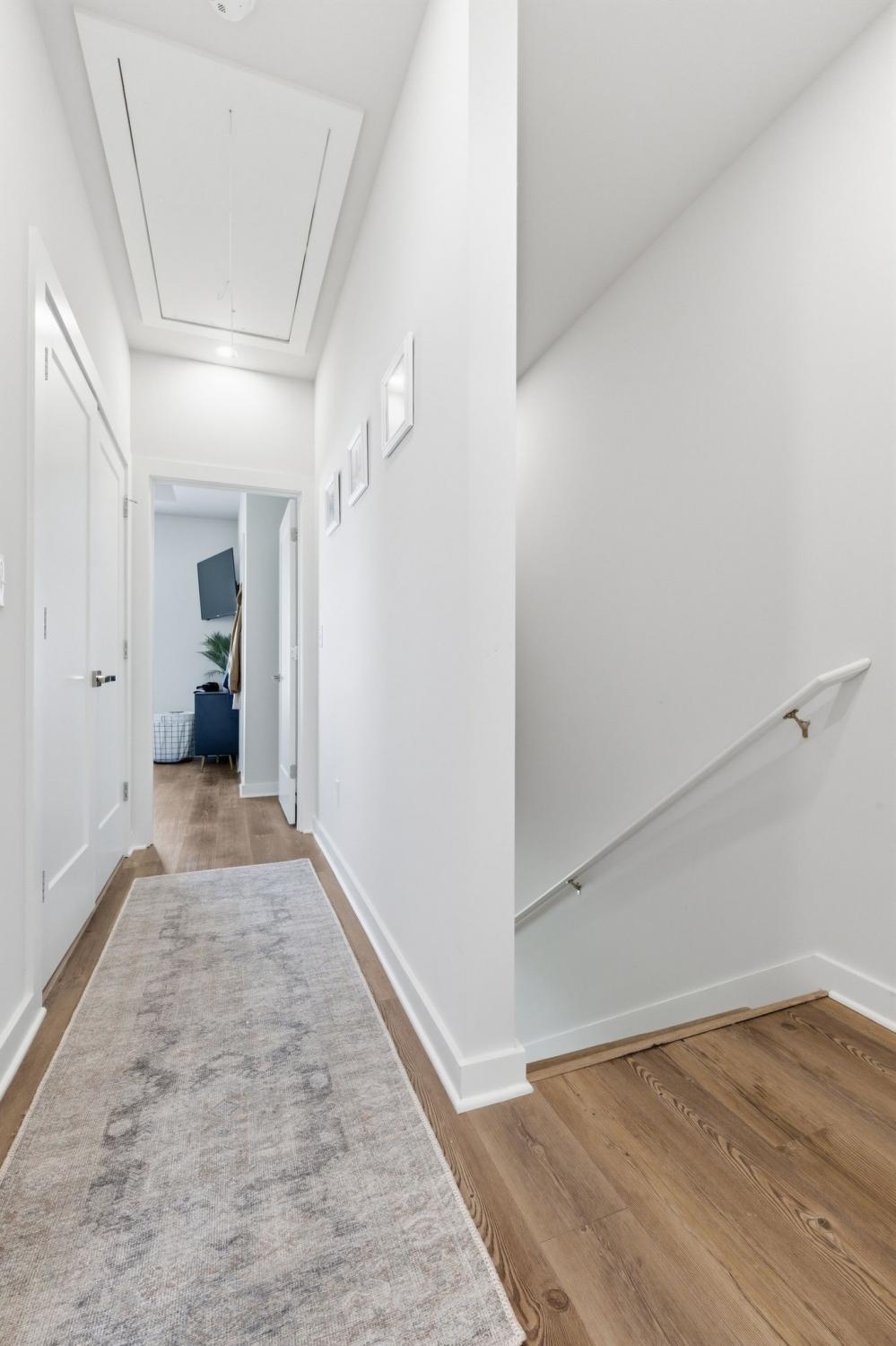 Spacious open floor plan perfect for entertaining. Kitchen includes all stainless appliances and large butcher block island. Upstairs there are two large bedrooms each with their own beautiful and roomy bathroom. Master has two closets. Washer and dryer are also upstairs and remain with the house. 2 car garage with added water connection inside. Lots of shared green space and located minutes to downtown.