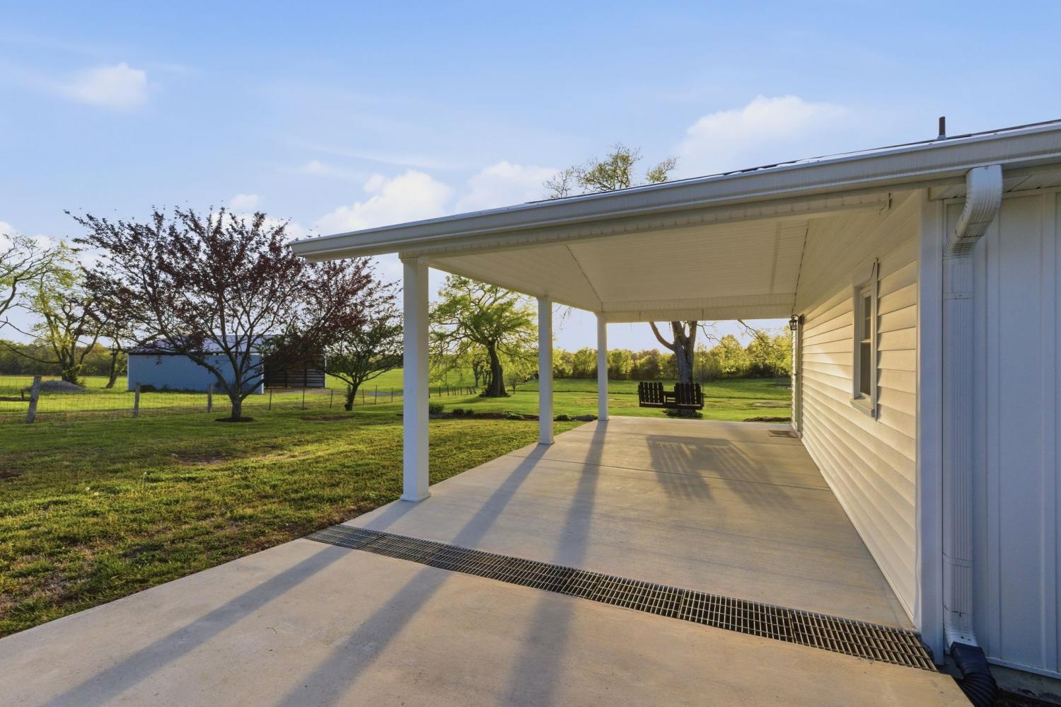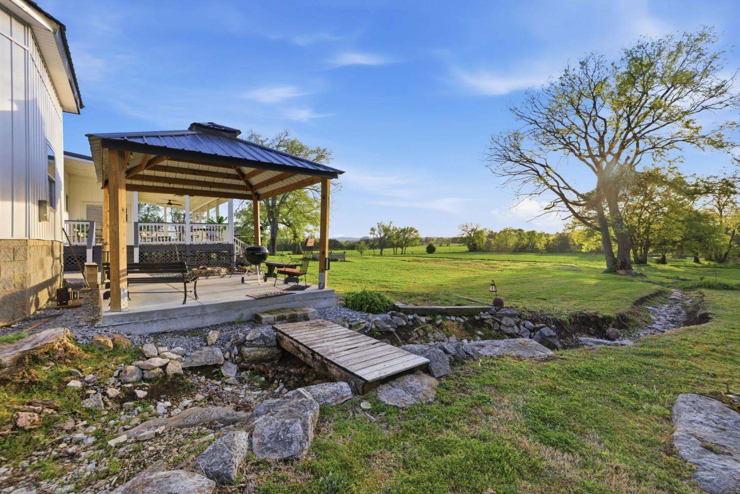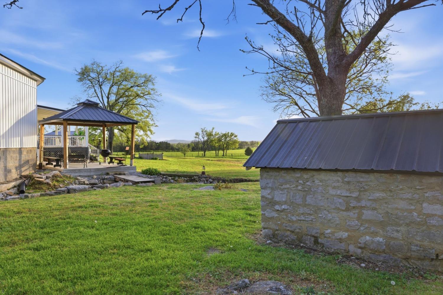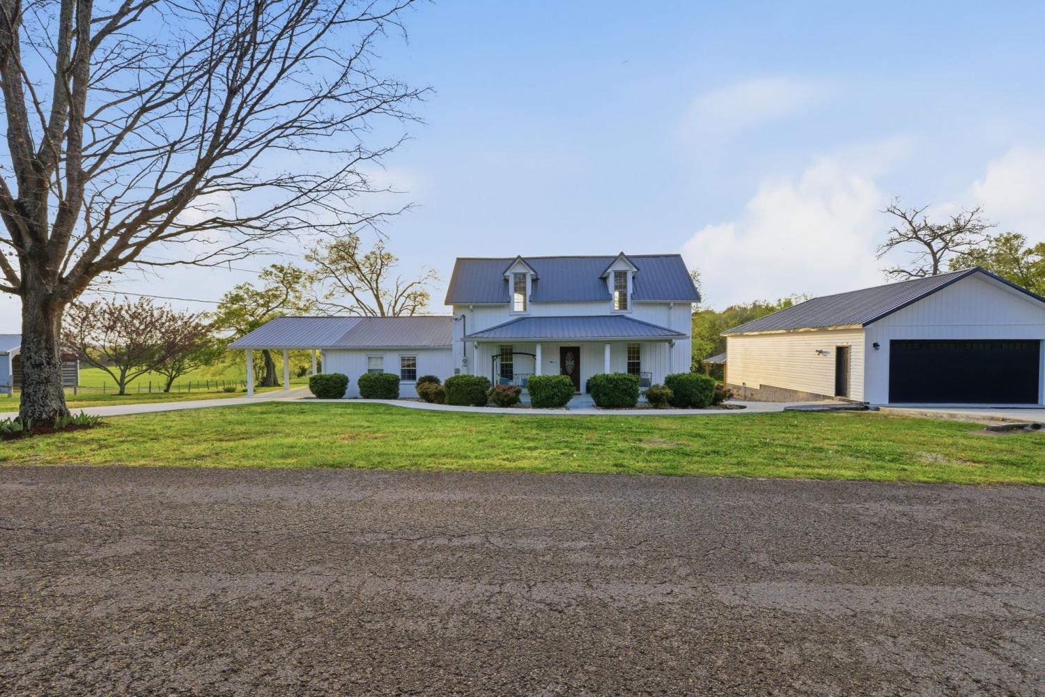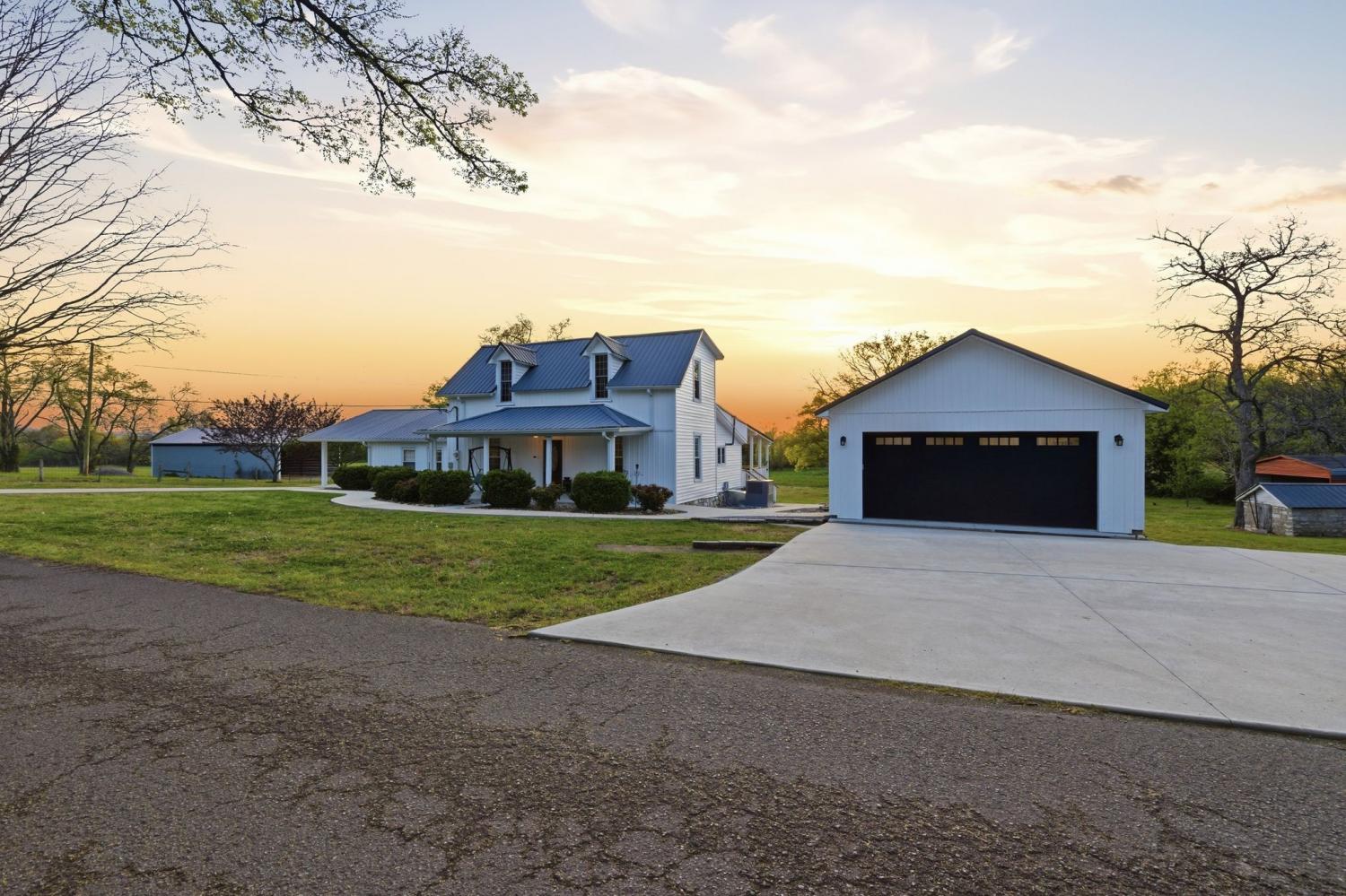 Enjoy sunsets in the countryside from the covered back porch or pavilion, overlooking your private 5+ acres, all less than 10 minutes from the Square. Well maintained over the years with downstairs bedrooms, main level living, and outdoor spaces ready for you to relax in today. Having an apple tree, plum tree, pear tree, and two peach trees helps add to the historic charm of the original structure that has stood the test of time (believed to be from the late 1800's). Crawlspace has been encapsulated, downstairs HVAC unit replaced 2023. Large exterior garage added in 2021, along with the covered back porch and backyard pavilion. Substantial concrete sidewalks and driveways, new siding, and standing seam metal roof that year as well. Original bathroom renovated in 2019, larger downstairs bathroom and downstairs den area renovated in 2018. Windows are somewhere in that 15 year old range.