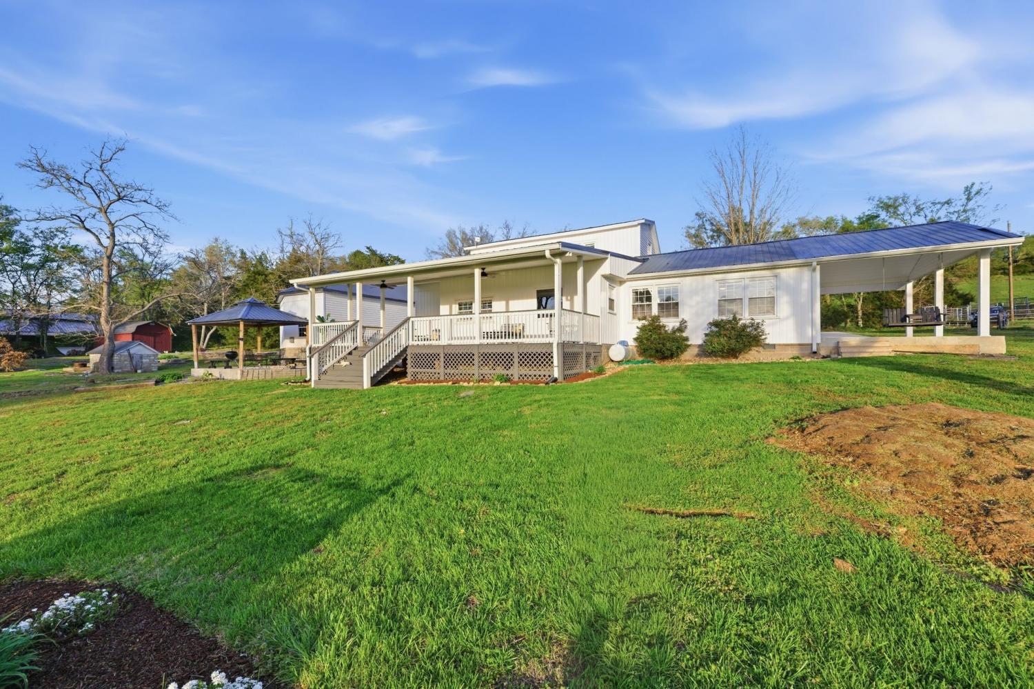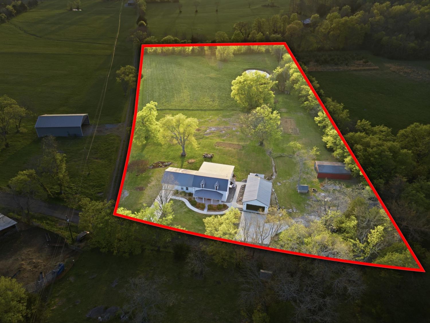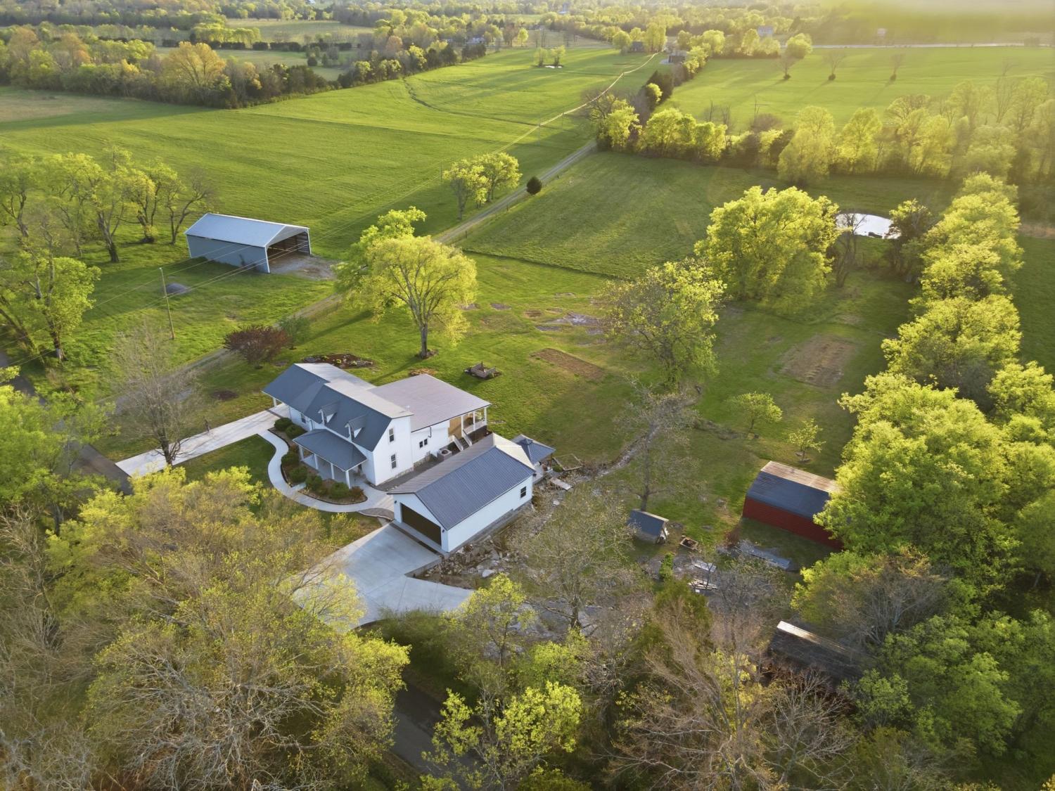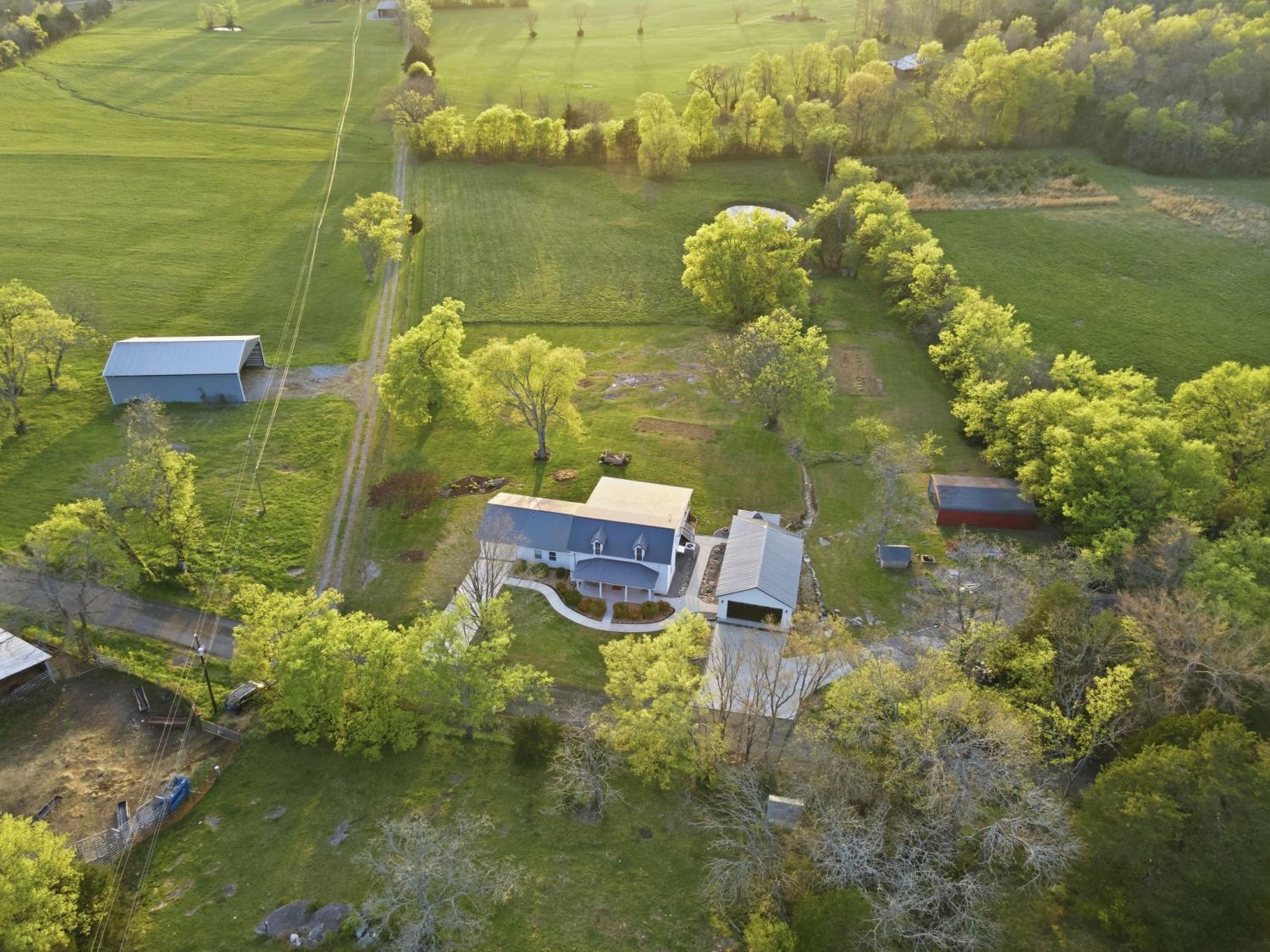 Enjoy sunsets in the countryside from the covered back porch or pavilion, overlooking your private 5+ acres, all less than 10 minutes from the Square. Well maintained over the years with downstairs bedrooms, main level living, and outdoor spaces ready for you to relax in today. Having an apple tree, plum tree, pear tree, and two peach trees helps add to the historic charm of the original structure that has stood the test of time (believed to be from the late 1800's). Crawlspace has been encapsulated, downstairs HVAC unit replaced 2023. Large exterior garage added in 2021, along with the covered back porch and backyard pavilion. Substantial concrete sidewalks and driveways, new siding, and standing seam metal roof that year as well. Original bathroom renovated in 2019, larger downstairs bathroom and downstairs den area renovated in 2018. Windows are somewhere in that 15 year old range.