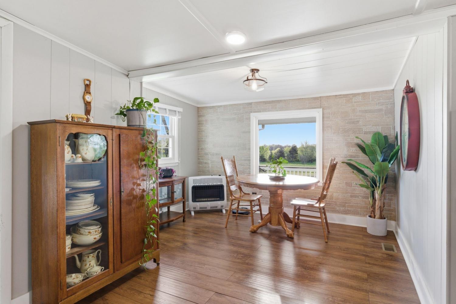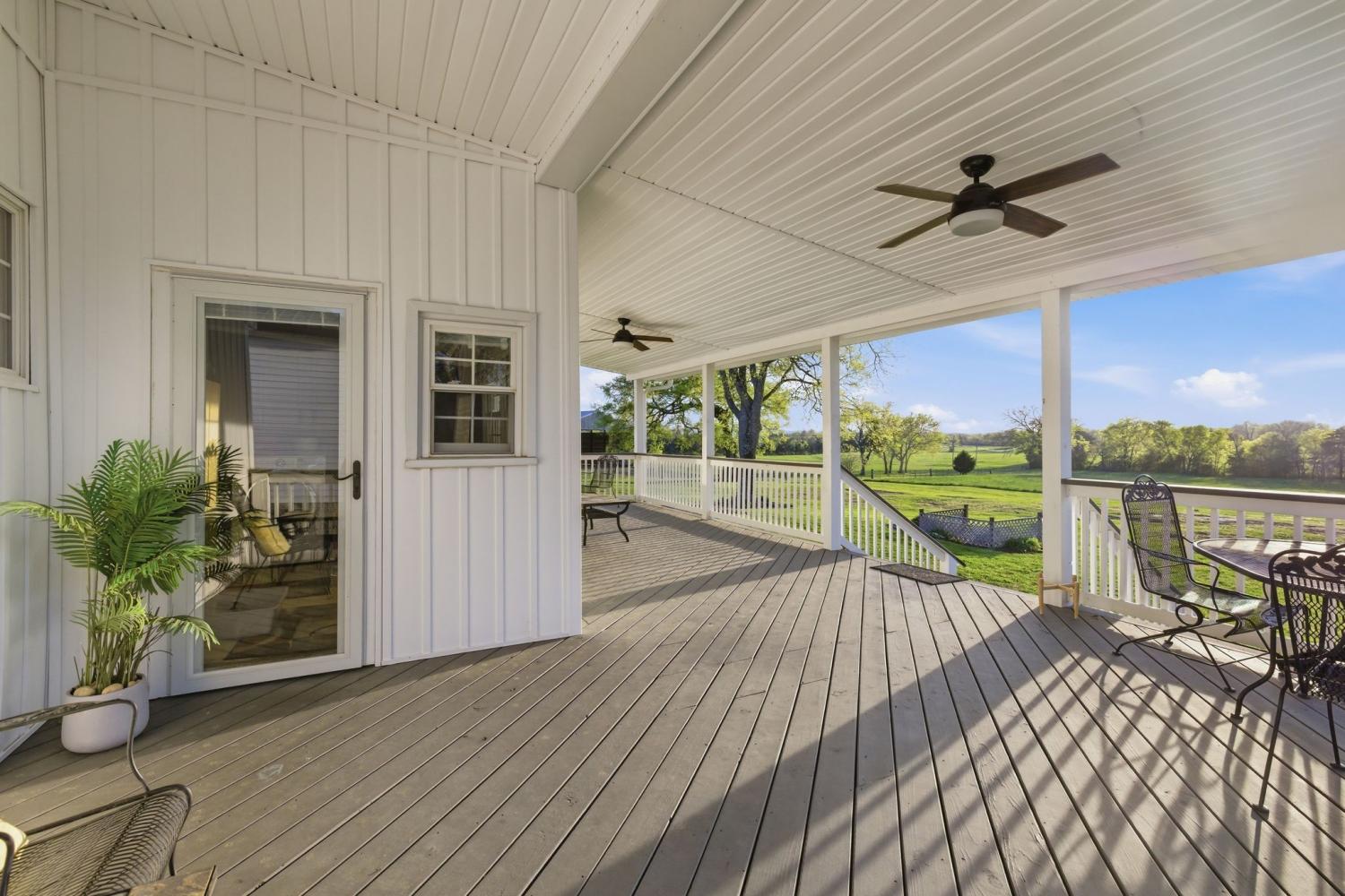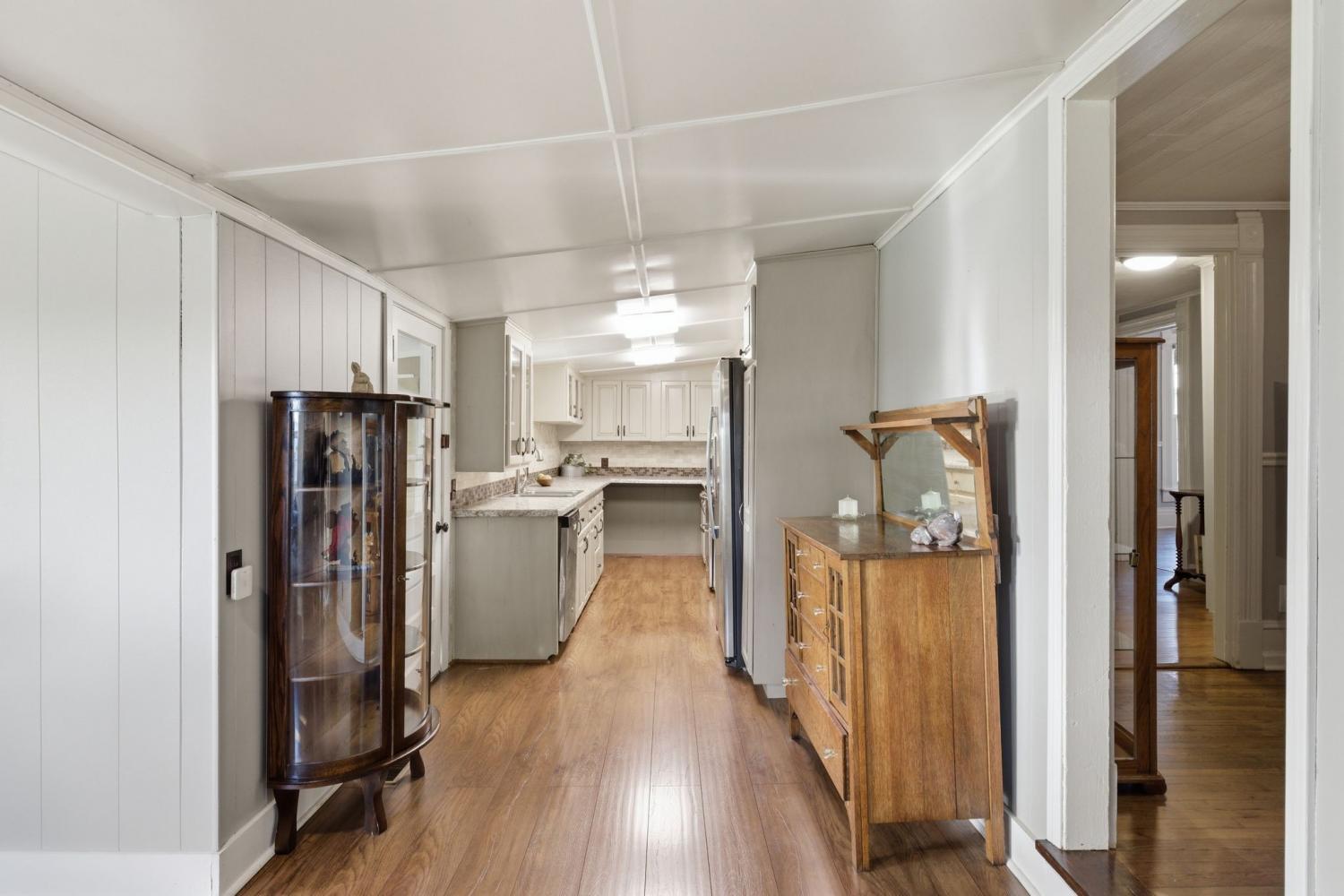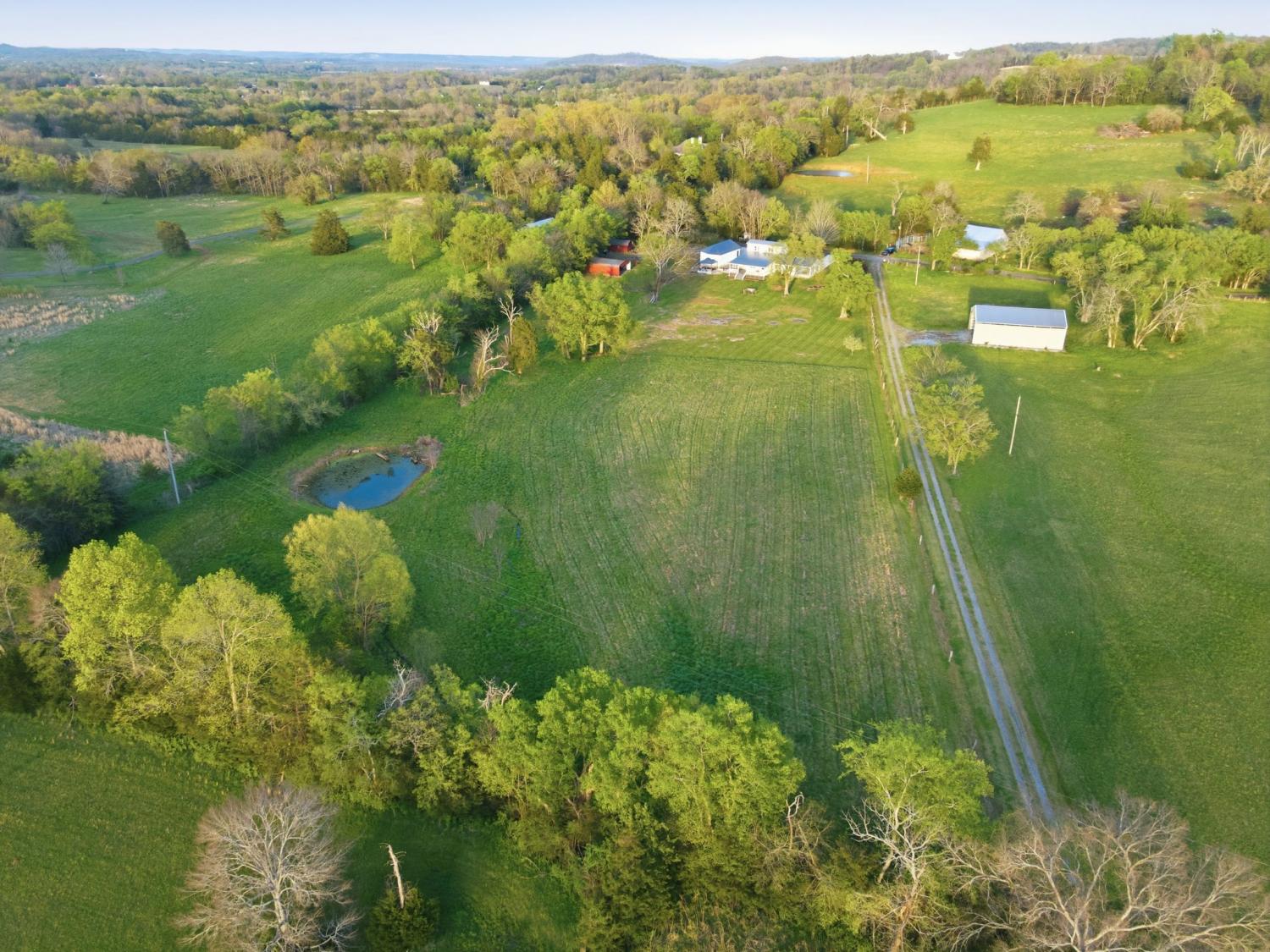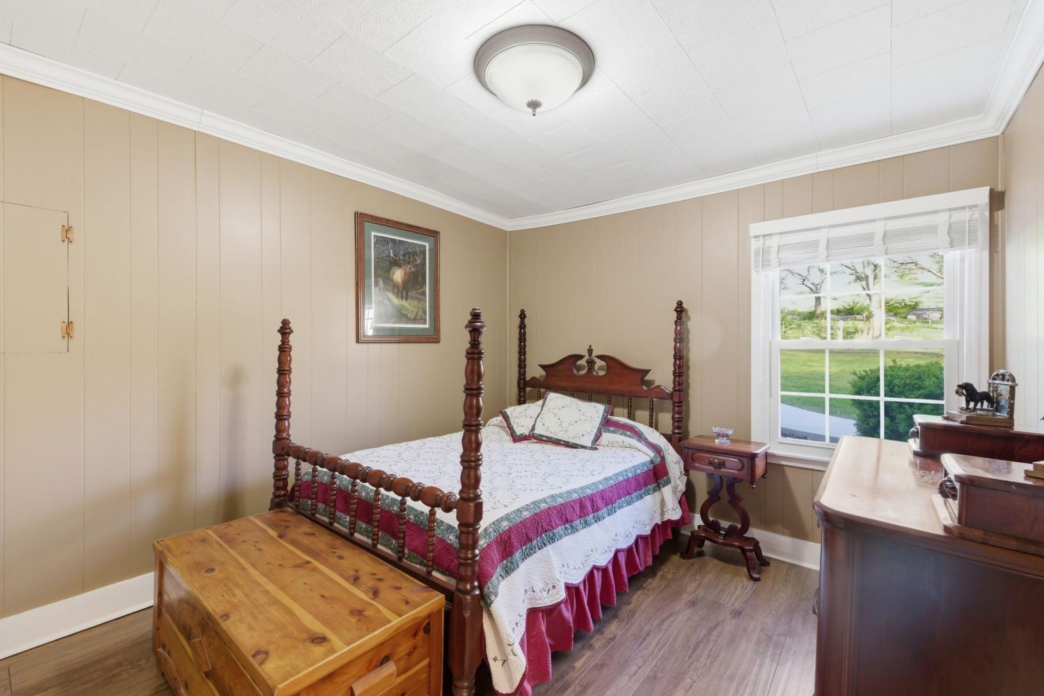 Enjoy sunsets in the countryside from the covered back porch or pavilion, overlooking your private 5+ acres, all less than 10 minutes from the Square. Well maintained over the years with downstairs bedrooms, main level living, and outdoor spaces ready for you to relax in today. Having an apple tree, plum tree, pear tree, and two peach trees helps add to the historic charm of the original structure that has stood the test of time (believed to be from the late 1800's). Crawlspace has been encapsulated, downstairs HVAC unit replaced 2023. Large exterior garage added in 2021, along with the covered back porch and backyard pavilion. Substantial concrete sidewalks and driveways, new siding, and standing seam metal roof that year as well. Original bathroom renovated in 2019, larger downstairs bathroom and downstairs den area renovated in 2018. Windows are somewhere in that 15 year old range.