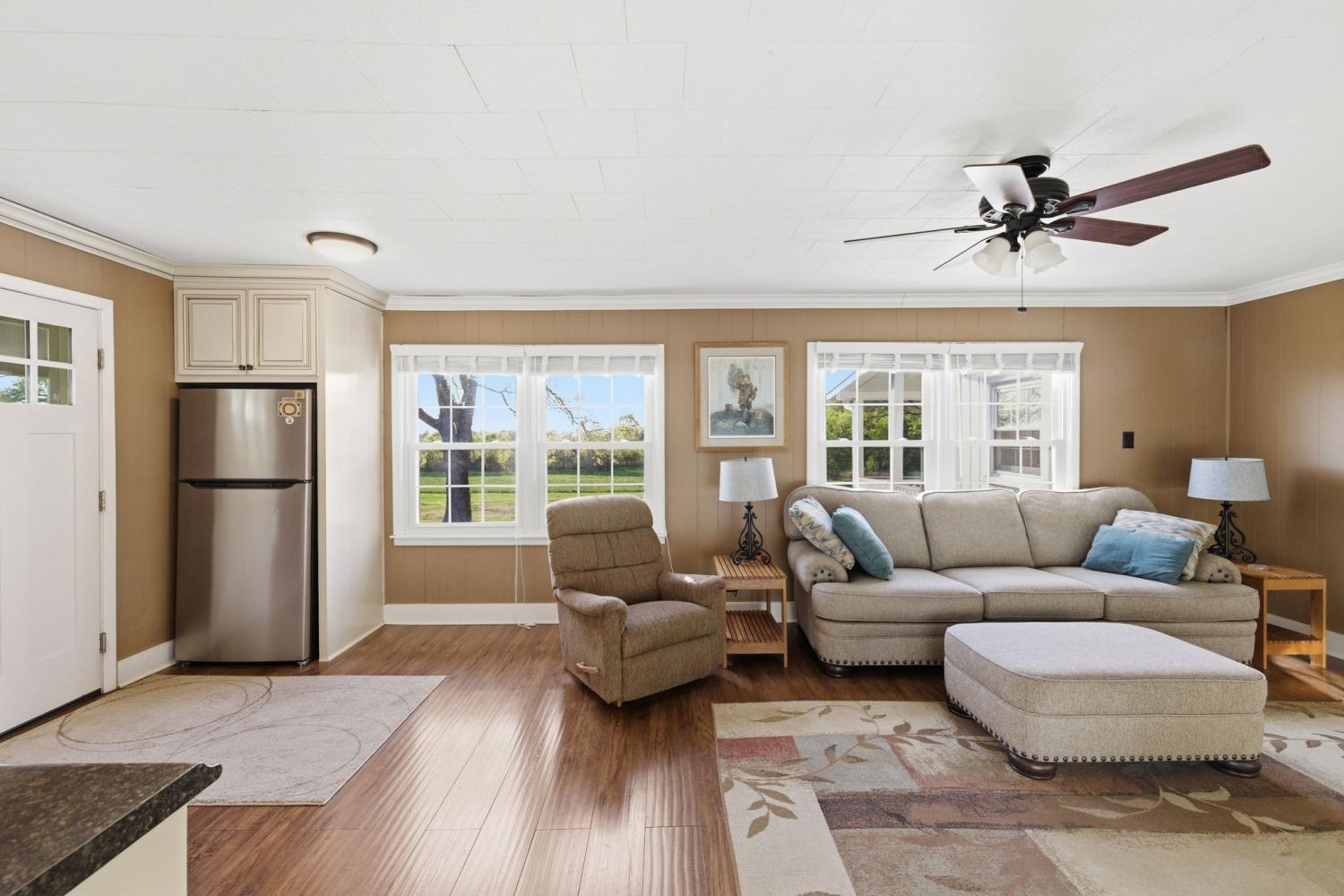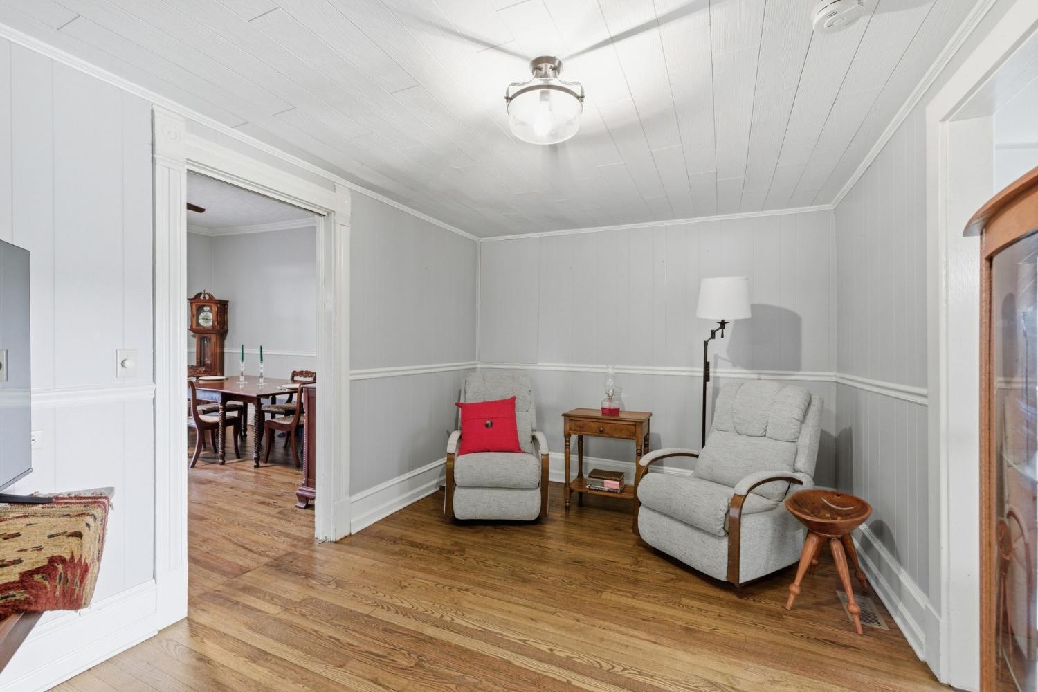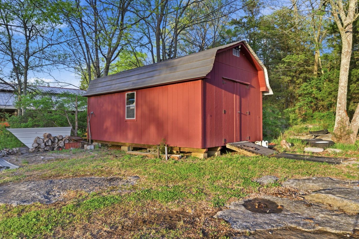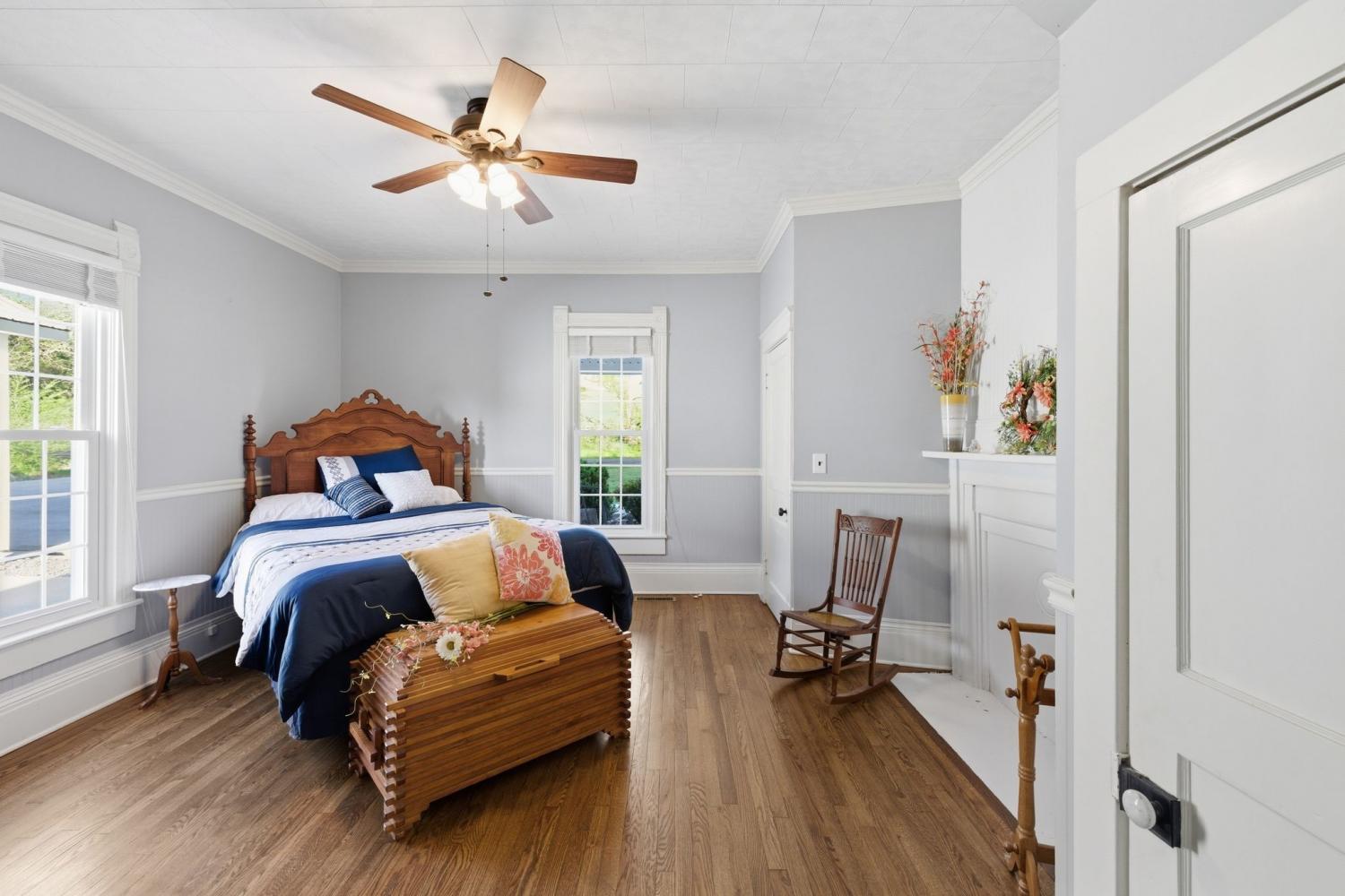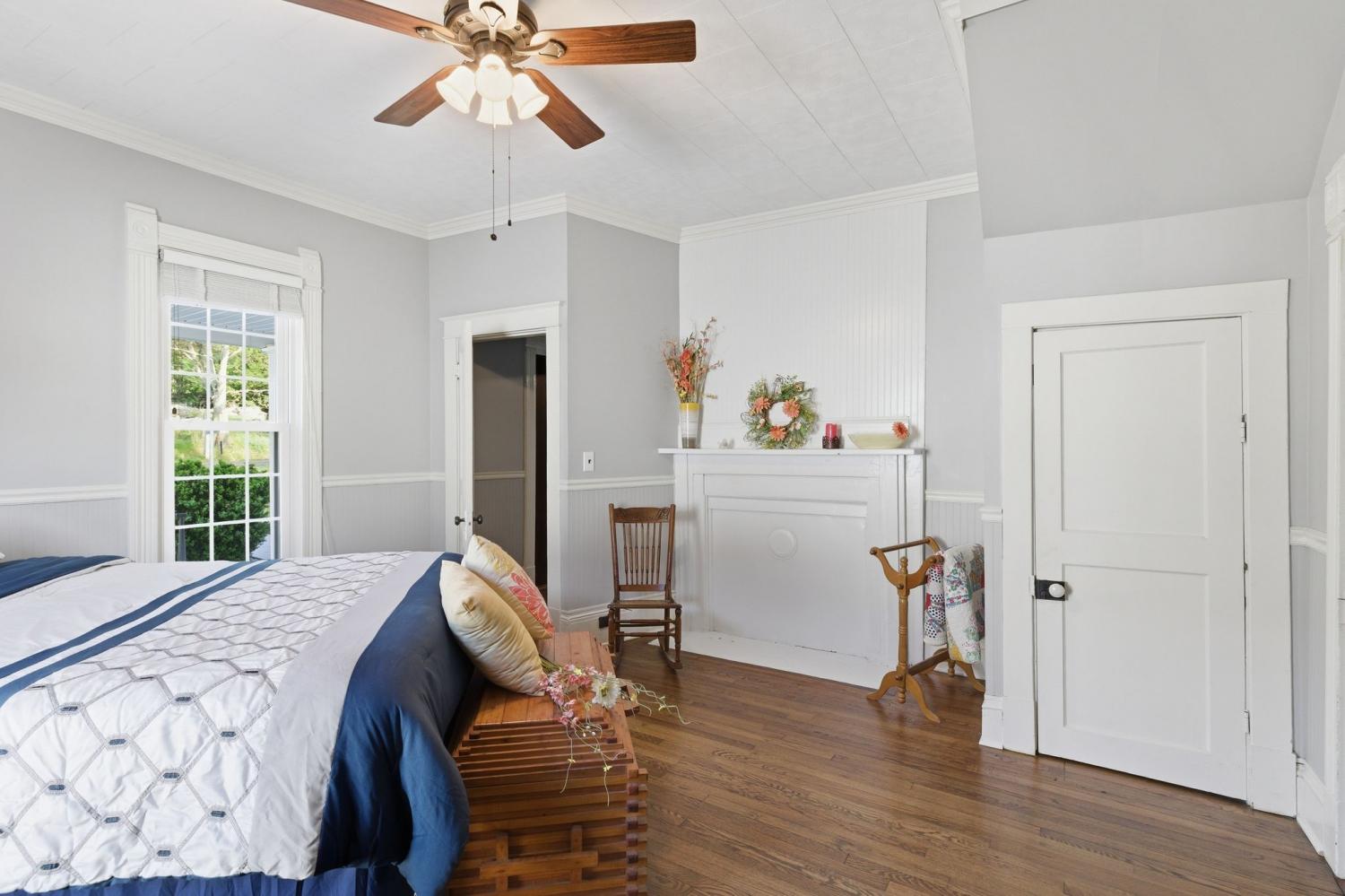 Enjoy sunsets in the countryside from the covered back porch or pavilion, overlooking your private 5+ acres, all less than 10 minutes from the Square. Well maintained over the years with downstairs bedrooms, main level living, and outdoor spaces ready for you to relax in today. Having an apple tree, plum tree, pear tree, and two peach trees helps add to the historic charm of the original structure that has stood the test of time (believed to be from the late 1800's). Crawlspace has been encapsulated, downstairs HVAC unit replaced 2023. Large exterior garage added in 2021, along with the covered back porch and backyard pavilion. Substantial concrete sidewalks and driveways, new siding, and standing seam metal roof that year as well. Original bathroom renovated in 2019, larger downstairs bathroom and downstairs den area renovated in 2018. Windows are somewhere in that 15 year old range.