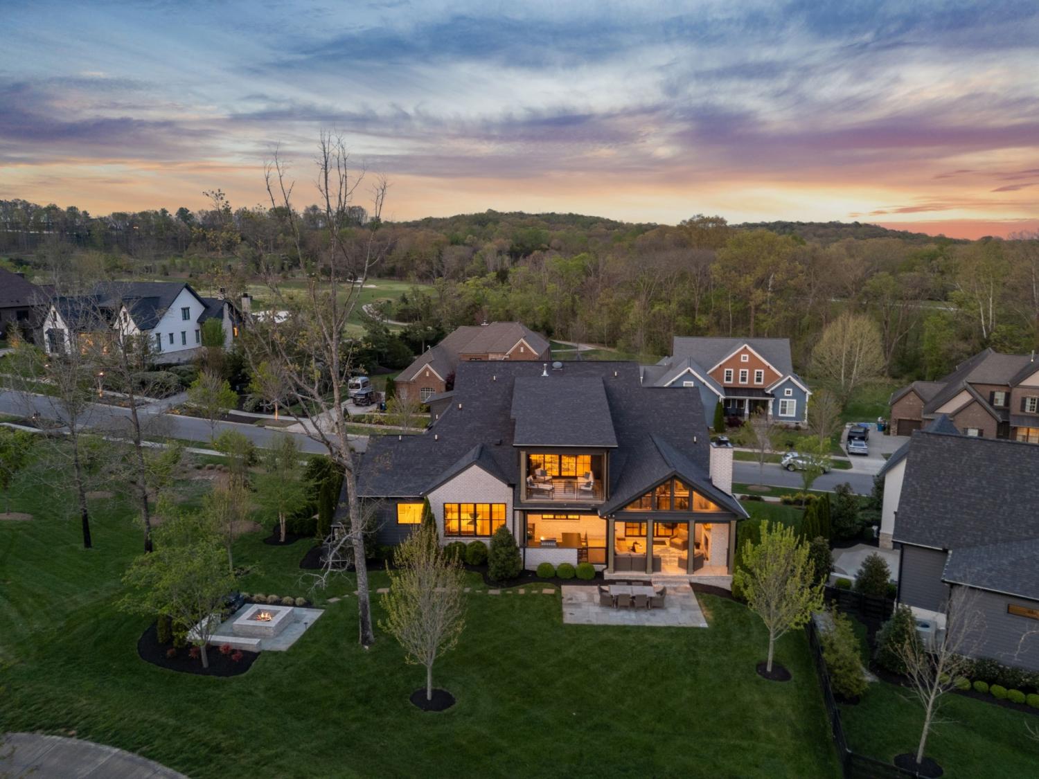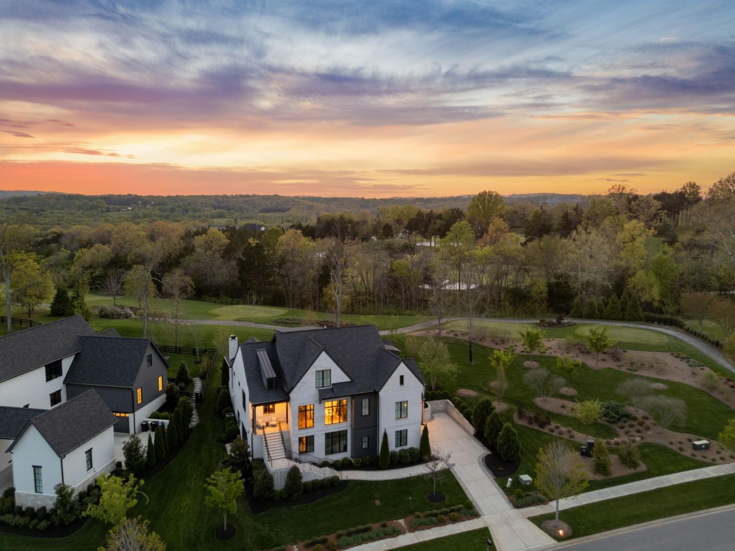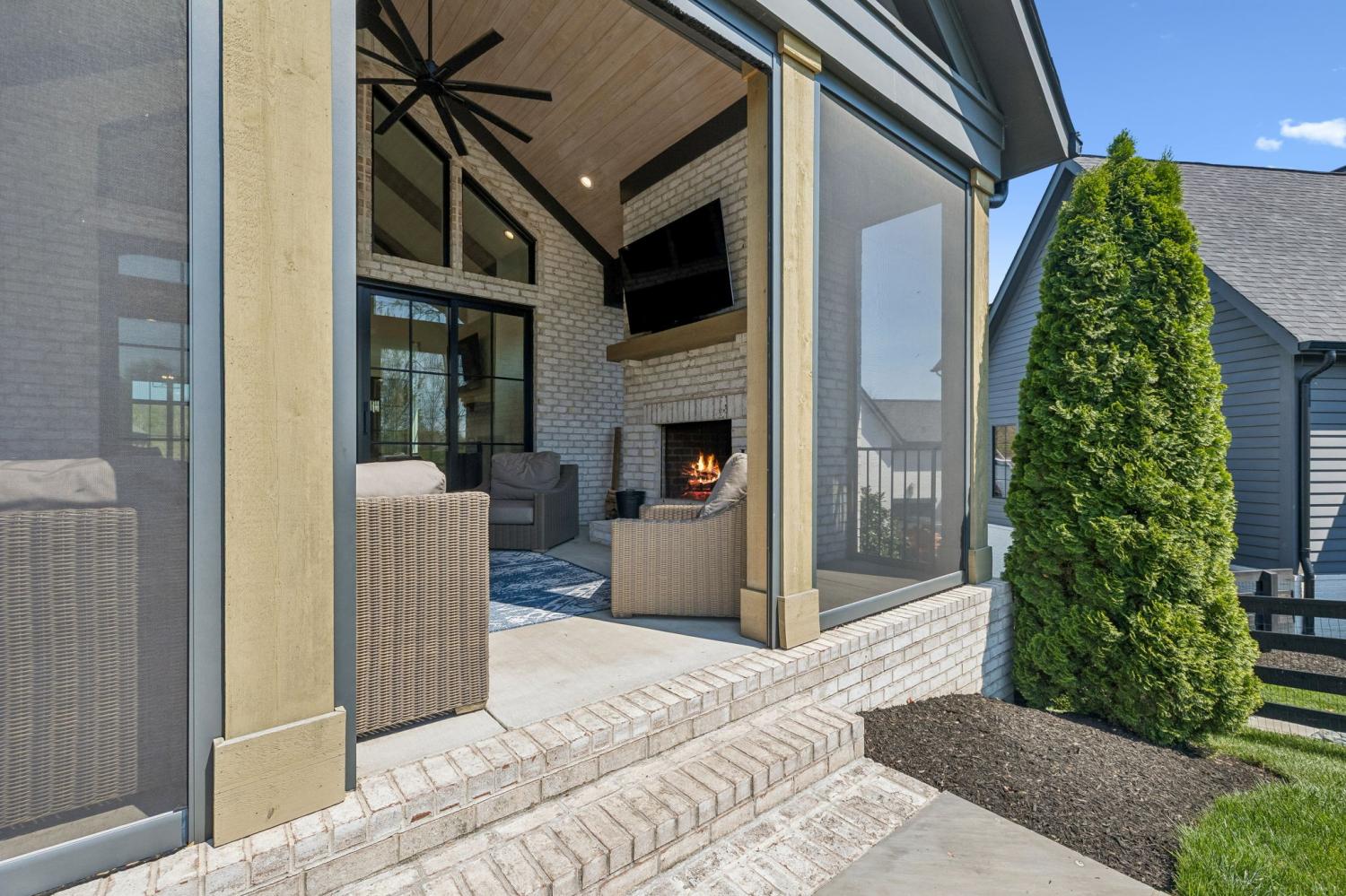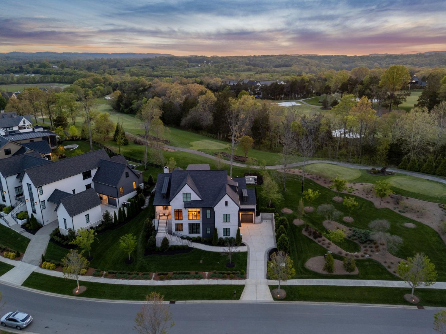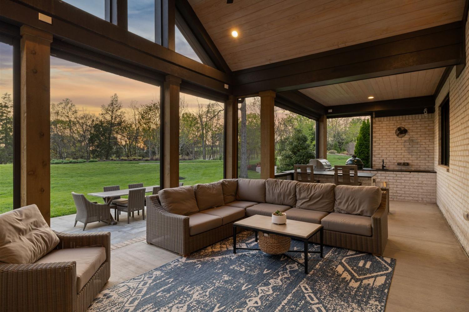 Gracefully positioned on Hole #4 of the prestigious Troubadour Championship Golf Course, this exceptional luxury residence offers refined design, thoughtful craftsmanship, and breathtaking golf course views. The open‑concept main level is anchored by a stunning chef’s kitchen featuring a substantial island with custom wood cabinetry, quartz countertops, professional‑grade appliances, designer lighting, and an inviting beamed tongue‑and‑groove ceiling. The kitchen flows seamlessly into the light‑filled living area, where soaring ceilings, exposed beams, a gas fireplace with custom surround, and expansive windows frame the panoramic fairway views. Designed for effortless entertaining, the home includes a striking glass‑enclosed wine room with custom racking, beverage refrigeration, and stone countertops. Sliding glass doors extend the living space outdoors to a covered, screened porch with a fireplace and serene views of the course and surrounding landscape, perfect for year‑round enjoyment. The main‑level primary suite is a private retreat, highlighted by vaulted ceilings, exposed beams, and wall‑to‑wall windows overlooking the lush grounds. The spa‑inspired en suite bath offers timeless finishes, and the expansive custom walk‑in closet features a center island and built‑in storage. Additional spaces include a beautifully designed office or flex room with custom cabinetry and shelving, a spacious laundry room with abundant cabinetry, and high‑end finishes throughout. Outdoor living is elevated by a meticulously landscaped backyard with stone fire pit, ideal for gathering under the stars while enjoying sweeping golf course views. The fully finished basement provides a generous extension of the living space, offering exceptional flexibility for recreation, media, fitness, or additional entertaining. With its elegant exterior, exceptional indoor‑outdoor flow, and premier Troubadour location, this home offers a rare opportunity to experience luxury living at its finest.