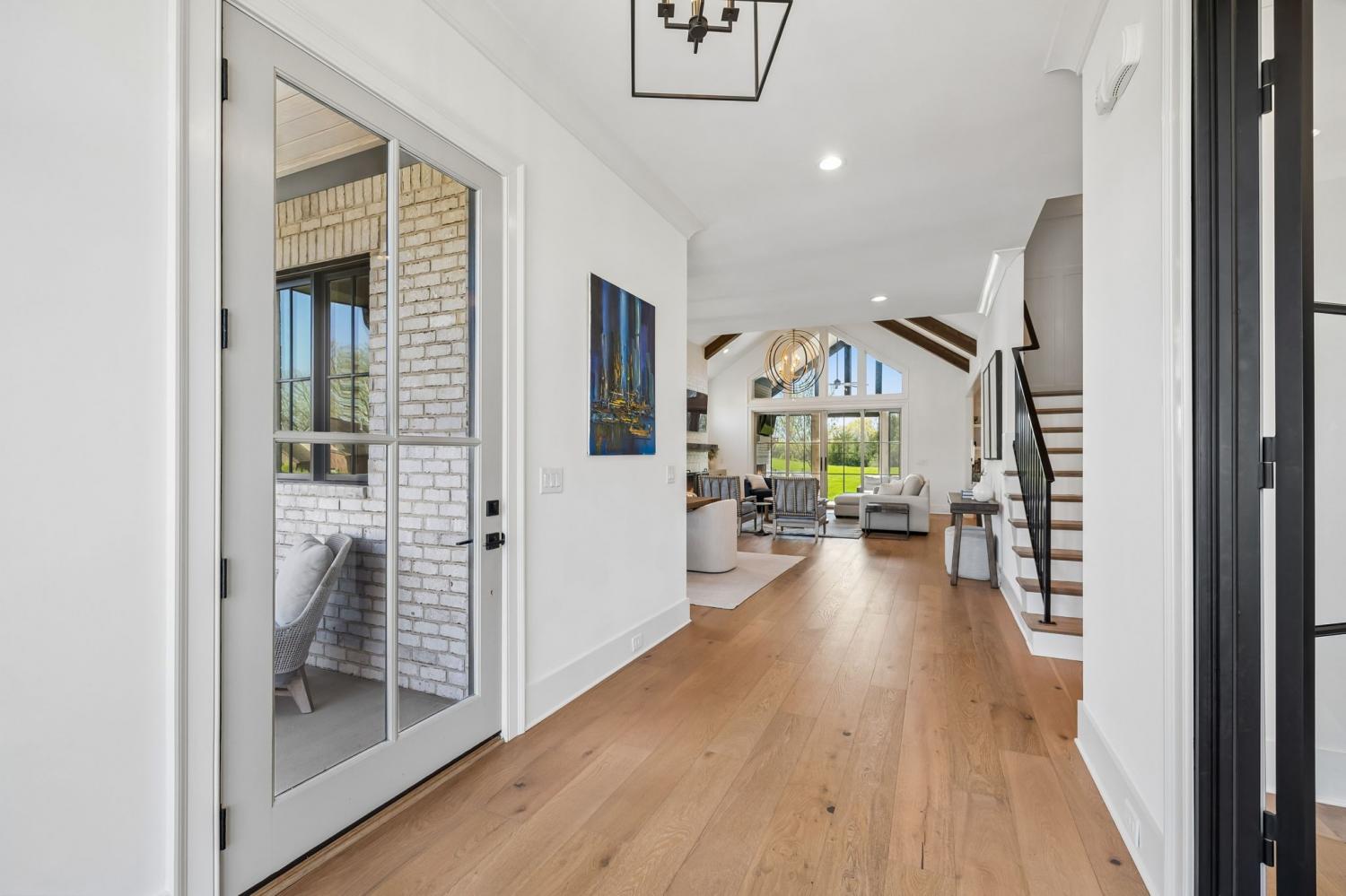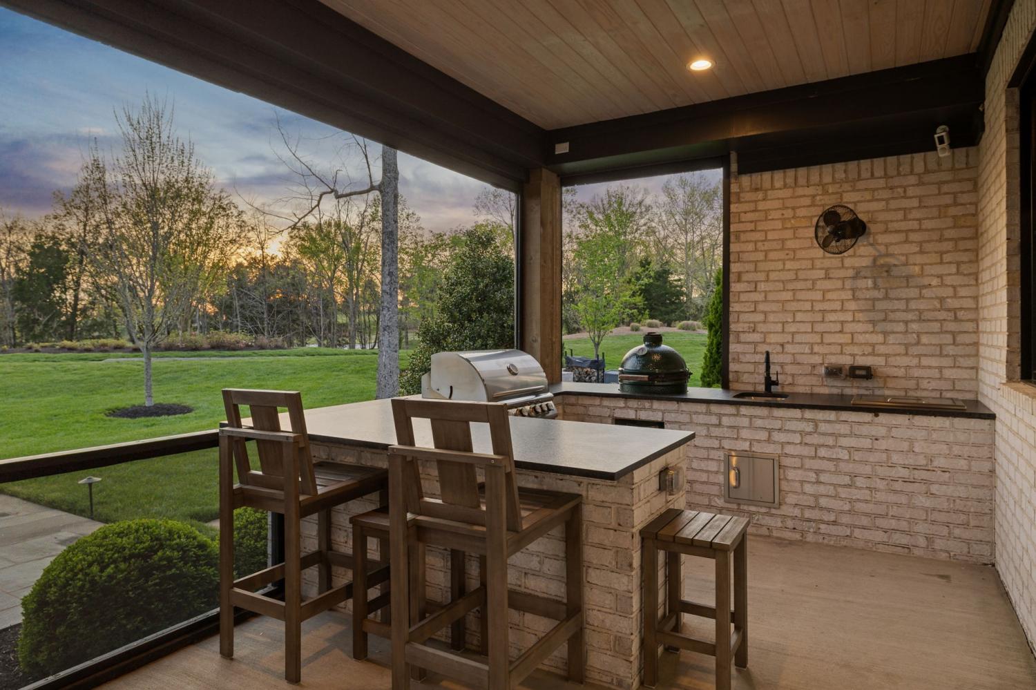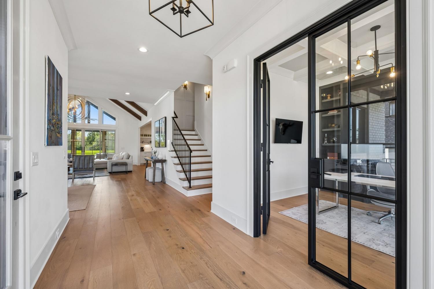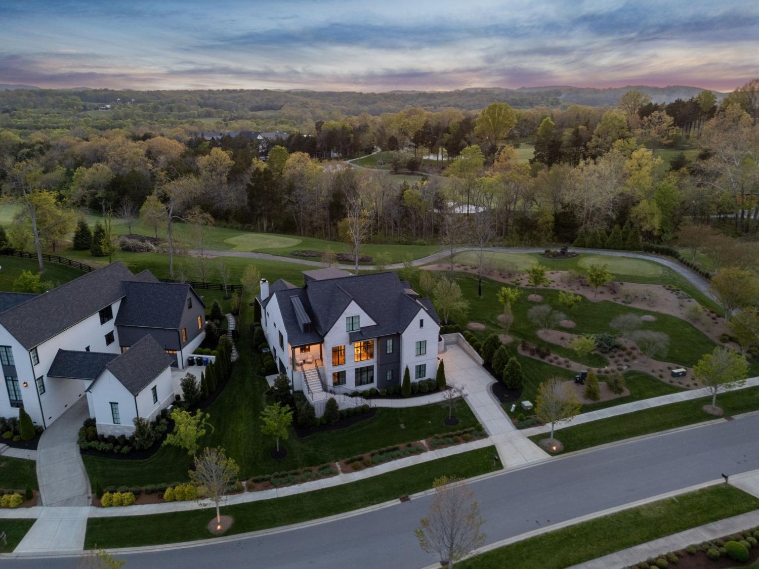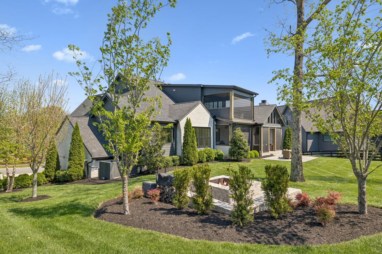 Gracefully positioned on Hole #4 of the prestigious Troubadour Championship Golf Course, this exceptional luxury residence offers refined design, thoughtful craftsmanship, and breathtaking golf course views. The open‑concept main level is anchored by a stunning chef’s kitchen featuring a substantial island with custom wood cabinetry, quartz countertops, professional‑grade appliances, designer lighting, and an inviting beamed tongue‑and‑groove ceiling. The kitchen flows seamlessly into the light‑filled living area, where soaring ceilings, exposed beams, a gas fireplace with custom surround, and expansive windows frame the panoramic fairway views. Designed for effortless entertaining, the home includes a striking glass‑enclosed wine room with custom racking, beverage refrigeration, and stone countertops. Sliding glass doors extend the living space outdoors to a covered, screened porch with a fireplace and serene views of the course and surrounding landscape, perfect for year‑round enjoyment. The main‑level primary suite is a private retreat, highlighted by vaulted ceilings, exposed beams, and wall‑to‑wall windows overlooking the lush grounds. The spa‑inspired en suite bath offers timeless finishes, and the expansive custom walk‑in closet features a center island and built‑in storage. Additional spaces include a beautifully designed office or flex room with custom cabinetry and shelving, a spacious laundry room with abundant cabinetry, and high‑end finishes throughout. Outdoor living is elevated by a meticulously landscaped backyard with stone fire pit, ideal for gathering under the stars while enjoying sweeping golf course views. The fully finished basement provides a generous extension of the living space, offering exceptional flexibility for recreation, media, fitness, or additional entertaining. With its elegant exterior, exceptional indoor‑outdoor flow, and premier Troubadour location, this home offers a rare opportunity to experience luxury living at its finest.