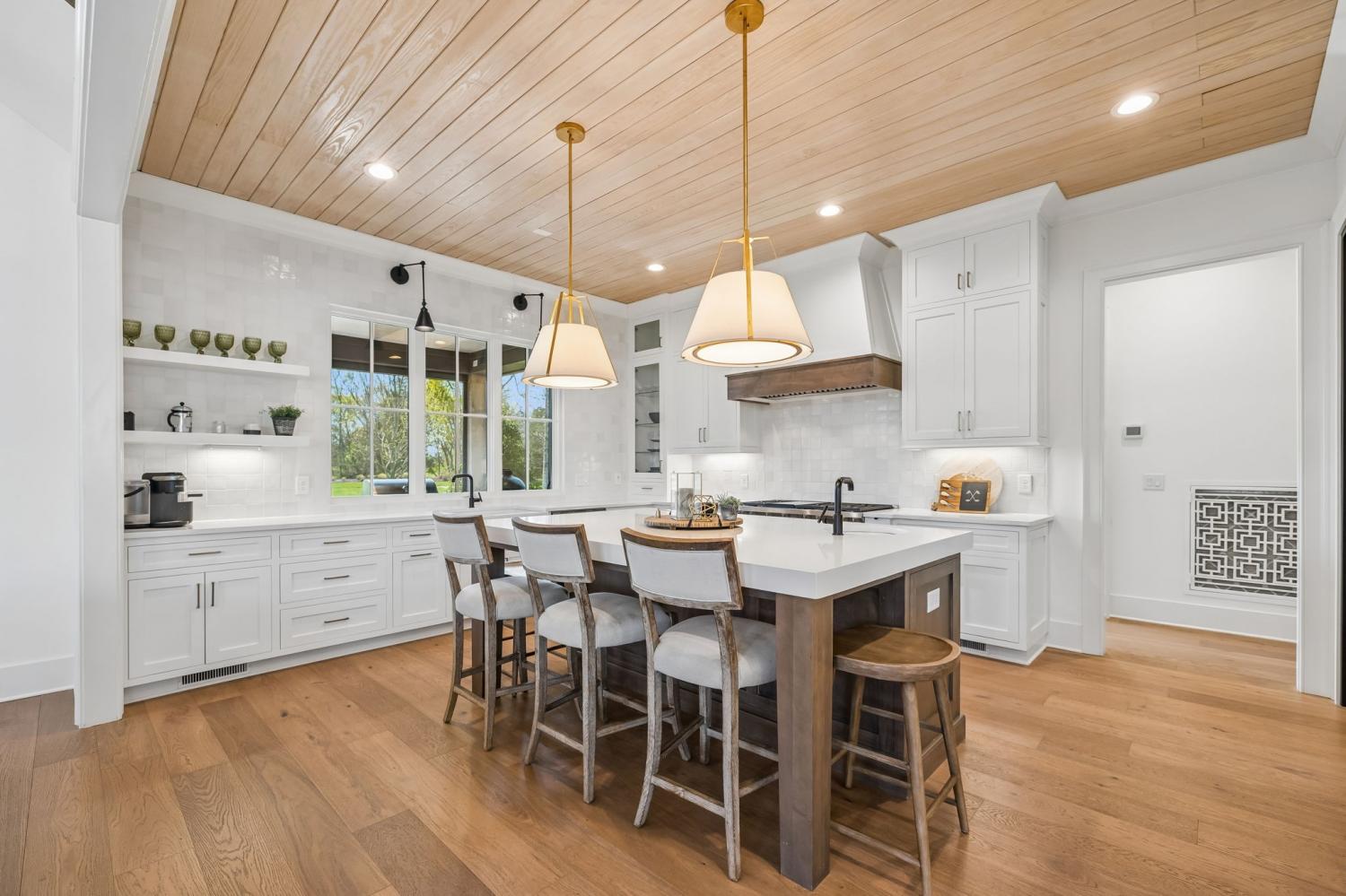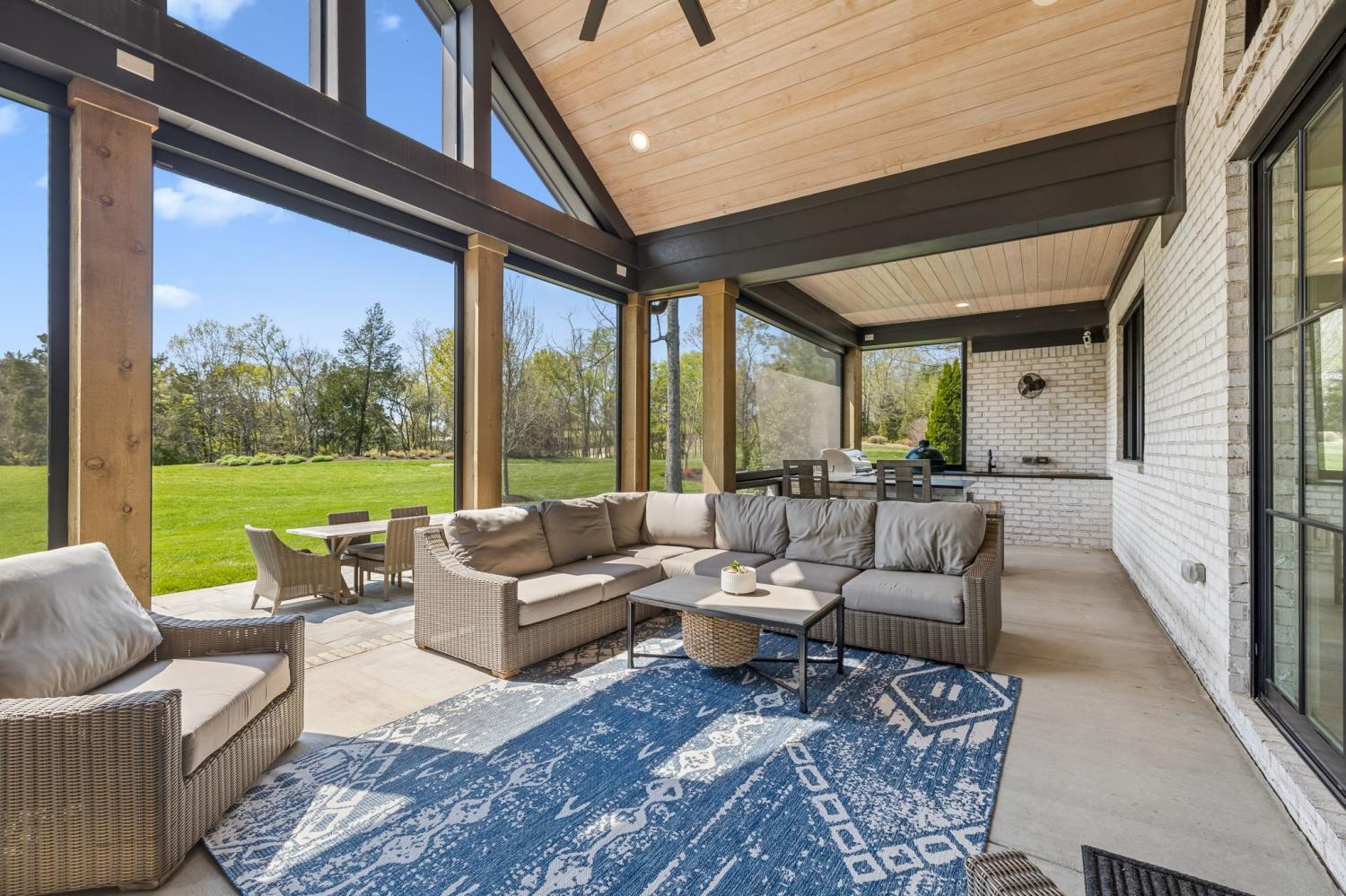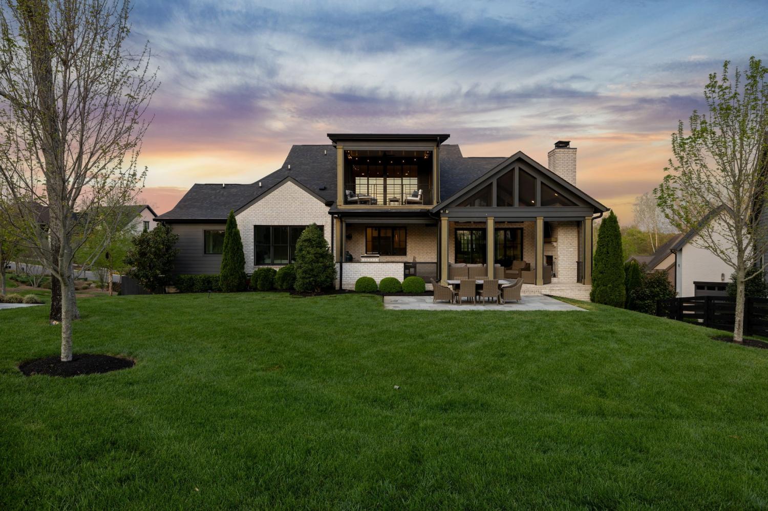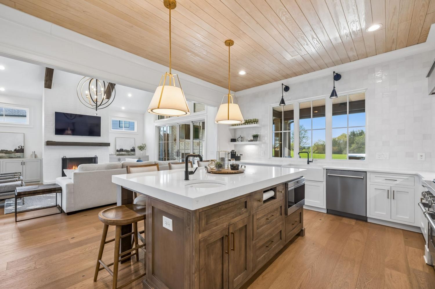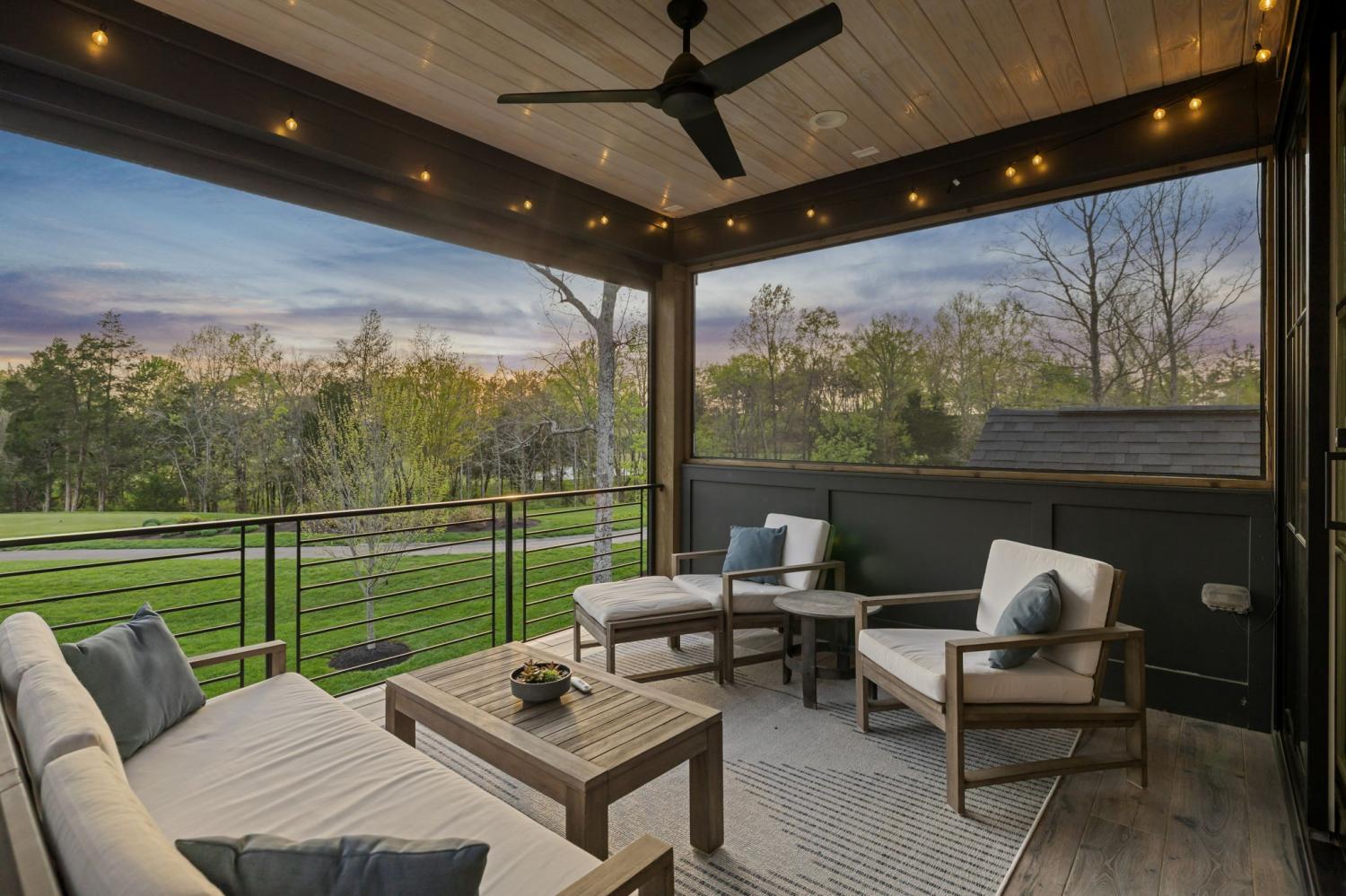 Gracefully positioned on Hole #4 of the prestigious Troubadour Championship Golf Course, this exceptional luxury residence offers refined design, thoughtful craftsmanship, and breathtaking golf course views. The open‑concept main level is anchored by a stunning chef’s kitchen featuring a substantial island with custom wood cabinetry, quartz countertops, professional‑grade appliances, designer lighting, and an inviting beamed tongue‑and‑groove ceiling. The kitchen flows seamlessly into the light‑filled living area, where soaring ceilings, exposed beams, a gas fireplace with custom surround, and expansive windows frame the panoramic fairway views. Designed for effortless entertaining, the home includes a striking glass‑enclosed wine room with custom racking, beverage refrigeration, and stone countertops. Sliding glass doors extend the living space outdoors to a covered, screened porch with a fireplace and serene views of the course and surrounding landscape, perfect for year‑round enjoyment. The main‑level primary suite is a private retreat, highlighted by vaulted ceilings, exposed beams, and wall‑to‑wall windows overlooking the lush grounds. The spa‑inspired en suite bath offers timeless finishes, and the expansive custom walk‑in closet features a center island and built‑in storage. Additional spaces include a beautifully designed office or flex room with custom cabinetry and shelving, a spacious laundry room with abundant cabinetry, and high‑end finishes throughout. Outdoor living is elevated by a meticulously landscaped backyard with stone fire pit, ideal for gathering under the stars while enjoying sweeping golf course views. The fully finished basement provides a generous extension of the living space, offering exceptional flexibility for recreation, media, fitness, or additional entertaining. With its elegant exterior, exceptional indoor‑outdoor flow, and premier Troubadour location, this home offers a rare opportunity to experience luxury living at its finest.