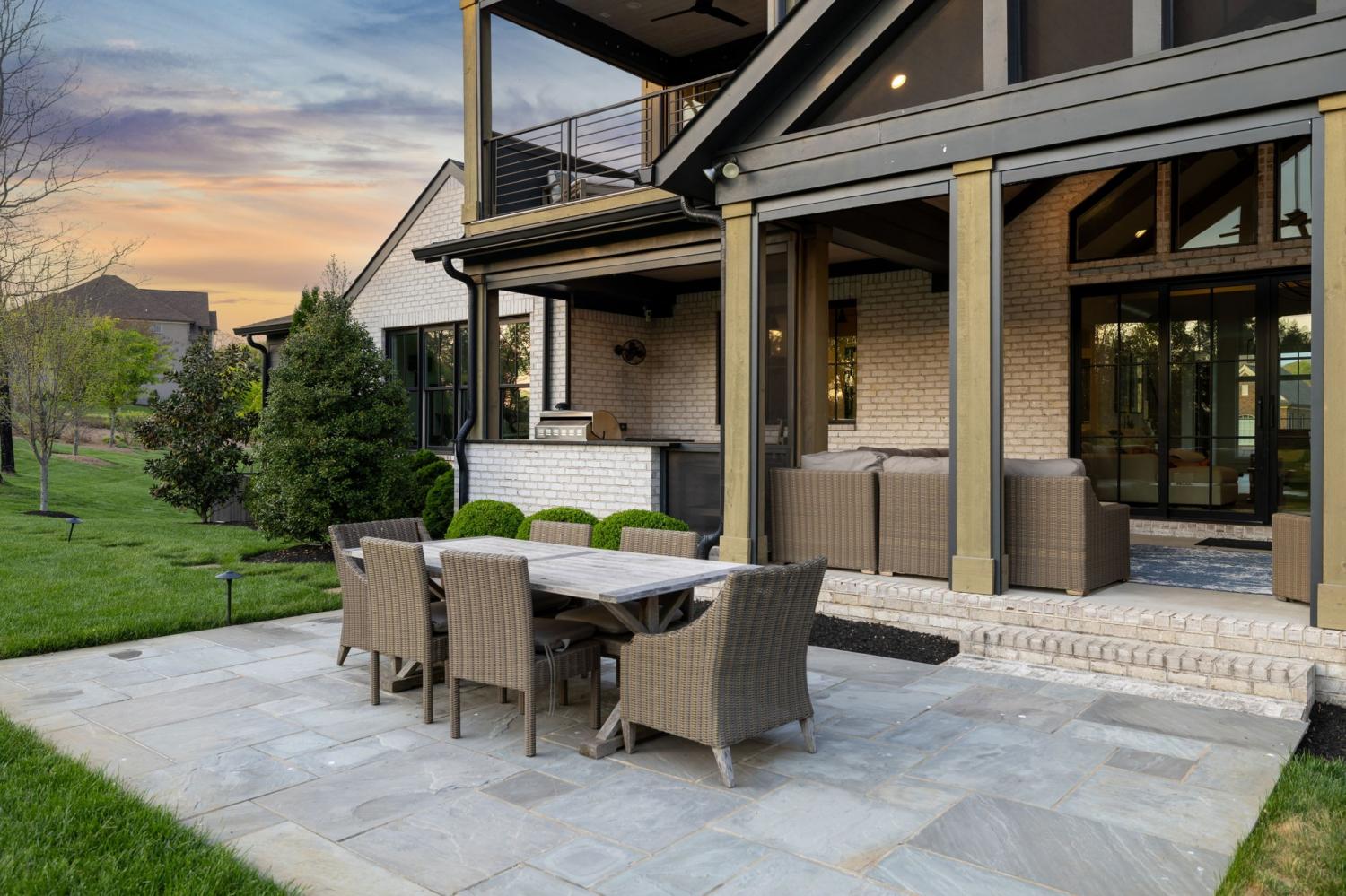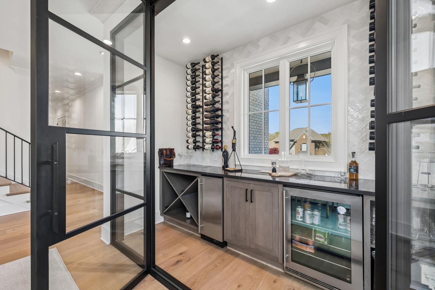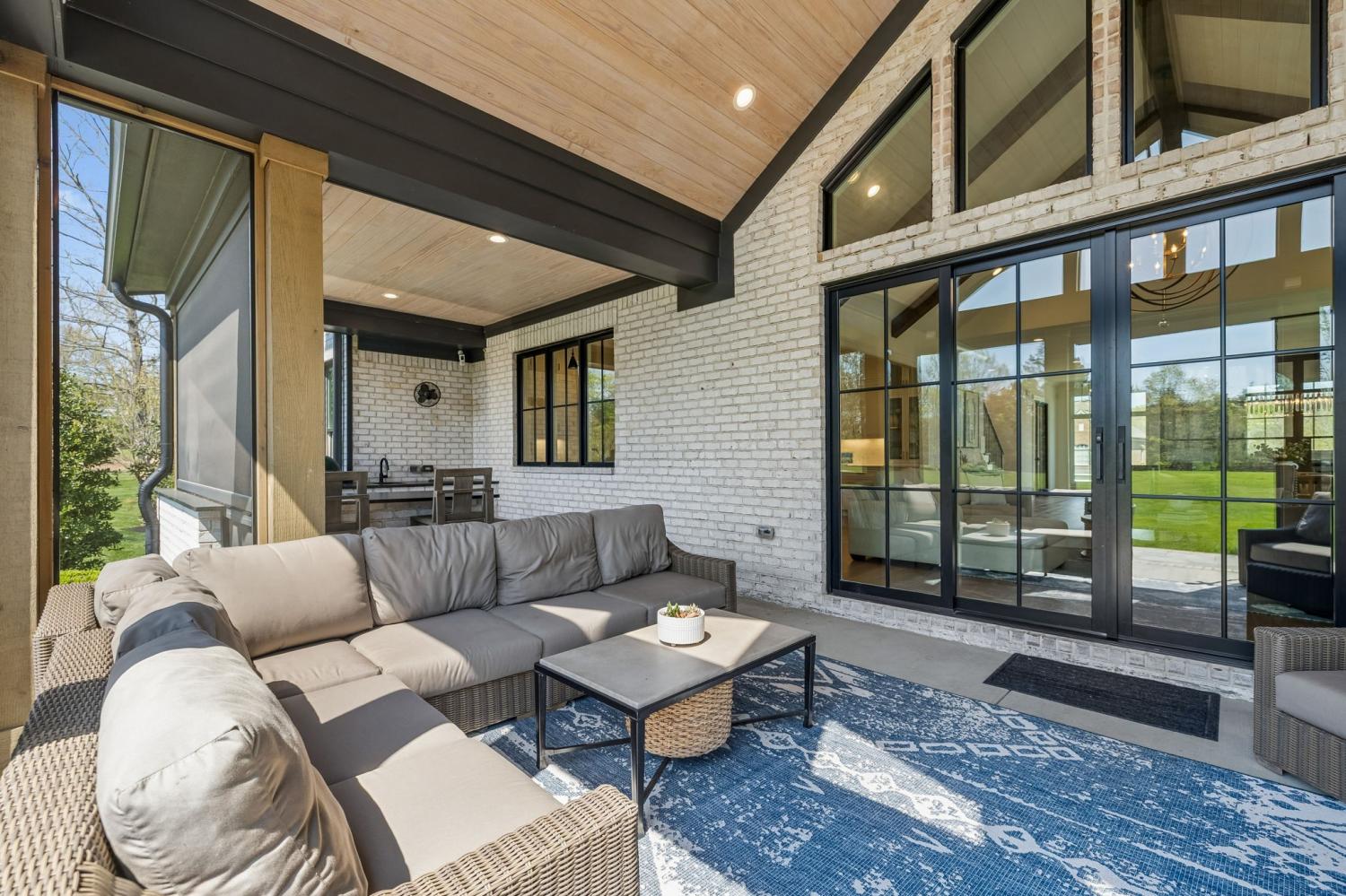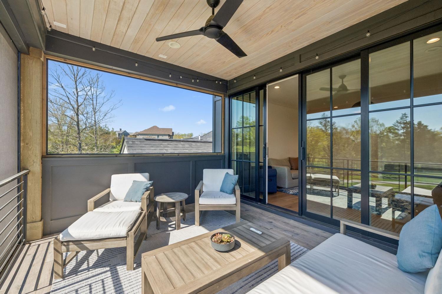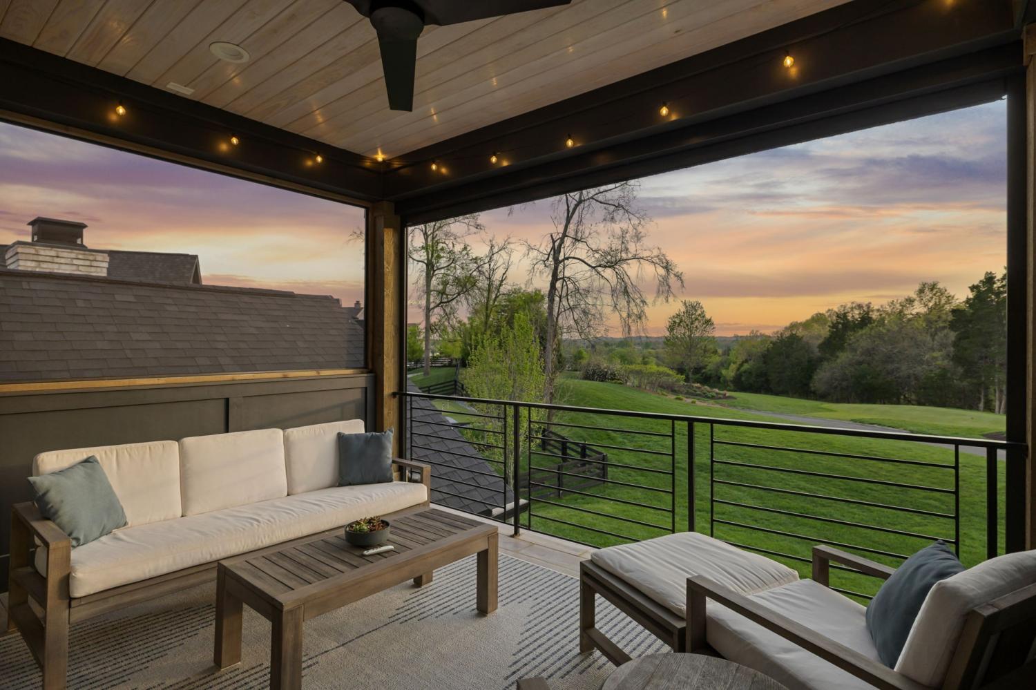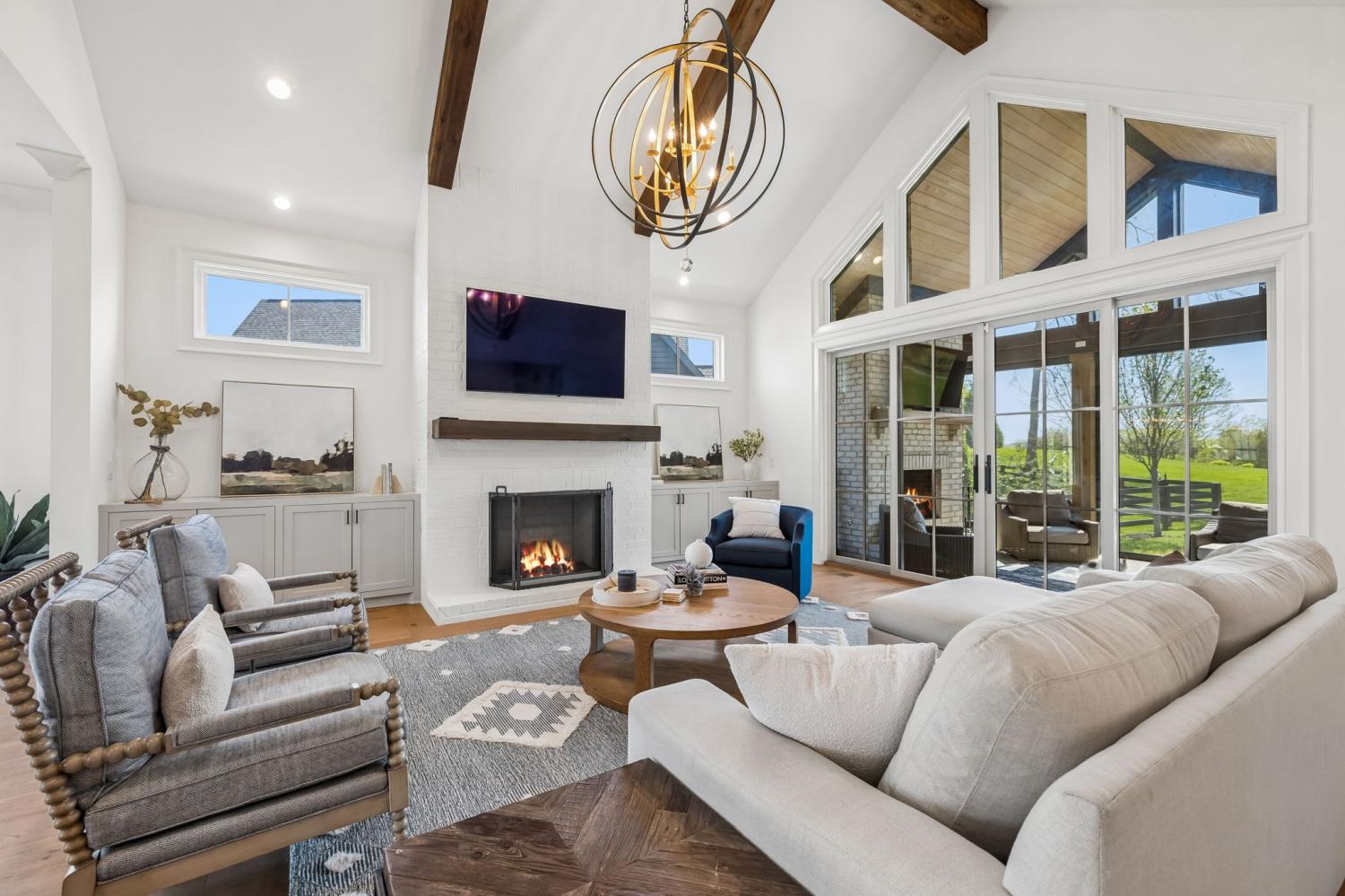 Gracefully positioned on Hole #4 of the prestigious Troubadour Championship Golf Course, this exceptional luxury residence offers refined design, thoughtful craftsmanship, and breathtaking golf course views. The open‑concept main level is anchored by a stunning chef’s kitchen featuring a substantial island with custom wood cabinetry, quartz countertops, professional‑grade appliances, designer lighting, and an inviting beamed tongue‑and‑groove ceiling. The kitchen flows seamlessly into the light‑filled living area, where soaring ceilings, exposed beams, a gas fireplace with custom surround, and expansive windows frame the panoramic fairway views. Designed for effortless entertaining, the home includes a striking glass‑enclosed wine room with custom racking, beverage refrigeration, and stone countertops. Sliding glass doors extend the living space outdoors to a covered, screened porch with a fireplace and serene views of the course and surrounding landscape, perfect for year‑round enjoyment. The main‑level primary suite is a private retreat, highlighted by vaulted ceilings, exposed beams, and wall‑to‑wall windows overlooking the lush grounds. The spa‑inspired en suite bath offers timeless finishes, and the expansive custom walk‑in closet features a center island and built‑in storage. Additional spaces include a beautifully designed office or flex room with custom cabinetry and shelving, a spacious laundry room with abundant cabinetry, and high‑end finishes throughout. Outdoor living is elevated by a meticulously landscaped backyard with stone fire pit, ideal for gathering under the stars while enjoying sweeping golf course views. The fully finished basement provides a generous extension of the living space, offering exceptional flexibility for recreation, media, fitness, or additional entertaining. With its elegant exterior, exceptional indoor‑outdoor flow, and premier Troubadour location, this home offers a rare opportunity to experience luxury living at its finest.