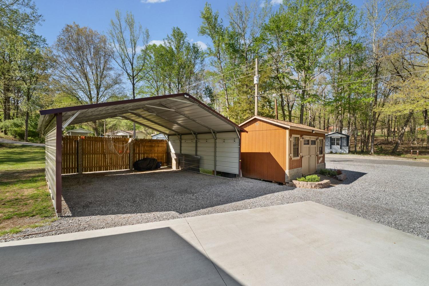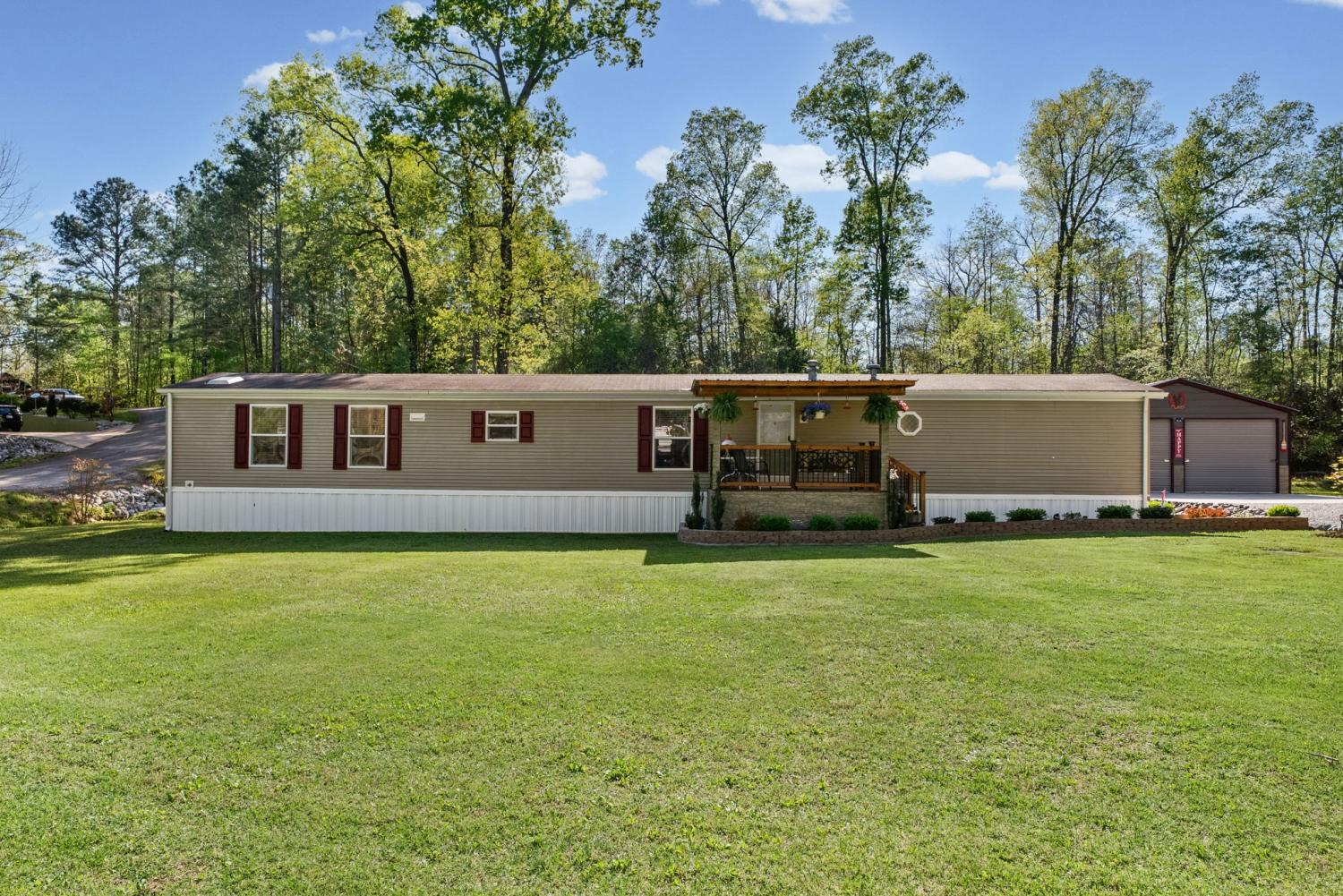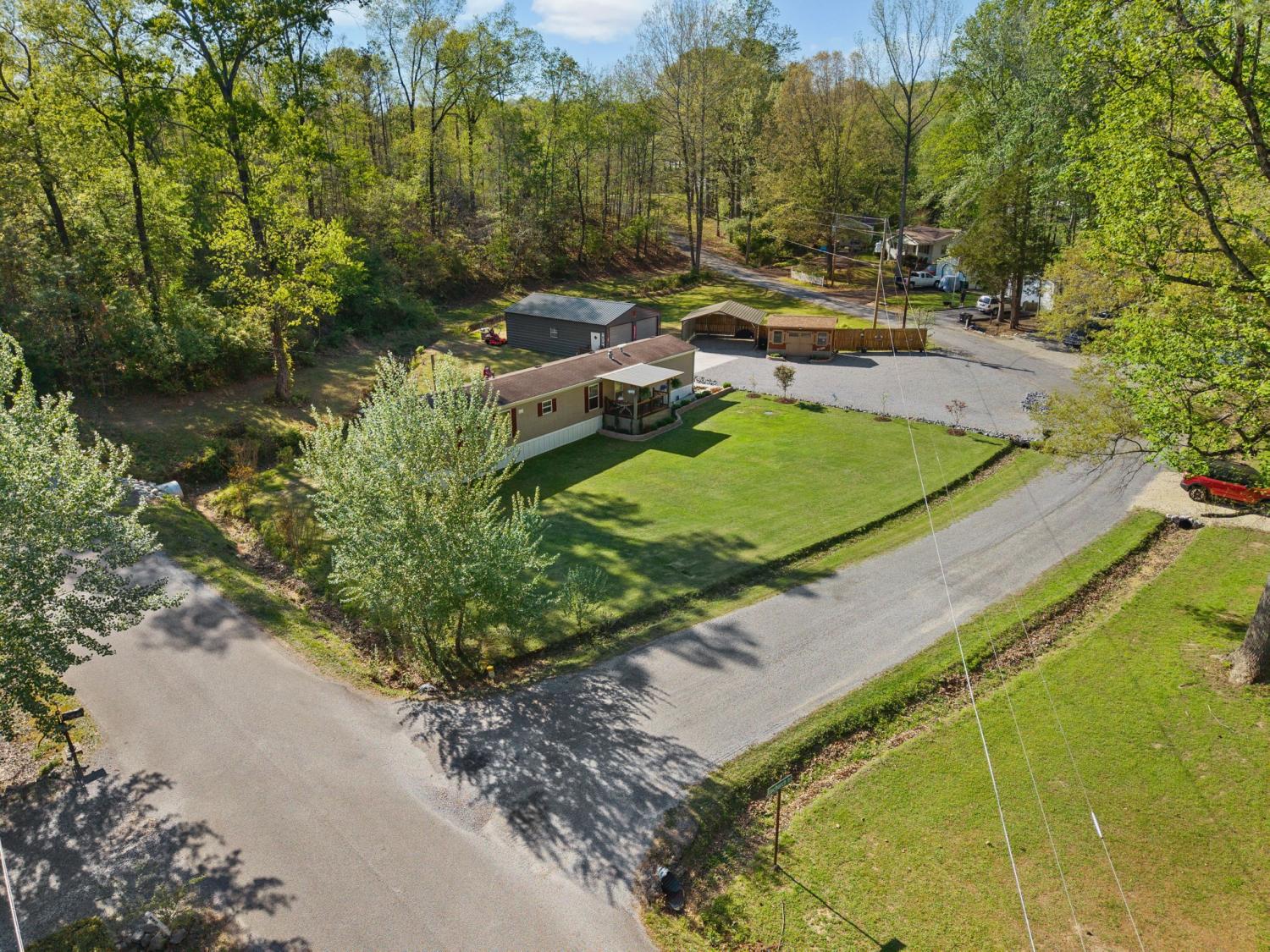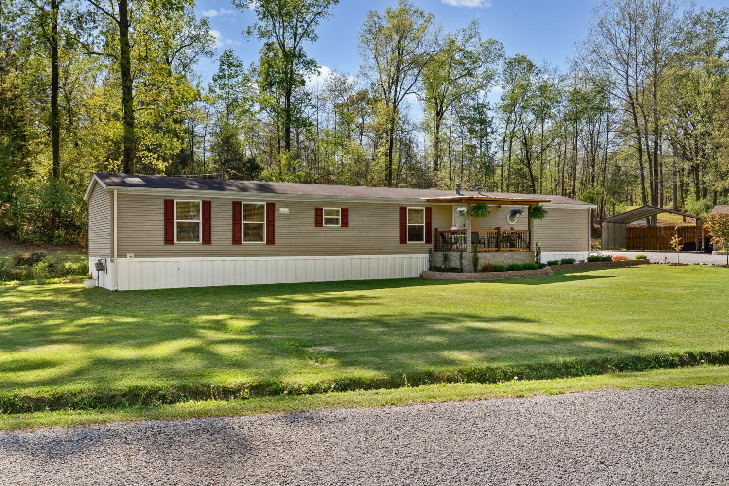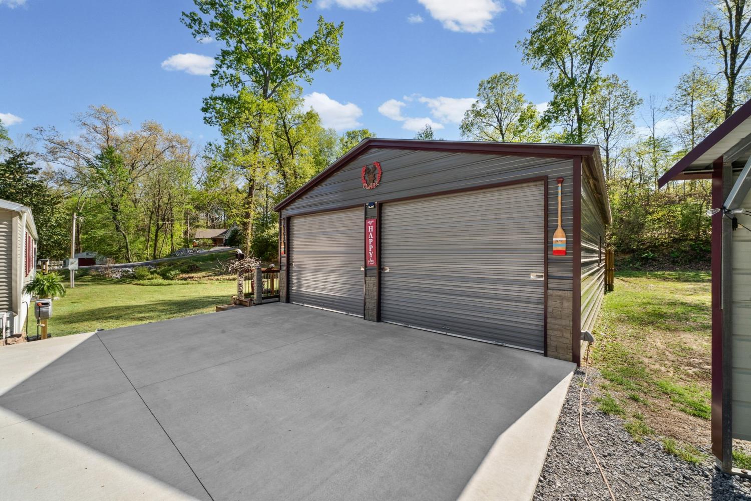 Bring your boat and park it in the large detached garage or dock it at the marina only 0.9 mile away! Beautiful Kentucky Lake-launching-marinas and golf course are right here for you. This gem is waiting for you and has been meticulously maintained. Find this renovated mobile home with 2x6 exterior walls, house style windows, vinyl siding and shingle roofing offering open floor plan with 3BR-2BA. You find LVP flooring, new interior paint, SS appliances along with washer and dryer to be included. Primary bedroom offers large closet space and primary bath with nice soaking tub and separate step in shower. Covered front deck with sidewalk leading to driveway and detached garage. Concrete parking pad found in the front area of the garage and over to the detached double carport. You have a small Amish built storage building/workshop which is wired and offers one side storage loft and work bench. The 24x36 metal detached garage with hi-beam LED lighting offers side entrance door, 2 front bays and one back bay door-all being electric roll ups. Front doors offer 10x10 space. The 24x24 detached metal carport has a gravel bottom with wind/storm anchors and privacy fence to the back side. You have ample parking space and side drive through area being so convenient. You find a 30AMP electric plug ideal for the RV/ camper parking and the level lot being ideal to support the family or friends. Convenient area to nearby shopping and multiple restaurants-dining being ideal for full time-seasonal or airBNB life style. This is a very inviting property and a must see to appreciate!